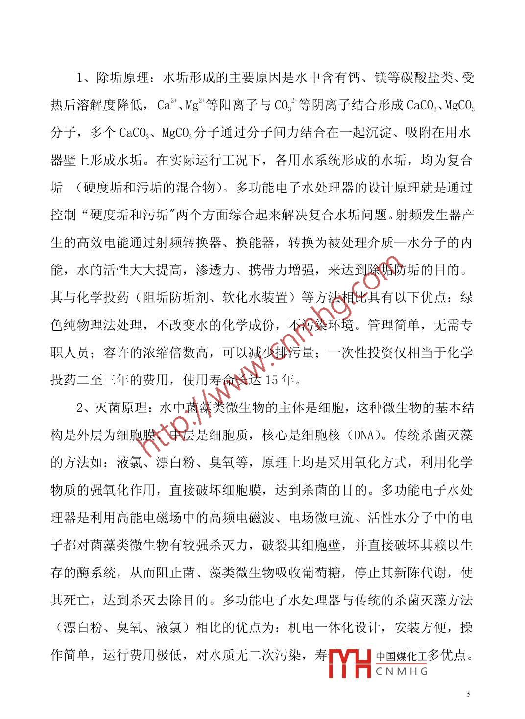 探析水處理方案在采暖循環(huán)水系統(tǒng)中的設(shè)計(jì)代麗芳.唐山市熱力公司河北唐山 064003摘要:對(duì)采暖循環(huán)水系統(tǒng)中存在的結(jié)垢、腐蝕、堵塞等主要問(wèn)題,采用鈉離子交換器和多功能電子水處理器兩者結(jié)合的方式從根源上進(jìn)行解決,并對(duì)產(chǎn)生的廢液進(jìn)行再利用。關(guān)鍵詞:鈉離子交換器;多功能電子水處理器;防腐;防垢;廢液再.利用.一、水處理應(yīng)用于采暖循環(huán)水系統(tǒng)的必要性采暖循環(huán)水系統(tǒng)存在的主要問(wèn)題是換熱設(shè)備的結(jié)垢影響換熱效率;系統(tǒng)管網(wǎng)的腐蝕以及腐蝕造成的水質(zhì)二次污染,管網(wǎng)末端散熱器鐵垢沉積、堵塞,影響散熱的問(wèn)題。另外,采暖循環(huán)水在封閉的系統(tǒng)中運(yùn)行,運(yùn)行溫度為95°C~75°C。由于系統(tǒng)長(zhǎng)期在高溫環(huán)境下運(yùn)行,系統(tǒng)管網(wǎng)、設(shè)備腐蝕情況比較嚴(yán)重。造成系統(tǒng)中雜質(zhì)不斷增多,水的色度、濁度不斷提高。如果系統(tǒng)中配備的過(guò)濾裝置不盡合理,將無(wú)法去除懸浮于水中的鐵銹等雜質(zhì)。隨著系統(tǒng)的運(yùn)行,水質(zhì)中的雜質(zhì)就會(huì)在水流速度較慢的裝置內(nèi)沉積下來(lái),導(dǎo)致管網(wǎng)堵塞。使系統(tǒng)運(yùn)行工況惡化,嚴(yán)重影響到鍋爐、換熱設(shè)備、水泵管道、閥門及整個(gè)供暖系統(tǒng)的能源效率、安全性和使用壽命,也嚴(yán)重阻礙新型節(jié)能型散熱器、散熱器恒溫控制閥和機(jī)械式分戶熱表的推廣應(yīng)用。為了適應(yīng)城鎮(zhèn)供熱體制改革的需要,必須改變上述落后的狀態(tài)。這就需要設(shè)計(jì)一套確實(shí)有效的水處理方案。中國(guó)煤化工二、單純安裝鈉離子交換器的局限性MHCNMH G1目前在采暖循環(huán)水系統(tǒng)的水處理中,通常采用軟化水方式,即在補(bǔ)水系統(tǒng)中單純安裝鈉離子交換器,將水質(zhì)軟化后注入循環(huán)系統(tǒng)。但這種方案存在很大的隱患,現(xiàn)詳述如下:(一)軟化水只能解決采暖循環(huán)系統(tǒng)中換熱設(shè)備結(jié)垢的問(wèn)題,而無(wú)法解決系統(tǒng)的腐蝕問(wèn)題和管網(wǎng)的堵塞問(wèn)題。相反,軟化水還會(huì)加劇管網(wǎng)的腐蝕,加速采暖循環(huán)水運(yùn)行工況的進(jìn)一步惡化。 經(jīng)驗(yàn)表明:使用軟化水做補(bǔ)水兩年后水系統(tǒng)即開(kāi)始有泄漏,腐蝕逐年加重,造成供熱管網(wǎng)跑、冒、滴、漏現(xiàn)象嚴(yán)重。1992 年英國(guó)集中供熱水處理總則中就明確:民用住宅熱水集中供熱系統(tǒng)水處理實(shí)施法規(guī)(British Standard一BS7593:1992)總則中規(guī)定:“在任何一個(gè)集中 供暖系統(tǒng)中都不應(yīng)該使用經(jīng)過(guò)軟水器的供水,除非特別地明確表示已經(jīng)為此添加了腐蝕抑制劑?!?二)單純安裝鈉離子交換器滿足不了較大系統(tǒng)的初期充水和大量跑水的情況,在這兩種情況下為了滿足短時(shí)間內(nèi)向管網(wǎng)大量注水的需求,往往是直接向管網(wǎng)注入自來(lái)水,這也使其失去了軟化除垢的意義。(三)鈉離子交換器再生廢液導(dǎo)致地下水日益嚴(yán)重的鹽污染。在我國(guó)僅供熱制取軟化水,每年有大約2000多萬(wàn)噸的食鹽排入地下水,工業(yè)蒸汽鍋爐為了制取軟化水每年需要排放到地下2000多萬(wàn)噸食鹽,電廠陰陽(yáng)離子交換再生廢液排到中和池后又形成遠(yuǎn)大于2000多萬(wàn)噸的食鹽。在北京市每制取1立方米鈉離子交換軟化水,就要排到地下2. 5公斤左右的食鹽。.中國(guó)煤化工YHCNMH G2綜上所述,單純安裝鈉離子交換器并不能全面解決采暖循環(huán)系統(tǒng)存在的問(wèn)題,也不適宜現(xiàn)代人類日益加強(qiáng)的環(huán)保需求。采暖循環(huán)系統(tǒng)存在的問(wèn)題是綜合性的,需要進(jìn)行綜合處理。三、水處理方案的再設(shè)計(jì)針對(duì)_上述弊病,我建議采用鈉離子交換器和多功能電子水處理器兩者結(jié)合的方式。具體設(shè)計(jì)如下:(一)采用現(xiàn)已較成熟的在補(bǔ)水系統(tǒng)中安裝鈉離子交換器來(lái)滿足平時(shí)的補(bǔ)水除垢需求,并對(duì)其產(chǎn)生的廢水進(jìn)行再利用。鈉離子交換器再生廢液占生產(chǎn)軟化水總量的5%一10%左右,人工操作的軟水器所產(chǎn)生的廢水則更多。從環(huán)保和節(jié)約用水的角度出發(fā),將軟水器的廢水再利用,是必須的, 而 且是可行的。1、廢水利用的措施(1)樹(shù)脂軟水器正洗廢水的性質(zhì):從鈉離子樹(shù)脂軟水器的工作原理得知,再生溶液 NaCl與失效鈉離子樹(shù)脂進(jìn)行置換后,軟水器內(nèi)的水中主要含有大量的氣離子,鈣和鎂離子。在進(jìn)行正洗工作時(shí),開(kāi)始從軟水器內(nèi)沖出來(lái)的氯根含量在1000mg/l 左右,它和鈣、 鎂離子形成CaCl2、 MgCl2。正洗終結(jié)的標(biāo)準(zhǔn)是出水硬度≤0.03mol/l,即達(dá)到鍋爐的水質(zhì)標(biāo)準(zhǔn)。由此可見(jiàn),由含有CaCl2、MgCl2 成分和軟水合成的正洗廢水其硬度優(yōu)于自來(lái)水。(2)水浴除塵器循環(huán)水的性質(zhì):煤在爐膛內(nèi)燃燒后產(chǎn)生的煙氣中,主要含有SO2成分,與煙氣、水浴除塵器中的水相互混合后,從水浴除塵器排出的水即成為煤灰和煙氣混合的灰水。煙氣中原有的SO2 