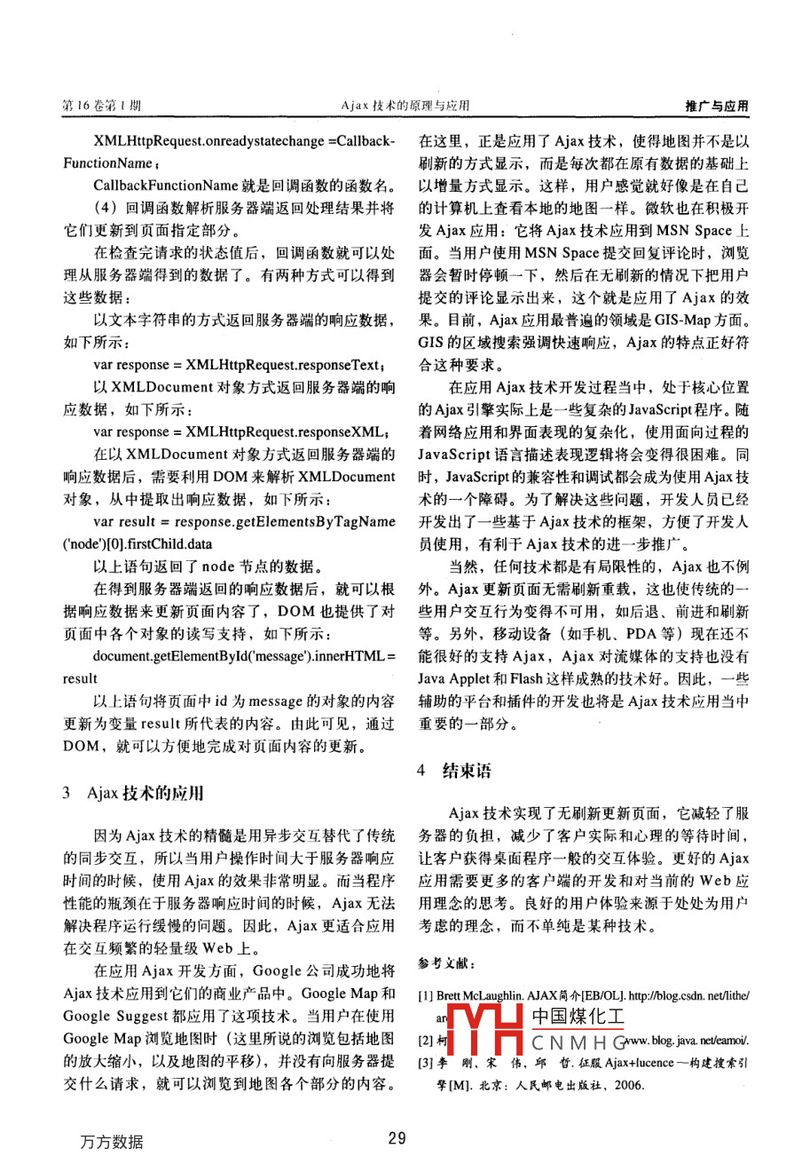 第16卷第1期鐵路推廣與應(yīng)用Vol 16 No. 1POPULARIZATION AND APPLICATION文章編號(hào):10058451(2007)01-0027-03Ajax技術(shù)的原理與應(yīng)用柯昌正,黃厚寬(北京交通大學(xué)計(jì)算機(jī)與信息技術(shù)學(xué)院,北京100044)摘要:Ajax( Asynchronous JavaScript and XML)技術(shù)是一種新型的Wcb應(yīng)用開發(fā)技術(shù),通過(guò)適當(dāng)?shù)膽?yīng)用Ajax技術(shù),可以為用戶提供更好的Web休驗(yàn)。介紹Ajax技術(shù)的基本原理和工作流程,列舉Ajax技術(shù)的一些典型應(yīng)用,分析Ajax技術(shù)的優(yōu)劣,并指出Ajax技術(shù)的適用范圍與其發(fā)展趨勢(shì)。關(guān)鍵詞:Ajax; XmlhTtprequEst;KML;DOM;異步交互中圖分類號(hào):U291.52文獻(xiàn)標(biāo)識(shí)碼:APrinciple and application of Ajax technologyKE Chang-zheng, HUANG Hou-kuanSchool of Computer and Information Technology, Beijing Jiaotong University, Beijing 100044, China)Abstract: Ajax(Asynchronous JavaScript and XML)was a new approach to Web applications, it was used appropriately toprovide user with better experience of Web. It was presented basic principle and working process of Ajax, enumeratedsuccessfully applications of Ajax and analyzed the advantages and disadvantages of Ajax. In addition, it was pointed out theapplicability of Ajax and predicted the trend of Ajax developmentKey words Ajax XmlhTtpreqUest; Xml; Dom; asynchronous interaction因特網(wǎng)已經(jīng)經(jīng)歷了翻天覆地的重大變化。最早1.1 XmlhTtpreqUest它只有基于文本的簡(jiǎn)單Web瀏覽器,供科學(xué)家之間XmlhTtprequEst是Ajax當(dāng)中最重要的也是最交流研究心得;如今,它已經(jīng)成為商務(wù)和信息的中核心的技術(shù),它最早是在IE5中通過(guò)一個(gè)名為心,逐漸滲入到人們的日常生活中。隨著Web應(yīng)用 XmlhttP的 ActiveX對(duì)象來(lái)實(shí)現(xiàn)的。 XmlhttP對(duì)技術(shù)的不斷發(fā)展,人們對(duì)于因特網(wǎng)的性能要求也越象使得頁(yè)面中的腳本具有了在不刷新頁(yè)面的情況下來(lái)越高,如今,用戶已經(jīng)不滿足于像以前那樣填寫直接與服務(wù)器端通信的能力。與此對(duì)應(yīng), Mozilla、表單,點(diǎn)擊“提交”按鈕,然后等待頁(yè)面跳轉(zhuǎn)的同 Opera和 Safari等其他瀏覽器也實(shí)現(xiàn)了類似的對(duì)象,步請(qǐng)求/響應(yīng)模式,他們需要的是一種就像任何桌稱作 XmlhTtprequEst對(duì)象。 XmlhTtpreqUest是目面應(yīng)用程序那樣流暢、快捷和人性化的Web體驗(yàn)。前這個(gè)技術(shù)的正式名稱。Ajax技術(shù)正是為了滿足用戶的這種需求而應(yīng)運(yùn)而生1.2XML( eXtensible Markup Language)的,它為瀏覽器提供了與服務(wù)器端異步通信的能XML( eXtensible Markup Language)具有一種力,從而使用戶從請(qǐng)求/響應(yīng)的循環(huán)中解脫出來(lái),這開放的、可擴(kuò)展的和可自描述的語(yǔ)言結(jié)構(gòu),目前,它樣,使得Web瀏覽器看起來(lái)就像是即時(shí)響應(yīng)的桌面已經(jīng)成為因特網(wǎng)上數(shù)據(jù)和文檔傳輸?shù)臉?biāo)準(zhǔn)。在應(yīng)用應(yīng)用程序一樣。Ajax技術(shù)時(shí), XmlhtTprequEst對(duì)象可以選擇使用XML作為與服務(wù)器端通信的數(shù)據(jù)格式。1Ajax簡(jiǎn)介1. 3 DOM(Document Object Model)DOM( Document Object Model)是面向HTML術(shù)語(yǔ)Ajax是 Asynchronous JavaScript and XML和XML文檔的API,它為文檔提供了結(jié)構(gòu)化表示,并的縮寫。實(shí)際上,Aax并不是什么新技術(shù),它是由定義了如何通過(guò)腳本來(lái)訪問(wèn)文檔結(jié)構(gòu)。在應(yīng)用Ajax幾種蓬勃發(fā)展的技術(shù)以新的方式組合而成的,這幾技術(shù)中國(guó)煤化工理XML文檔和更種技術(shù)分別如下。新H1.4HCNMHG收稿日期:20060729作者簡(jiǎn)介:柯昌正,在讀碩士研究生;黃厚寬,教Javascript是一種在瀏覽器端大量使用的編程語(yǔ)推廣與應(yīng)用鐵路計(jì)算機(jī)應(yīng)用第16卷第1期言,它可以使用瀏覽器中的很多對(duì)象,包括 XmlhTtpAjax實(shí)現(xiàn)異步請(qǐng)求/響應(yīng)模式步驟如下:Request。在Ajax中, Javascript通過(guò)調(diào)用 XmlhTtpre(1)創(chuàng)建 XmlhTtp reQuesT對(duì)象。如前所述, Ajaxquest對(duì)象的屬性和方法與服務(wù)器端進(jìn)行數(shù)據(jù)交互,的核心是 JavaScript中的 XmlhTtpreqUest對(duì)象,因同時(shí)還可以利用DOM的APⅠ來(lái)解析從服務(wù)器端返此,首先應(yīng)當(dāng)創(chuàng)建 XmlhTtpreqUest對(duì)象。以下代碼回的XML數(shù)據(jù)和更新HTML頁(yè)面的內(nèi)容。顯示了如何創(chuàng)建一個(gè) XmlhtTp reqUest對(duì)象:if (window. XmlhTtp reQuesT2Ajax技術(shù)的原理和L作流程xmlhttprEquest=newXmlhtTprequeSto2Ajax技術(shù)的原理else if (window. ActiveXObject)Ajax的工作原理就是相當(dāng)于在瀏覽器和服務(wù)器xmlhttprequest=newActivexobject("miCrosOft之間加了一個(gè)中間層,使用戶操作與服務(wù)器響應(yīng)異 XmlhttP");步化。而這一中間層所要做的工作都是由Ajax引擎( Ajax engine)來(lái)完成的。實(shí)際上,Ajax引擎就是一由于各個(gè)廠商的瀏覽器對(duì)于 XmlhtTprequeSt些復(fù)雜的 Javascript程序,這些程序通過(guò)調(diào)用ⅹMLHp對(duì)象的底層實(shí)現(xiàn)不同,因此,在創(chuàng)建時(shí),應(yīng)當(dāng)確保Request對(duì)象的屬性和方法來(lái)與服務(wù)器端進(jìn)行數(shù)據(jù)與瀏覽器的兼容。交互,然后再通過(guò)DOM來(lái)解析處理XML文檔和部(2)向服務(wù)器端發(fā)送請(q