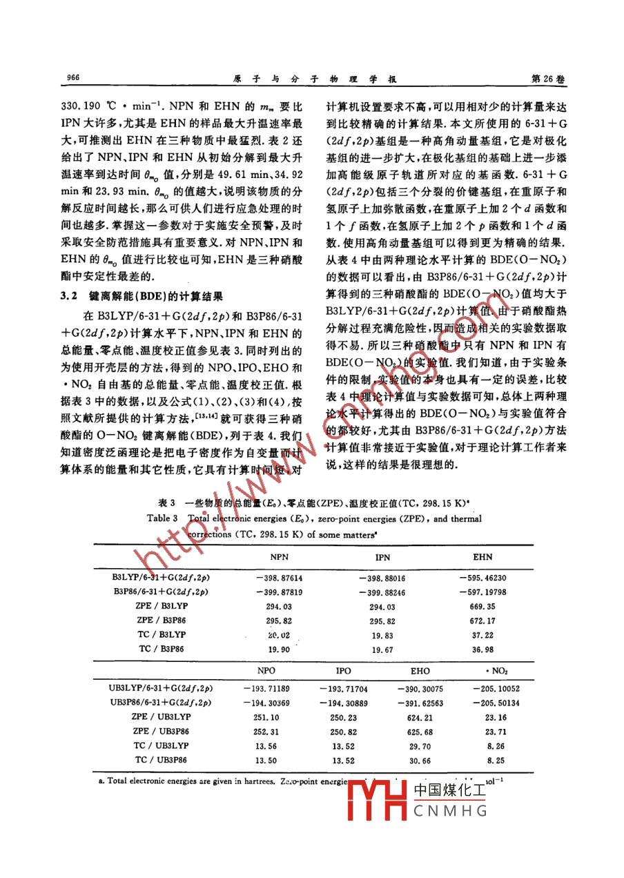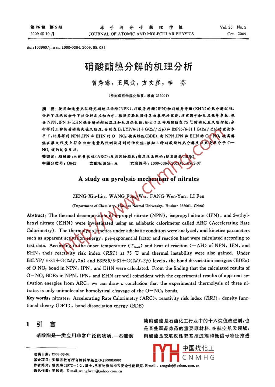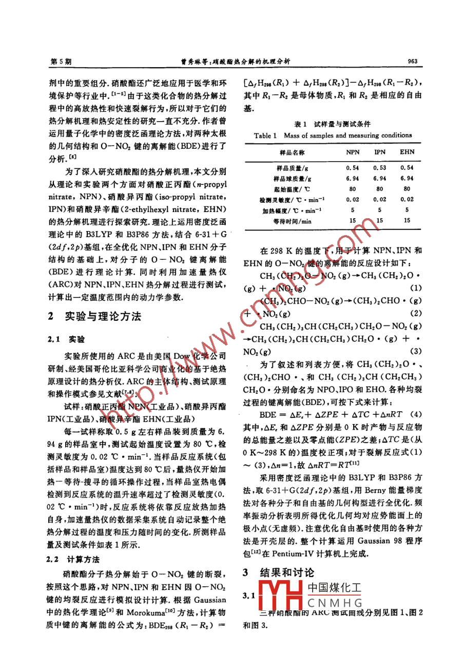 第26卷第5期原子與分子物理學(xué)報Vol 26 No 52009年10月JOURNAL OF ATOMIC AND MOLECULAR PHYSICSOct.2009doi103969/j.isn.1000-0364.2009.05.034硝酸酯熱分解的機理分析曾秀琳,王鳳武,方文彥,李芬(淮南師范學(xué)院化學(xué)系,淮南232001)摘要:使用加速量熱儀研究硝酸正丙酯(NPN)、硝酸異丙酯(IPN)和硝酸異辛酯(EHN)的熱分解過程分析了在絕熱條件下熱分解反應(yīng)動力學(xué),根據(jù)實驗數(shù)據(jù)計算出表觀活化能、指前因子和反應(yīng)熱等參數(shù),根據(jù)NPN、IPN和EHN熱分解的起始溫度和反應(yīng)熱數(shù)據(jù),蚣出了三種蹦酸酯在75℃時的反應(yīng)風(fēng)險指數(shù),分析得到三種物質(zhì)的熱失穩(wěn)風(fēng)險度.分別在B3LYP/6-31+G(2df,2p)和B3P86/6-31+G(2df,2p)的理論水平下,計算得到 NPN, IPN和EHN的O-NO2鍵離解能(BDE),由NPN、PN和EHN的O-NO2健離解能在很大程度上符合由加連量熱儀測試得到的活化能,推知三種硝酸酯的熱分解反應(yīng)只是單分子ONO2鍵的均裂反應(yīng)關(guān)鍵詞:硝酸酯;加速量熱儀(ARC);反應(yīng)風(fēng)險指熬;密度泛函理論;鍵離解能(BDE)中圖分類號:0642文獻(xiàn)標(biāo)識碼;A章犏號:164(2009)05-0962-07a study on pyrolysis mechanism of nitratesZENG Xiu-Lin, WANG Feng-Wu, FANG Wen-Yan, LI Fen( Department of Chemistry, Huainan Normal University, Huainan 232001, China)Abstract: The thermal decomposition of n-propyl nitrate(NPN), isopropyl nitrate(IPN), and 2-ethyl-hexyl nitrate(EHN) were investigated using an adiabatic calorimeter called ARC (Accelerating RateCalorimetry). The thermolysis kinetics under adiabatic condition were analyzed, and kinetics parameterssuch as apparent activation energy, pre-exponential factor and reaction heat were calculated according totest data. according to the onset temperature (Tow) and heat of reaction(AH) of NPN, IPN, andEHn, their reactivity risk index (RRI) at 75 C ard thermal instability were also gained. UnderB3LYP/6-31+G(2df, 2p)and B3P86/6-31+G(2df, 2p)levels, the bond dissociation energies(BDEs)of O-NO, bond in NPN, IPN, and EHN were calculated. From the finding that the calculated results ofO-NO, BDEs in NPN, IPN, and EHN are we!l coincident with the experimental results of apparent activation energies from ARC, we can draw a conclusion that the experimental thermolysis of three ni-trates is only unimolecular homolytical cleavage of the o-NO2 bondsKey words: nitrates, Accelerating Rate Calorimetry (ARC), reactivity risk index (RRI), density func-tional theory (DFT), bond dissociation energy(BDE)1引言族硝酸酯是石油化工行業(yè)中的十六烷值改進(jìn)劑,也是某些軍品炸藥的重要原材料.在航空航天領(lǐng)域,硝酸酯是一類應(yīng)用非常廣泛的物質(zhì).一些脂肪硝酸酯是交聯(lián)改性雙基推進(jìn)劑和低信號特征推進(jìn)中國煤化工收稿日期:20090304基金項目:安敬省教育廳自然科學(xué)基金(KJ2008B009)CNMHG作者簡介:曾秀琳(1972-)女博士,從事物質(zhì)結(jié)構(gòu)和安全性能研究E-mailzengxlnjo@yahoo.com.cn通訊作者:王風(fēng)武,E- mail wangwan@ yahoo,com,cn第5期曾秀琳等:硝酸酯熱分解的機理分析劑中的重要組分硝酸酯還廣泛地應(yīng)用于醫(yī)學(xué)和環(huán)[△Hs(R)+△/H2(R2)]-△H2(R1-R2),境保護(hù)等行業(yè)中-5由于這類化合物的熱分解過其中R1-R2是母體物質(zhì)R1和R2是相應(yīng)的自由程中的高放熱性和快速裂解行為,所以對于它們的基熱分解機理和熱安定性的研究一直不充分作者曾表1試樣量與測試條件運用量子化學(xué)中的密度泛函理論方法,對兩種太根Table 1 Mass of samples and measuring conditions的幾何結(jié)構(gòu)和O一NO2鍵的離解能(BDE)進(jìn)行了NPNIPN EHN分析樣品名稱為了深入研究硝酸酯的熱分解機理,本文分別樣品質(zhì)量0.540.530.54從理論和實驗兩個方面對硝酸正丙酯( propyl樣品球質(zhì)量/g6.946.946.9起始溫度/℃8080nitrate,NPN)、硝酸異丙酯( iso-propyl nitrate,檢測靈敏度/℃·min-10.020.020.02IPN)和硝酸異辛酯(2- ethylhexyl nitrate,EHN)加熱幅度/℃·min5的熱分解機理進(jìn)行探索研究理論上運用密度泛函等待時間/min理論中的B3LYP和B3P86方法,結(jié)合6-31+G(2df,2p)基組,在全優(yōu)化NPN、IPN和EHN分子在298K的溫度下,用于計算NPN、IPN和結(jié)構(gòu)的基礎(chǔ)上,對分子的O-NO2鍵離解能EHN的O-NO2鍵的離解能的反應(yīng)設(shè)計如下:(BDE)進(jìn)行理論計算.同時利用加速量熱儀CH3(CH2)2O一NO2(g)→CH(CH2)2O(ARC)對 NPN IPN、EHN熱分解過程進(jìn)行測試(g)+·NO2(g)(1)計算出一定溫度范圍內(nèi)的動力學(xué)參數(shù)(CH3)2CHO-NO2(g)→(CH3)2CHO·(g)2實驗與理論方法十·NO2(g)(2)CH,(CH, )3 CH(CH, CH3)CH2O-NO,(g)2.1實驗CH,(CH,)3 CH (CH, CH3)CH2o.(g)+實驗所使用的ARC是由美國Dw化學(xué)公司NOg)研制、經(jīng)美國哥倫比亞科學(xué)公司商業(yè)化的基于絕熱為了敘述和列表方便,將CH3(CH2)2O·原理設(shè)計的熱分析儀ARC的主體結(jié)構(gòu)測試原理(CH2)2CHO·、和CH2(CH2)CH(CH2CH3)和操作模式參見文獻(xiàn)[0CH2O·分別命名為NPO、PO和EHO.各種均裂試樣:硝酸正丙酯NPN(工業(yè)品)硝酸異丙酯過程的鍵離解能(BDE),可按下式來計算IPN(工業(yè)品)、硝酸異辛酯EHN(工業(yè)品BDE=△E4+△ZPE+△TC+△nRT(4每一試樣稱取0.5g左右樣品裝到質(zhì)量為6.其中,△E和△ZPE分別是0K時產(chǎn)物與反應(yīng)物94g的樣品室中測試起始溫度設(shè)置為80℃,檢的總能量之差以及零點能(zPE)之差;△TC是(從測靈敏度為0.02℃·min-1.當(dāng)樣品反應(yīng)系統(tǒng)(包0K~298K的)溫度校正項;對于裂解反應(yīng)式(1)括樣品和樣品室)