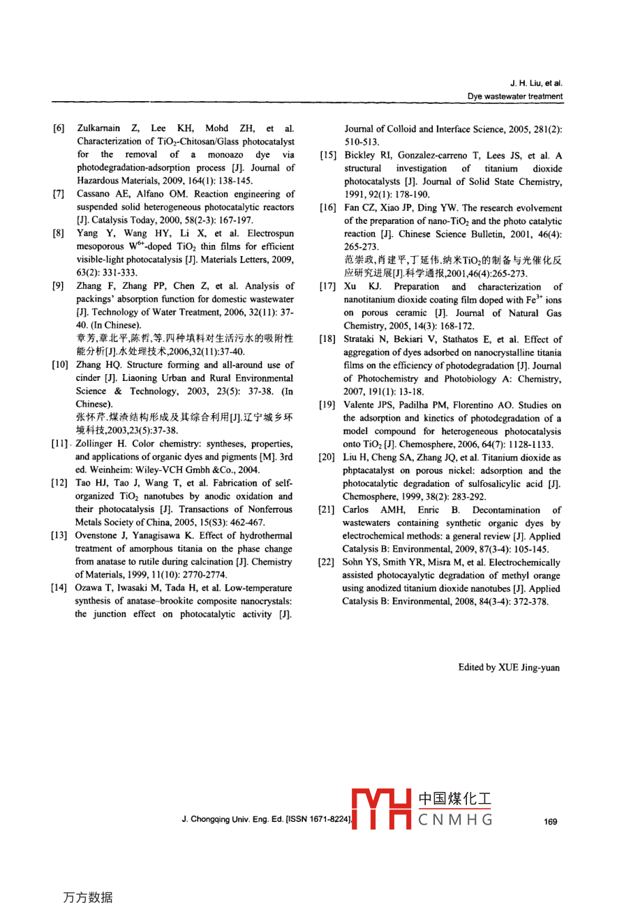 Vol 8 No. 3Joumal of Chongqing University(English Edition)[ISSN 1671-82241September 2009Article|D:1671-8224200903016505Toce this article: LIU Jian-hua, WANG Huai-jun Treating dye wastewater by TiOz coated on coal cinder J J Chongqing Univ. Eng Ed [IssN 1671-82241 2009. 8(3): 165-Treating dye wastewater by tiO, coated on coal cinderLIU Jian-hua 4T, WANG Hai-jun?1 Key La 1Department of Chemical and Material Engineering, Jiangnan University,oratory of Yangtze River Water Environment, Ministry of Education, Yibinity, Sichuan 644000, P R Chinau 214122 P.R. chinaReceived 21 April 2009: received in revised form 5 May 2009Abstract: We investigated the photocatalytic degradation of dye wastewater by using titanium dioxide(tiO2)coated on a coalcinder. The coal cinder was used as the carrier, with a thin film of TiO2 coated on it by using the sol-gel method. Using theCongo red as the model pollutant for dye wastewater, we studied the decolorization efficiency, and effects of Tio film thicknessand roasting temperature on the efficiency. We also evaluated the recycling and regeneration of the immobilized TiO 2(TiO/cinder). Results show that the decolorization rate of Congo red solution was more than 98% after 2 h treatment when wused TiO,/cinder calcined at 500C for 2 h and coated four times as the photocatalyst. At the same time, the TiO//cinderemained high catalytic activity after being reused and regenerated for many timesKeywords: titanium dioxide; coal cinder, Congo red; dye wastewater; photocatalysiCLC number: o643 36Document code: A1 Introductionmethods to reduce biological oxygen demand(BOD),chemical oxygen demand(COD), and suspended solidThe majority of dyes used in the textile industry are are generally satisfactory, except the removal of dyethe azo dyes, accounting for more than 50% of all color [3]. Therefore, the decolorizing treatment of dyecommercial dyes. These dyes include azo groups(N=N) wastewater is a difficult problem to solve. Manymainly bound to substituted benzene or naphthalene researchers have studied on the semiconductor as arings [1]. Dyes are visible even of small quantities photocatalyst in decolorization of dye wastewater [4](0.005 mg), and the color of dyes can interfere with Among a variety of photo catalysts, titanium dioxidetransmission of sunlight into natural streams. (TiO2) is the most preferable due to its non-toxic,Furthermore, many of the azo dyes and their insoluble, stability, high photoactivity and inexpensiveintermediate products, such as aromatic amines, are nature [5-6]. However, the technology oftoxic to aquatic life, carcinogenic and mutagenicphotocatalysis has not been industrially applied tohumans. Consequently, dyes have to be removed from treating wastewater. The main problem of thetextile wastewater before discharge [2]pplication is the separation and reuse of powderDye wastewater is characterized by high photocatalyst. Such difficulty is more serious withconcentration,complicated component, deep color, and nanometer-scale ultrafine powder [7-8difficult to biodegrade. Treatment of wastewater byWe used the coal cinder as a photocatalyst carrier toconventional chemical coagulation and biological solve this problem. Its main compositions are SiozAl2O,, Fe2 O3, and Cao [9-10]. TiO2 attached on it canact as a composite photocatalyst, which shows higherLIU Jian-hua(劉建華} Liujianhua418@126cmcatalytic activity for facilitating the separation ofFunded by the Youth Fund Project of Yibin University(No QJ05- electron and hole during the reaction of photocatalysisThe coal cinder has high adsorbability because it has中國煤化工CNMHGJ. H. Liu, et al.Dye wastewater treatmentmany pores on the surface and inner parts. Therefore, different temperature for 2 h and cooling it at roomwhen used as the photocatalyst carrier, it improves the temperature. Then the TiOz films on the cinder ofeffect of photodegradation of wastewater and changes different layers and roasting temperature were formedrom solid waste into valuables. At present, althoughmany researchers have studied on the wastewater 2.2 Photocatalysis experimentsphotocatalyst carriers, relatively less research has beerThe reactor was a glass beaker(250 mL), in whichcarried out on treating wastewater by using5 g cinder coated with TiO2 film were settled near thephotocatalyst fixed on cinder.surface of solution (about 1 cm). Then, 200 mLCongo red, which is a stable basic azo dye, is a solution of Congo red(20 mg/L)was added into thecompound that contains azo groups(N=N-) Due tobeaker and stirred by a magnetic stirrer. For indoorits high stability, Congo red is commonly used as a experiments, thelight source was a lamp(Philips tLDtitration indicator and a staining agent [ 11]. Moreover, 15 w) emitting between 300 nm and 450 nm. Durings a typical direct azo dye of biphenyl amine, Congothe reaction, the solution was sampled every 30 mined is commonly used in textile industries. Therefore,The decolorization rate (X was determined bywe chose it as a model pollutant in this study.measuring the absorbance at 504 nm using an UV-visible spectrophotometer.2 Experimental detailsX=(4-A)4×100%2.1 Preparation of TiO2 on cinderwhere Ao and A were the initial absorbance and thereacting absorbance of Congo red, respectively2.1. I Pretreatment of cinder3 Results and discussionCoal cinder was pretreated to remove the chlorineion and other organic compounds on it. Loose and 3. I Influence of preparing condition of TiO2 film onporous cinder from the stokehold of Yibin Universitydecolorizing efficiencywas used, which was broken into granule with thediameter of about 1.0 cm. The granules were soaked in 3. 1. I Calcination temperature of TiO.a solution of hydrochloric acid (H20: HCI= 1: 1)for24 h. then taken out and washed for three times withWe performed a set of tests to study the influence of thedistilled water and anhydrous ethanol, respectively. TiO /cinder calcination temperature on the decolorizationAfter dried in an oven