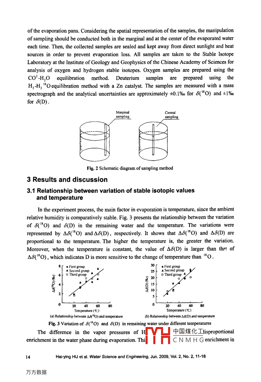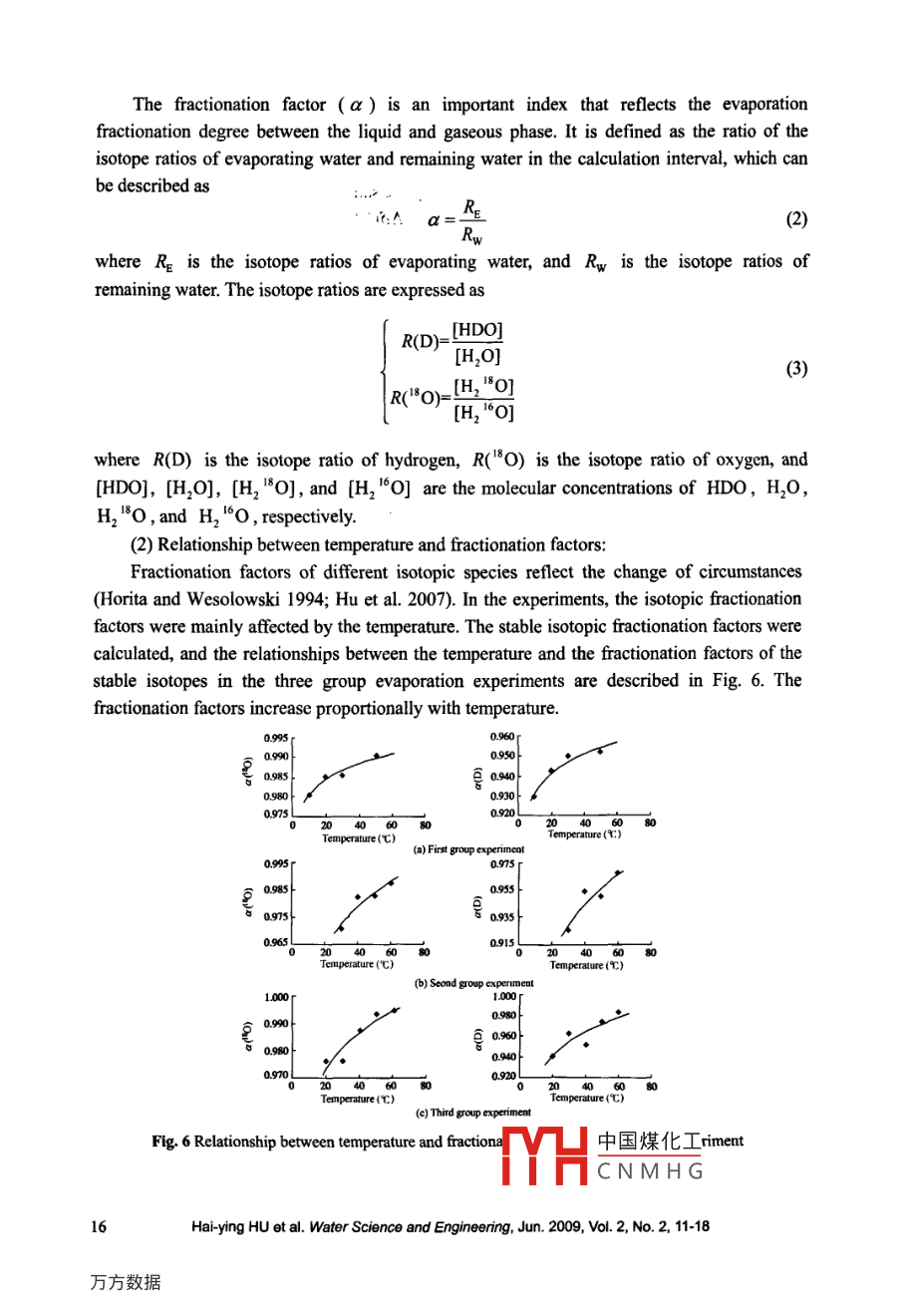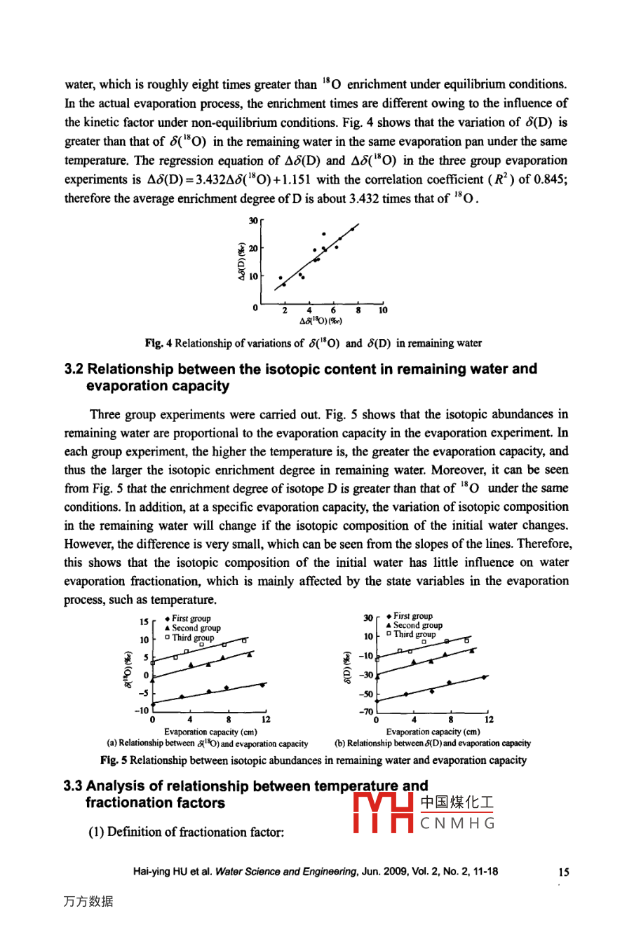 Water Science and Engineering, 2009, 2(2): 11-18dol:10388/jissn.1674-2370.2009.02.002htp://kb.hhu.edu.cne-mail: wse@hhu.edu.cnExperimental study on stable isotopic fractionation ofevaporating water under varying temperatureHai-ying HU*l,2, Wei-min BAO', Tao WANG', Si-min QU2I. School ofCivil Engineering and Transportation, South China University of Technology,Guangzhou 510641, P. R. China2. College of Hydrology and Water Resources, Hohai Universiny, Nanjing 210098, P. R. ChinaAbstract: The variation of stable isotope ratios in natural waters provides valuable information thatcan be used to trace water movement. Evaporation plays a crucial role in determining the variationof stable isotopes. In this paper, several evaporation experiments were conducted in order to studythe stable isotopic fractionation mechanism of water and analyze the influence of differenttemperatures on evaporation fractionation. Three group experiments of water evaporation underdifferent temperatures and initial isotopic values were carried out. The results show thatfractionation factors of hydrogen and oxygen may increase with temperature, and the averageenrichment degree of hydrogen isotope D is 3.432 times that of oxygen isotope 8O . The resultsalso show that the isotopic composition of the initial water has lttle influence on water evaporationfractionation, which is mainly affected by the state variables in the evaporation process, such astemperature. This research provides experimental data for further understanding the evaporationfractionation mechanism.Key words: water evaporation; hydrogen and oxygen isotopes; fractionation mechanism;temperature; experimental study1 IntroductionStable isotopes of oxygen and hydrogen are commonly used as hydrological tracers due totheir properties of mass conservation and measurable variability in water budget components(Wen 2002). As fingerprints of water, the stable isotopic species D and 80 respond greatly toenvironmental changes (Gat 1996; Gibson et al. 2005; Lee et al. 2007). Evaporation plays acrucial role in determining isotopic ratios of the subsequent processes of precipitation andrunoff. The isotopic composition of water in rivers, lakes, and soil may change in the course ofthe water's transformation into different states, owing to evaporation fractionation. Thevariation of hydrogen and oxygen isotopes in surface water and atmospheric vapor is caused bystable isotopic fractionation during phase changes (Zhang et al. 2005; Gremillion andWanielista 2000). The light isotopic species of water, H, 180 , has a higher vapor pressure and中國煤化工This work was supported by the National Natural Science FoulMHC N M H G679024) and theInnovation Program for College Graduate of Jiangsu Province of 2007 (Grant No. CX07B_ 130Z).*Corresponding author (e-mail: 108huhaiying@I 63.com)Received Feb.15, 2009; accepted May 13, 2009diffusivity than the heavy species, H2 180 and HDO, and is removed from the water surfacein greater proportion during evaporation (Tian et al. 2000; Cappa et al. 2003). The remainingwater thereby becomes enriched with the heavy isotopic species.With the improvements in mass spectrometric techniques, it is possible to accuratelymeasure stable isotopic components of water samples. The value of stable isotopic content canbe expressed by isotope abundance (8) ,which represents the relative deviation from theadopted standard representing mean isotopic composition of the global ocean (Qu et al.2006):δ=、 Rvsmow;-1 )|x 1000%0(1)where R and Rvsmow are the isotope ratios of the general water sample and the standardwater sample, respectively.The original model describing stable isotopic fractionation was developed by LordRayleigh for the case of fractional distillation of mixed liquids. The Rayleigh model is used forsystems in which the isotopic species removed at each moment are thermodynamic andisotopic equilibrium with those remaining in the system (Gat et al. 2001). Under Rayleighequilibrium conditions, stable isotopic ratios of remaining water increase exponentially as theremaining water proportion decreases. Craig and Gordon (1965) argued that after the primaryequilibrium fractionation, further fractionation should occur, and they suggested a model forisotope fractionation during non-equilibrium evaporation. Gonfiantini (1986) summarized thearguments of Graig and Gordon, ascribing the further depletion to kinetic effects duringmolecular diffusion within the boundary layer between the water-air interface and the fullyturbulent region. In that boundary layer, diffusion predominates because of slow atmospherictransport (Merlivat 1978).In this study, three group water evaporation experiments under different temperatures andinitial isotope ratios of liquid were conducted, and the stable isotopic fractionation mechanismsof waters were further investigated. The experiments generated some basic data which wouldbe helpful in understanding the basic law of evaporation fractionation and could provide a basisfor better use of isotope technology in hydrology.2 Water evaporation experiments under different temperatures2.1 Experimental introductionThree group water evaporation experiments with different initial isotopic values wereconducted at the State Key Laboratory of Hydrology-Water Resources and HydraulicEngineering, Hohai University, China. There were five evaporation pans in each group, and theevaporation pans were cylindrical, with heights and diameters of 35 cm. Each groupevaporation experiment lasted two days. The five evaporation pans in each group ofexperiments were illuminated by an incandescen中國煤化工ctive surfacetemperatures were controlled at 20C, 30'C, 40C, 5YHC N M H G° temperature12Hai-ying HU et al. Water Science and Engineeing, Jun. 2009, Vol. 2, No. 2, 11-18could be adjusted according to the power of the incandescent lamp, as shown in Fig. 1. Theisotopic values of initial water in each group of experiments are listed in Table 1. The firstgroup e