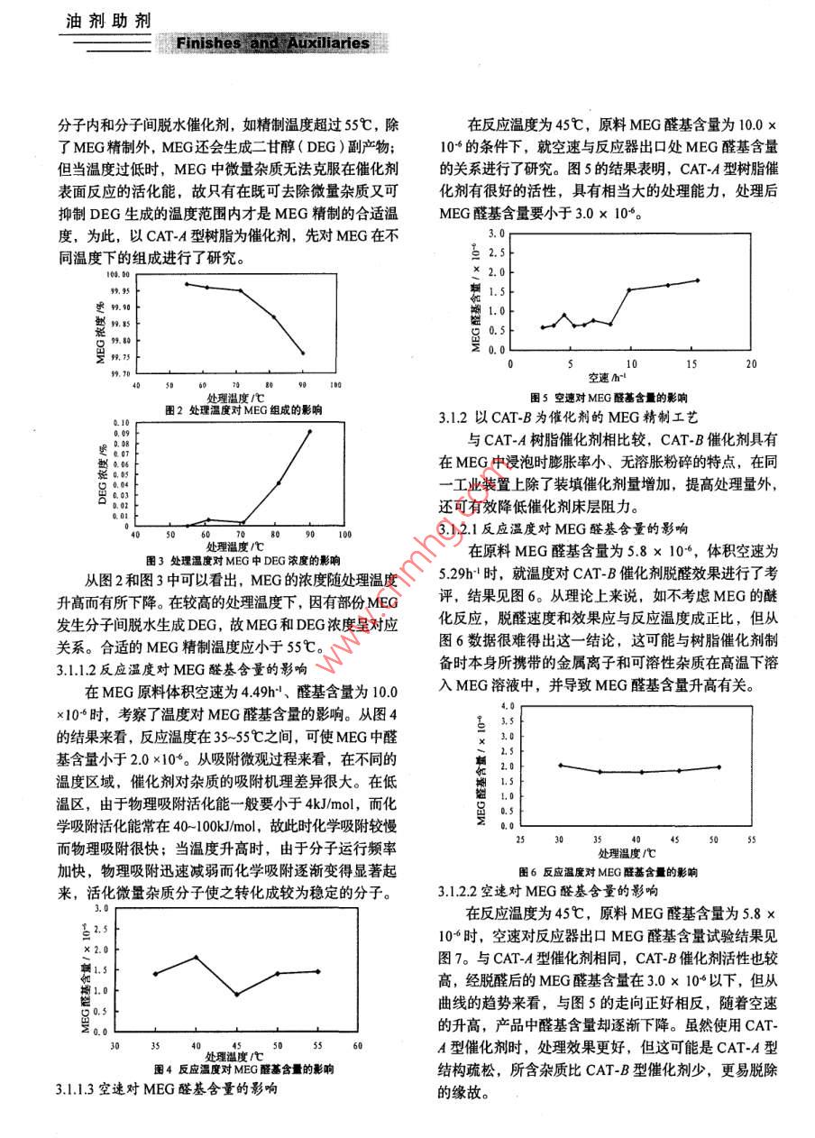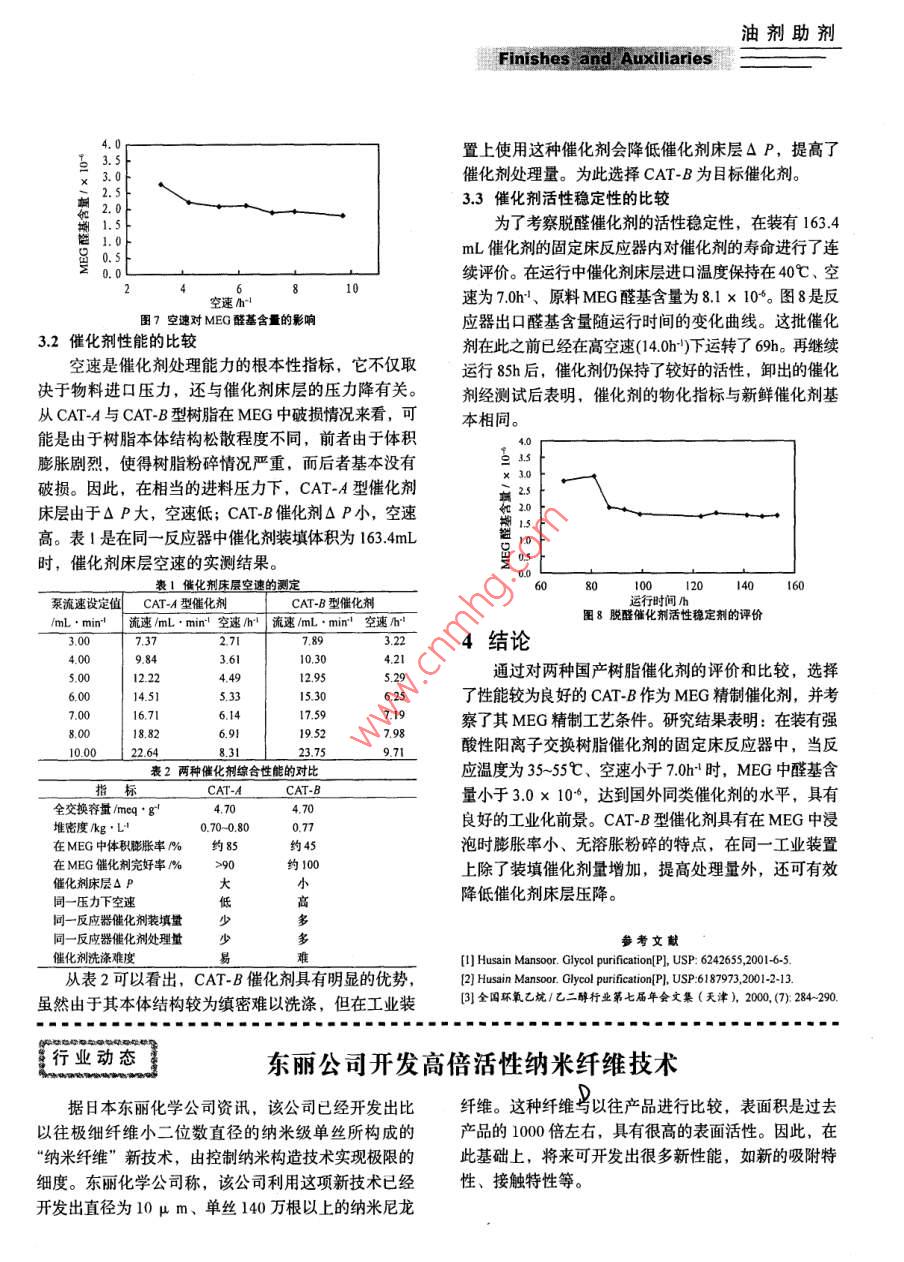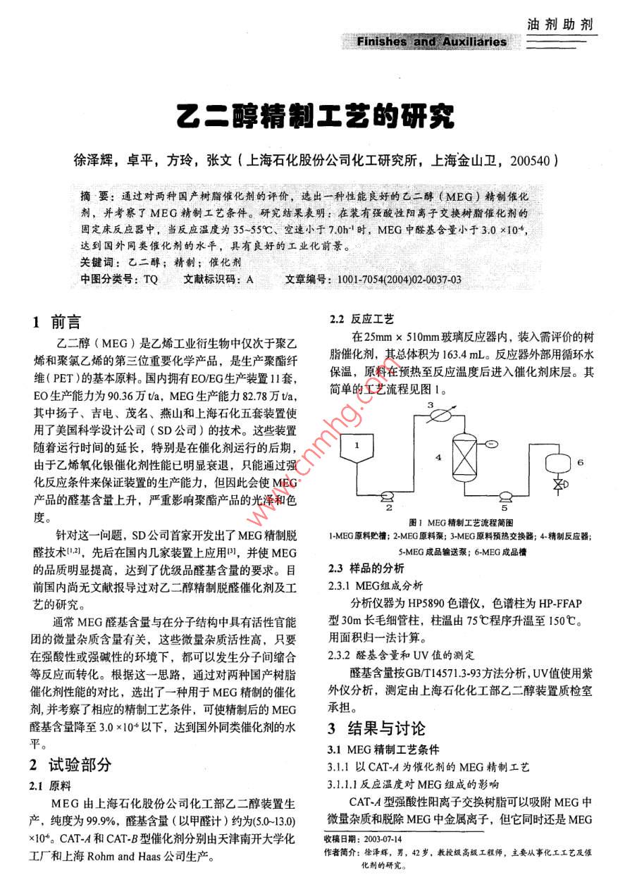 油劑助劑Finishes and Auxiliaries三乙二醇精制工藝的研究徐澤輝,卓平,方玲,張文(上海石化股份公司化工研究所,上海金山衛(wèi),200540)摘要:通過對兩種國產(chǎn)樹脂催化劑的評價,選出一種性能良好的乙二醇(MEG)精制催化劑,并考察了MEG精制工藝條件。研究結(jié)果表明:在裝有強酸性陽離子交換樹脂催化劑的固定床反應(yīng)器中,當反應(yīng)溫度為35-55℃C、空速小于70h時,MEG中醛基含量小于3.0×10“,達到國外同類催化劑的水平,具有良好的工業(yè)化前景。關(guān)鍵詞:乙二醇;精制;催化劑中圖分類號:TQ文獻標識碼:A文章編號:1001-70542004)02-0037031前言22反應(yīng)工藝乙二醇(MEG)是乙烯工業(yè)衍生物中僅次于聚乙在25mm×510mm玻璃反應(yīng)器內(nèi),裝入需評價的樹烯和聚氯乙烯的第三位重要化學(xué)產(chǎn)品,是生產(chǎn)聚酯纖脂催化劑,其總體積為1634mL。反應(yīng)器外部用循環(huán)水維(PET)的基本原料。國內(nèi)擁有EOEG生產(chǎn)裝置11套,保溫,原料在預(yù)熱至反應(yīng)溫度后進入催化劑床層。其EO生產(chǎn)能力為90.36萬ta,MEG生產(chǎn)能力8278萬ta,簡單的工藝流程見圖1。其中揚子、吉電、茂名、燕山和上海石化五套裝置使用了美國科學(xué)設(shè)計公司(SD公司)的技術(shù)。這些裝置隨著運行時間的延長,特別是在催化劑運行的后期,由于乙烯氧化銀催化劑性能巳明顯衰退,只能通過強化反應(yīng)條件來保證裝置的生產(chǎn)能力,但因此會使MEG產(chǎn)品的醛基含量上升,嚴重影響聚酯產(chǎn)品的光澤和色度圖1MEG精制工藝流程簡圖針對這一問題,SD公司首家開發(fā)出了MEG精制脫1MEG原料貯槽;2MEG原料泵;3MEG原料預(yù)熱交換器;4精制反應(yīng)器醛技術(shù)2,先后在國內(nèi)幾家裝置上應(yīng)用,并使MEG5MEG成品輸送泵;6MBG成品槽的品質(zhì)明顯提高,達到了優(yōu)級品醛基含量的要求。目23樣品的分析前國內(nèi)尚無文獻報導(dǎo)過對乙二醇精制脫醛催化劑及工231MEG組成分析藝的研究。分析儀器為HP5890色譜儀,色譜柱為 HP-FFAP通常MEG醛基含量與在分子結(jié)構(gòu)中具有活性官能型30m長毛細管柱,柱溫由75℃程序升溫至10℃。團的微量雜質(zhì)含量有關(guān),這些微量雜質(zhì)活性高,只要用面積歸一法計算。在強酸性或強堿性的環(huán)境下,都可以發(fā)生分子間縮合232醛基含量和UV值的測定等反應(yīng)而轉(zhuǎn)化。根據(jù)這一思路,通過對兩種國產(chǎn)樹脂醛基含量按GBT4571393方法分析,UV值使用紫催化劑性能的對比,選出了一種用于MEG精制的催化外儀分析,測定由上海石化化工部乙二醇裝置質(zhì)檢室劑,并考察了相應(yīng)的精制工藝條件,可使精制后的MEG承擔。醛基含量降至30×104以下,達到國外同類催化劑的水3結(jié)果與討論平3.1MEG精制工藝條件2試驗部分31以CATA為催化劑的MEG精制工藝21原料3.11.1反應(yīng)溫度對MEG組成的影響MEG由上海石化股份公司化工部乙二醇裝置生CAT~A型強酸性陽離子交換樹脂可以吸附MEG中產(chǎn),純度為99%,醛基含量(以甲醛計)約為(50-130)微量雜質(zhì)和脫除MEG中金屬離子,但它同時還是MEG10°。CAT-A和CATB型催化劑分別由天津南開大學(xué)化收稿日期:20010714工廠和上海 Rohm and haas公司生產(chǎn)作者簡介:徐澤輝,男,42歲,教授級高級工程師,主要從事化工工藝及催化劑的研究。油劑助劑Finishes and Auxiliarie分子內(nèi)和分子間脫水催化劑,如精制溫度超過55℃,除在反應(yīng)溫度為45℃,原料MEG醛基含量為100了MEG精制外,MEG還會生成二甘醇(DEG)副產(chǎn)物;106的條件下,就空速與反應(yīng)器出口處MEG醛基含量但當溫度過低時,MEG中微量雜質(zhì)無法克服在催化劑的關(guān)系進行了研究。圖5的結(jié)果表明,CAT·A型樹脂催表面反應(yīng)的活化能,故只有在既可去除微量雜質(zhì)又可化劑有很好的活性,具有相當大的處理能力,處理后抑制DEG生成的溫度范圍內(nèi)才是MEG精制的合適溫MEG醛基含量要小于30×10。度,為此,以CAT-A型樹脂為催化劑,先對MEG在不同溫度下的組成進行了研究。2.59.9029空速ht處理溫度C成的影圖5空速對MEG醛基含量的影響圖2處理溫度對MEG響31.2以CATB為催化劑的MEG精制工藝與CATA樹脂催化劑相比較,CAT-B催化劑具有在MEG中浸泡時膨脹率小、無溶脹粉碎的特點,在同工業(yè)裝置上除了裝填催化劑量增加,提高處理量外,還可有效降低催化劑床層阻力。31.2.1反應(yīng)溫度對MEG醛基含量的影響處理溫度/℃圖3處理溫度對MEG中DEG濃度的影響在原料MEG醛基含量為58×10·,體積空速為從圖2和圖3中可以看出,MEG的濃度隨處理溫度2h時,就溫度對CATB催化劑脫醛效果進行了考升高而有所下降。在較高的處理溫度下,因有部份MEG評,結(jié)果見圖6。從理論上來說,如不考慮MEG的醚發(fā)生分子間脫水生成DEG,故MEG和DEG濃度呈對應(yīng)化反應(yīng),脫醛速度和效果應(yīng)與反應(yīng)溫度成正比,但從關(guān)系。合適的MEG精制溫度應(yīng)小于55℃。圖6數(shù)據(jù)很難得出這一結(jié)論,這可能與樹脂催化劑制31.1.2反應(yīng)溫度對MEG醛基含量的影響備時本身所攜帶的金屬離子和可溶性雜質(zhì)在高溫下溶在MEG原料體積空速為449h-、醛基含量為100入MEG溶液中,并導(dǎo)致MEG醛基含量升高有關(guān)。x106時,考察了溫度對MEG醛基含量的影響。從圖的結(jié)果來看,反應(yīng)溫度在35-55℃之間,可使MEG中醛基含量小于20×106。從吸附微觀過程來看,在不同