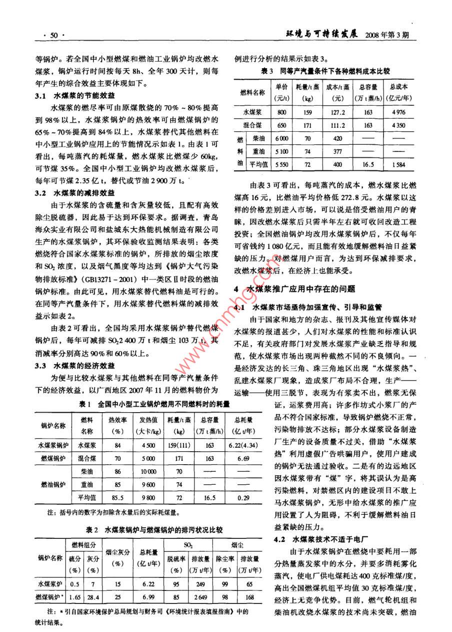 蘇境與丁持犢發(fā)展2008年第3期ENVIRONMENT AND SUSTAINABLE DEVELOPMENT水媒漿在節(jié)能減排中的應用價值林華榮龐興云2崔珊珊羅荔龍光星廖春燕(1.北海市環(huán)境保護科學研究所,廣西北海,5360002.合浦縣工業(yè)園區(qū)管理委員會,廣西合浦,536100)擠要】水煤漿的節(jié)能減排和經(jīng)濟效益顯著,國家對其發(fā)展十分重視,已被廣泛用于工業(yè)鍋爐和窯爐。為促進水煤漿產(chǎn)業(yè)健康發(fā)展,緩解燃料油緊缺壓力,需加強水煤漿市場的宣傳、引導和監(jiān)管。【關犍詞】水煤漿;節(jié)能減排;應用價值;宣傳引導中圖分類號:X3821文獻標識碼:A文章編號:1673-28X(200)03-009-0我國的燃煤工業(yè)鍋爐和工業(yè)窯爐,存在著燃燒效由于水煤漿在工業(yè)鍋爐(1-150/h)和工業(yè)窯爐率低、污染嚴重的現(xiàn)象,是節(jié)能減排工作要解決的重(陶瓷行業(yè)的噴霧干燥塔,油田的盤管式燃油爐、導熱點。為此,本文淺析了一種煤基流體清潔燃料——水油爐等)上的節(jié)能減排和經(jīng)濟效益顯著,目前在這方煤漿在工業(yè)鍋爐(窯爐)節(jié)能減排中的應用價值面的應用發(fā)展較快。據(jù)悉,廣西南寧市人民政府于2007年4月下文大力推廣應用水煤漿鍋爐和窯爐,并水煤漿的制備與燃燒系統(tǒng)成立專門的辦公室和出臺鼓勵扶持政策。1.1水煤漿的制備日用油箱點火油泵水煤漿以洗精煤或低灰、低硫的原煤(60%68%)為主,以水(32%~40%)為輔,經(jīng)二級磨工藝攪拌器煤泵過濾器燃燒器設備研磨、細化、充分混合,在0.2%~1%非離子型萘磺酸鹽的作用下,形成均勻穩(wěn)定的流體,具有燃料水煤漿儲罐空氣壓縮機空氣儲罐爐或窯油一樣的流動性。其理化指標:灰分<7%、硫分<排空}[除塵股依器0.5%、濃度65±1%、黏度1000±200MPa·8,穩(wěn)定期>1個月,熱值4500~500kcal/kg,符合國家現(xiàn)行標灰分分離循環(huán)水池1.2水煤漿燃燒系統(tǒng)圖1水煤漿燃燒系統(tǒng)工藝流程圖水煤漿以高壓流態(tài)霧化噴燒方式燃燒,與燃油相2.2國家有關水煤漿技術的產(chǎn)業(yè)政策似,其燃燒系統(tǒng)的基本工作程序是:水煤漿從儲漿罐國家對發(fā)展水煤漿產(chǎn)業(yè)一直十分重視。自“十五”進入攪拌器,經(jīng)供漿泵輸至過濾器后,在空氣壓縮機以來,國家有關部門在下發(fā)的各項有關文件中,如產(chǎn)生的高壓氣體的作用下經(jīng)特制噴槍送入燃燒器,用《關于印發(fā)節(jié)約和替代燃油“十五”規(guī)劃的通知》(國油點火,在爐膛內燃燒;產(chǎn)生的廢氣經(jīng)高效除塵脫硫經(jīng)貿資源〔2001〕1019號)、《關于印發(fā)國家產(chǎn)業(yè)政策器處理達標后,由煙囪排入大氣。水煤漿燃燒系統(tǒng)工的通知》(國經(jīng)貿技術[2002)444號)、《關于發(fā)布藝流程圖示如圖1。200年國家重點環(huán)境保護實用技術項目的通知》(環(huán)發(fā)2水煤漿技術發(fā)展應用現(xiàn)狀和國家產(chǎn)業(yè)政策〔2002〕11號),國家發(fā)改委發(fā)布的《產(chǎn)業(yè)結構調整指導目錄(2005年本)和《當前優(yōu)先發(fā)展的高技術產(chǎn)業(yè)本技教波點要*的明開發(fā)、工業(yè)性實人點*肉之4度),均將木技驗和商業(yè)示范應用歷程,其生產(chǎn)與應用技術基本成熟已推廣到大部分省、區(qū)、市。據(jù)200年8~9月國家發(fā)3水煤漿應用的綜合效益改委會同有關部門的調查,全國水煤漿生產(chǎn)能力達1我國現(xiàn)有在用中小型工業(yè)鍋爐50多萬臺,總容量500萬t以上,在20多臺電站燃油鍋爐、300多臺工業(yè)約180萬蒸h,其中燃煤鍋爐約163萬蒸th,燃油鍋爐及數(shù)百臺工業(yè)窯爐上替代燃油、燃氣和燃煤。(柴油和重油)鍋爐約165萬蒸th,其余為燃氣和燃電環(huán)境與可持續(xù)瘋晨208第3期等鍋爐。若全國中小型燃煤和燃油工業(yè)鍋爐均改燃水例進行分析的結果示如表3。煤漿,鍋爐運行時間按每天8h、全年300天計,則每表3同等產(chǎn)汽量條件下各種燃料成本比較年產(chǎn)生的綜合效益主要體現(xiàn)如下。單價耗量/蒸成本/蒸總容量總成本3.1水煤漿的節(jié)能效益燃料名稱(元)(萬t蒸h)(億元/年)水煤漿的燃盡率可由原煤散燒的70%~80%提高水煤漿80012724976到98%以上,水煤漿鍋爐的熱效率可由燃煤鍋爐的混合煤l1.265%-70%提高到84%以上,水煤漿替代其他燃料在中小型工業(yè)鍋爐應用上的節(jié)能情況示如表1。由表1可燃柴油看出,每噸蒸汽的耗煤量,燃水煤漿比燃煤少60kg料重油510074可節(jié)煤35%。全國中小型工業(yè)鍋爐均改燃水煤漿后,油平均值550n2400651584每年可節(jié)煤235億t,替代或節(jié)油2900萬to由表3可看出,每噸蒸汽的成本,燃水煤漿比燃32水煤漿的減排效益煤高16元,比燃油平均價格低272.8元。水煤漿以這由于水煤漿的含硫量和含灰量較低,且配有高效樣的價格差別進入市場,可以說是倍受燃油用戶的青除塵脫硫器,因此易于達到環(huán)保要求。據(jù)調查,青島睞,因改燃水煤漿后只需半年左右就可收回改造工程海眾實業(yè)有限公司和鹽城東大熱能機械制造有限公司投資;全國燃油鍋爐均改用水煤漿鍋爐后,不僅每年生產(chǎn)的水煤漿鍋爐,其環(huán)保驗收監(jiān)測結果表明:各類可省錢約1080億元,而且能有效地緩解燃料油日益緊燃燒符合國家水煤漿標準的鍋爐,所排放的煙塵濃度缺的壓力。對燃煤用戶而言,為達到環(huán)保減排要求和SO2濃度,以及煙氣黑度等均達到《鍋爐大氣污染改燃
