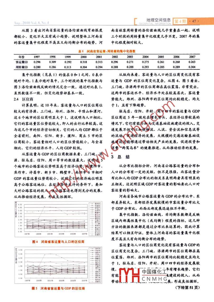 廠地理空間信息 第4期.45.Aug.. 2010 Vol. 8. No.4河南省公路客流的空間分布規(guī)律李斌,張東山,秦奮(河南大學環(huán)境與規(guī)劃學院,河南開封475004)商要:根據(jù)河南省各地市公路客流數(shù)據(jù),通過客適量.周轉(zhuǎn)量空間分布的評價指標,分析了河南省公路客流的空間分布規(guī)律。研究表明河南省各區(qū)域客運量與GDP的分布極不平街,通過對公路客運的分布集中化水平的研究,發(fā)現(xiàn)河南省公路客運水平區(qū)域差異較大,進一步分析了其與經(jīng)濟發(fā)展的關系。關鍵詞:公路客流;空間分布;河南省中圖分類號: P208文獻標志碼: B文章編號: 1672- 4623 (2010) 04-0045-03Spatial Distribution Regularities of the Flow of HighwayPassenger in Henan ProvinceLI Bin,ZHANG Dongshan,QIN Fen(College of Environment and Planning, Henan University, Kaifeng 475004, China)Abstract:According to the data of the highway passenger in Henan Province, using indexes of the spatial distribution,the spatial distribution regularities of the flow of highway passenger in Henan Province were researched. The resultsshowed that the distribution of passenger traffic and CDP was extremely uneven in every region. By studying theconcentration level of the flow of highway passenger, a big difference was found among different regions. Then thispaper analyzed the relation between the passenger transport and regional economic development.Key words: highway passenger; distibution regularities; Henan Province交通運輸在社會經(jīng)濟系統(tǒng)活動中具有重要作用. .施優(yōu)化配置、客流預測調(diào)配、區(qū)域經(jīng)濟協(xié)調(diào)發(fā)展有一研究客運生成量與經(jīng)濟指標的空間分布及對比關系,能定的借鑒意義.夠發(fā)現(xiàn)河南省公路客運量的區(qū)域差異,分析其與經(jīng)濟1客運分布的評價指標發(fā)展的關系。張文嘗、金鳳君首次提出運輸聯(lián)系的四個基本規(guī).1 分布比(P)律:生成規(guī)律、增長規(guī)律、分布規(guī)律、交流規(guī)律;對我指地域系統(tǒng)中一個要素在各亞區(qū)域上的百分比,國的空間運輸聯(lián)系進行了深入研究1.”。曹小曙"、李其值越大表明分布在該亞區(qū)上的份額越多。平華51分別研究了珠三角和長三角客運的空間分布及1.2 地域分布非均衡系數(shù)(8)演化規(guī)律.是根據(jù)亞區(qū)域分布比求得的標準差,8值越大,分從河南省公路客流研究來看,苗長虹、王海江舊布越不均衡。公式如下:驗證了城市之間的經(jīng)濟聯(lián)系強度與公路、鐵路客運之間確實有著極強的線性相關性;段利娟m對河南省公路旅客運輸規(guī)律的總體情況進行了探討,得出了初步式中,P為亞區(qū)的分布比,p分布比的平均值,n為亞結(jié)論。李斌1利用了河南省公路客流數(shù)據(jù),總結(jié)了空區(qū)域數(shù)。間運輸聯(lián)系的生成規(guī)律。1.3 洛倫茲曲線及集中化指數(shù)(I)近年河南省公路發(fā)展水平和速度為全國前列,本根據(jù)某要素亞區(qū)分布比排序后,以分布比累計值文利用統(tǒng)計數(shù)據(jù)以研究公路客運問題有著很強的現(xiàn)實所作中國煤化工際分布狀態(tài)和假設意義。研究公路客流的分布規(guī)律對河南省交通基礎設均勻C布集中化程度越高。MHCNMHG收稿日期: 2010-05-10項目來源:國家自然科學基金資助項目(0771166. 40901284)..46.第4期地理空間信息Ang.2010Vol.8. No.4GEOSPATIAL INFORMATION從圖中發(fā)現(xiàn): 1)中、東部差異大。東部經(jīng)濟發(fā)展.. A-RI=M-R較慢的市客運量分布比大于GDP分布比,這些地區(qū)應式中,A為實際累計分布比合計值,M為最高集中分大力發(fā)展經(jīng)濟,加大交通基礎設施投入,以滿足日益布時的累計分布比合計值,R為最均衡分布時累計分發(fā)展的客運的需求。中部經(jīng)濟發(fā)展較快的地市GDP的布比合計值。分布比大于客運量分布比,且GDP仍處于增長趨勢,1.4 區(qū)位商(Q)也應該考慮公路客運的建設,使其相互協(xié)調(diào),共同發(fā)指兩個相關指標分布比的商,分析運輸聯(lián)系時,展。2)西北部發(fā)展迅速但不平衡。三門峽,濟源、焦一般以人口、產(chǎn)值分布比等為分母,運輸生成量分布作、洛陽等市的近些年經(jīng)濟發(fā)展迅速,人均GDP在全比為分子,求其比值。它表示一個區(qū)城產(chǎn)生客運量的省靠前,但客運量分布比和GDP分布比相差較大,極勢能。不平衡.該市應該考慮使經(jīng)濟發(fā)展帶動公路客運發(fā)展,進一步加大交通基礎設施建設的投入力度。2運輸聯(lián)系的分 布規(guī)律2.2地域分 布非均衡系數(shù)2.1 分布比地域分布非均衡系數(shù)(6)是根據(jù)亞區(qū)域分布比求運輸生成量的空間分布用客運量分布比、人口分得的標準差,8值越大,分布越不均衡。布比及GDP分布比來衡量。圖2表明1997 - 2007 年河南省四項指標的非均計算1997. 2002、2007 年份的客運量分布比和人衡系數(shù)呈現(xiàn)出不同的變化特征。河南省各地市GDP的口分布比的相關系數(shù),值分別是: 0.67. 0.48. 0.67. 說發(fā)展更加趨于不均衡;人口的非均衡系數(shù)基本保持不明客運量的分布和人口的分布有- 定的關聯(lián),但不是變;客運量及其周轉(zhuǎn)量的非均衡系數(shù)上下波動較大,且很強。而客運量分布比和GDP分布比的相關系數(shù)分別呈現(xiàn)變化趨勢較一致的特征。199 2000 年旅客周轉(zhuǎn)是: 0.81. 0.79. 0.80, 說明區(qū)域GDP對客運量的影響量和客運量的非均衡系
