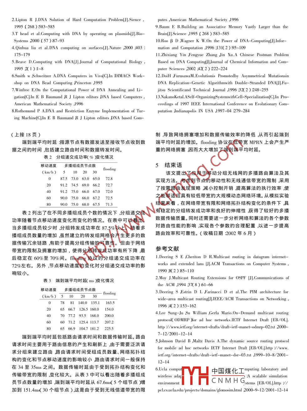 組合優(yōu)化中的DNA計算殷志祥董亞非許進(華中科技大學控制科學與工程系,武漢430074 )E-mail zxyin@mail.hust.edu.cn摘要由于電子計算機的存貯量小運算速度慢智能化低特別是制造工藝趨于極限等特點,因此,目前采用DNA計算的可能性引起了人們的廣泛關(guān)注尤其是它的良好的并行性。該文在簡要介紹DNA計算的實施方法后探討了DNA計算及其相關(guān)的數(shù)學模型指出了DNA計算的優(yōu)點及存在的問題。最后簡述了DNA計算與圖論、遺傳算法、人工神經(jīng)網(wǎng)絡(luò)、納米材料等的聯(lián)系。關(guān)鍵詞圖論遺傳算法 人工神經(jīng)網(wǎng)絡(luò) 納米科技 計算文章編號1002 -8331-( 2002 )19- -0025- -03文獻標識碼 A中圖分類號 TP301.6DNA Computing in Combination and OptimizationYin Zhixiang Dong Yafei Xu Jin( Department of Control Science and Engineering ,Huazhong University ofScience and Technology ,Wuhan 430074 )Abstract: Due to electronie computer of small storage capacity slow operation speed and low intelligence particularlylimited manufacture technics recently ,the possibility of using DNA as a computing tool arouses abroad interests ofresearchers.Especially it is highly parallel.After a brief introduction on implementation of DNA computing ,this paperdiscusses DNA computing and correlational mathematics models.The paper points out the advantages and existingproblems.Finally it simply introduces the contact between DNA computing and graph theory Genetic algorithm artificialneural networks and Le meter material.Keywords : Graph theory ,Genetic algorithm Artificial neural networks Le meter material ,Computing1引言過交叉互相交換鏈.上的核苷酸。從DNA的原理來看,它與數(shù)學電子計算機在人類社會起到了巨大的促進作用但由于電操作非常類似,單連DNA可看作由四個不同符號A、T、C、G組子計算機的存貯量小運算速度慢智能化低導致人們迫切希成的串。它在數(shù)學上就像電子計算機中編碼0”和1"一樣可望尋找一種能克服上述缺點的新型計算機。1953 年Waston和表示成四字母的集E={A T C G)來譯碼信息。DNA鏈可作為Crick發(fā)現(xiàn)DNA之后,人們發(fā)現(xiàn)許多操作DNA的方法。如酶譯碼信息酶可看作模擬在DNA鏈上簡單的計算。不同的酶用切、粘、貼、電泳、聚合鏈反應(yīng)、加熱、退火等。這些操作DNA的于不同的算子,如,限制內(nèi)切酸酶可作為分離算子,DNA 連結(jié)方法有助于人們解決內(nèi)存及信息的輸入和接收。酶可作為聯(lián)結(jié)算子,DNA 聚合酶可作為復(fù)制算子,外 切酶可作為刪除算子等。2計算的原理DNA計算的研究涉及許多方面,DNA 計算具有通用性、時DNA是重要的基因物質(zhì),它攜帶著生物的遺傳信息。DNA空復(fù)雜性、有效性及容錯性。由于DNA分子計算技術(shù)的應(yīng)用潛的基本元素是核苷酸。由于化學結(jié)構(gòu)的不同核苷酸劃分為四力十分巨大,DNA計算機的構(gòu)想是一種創(chuàng)新 ,它的運算速度極類堿基:腺嘌呤(A )鳥嘌呤(G)胞嘧啶(C )和胸腺嘧啶(T)??烊绻麅蓚€分子DNA的連接被看作一次運算那么這種基于DNA是由兩條極長的單鏈核苷酸組成,這兩條極長的單鏈核DNA分子的運算每秒鐘可大約進行10'5 次或更多次,其運算苷酸利用堿基之間的氫鍵而結(jié)合在一起形成-條雙鏈的螺旋速度超過當前超級計算機1000倍淇次其存貯量巨大,1立結(jié)構(gòu),且一條單鏈中的堿基序列與另-條單鏈中的堿基序列互方米的DNA溶液可存儲1萬億位二進制的數(shù)據(jù),超過當前所補A和T配對C和G配對。每個染色體是-段雙鏈螺旋的有計算機的存貯量;另外它的高度并行性及極低的能耗(DNADNA.遺傳信息以A、T、C、G在核苷酸中的排列順序而體現(xiàn)其運算反應(yīng)過程中所消耗的能量只有-臺普通的計算機的十億.排列順序的多樣性構(gòu)成了豐富的遺傳信息細胞利用遺傳信息分之一)。Agsymetrix公司制造的生物芯片能正確地診斷出主要有三種復(fù)制、轉(zhuǎn)錄和翻譯。通過DNA的復(fù)制而保留遺傳BACAI基因中國煤化工博土等的試驗室使信息。遺傳信息從細胞核傳到細胞質(zhì),是把DNA轉(zhuǎn)錄成mR-用已知的39!YHCNMHGE經(jīng)制備了-種Ag-NA。tRNA起調(diào)節(jié)作用將氨基酸插入到多聚氨基酸的合適位gy metrix芯片,開且止在研究更新的心片。其可以攜帶2000置。重組或交叉是DNA交換遺傳信息的過程,兩條DNA鏈通.種位點變異的樣本,這類芯片進行遺傳病家譜的研究。Aggy基金項目:國家自然科學基金資助(編號:60174047 60103021 )作者簡介:殷志祥男副教授博士主要從事圖論與DNA計算的研究。計算機工程與應(yīng)用2002.19 2metrix公司正在嘗試將更多的DNA探針放到芯片上,通過壓DNA計算與遺傳算法的集成遺傳算法(GA)用于模擬生縮DNA探針生產(chǎn)出160萬DNA探針的芯片。這為DNA計算命的自適應(yīng)和進化被用于設(shè)計好的機器和編制自進化的計算機的產(chǎn)生提供了有力的依據(jù)。機程序,由于常規(guī)GA用于實際問題,尤其是處理復(fù)雜的、混淆的和多任務(wù)問題時不夠靈活,且計算速度慢,- 些學者提出了3計算與組合優(yōu)化問題基于DNA機理的改進的GA。如帶有雙鏈DNA的GA用于促1994年Adleman首次用試驗顯示了DNA計算的可能性,進DNA復(fù)制的非對換變異21類似DNA編碼的系統(tǒng)描述"用介紹了采用DNA進行特定目的計算的可行性"成功地解決了于各種進化系統(tǒng)細胞特定化的模型叫。在細胞特定化的過程中,有向圖的Hamilton 路徑問
