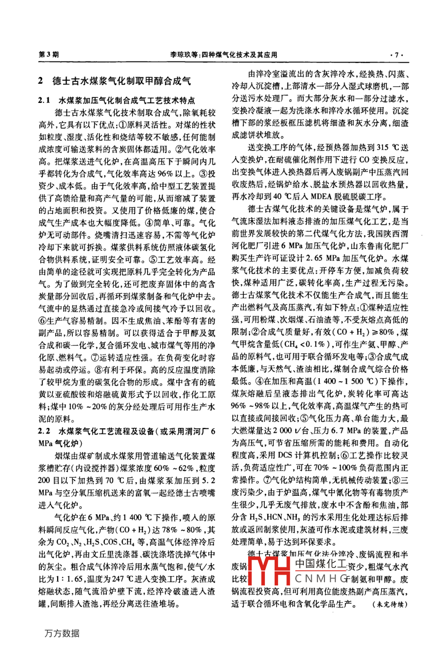 河南化工HENAN CHEMICAL INDUSTRY2008年第25卷四種煤氣化技術(shù)及其應(yīng)用李瓊玖,鐘貽烈,廖宗富,漆長(zhǎng)席,周述志,趙月興(成都益盛環(huán)境工程科技公司,四川成都610012)摘要:介紹了4種煤氣化工藝技術(shù),包括殼牌工藝、德士古水煤漿氣化工藝、思德工藝、灰熔聚流化床氣化工藝,對(duì)其技術(shù)特點(diǎn)、工藝流程、主要設(shè)備及應(yīng)用實(shí)例進(jìn)行了詳細(xì)闡逑,并對(duì)4種工藝進(jìn)行了對(duì)比。關(guān)鍵詞:煤氣化;殼牌工藝;德士古;恩德工藝;灰熔聚工藝;煤氣爐中圖分類(lèi)號(hào):TQ546文獻(xiàn)標(biāo)識(shí)碼:A文章編號(hào):003-3467(2008)03-0004-04Four Coal Gasification Technologies and Their ApplicationLI Qiong-jiu, ZHONG Yi-lie, LIAO Zong-fuQI Chang-xi, ZHOU Shu-zhi, ZHAO Yue -xingChengdu Yisheng Environment Engineering Techology Co Ltd, Chengdu 610012, China)Abstract: Four coal gasification technologies, including Shell technology, Texaco coal-water slurry gasifi-cation, Enticknap process, ash agglomeration fluidized bed gasification technology are introduced, and thetechnical features, technological process, main equipment and application example of the four technologiesare described in detailKey words: coal gasification Shell technology i Texaco; Enticknap process i ash agglomeration technology gas stove1殼牌粉煤氣化制取甲醇合成氣比其它氣化工藝更寬。對(duì)于高灰分、高水分、含硫量高的煤種同樣適應(yīng)②氣化溫度約1400~1700℃1.1殼牌工藝技術(shù)的特點(diǎn)碳轉(zhuǎn)化率高達(dá)99%以上,產(chǎn)品氣體相對(duì)潔凈,不含殼牌煤氣化過(guò)程(SCGP工藝)是在高溫加壓下重?zé)N甲烷含量極低,煤氣中有效氣體(CO+H2)高進(jìn)行的是目前世界上最為先進(jìn)的第FG代煤氣化達(dá)90%以上。③氧耗低,與水煤漿氣化相比氧氣工藝之一。按進(jìn)料方式殼牌煤氣化屬氣流床氣化,消耗低,因而與之配套的空分裝置投資可減少。④煤粉氧氣及蒸汽在加壓條件下并流進(jìn)入氣化爐內(nèi),單爐生產(chǎn)能力大,目前已投入運(yùn)轉(zhuǎn)的單爐氣化壓力在極為短暫的時(shí)間內(nèi)完成升溫、揮發(fā)分脫除、裂解、為3MPa,日處理煤量已達(dá)200⑤氣化爐采用燃燒及轉(zhuǎn)化等一系列物理和化學(xué)過(guò)程。一般認(rèn)為,水冷壁結(jié)構(gòu)無(wú)耐火磚襯里維護(hù)量少氣化爐內(nèi)無(wú)由于氣化爐內(nèi)溫度很高,在有氧存在的條件下,碳、轉(zhuǎn)動(dòng)部件,運(yùn)轉(zhuǎn)周期長(zhǎng),無(wú)需備爐。⑥熱效率高煤揮發(fā)分及部分反應(yīng)產(chǎn)物(H2、Co等)以發(fā)生燃燒反中約83%的熱能轉(zhuǎn)化在合成氣中約15%的熱能被應(yīng)為主;在氧氣消耗殆盡之后發(fā)生碳的各種轉(zhuǎn)化反回收為高壓或中壓蒸汽,總的熱效率為98%左右。應(yīng)過(guò)程進(jìn)入到氣化反應(yīng)階段,最終形成以CO、H2⑦氣化爐高溫排出的熔渣經(jīng)激冷后成玻璃狀顆粒,為主要成分的煤氣離開(kāi)氣化爐。性質(zhì)穩(wěn)定,對(duì)環(huán)境幾乎沒(méi)有影響。氣化污水中含氰殼牌粉煤氣化的技術(shù)特點(diǎn):①干煤粉進(jìn)料,加壓化合物少,容易處理,必要時(shí)可做到零排放對(duì)環(huán)境氮?dú)廨斔?連續(xù)性好,氣化操作穩(wěn)定。氣化溫度高,保護(hù)十分有利。⑧殼牌公司專(zhuān)利氣化燒嘴可根據(jù)需煤種適應(yīng)性廣,從無(wú)煙煤、煙煤、褐煤到石油焦均可要選擇氣化壓力2.5-4.OMPa,設(shè)計(jì)保證壽命為氣化對(duì)煤的活性幾乎沒(méi)有要求對(duì)煤的灰熔點(diǎn)范圍8000h,荷蘭 Demkolec電廠(chǎng)使用的燒嘴在近4年中國(guó)煤化工收稿日期:2007-10-13CNMHG作者簡(jiǎn)介:李瓊玖(1930-),男,教授級(jí)高級(jí)工程師研究員長(zhǎng)期從事化工設(shè)計(jì),建設(shè)生嚴(yán)工程技術(shù)工作,主編(合成氨與碳一化學(xué))《醇醚燃料與化工產(chǎn)品鏈工程技術(shù)》專(zhuān)著發(fā)表論文百余篇電話(huà):(028)86782889。第3期李瓊玖等:四種煤氣化技術(shù)及其應(yīng)用的運(yùn)行中尚未更換過(guò),累計(jì)運(yùn)行時(shí)間超過(guò)7500h,中生成氣態(tài)的硫化物、鹵素、分子態(tài)氮痕量氰化氫。這是氣化裝置長(zhǎng)周期運(yùn)行的又一重要保證。⑨氣化氰化氫及硫氧化碳(COS)被催化轉(zhuǎn)化為氨及硫化操作采用先進(jìn)的控制系統(tǒng),其中包括殼牌公司專(zhuān)有氫,鹵素和氨經(jīng)水洗塔洗滌除去。水洗后的合成氣的工藝計(jì)算機(jī)技術(shù),設(shè)有必要的安全聯(lián)鎖及控制系送入后續(xù)工序。統(tǒng),使氣化操作于最佳狀態(tài)下進(jìn)行。在氣化爐內(nèi)氣化產(chǎn)生的高溫熔渣,自流入氣化1.2工藝流程爐下部的渣池進(jìn)行激冷,高溫熔渣經(jīng)激冷后形成數(shù)目前,殼牌煤氣化裝置從示范裝置到大型工業(yè)毫米大小的玻璃體,可作建筑材料或用于路基化裝置均采用廢鍋流程,簡(jiǎn)略流程圖見(jiàn)圖1。1.3主要設(shè)備循環(huán)氣去激冷循環(huán)壓縮機(jī)殼牌煤氣化裝置的核心設(shè)備是氣化爐和合成氣冷卻器殼牌煤氣化爐主要由內(nèi)筒和外筒兩部分構(gòu)成回既氣化爐內(nèi)筒上部為燃燒室,下部為激冷室,煤粉及氧高壓氮合成氣粗合二氧化璜氣在燃燒室反應(yīng),溫度為1600℃左右。為了避免高溫、熔渣腐蝕及開(kāi)停車(chē)產(chǎn)生應(yīng)力對(duì)耐火材料的破高壓氧氣壞而導(dǎo)致氣
