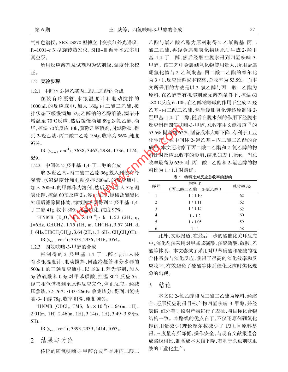 第44卷第6期化工技術(shù)與開(kāi)發(fā)Vol.44 No.62015年6月Technology & Development of Chemical IndustryJun.2015四氫呋喃-3-甲醇的合成王威',寧斌科',王儲(chǔ)備”,王列平',武宗凱,何琪文'(1.西安近代化學(xué)研究所,陜西西安710000; 2.新鄉(xiāng)學(xué)院能源與燃料研究所,河南新鄉(xiāng)453000)摘要:介紹了一個(gè)以2-氯乙醇和丙二酸二乙酯為原料制備四氫呋喃-3-甲醇的方法, 降低了硼氫化鉀的用量,以62%的收率制得了產(chǎn)品,有利于工業(yè)化生產(chǎn)。關(guān)鍵詞:四氫呋喃-3-甲醇; 2-氣乙醇;硼氫化鉀;工藝改進(jìn)中圖分類號(hào): TQ 251.1文獻(xiàn)標(biāo)識(shí)碼: A文章編號(hào): 1670-9905(2015)06-0036-03四氫呋喃-3-甲醇是殺蟲(chóng)劑呋蟲(chóng)胺的重要中間綜合比較以上6種合成路線,可知方法1在用體,而呋蟲(chóng)胺作為新型煙堿類殺蟲(chóng)劑的代表,其殺蟲(chóng)金屬硼氫化物還原時(shí), 1mol的中間體乙烷-1,1,2-三譜廣,具有卓越的內(nèi)吸滲透作用,并在很低的劑量下羧酸乙酯需要還原3mol的酯基,因此金屬硼氫化物即具有很高的殺蟲(chóng)活性,且對(duì)哺乳動(dòng)物、鳥(niǎo)類及水生的耗量相對(duì)較大,且副產(chǎn)物偏硼酸鹽產(chǎn)出較多,生產(chǎn)生物安全,對(duì)作物亦無(wú)藥害,可用于水稻、果樹(shù)、蔬菜成本較高;方法2和方法3的主要原料國(guó)內(nèi)生產(chǎn)無(wú)法等眾多作物的蟲(chóng)害防治,被譽(yù)為繼吡蟲(chóng)啉噻蟲(chóng)嗪之滿足;方法4原料價(jià)格較貴,不適合工業(yè)化生產(chǎn),且生后的第三代煙堿類殺蟲(chóng)劑13。鑒于其良好的市場(chǎng)與產(chǎn)操作具有很大危險(xiǎn)性;方法5的合成方法雖然有所應(yīng)用前景,開(kāi)展呋蟲(chóng)胺及其中間體的合成工藝研究對(duì)改進(jìn),總收率也有很大提高,但其所用原料環(huán)氧乙烷我國(guó)農(nóng)業(yè)發(fā)展具有十分重要的意義。文獻(xiàn)調(diào)研表明,是一種有毒的致癌物質(zhì),且易燃易爆,不易長(zhǎng)途運(yùn)輸;有關(guān)四氫呋喃-3-甲醇的合成主要有如下6種方法:方法6雖然收率高,三廢少,但生產(chǎn)設(shè)備要求高,且反方法1: 以丙二酸二乙酯和氯乙酸乙酯為原料,應(yīng)中需要用到金屬銠作催化劑,不利于工業(yè)化生產(chǎn)。在醇鈉的作用下經(jīng)縮合反應(yīng)制得1,1,2-乙烷三羧酸為了解決上述制約四氫呋喃-3-甲醇生產(chǎn)的諸三乙酯,再經(jīng)硼氫化鉀還原得到2-羥甲基-1,4-丁二多問(wèn)題,本文設(shè)計(jì)了一條新的合成路線,以丙二酸二醇,然后在脫水劑對(duì)甲苯磺酸作用下,經(jīng)環(huán)合反應(yīng)得乙酯和2-氯乙醇為原料,在醇鈉作用下得到2-羥乙到目標(biāo)產(chǎn)物。基丙二酸二乙酯,然后經(jīng)硼氫化鉀還原制得目標(biāo)化方法2:由異丙醇和3-甲醛四氫呋喃經(jīng)轉(zhuǎn)移催合物。具體合成路線如圖1所示。)H化氫化反應(yīng)得到目標(biāo)產(chǎn)物4。方法3:2,2-二甲基-5-溴乙基-1,3-二氧六環(huán)或5-EI+ ClVoHNaOCH溴乙基-1,3-二氧六環(huán)在酸性條件下經(jīng)水解、環(huán)合制得目標(biāo)產(chǎn)物I5]。方法4:2,3-二氫呋喃與原甲酸三甲酯由三氟KBH4化硼乙醚催化,再經(jīng)鈀碳加氫制得目標(biāo)產(chǎn)物間。HO、方法5:以丙二酸二乙酯為原料,在醇鈉作用下圖1四氫呋喃-3-甲醇的合 成路線與環(huán)氧乙烷縮合反應(yīng)得到2-羥乙基丙二酸二乙酯,然后經(jīng)硼氫化鉀還原制得目標(biāo)化合物”。1實(shí)驗(yàn)部分方法6:環(huán)已酮與1,4- 二羥基-2-丁烯反應(yīng)得到1.1 儀器與試劑7,12-二氧螺環(huán)[5,6]-9-十二烯,然后再經(jīng)三苯基磷氯Bruker-AV500型核磁共振儀,島津GC-2014C化銠催化加氫甲?;磻?yīng)制得目標(biāo)化合物8。作者簡(jiǎn)介:王威( 1982-),男,漢族,河南永城人,博士,助理研究員,從事功能有機(jī)小分子的合成及應(yīng)用研究收稿日期: 2015-03-18第6期王威等:四氫呋喃-3-甲醇的合成3"氣相色譜儀, NEXUS870型傅立葉變換紅外光譜議,乙酯與氯乙酸乙酯為原料制得2-乙氧酰基-丙二R-1001-r N型旋轉(zhuǎn)蒸發(fā)儀,SHB- II循環(huán)水式多用酸二乙酯,再經(jīng)金屬硼氫化物還原后生成2-羥甲真空泵?;?1,4-丁二醇,然后經(jīng)酸性脫水得到四氫呋喃-3-所用反應(yīng)溶劑及試劑均為試劑級(jí),溫度計(jì)未校甲醇。該工藝中金屬硼氫化物使用量大,所用金屬正硼氫化物與2-乙氧?;?丙二酸二乙酯的摩爾比1.2實(shí)驗(yàn)步驟為3: 1,反應(yīng)原料成本較高,總收率為53.5%。而本1.2.1中間體2-羥乙基丙二酸二乙酯的合成文所采用的方法是以2-氯乙醇與丙二酸二乙酯為在裝有冷凝管、水銀溫度計(jì)和電動(dòng)攪拌的原料,在乙醇等有機(jī)溶劑或無(wú)溶劑條件下,控溫601000mL 的反應(yīng)瓶中,加入160g丙二酸二乙酯,攪~80C反應(yīng)6~ 10h,在乙醇鈉等堿的作用下生成2-羥拌狀態(tài)下緩慢滴加52g乙醇鈉的乙醇溶液,滴畢并乙基-丙二酸二乙酯,然后經(jīng)硼氫化鉀還原制得2-增溫至70C反應(yīng),然后緩慢滴加89g2-氯乙醇,滴.羥甲基-1,4-丁二醇,隨后在脫水劑的作用下經(jīng)脫水畢,控溫70C反應(yīng)10h, 蒸除乙醇溶劑,過(guò)濾除鹽,得反應(yīng)制得四氫呋喃-3-甲醇,總收率由文獻(xiàn)報(bào)道19)的到2-羥乙基-丙二酸二乙酯194g,收率為96% ,純度53.5%提高到62% ,制備成本大幅下降,有利于工業(yè)化生產(chǎn)。在中間體2-羥乙基-丙二酸二乙酯的合97%。IR 