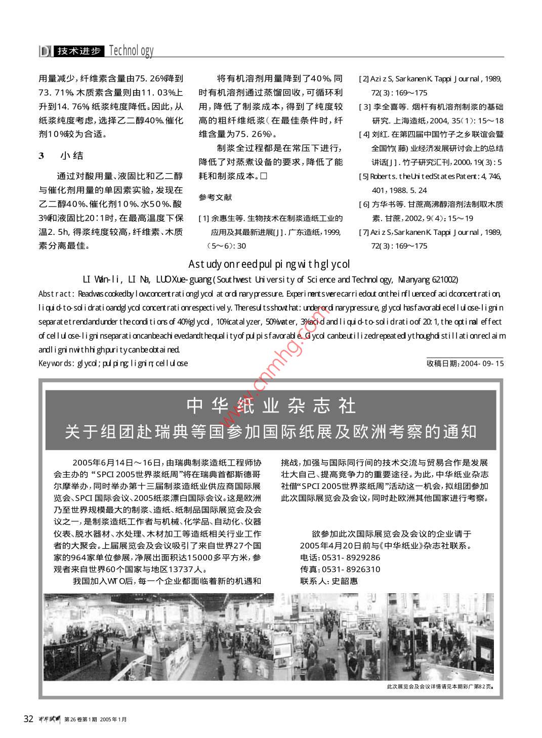 D技術(shù)進(jìn)步 Technol ogr●工藝技術(shù)●催化劑:本實驗小組自制。1.2實驗部分材料預(yù)處理最大限度利用非木材纖維原料將蘆葦處理為片狀。采用無污染或少污染的制漿方法,在1.2.2分析測試方法我國有著特殊的意義1。蘆葦作為我水分:重量法(GB/T2677.2國重要的造紙原料之一,在我國北方81);α-纖維素:硝酸一乙醇法(GB/分布廣泛,是一種自然生長的高產(chǎn)植T2677.10-81);聚戊糖:二溴化法物因此,對蘆葦造紙的研究顯得十(GB/T2677.9-94);灰分:灼燒一重分重要量法(GB/T2677.3-81);木質(zhì)素:人們對有機(jī)溶劑法制漿給予了乙酰溴法[4。越來越多的重視,國外研究報道較1.2.3實驗方法及工藝流程(如圖1)多,目前在德國和加拿大已成功建成蘆葦經(jīng)過預(yù)處理成為片狀,稱取了幾個有機(jī)溶劑制漿的中間試驗廠定量片狀蘆葦原料裝入圓底燒瓶2a有機(jī)溶劑法制漿可以大大減少制中,向燒瓶中準(zhǔn)確加入一定量已知比漿污染,降低廢水的化學(xué)耗氧量李萬利,西南科技大學(xué)材料學(xué)院在例的有機(jī)溶劑、催化劑及水作為蒸煮(COD),而且有機(jī)溶劑可以回收利讀碩土研究生,專業(yè)方向為生物材料及特性研究。劑,再加入適量的酸(是指HNO3,下用;有機(jī)溶同);緩慢加劑制漿可以熱至沸騰蘆葦乙二醇制漿的研究*梁5%10%得率的紙漿,■李萬利李娜羅學(xué)剛(西南科技大學(xué)四川綿陽621002)結(jié)束后,將燒瓶中的溶且具有較好劑取出,經(jīng)的物理性能到提要:在常壓下,利用低濃度過過濾,分離出粗纖維和紙漿廢液,擠但目前在有機(jī)溶劑制漿研究中,的乙二醇溶液蒸煮蘆壓出粗纖維間夾帶的制漿廢液,一并大部分是高壓、高濃度的條件下進(jìn)行葦,分別做了酸用量加入蒸餾燒瓶中蒸餾回收有機(jī)溶劑,的,有機(jī)溶劑用量高,反應(yīng)體系壓力液固比和有機(jī)溶劑濃經(jīng)過蒸餾可以得到高純度的木質(zhì)素高,致使成本居高不下,這也是造成度實驗。研究結(jié)果表而粗纖維經(jīng)過洗滌烘干、稱重,測量有機(jī)溶劑制漿長期以來沒有規(guī)?;?乙二醇在常壓下表有關(guān)的物理、化學(xué)指標(biāo)產(chǎn)業(yè)化的關(guān)鍵障礙。本文介紹常壓下現(xiàn)出良好的纖維素、木用低濃有機(jī)溶劑進(jìn)行蘆葦制漿的試質(zhì)素分離趨勢,在乙二有機(jī)溶劑一有機(jī)溶劑驗醇40%催化劑10%水預(yù)處理→抽提→壓濾→濾液濃縮→分離1材料與方法50%、酸3%和液固比纖維高純度木質(zhì)素20:1時,纖維素、木質(zhì)1.1實驗原料及主要藥品素分離效果最佳,漿的圖1制漿工藝流程簡圖原料:蘆葦,采自天津地區(qū);其化質(zhì)量較好;乙二醇通過2實驗及結(jié)果討論學(xué)組分為水分6.70%灰分4.40%木蒸餾回收可以循環(huán)利質(zhì)素21.17%聚戊糖22.34%纖維素用,并可得到較純的木分別對酸用量、液固比和乙二醇48.08%質(zhì)素。與催化劑比例進(jìn)行了單因素實驗。主要藥品:乙二醇,分析純,成都關(guān)鍵詞:乙二醇;制漿;木質(zhì)素2.1液固比單因素實驗科龍化工試劑廠;硝酸(HNO3)化學(xué)纖維素液固比在制漿過程中是一個非純,四川新皂股份有限公司試劑廠常重要的參數(shù),在有機(jī)溶劑制漿當(dāng)棰基金項目國家高新技術(shù)研究發(fā)展計劃86計劃資助項目20043205030宋舉叫第26卷第1期200年1月Technol ogy技木進(jìn)步1中,有機(jī)溶劑起到了萃取劑的作用,于植物體中的纖維素、木質(zhì)素的分機(jī)溶劑濃度著手,通過不斷的增加有把木質(zhì)素從植物體當(dāng)中提取出來,達(dá)離。同時酸的加入也加快了木質(zhì)素變機(jī)溶劑濃度來達(dá)到有效分離纖維素、到木質(zhì)素與纖維素分離的目的。成碎片并溶解,加速了副反應(yīng)的發(fā)木質(zhì)素的目的。致使有機(jī)溶劑制漿成表1液固比單因素實驗生,如木質(zhì)素的凝聚及半纖維素、纖本居高不下,僅在國外有幾個中間試乙二醇催化劑水液固比酸用量維素的降解因此在制漿過程中應(yīng)該驗廠在運轉(zhuǎn)筆者認(rèn)為,降低有機(jī)溶%m/恰當(dāng)用酸寫~7。劑用量,尋找合適的催化劑,降低制漿成本是現(xiàn)在有機(jī)溶劑制漿的首要25255010:12.5表2酸用量單因素實驗255020:12.5乙三醇催化劑水液固比酸用量題255030:12.5%%m/g%表3乙二醇、催化劑比例單因素實驗20:12.0乙二醇催化劑水酸液固比g13.336.750320:125255020:13.52050320:17226,723.350320:133.316.750320:143.36.750320:120液因比m8圖2液固比對纖維素含量的影響木質(zhì)案求咖求■圖4酸用量對纖維素含量的影響13.3404乙二酵用■圖6乙二醇、催化劑對纖維素含量的影響液固比圖3液固比對聚戊糖、木質(zhì)素含量的影響由表1、圖2和圖3可以看出,隨著液固比從6:1增加到30:1,紙漿中纖求■航實維素呈上升的變化趨勢,而木質(zhì)素和聚戊糖都呈下降的變化趨勢。在液固圖5酸用量對聚戊糖、木質(zhì)素含量的影響木所素比為6:1和10:1時,由于蘆葦密度較由表2、圖4和圖5看出隨著酸用蒸煮劑密度小,浮在液面上,很難對量的增加,紙漿中的纖維素呈低一高蘆葦進(jìn)行徹底的蒸煮,纖維素與木質(zhì)一低變化趨勢,木質(zhì)素呈下降趨勢7乙二醇、催化劑對聚戊糖、木質(zhì)素含素不能有效分離;液固比20:1時,蘆聚戊糖呈高一低一高的變化趨勢??闪康挠绊懭斂梢员徽糁笸耆?得漿質(zhì)量好,纖以得出:酸的加入有利于纖維素、木由表3、圖6和圖7可以看出,不同維素