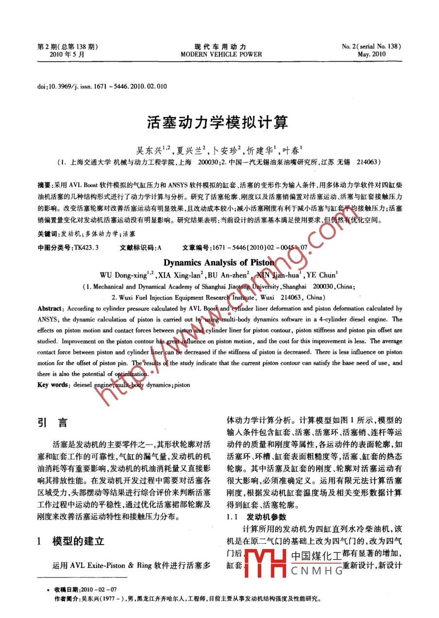 第2期(總第138期)現(xiàn)代車用動力No. 2( serial No. 138)2010年5月MODERN VEHICLE POWERMay.2010doi:10.3969/jisn.l671-5446.2010.02.010活塞動力學模擬計算吳東興2,夏興蘭2,卜安珍2,忻建華,葉春(1.上海交通大學機械與動力工程學院,上海200030;2.中國一汽無錫油泵油嘴研究所,江蘇無錫214063)摘要:采用 AVL Boost軟件模擬的氣缸壓力和 ANSYS軟件模擬的缸套、活塞的變形作為輸人條件,用多體動力學軟件對四缸柴油機活塞的幾種結構形式進行了動力學計算與分析。研究了活塞輪廓剛度以及活塞銷偏置對活塞運動、活塞與缸套接觸壓力的影響。改變活塞輪廓對改善活塞運動有明顯效果,且改動成本較小;減小活塞剛度有利于減小活塞與缸套平均接觸壓力;活塞銷偏置量變化對發(fā)動機活塞運動沒有明顯影響。研究結果表明:當前設計的活塞基本滿足使用要求但仍然有優(yōu)化空間。關鍵詞:發(fā)動機;多體動力學;活塞中圖分類號:TK423文獻標識碼:A文章編號:1671-5446(2010)02-0045-07Dynamics Analysis of PistonWU Dong-xing", XIA Xing-lan, BU An-zhen, XIN Jian-hua,YE Chun(1. Mechanical and Dynamical Academy of Shanghai Jiaotong University200030 China2. Wuxi Fuel Injection Equipment Research Institute, Wuxi 214063, ChinaAbstract: According to cylinder pressure calculated by AVL Boost and cylinder liner deformation and piston deformation calculated byANSYS; the dynamic calculation of piston is carried out by using multi-body dynamics software in a 4-cylinder diesel engine. Theeffects on piston motion and contact forces between piston and cylinder liner for piston contour, piston stiffness and piston pin offset arestudied. Improvement on the piston contour has great influence on piston motion, and the cost for this improvement is less. The averagecontact force between piston and cylinder liner can be decreased if the stiffness of piston is decreased. There is less influence on pistonmotion for the offset of piston pin. The results of the study indicate that the current piston contour can satisfy the base need of use, andthere is also the potential of optimizationKey words: diesel engine; mulit-body dynamics; piston引言體動力學計算分析。計算模型如圖1所示,模型的輸入條件包含缸套、活塞、活塞環(huán)、活塞銷、連桿等運活塞是發(fā)動機的主要零件之一,其形狀輪廓對活動件的質量和剛度等屬性,各運動件的表面輪廓,如塞和缸套工作的可靠性,氣缸的漏氣量,發(fā)動機的機活塞環(huán)、環(huán)槽缸套表面粗糙度等活塞、缸套的熱態(tài)油消耗等有重要影響,發(fā)動機的機油消耗量又直接影輪廓。其中活塞及缸套的剛度、輪廓對活塞運動有響其排放性能。在發(fā)動機開發(fā)過程中需要對活塞各很大影響,必須準確定義。運用有限元法計算活塞區(qū)域受力,頭部擺動等結果進行綜合評價來判斷活塞剛度,根據發(fā)動機缸套溫度場及相關變形數(shù)據計算工作過程中運動的平穩(wěn)性,通過優(yōu)化活塞裙部輪廓及得到缸套、活塞輪廓。剛度來改善活塞運動特性和接觸壓力分布。1.1發(fā)動機參數(shù)計算所用的發(fā)動機為四缸直列水冷柴油機,該1模型的建立機是在原二氣門的基礎上改為四氣門的,改為四氣門后中國煤化工都有顯著的增加運用 AVL Exite-Piston&Ring軟件進行活塞多缸套CNMHG重新設計,新設計收稿日期:2010-02-07作者簡介:吳東興(1977-),男,黑龍江齊齊哈爾人,工程師,目前主要從事發(fā)動機結構強度及性能研究現(xiàn)代車用動力2010年第2期的四氣門發(fā)動機主要參數(shù)如表1所示。所元000/rmin800 rimin80270360450540630曲軸轉角(。)圖2缸內壓力1.3部件輪廓圖1模型圖1.3.1活塞環(huán)本文研究的發(fā)動機活塞環(huán)組由2道氣環(huán)和1道1.2缸內壓力油環(huán)組成第1環(huán)為楔形桶面環(huán)第2環(huán)為內切錐面計算中所用的缸內壓力曲線由Boo件模擬扭曲環(huán),油環(huán)為導向倒角螺旋撐簧油環(huán)(見表2)。計算得到,扭矩點與標定工況點的壓力曲線如圖2表1490柴油機主要參數(shù)形式缸徑/mm行程/mm標定功率/kW標定轉速/rm最大扭矩/Nm最大扭矩轉速/rmin-1四缸、直列、水冷753000表2活塞環(huán)參數(shù)的計算結果調整而來?;钊麩嶙冃尾捎没钊麥囟葓龌钊h(huán)切向彈力開口間隙刮油刃厚數(shù)據(如圖6所示)計算獲得,計算中不考慮活塞周截面形狀/mm/mm向的溫度變化。圖5、圖7中所示的輪廓均為活塞推力面中心母線上各高度處的半徑相對于公稱半徑15.2-22.80.25-0.45的變化量。2環(huán)11.4-19.00.45-0.65油環(huán)38.0-57.00.31.3.2缸套工作狀態(tài)下缸套的實際輪廓形狀對計算結果有模型b溫度/tc變形/um很大的影響2,根據缸套模型(如圖3a所示),利圖3缸套熱變形計算圖用缸套的溫度場數(shù)據(圖3b)和有限元分析相結合的方法得到缸套工作狀態(tài)下的熱變形如圖3c所示,用軸對稱模型計算得到發(fā)動機缸套實際輪廓線如圖所示1.3.3活塞活塞輪廓定義為從主推力側到次推力側180°的形狀范圍,包含冷態(tài)輪廓(如圖5所示)和熱變形量。分析中共采用了5種冷態(tài)輪廓,依次編號為1,2,3,4,5,分別對應圖5中的曲線1,2,3,4,5。其中中國煤化工1為原型機活塞使用的輪廓,2與5為活塞供應商先CNMHG后提供的改型機的輪廓,3與4是根據前2種輪廓2010年第2期吳東興,等:活塞動力學模擬計算0.30-0.20-0.100.0500150200250300半徑變化量/mr半徑變化量/mm圖5活塞冷態(tài)輪廓圖6活塞溫度場圖7活塞疊加輪廓1.4活塞剛度2計算工況活塞剛度通過有限元模型計算獲得,計算模型如