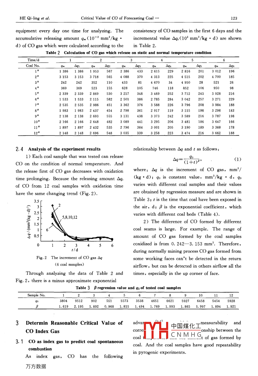 Dec.2003Journal of China University of Mining TechnologyVol. 13 No.Critical Value of co of ForecastingCoal Spontaneous CombustionHEQi-ling(何啟林)2, DAI Guang- -long(戴廣龍), WANG De-ming(王德明)1(1. College of Mineral and Energy Resource, CUMT, Xuzhou, Jiangsu 221008, China;2. Department of Resources Exploration and Management Enginering, Anhui University ofScience and Technology, Huainan, Anhui 232001, China)Abstract CO has been used widely in the production process of colliery as an index gas to predict spontaneouscombustion of coal. But in some collieries there are co gas in the upper corner of the face all the times, sometimeco gas even exceeds the regulated critical index. This phenomenon is much more obvious in the fully-mechanizedlongwall face and fully-mechanized longwall and top- coal caving face. Although many measures of fire-proof andfire-extinguishing have been adopted, the flowing amount of co gas can be only decreasd, but can not beeliminated completely. Using the different kinds of coal, the experiment of coal oxidation was made at the lowtemperature. The experiment indicates that some kinds of coal can produce CO under the condition of normaletime the Co consistency is very high, and the intension of Co can be decreased withoxidation time prolonging. Selecting rational critical value of Co is the ke to predicting spontaneous combustion ofcoal correctly and reliably. The problem of selecting retional critical value of CO was studied. Finally, the amountof co gas released by different kinds of coal was obtained under normal temperature condition.Key words: coal spontaneous combustion; index gas: critical valueCLC number: TD75 Document code: a Article ID: 1006-1266(2003)02-0121-05of graham, the ratio of alkene to alkane1 Introductionhydrocarbon, ratio of chain to alkane and ratio ofSpontaneous combustion of coal is one of the single alkane hydrocarbon to all alkane hydrocarbonprimary disasters in coal mine safety-production, amount are usually used as index. In China manyestimating the temperature of coal or the extent of collieries adopt the single index-co to predict thespontaneous combustion is an important measure to spontaneous combustion of coal. In Some collieries itpredict spontaneous combustion and ignition of coal has been discovered that CO exists in the up cornersaccording to analyzing the results of index gas at of face all the times. This phenomenon is muchearly stage. Many kinds of predicting index of coal more obvious in fully-mechanized longwall face orspontaneous combustion, which are divided into the fullylongwall and top-coal caving face.sIngle index and moreindex, have been proposed. Although many measures of fire-proof and fireIn these indexes, for the single one the extinguishing have been adopted, the flowingconcentration or absolute formed amount of certain amount of Co gas can be only decreased, but cankind of gas (such as CO, the high-sulfur-coal can not be eliminated completely. This phenomenonlso use SO2) is used as index, or the formed confuses many engineers on the spot, so in thisamount of a kind of gas is used as index (for paper the authors made attempt to give explanationsexample C2H,). For the more indexes the coefficient中國(guó)煤化工CNMHGRecelved date: 2003-05-30Foundation item: Science of fire Natural Science Foundation of China (2001CB40960102)Biography: HE Qi-lin(1963-), male, from Wuwei county of Anhui Province, associate prof., doctorial student of safety science andhnology specialty, engaged in the research on colliery safety.122Journal of China University of Mining TechnologyVol. 13 No. 22 Oxidation Experiment of Coal UnderCondition of Static and NormalTemperature2. 1 Device of oxidation experimentIn order to compare the static breathing abilitycoal in oxygen with the amount of all kinds of gasreleasing, in the ventilation and safety laboratory ofAnhui University of Science and Technology theexperiment device of breathing under normaltemperature was made Fig. 1). It consists ofvitreous absorbing vessel, vitreous valves topper,Fig. 1 A set of static breathing experimentpiston triplet: 2. vitreous absorbing vesselpiston triplet, advection tube, down mouth bottle3. coal sample; 4. vitreous cotton interlaydirect valve, connection tube etc.5. glass stick: 6. advection tul2. 2 Gas analysis equipment7. connection tube: 8. water bottleFor gas analysis gas chromatography apparatusExperiments requested a original coal sampleSP-2308 and hydrogen flames detector were used. that have never been exposed in the air. ThereforeIn the process of analyzing hydrocarbon gas, such samples were taken from the depths of 2 m in theas CH,, C2H4, C2H6, C3Ha, the steel cylinder (Lcoal1 bed of the new miining face. The picke5 m, =31 mm) filled with GDX-502 was used samples were filled in the sample-taking machinewith high pure hydrogen(99. 999%); in the process and pressed solidly then the machine was coveredof analyzing gas such as CO, CO2 and CH4, up completely. On the ground the cover should bestainless steel cylinder (L=0. 7 m, p= 3 mm) sealed completely using vinegar, and winded up,filled with TDX-01 was used with the converting finally the samples were sent to analyze infurnace (L=0. 2 m) using nickel as catalyst. The laboratory. The coal samples were crushedarrying gas was high pure N2(99. 999%), and the laboratory and then sieved, the samples about ofburning gas was high pure H2(99. 999%), the 1 mm in diameter were selected for experiment.combustion-supporting gas was the compressed air.2) ExperimentGas samples flowed into detector through convertingThe coal samples were taken from 12furnace after separated in chromatogram column. coal in 6 collieries. They belong to the EnergyTwo kinds of gas were analyzed respectively. The Incorporated Company of Shanghai and Mineralinstrumentation accuracy: carbon hydrogen Group of Huainan and Mineral Group of Huainancompound was0.01×10°; CO kind was0.1×106Xingji. The geological condition and p