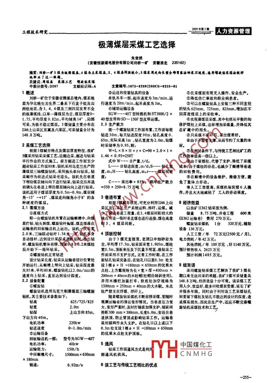 20090年第5期工程技術(shù)研究.renleiywanguant人力資源管理極薄煤層采煤工藝選擇朱斐然(安徽恒源煤電股份有限公司劉橋一礦安淮北235162)摘要:劃橋一礦3煤為極薅煤層,4煤為主茱煤層,3,4謀層間距艘小,3煤耒用走向長(zhǎng)璧全郝冒落汝甸耒不現(xiàn)實(shí),選用螺旋鉆茉煤法幢好關(guān)鍵詞:萍煤層茉煤工藝 螺旋鉆茉煤中圖分類(lèi)號(hào):D267文獻(xiàn)標(biāo)識(shí)碼:A文章編號(hào):1673-8209(2009)5-0255-011概述③運(yùn)送和安裝鉆具的設(shè)備①在采煤面實(shí)現(xiàn)無(wú)人操作,安全生產(chǎn)。劉橋一礦位于安徽省濉溪縣境內(nèi),煤系地單軌吊車(chē)一部,起吊速度為3m/min,運(yùn)②降低傷亡事故和職業(yè)病患者。層為華北晚生古生界二疊系下石盒子組及山行速度 為20m/min,起吊高度為3m.③可以在螺旋鉆具上安裝三種不同直徑西組地層,含3.4. 6煤及三到四層發(fā)育不全④輔助運(yùn)輸設(shè)備的鉆頭625mm、725mm. 825mm,增加在不的極薄堞線,以單薄煤層為主,煤層厚度0-SGW---40T型轉(zhuǎn)載機(jī)和STJ800/2x同厚度煤層 上的采收率。1.75,平均厚度0.82m,平均傾角14" ,局部40 型皮帶和SD- 150F 型皮帶運(yùn)煤。④實(shí)現(xiàn)薄煤層采煤,其中包括從平衡的和可采,為極不穩(wěn)定煤層。3煤儲(chǔ)量主要分布在2.3 生產(chǎn)能力保護(hù)煤柱上采煤,這樣增加采煤量,并降低其II46.上山采區(qū)東翼及六采區(qū),可采儲(chǔ)量合計(jì)為按一個(gè)螺旋鉆采工作面布置,工作面每班在礦藏中的損失。148.8萬(wàn)噸.鉆進(jìn)30m,每天鉆進(jìn)深度90m,鉆孔高度0.⑤只采煤不采矸石,采出煤質(zhì)好.65m,實(shí)際采高lm ,鉆孔寬度為2.0m,鉆煤⑥由于不需要支撐,從而節(jié)約了大的木2采煤工藝選擇時(shí)采儲(chǔ)率為0.95,則:材根據(jù)3煤賦存特點(diǎn)及煤層厚度特征,我礦W=LxSxHxrxC= -90x2.0x1x⑦在相同條件下,與傳統(tǒng)工藝相比礦工的3煤采用鉆采采煤工藝,邊掘邊采,掘進(jìn)與鉆采1 .46 x 0.95=2S0T工作效率提高- -倍以上.平行作業(yè)的方式施工。前方掘進(jìn)工作面至少式中W---產(chǎn)量,t/d,⑥由于留煤柱,代替了支護(hù),降低了采煤超前鉆呆工作面80米,鉆機(jī)采用鳥(niǎo)克蘭生產(chǎn)的L---日鉆進(jìn)深度,m/d,S---鉆孔寬成本, 由于煤柱的存在,也減少了順槽等巷道薄煤層三軸螺旋鉆機(jī),采用獨(dú)頭單向鉆采。鉆度,m,H-- -鉆孔高度,m,τ --煤層視密的回收費(fèi) 用。采順序?yàn)榍斑M(jìn)式鉆采至迎頭。該機(jī)先在巷道度,⑨在順槽中的設(shè)備維護(hù)、維修方便,避下幫沿煤層傾向向下進(jìn)行鉆采,鉆采完后再退C---采出事x 95%,則年生產(chǎn)能力免了重體 力勞動(dòng)?;卣{(diào)頭在巷道上幫沿煤層傾向向上進(jìn)行鉆采,= -350 x 250=8.75萬(wàn)噸@人工工效提商,采煤機(jī)每班需6人操該機(jī)適用于煤層厚度為0. Sm-0.9m,煤層傾作,并且大大地減輕了工人的勞動(dòng)強(qiáng)度。角-15" -+15* ,煤層走向傾角小于8”的各3 巷道布置種硬度的煤層.根據(jù)3煤賦存狀況,可充分利用1146上山8 經(jīng)濟(jì)效益2.1落煤方法采區(qū)及六采區(qū)生產(chǎn)系統(tǒng)運(yùn)料,排研,運(yùn)煤。減以我礦I362鉆采面為例:①落煤方式少了掘進(jìn)巷道工程量,在3.4煤層間距較大的儲(chǔ)量8.75萬(wàn)噸,井巷工程 600米即一臺(tái)螺旋鉆機(jī)布置在運(yùn)輸順槽中,向煤地點(diǎn)可設(shè)一 -臨時(shí)垂直煤倉(cāng)進(jìn)行連接,煤倉(cāng)高度(1362 運(yùn)輸巷)費(fèi)用270萬(wàn)元,層打鉆,鉆頭割煤,螺旋鉆桿掏煤,煤直接落在即3. 4煤層間距。螺旋鉆采煤機(jī)1臺(tái)520萬(wàn)元,輔助運(yùn)輸巷的刮板輸送機(jī)上運(yùn)出。該機(jī)一次采寬設(shè)備136 萬(wàn)元2.0米,三軸聯(lián)動(dòng)鉆桿1.54米一節(jié),鉆機(jī)本身4頂板控制人工工資/年72 萬(wàn)元(2500元/月),自動(dòng)接桿,達(dá)到設(shè)計(jì)采深或遇斷層時(shí).推出鉆由于3 煤無(wú)直接頂,老頂以中細(xì)砂巖為電 力消耗/年42萬(wàn)元,桿,螺旋鉆機(jī)整體前移,預(yù)留0.8 +0.2米煤柱主, 平均厚17.5m,鉆采面采寬1.905m,煤柱其他消耗/年100萬(wàn)元,計(jì) 1140萬(wàn)元,后開(kāi)始下一循環(huán)鉆采。寬0.5m,頂板來(lái)壓及下沉量不明顯,故鉆采工預(yù)計(jì)銷(xiāo)售收入 2625 萬(wàn)元②螺旋鉆機(jī)正常鉆進(jìn)作面采用不支護(hù)方式。正常工作時(shí)期,在工作預(yù)計(jì)利潤(rùn)1485萬(wàn)元.設(shè)計(jì)鉆采長(zhǎng)度:鉆采從運(yùn)輸巷設(shè)計(jì)位置處面鉆孔鉆采完備后,在鉆孔口以里0.3m 處支開(kāi)始運(yùn)行.從順槽上幫向上鉆采,鉆采深度最設(shè)3棵φx H =180mm x 650mm的優(yōu)質(zhì)木9 結(jié)束語(yǔ)大85米,平均80米,螺旋鉆機(jī)以2.0m/min的點(diǎn)柱, 上方戴規(guī)格為長(zhǎng)x寬x厚=400mm x采用螺旋鉆采煤工藝解決了我礦3煤長(zhǎng)速度向上鉆采,直至達(dá)到設(shè)計(jì)深度。200mm x 40mm的木柱帽(柱帽沿傾斜使用),期以來(lái)無(wú)法 回采的難題,我礦3煤可采儲(chǔ)量共2.2設(shè)備配置并用木柵欄加緊打牢,軟底處加穿規(guī)格為148.8 萬(wàn)噸,經(jīng)濟(jì)效益十分可觀。該采煤工藝①螺旋鉆1500m x 250mm x 40mm的大木鞋。木點(diǎn)用人少,效益好 ,能多回收煤炭資源,延長(zhǎng)了礦螺旋鉆機(jī)選用烏克蘭制薄煤層三軸螺旋柱嚴(yán)禁支在浮煤.浮矸上。井服務(wù)年限。同時(shí)由于利用該工藝采煤鉆