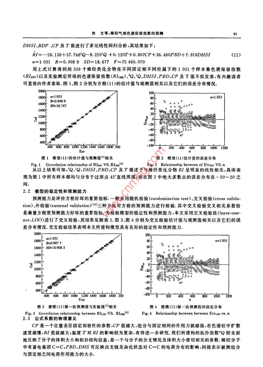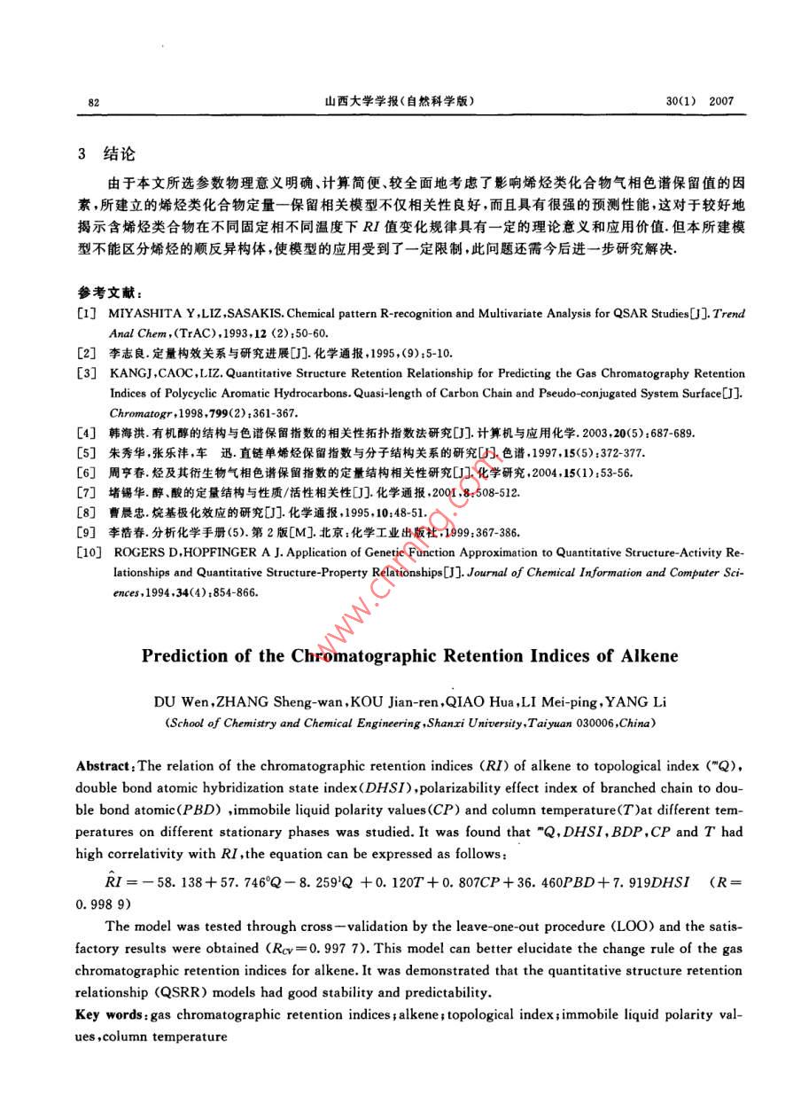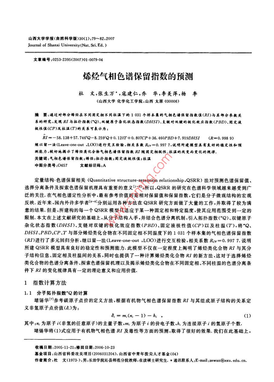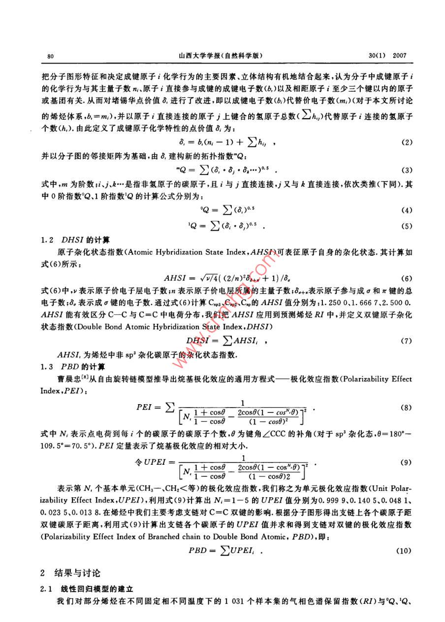 山西大學(xué)學(xué)報(自然科學(xué)版)30(1);79~ 82,2007Journal of Shanxi University(Nat. Sci. Ed. )文章編號:0253-2395(2007)01 -0079-04烯烴氣相色譜保留指數(shù)的預(yù)測杜.文,張生萬* ,寇建仁,喬華,李美萍,楊李(山西大學(xué)化學(xué)化工學(xué)院,山西太原030006)摘要:通過對部分烯烴在不同固定相不同柱溫下的 1 031個祥本集的氣相色譜保留指數(shù)值(RI)與其部分參敷關(guān)系的研究,發(fā)現(xiàn)RI與拓?fù)渲笖?shù)("Q)、雙鍵原子雜化狀態(tài)指數(shù)(DHSI)、支鏈對雙鍵的極化效應(yīng)指數(shù)(PBD).固定液極性值(CP)及柱溫(T)的關(guān)系可表示為:RI= - 58.138+57.746°Q-8. 259'Q+0.120T+ 0.807CP+ 36. 460PBD+7. 919DHSI(R=0.998 9)繼以留一法(Leave- one-out ,L00)進(jìn)行交互檢驗,相關(guān)系數(shù)Rev=0. 9977,說明所建模型具有良好的穩(wěn)定性和預(yù)測能力,較好地揭示了烯烴類化合物氣相色譜保留指數(shù)RI隨固定相極性、柱溫的改變而變化的規(guī)律.關(guān)鍵詞:氣相色譜保留指數(shù);烯烴;拓?fù)渲笖?shù);固定液極性值;柱溫中圍分類號:O657文獻(xiàn)標(biāo)識碼:A定量結(jié)構(gòu)-色譜保留相關(guān)(Quantitative structure- retention relationship ,QSRR)法對預(yù)測色譜保留值、選擇分離條件及探索色譜保留機(jī)理具有重要的意義[~],所以,QSRR的研究在色譜科學(xué)領(lǐng)域越來越受到廣泛的關(guān)注.在氣相色譜定性分析中,最有參考價值的是相對保留值和保留指數(shù),它們是分子微觀結(jié)構(gòu)的宏觀反映.近年來,國內(nèi)外許多學(xué)者[~0]分別運用各種方法在QSRR研究方面做了大量的工作,并取得了較為滿意的結(jié)果.但是,所建構(gòu)的每一個QSRR模型只適應(yīng)于某-種固定相和特定溫度,使其應(yīng)用范圍受到-定的限制.本文在上述文獻(xiàn)研究的基礎(chǔ)上,從分子結(jié)構(gòu)人手,并結(jié)合色譜分離機(jī)制,引入拓?fù)渲笖?shù)("Q)、雙鍵原子雜化狀態(tài)指數(shù)(DHSI)、支鏈對雙鍵的極化效應(yīng)指數(shù)(PBD)、固定液極性值(CP)以及柱溫(T),將”Q、DHSI、PBD、CP.T與部分烯烴類化合物在不同固定相不同溫度下的1031個樣本集的氣相色譜保留指數(shù)(RI)進(jìn)行了多元回歸分析,繼以留一法(Leave -one -out ,L0O)進(jìn)行交互檢驗,相關(guān)系數(shù)Rev=0. 997 7. 說明所建QSRR模型具有良好的穩(wěn)定性和預(yù)測能力.此模型不僅在一-定程度上闡明了烯烴類化合物RI與其分子結(jié)構(gòu)信息、固定相及柱溫間的關(guān)系,同時也提供了一種計算烯烴類化合物RI的新方法,這對于選擇烯烴類化合物的色譜分離條件、探索色譜保留機(jī)理以及揭示烯烴類化合物在不同固定相、不同柱溫的色譜分離條件下RI的變化規(guī)律具有一定的理論意義和應(yīng)用價值.1指數(shù)計算方法1.1分子拓?fù)渲笖?shù)"Q的計算堵錫華川]參考碳原子點價的定義方法,根據(jù)有機(jī)物氣相色譜保留指數(shù)RI與其組成原子結(jié)構(gòu)的關(guān)系定義非氫原子點價值(8,)為:8;= m,(n,- 1)-h;,(1)其中;m;為原子i(非氫的任意原子)的主量子數(shù),m,為原子i的價電子數(shù),h,為連接原子i的氫原子個數(shù).堵錫華將(1)式應(yīng)用于有機(jī)物氣相色譜RI及毒性等方面的預(yù)測,取得了很好的效果.我們在此基礎(chǔ)上,收稿日期:2005-11-21;修回日期:2006-10-23基金項目:山西省科委攻關(guān)項目(2006031204).山西省中青年撥尖人才基金(04)作者簡介:杜文(1973-),男 ,長治學(xué)院沁縣師范分院教師,在讀碩士研究生. *邇訊聯(lián)系人:E-mail:zswan@sxu. edu. cn.80山西大學(xué)學(xué)報(自然科學(xué)版)30(1) 2007把分子圖形特征和決定成鍵原子i化學(xué)行為的主要因素、立體結(jié)構(gòu)有機(jī)地結(jié)合起來,認(rèn)為分子中成鍵原子i的化學(xué)行為與其主量子數(shù)n、原子i直接參與成鍵的成鍵電子數(shù)(6,)以及相距原子i至少三個鍵以內(nèi)的原子或基團(tuán)有關(guān).從而對堵錫華點價值8,進(jìn)行了改進(jìn),即以成鍵電子數(shù)(b.)代替價電子數(shù)(m;)(對于本文所討論的烯烴體系,b,=m;),并以原子i直接連接的原子j上鍵合的氫原子總數(shù)( 2h,)代替原子i連接的氫原子個數(shù)(h,).由此定義了成鍵原子化學(xué)特性的點價值8,為:8,= b,(n,-1)+習(xí)h,,(2)并以分子圖的鄰接矩陣為基礎(chǔ),由8,建構(gòu)新的拓?fù)渲笖?shù)"Q:"Q= 2<8, .8, .... .式中,m為階數(shù):;i.je...是指非氫原子的碳原子,且i與j直接連接,j又與k直接連接,依次類推(下同).其中0階指數(shù)°Q、1階指數(shù)'Q的計算公式分別為:°Q= 2(8.,).5(4)Q= 2<8,●8,)as .(5)1.2 DHSI 的計算原子雜化狀態(tài)指數(shù)(Atomic Hybridization State Index,AHSI)可表征原子自身的雜化狀態(tài).其計算如式(6)所示:AHSI =√0/4( (2/n)8+x + 1)/8。 .式(6)中,表示原子價電子層電子數(shù);n表示原子價電層所屬的主量子數(shù);δo+x表示原子參與成σ和π鍵的總電子數(shù);δ。表示成o鍵的電子數(shù).通過式(6)計算Cxp3、Cop2、C的AHSI值分別為:1.250 0、1. 666 7.2.500 0.AHSI能有效區(qū)分C-C與C=C中電荷分布,我們把AHSI應(yīng)用到預(yù)測烯烴RI中,并定義雙鍵原子雜化狀態(tài)指數(shù)(Double Bond Atomic Hybridization State Index,DHSI)DHS1= 2AHSI,,(7)AHSI,為烯烴中非sp'雜化碳原子的雜化狀態(tài)指數(shù).1.3 PBD的計算曹晨忠[8)從自由旋轉(zhuǎn)鏈模型推導(dǎo)出烷基極化效應(yīng)的通用方程式一極 化效應(yīng)指數(sh