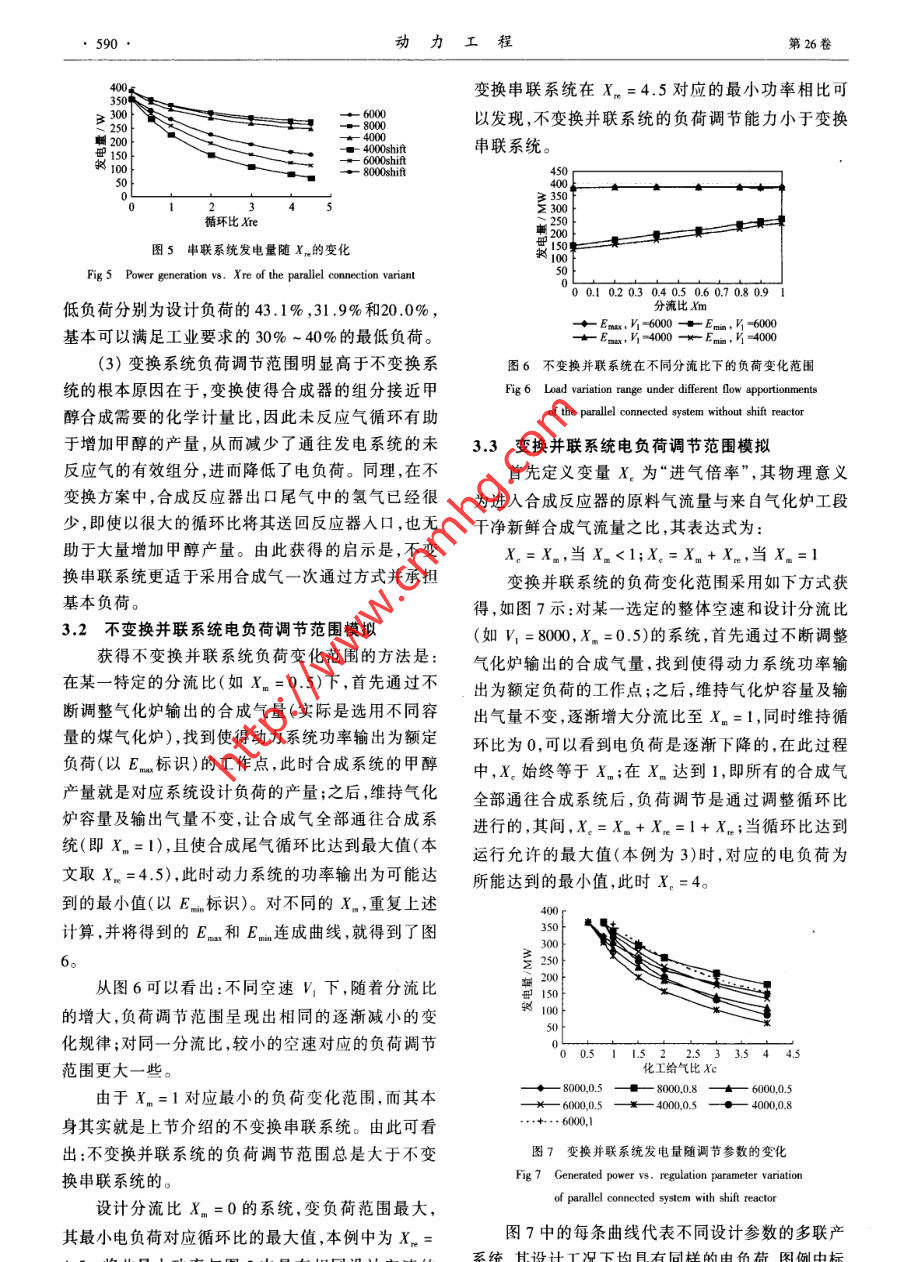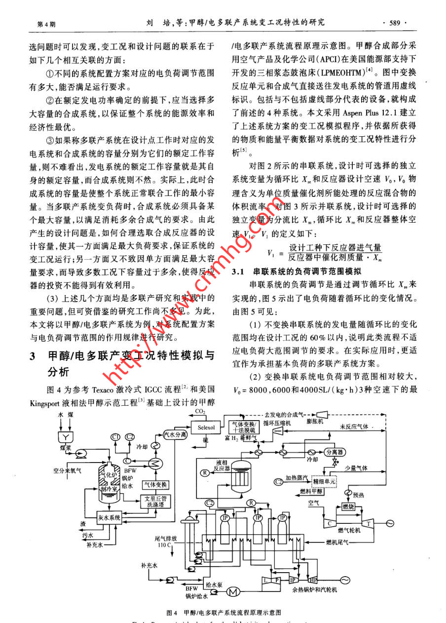 第26卷第4期Vol. 26 No.42006年8月Jourmal of Power EngineeringAug. 2006文章編號: 000-6761(2006)04 -587-05甲醇/電多聯(lián)產(chǎn)系統(tǒng)變工況特性的研究劉培,高健,李政(清華大學(xué)熱能工程系,北京100084)摘要:利用Aspen Plus仿真工具和甲醇/電多聯(lián)產(chǎn)系統(tǒng)的變工況數(shù)學(xué)模型,對串聯(lián)或并聯(lián)、以及有否變換單元的4種多聯(lián)產(chǎn)系統(tǒng)配置方案進行了模擬計算,詳細比較了它們的電負荷調(diào)節(jié)范圍。分析結(jié)果表明:4種系統(tǒng)調(diào)節(jié)能力由強到弱依次為:變換并聯(lián)系統(tǒng)、變換串聯(lián)系統(tǒng)、不變換并聯(lián)系統(tǒng)和不變換串聯(lián)系統(tǒng)。相關(guān)分析方法和結(jié)論為多聯(lián)產(chǎn)系統(tǒng)設(shè)計提供了參考。圖7參5關(guān)鍵詞:能源工程;多聯(lián)產(chǎn);變工況;負荷調(diào)節(jié)中圖分類號: TK01 ,TQ21文獻標(biāo)識碼: APerformance Alteration of Methanol/ Electricity PolygenerationSystems for Various Modes of OperationLIU Pei, GAO Jian, LI Zheng(Department of Thermal Engineering, Tsinghua University, Beiing 100084, China)Abstract: Making use of Aspan Plus simulation tools and a mathematical model for operation mode changes of methanol/electricity polygeneration systems, simulation calculation of four different variants of system configurations ,includingseries and parallel connections, as well as changes of elements have been calculated and their eletric output variationcapabilties compared in detail . The sequence of the four configuration variants in terms of diminishing order of regulationcapability are in succession: the parallel connection variant with shift reactor, the series connection variant with shiftreactor, the parallel connection variant without shift reactor, and the series connection variant without shift reactor. Figs7and refs5 .Keywords: cenergy engineering; polygeneration; off design operation; output regulation優(yōu)越的環(huán)保性能,以聯(lián)產(chǎn)運輸采用液體燃料以緩解1研究目的石油安全需要,及未來可采取較方便和以較小的成在新世紀(jì),我國能源面臨著資源短缺,液體燃料本減排溫室氣體等特性,成為我國煤炭現(xiàn)代化利用嚴(yán)重依賴進口,環(huán)境污染加劇,溫室氣體排放量大而的重要途徑之一”。且增長迅速,農(nóng)村和小城鎮(zhèn)需要方便和潔凈能源等多聯(lián)產(chǎn)系統(tǒng)的概念實質(zhì)上是要把化工過程和發(fā)諸多挑戰(zhàn)。煤炭作為我國主要使用的一次能源,急電過程有機地耦合在- - 起,力爭實現(xiàn)能量利用、經(jīng)濟需在利用形式上和利用過程方面加以創(chuàng)新,以應(yīng)對性和環(huán)保性能的最優(yōu)化。盡管由于多聯(lián)產(chǎn)涉及到的這些挑戰(zhàn)。以煤氣化為核心的多聯(lián)產(chǎn)系統(tǒng)由于具備主要過程技術(shù),如煤氣化,化工合成(如甲醇)和燃氣輪機聯(lián)合循環(huán)均為成熟技術(shù),因此具有相當(dāng)?shù)目尚惺崭迦掌?2005-12-05性,但是要把其發(fā)展為一個完整的、經(jīng)濟上具有競爭基金項目:國家自然科學(xué)基金重大研究計劃項目(90210032)及力的實用技術(shù),依然存在較大的挑戰(zhàn)。這個挑戰(zhàn)除國家重點基礎(chǔ)研究發(fā)展計劃項目(2005CB221207)資助。作者簡介:劉培(1980-),男 ,碩士生,主要從事多聯(lián)產(chǎn)系統(tǒng)研了體現(xiàn)在已有成熟技術(shù)為適應(yīng)多聯(lián)產(chǎn)系統(tǒng)的特殊需方方數(shù)據(jù)要尚需改變和改進外,更重要的則體現(xiàn)在系統(tǒng)集成588動力工程第26卷層次.上,即:如何設(shè)計系統(tǒng)結(jié)構(gòu),功能和參數(shù),使其不環(huán)回路。定義x為循環(huán)比,其物理意義為循環(huán)回反僅具有較高的設(shè)計效率,而且滿足各種變工況運行應(yīng)器入口的合成尾氣與反應(yīng)器入口新鮮氣的比值。和操作要求(可操作性)以及在此條件下的可靠性、系統(tǒng)運行的- 一個特例是合成尾氣完全不循環(huán)、而是.可用性和可維護性要求,使得系統(tǒng)在整個生命周期全部送往發(fā)電系統(tǒng),本文稱其為合成氣“一次通過”具備最大的經(jīng)濟性。為此,本文將多聯(lián)產(chǎn)系統(tǒng)層次方式,此時X。=0。研究的內(nèi)涵歸納為:在滿足可操作性以及可靠性、可圖2和圖3中用虛線標(biāo)出了變換單元,表示這用性和可維護性等技術(shù)要求條件下,實現(xiàn)能源、環(huán)境是一個可選單元,通過選擇確定是否設(shè)置合成氣變和生態(tài)以及經(jīng)濟性的多目標(biāo)最優(yōu)化問題(圖1)。換系統(tǒng)。本文研究的系統(tǒng)方案可分為:不變換串聯(lián)可操作性 可靠性系統(tǒng),變換串聯(lián)系統(tǒng),不變換并聯(lián)系統(tǒng)和變換并聯(lián)系滿足產(chǎn)品生產(chǎn)可用性可維護性滿足多目標(biāo)要求統(tǒng),分別以方案1~4標(biāo)識。要求的多聯(lián)產(chǎn)|的優(yōu)化設(shè)計方案煤氣化系統(tǒng)的集成度-般定義為燃氣輪機壓氣系統(tǒng)初步設(shè)計方能經(jīng)環(huán)機提供的空氣量占空分系統(tǒng)總進氣量的比例。由于其他技術(shù)約束集成度不是本文討論的重點,下面分析和計算中,均圖1多聯(lián)產(chǎn) 系統(tǒng)層次研究的內(nèi)涵取集成度為50% ,空分系統(tǒng)出口氮氣回注燃氣輪機Fig 1 Many- sided studies on polygeneration system燃燒室的比例為35.5%。顯然,良好的變工況運行能力是多聯(lián)產