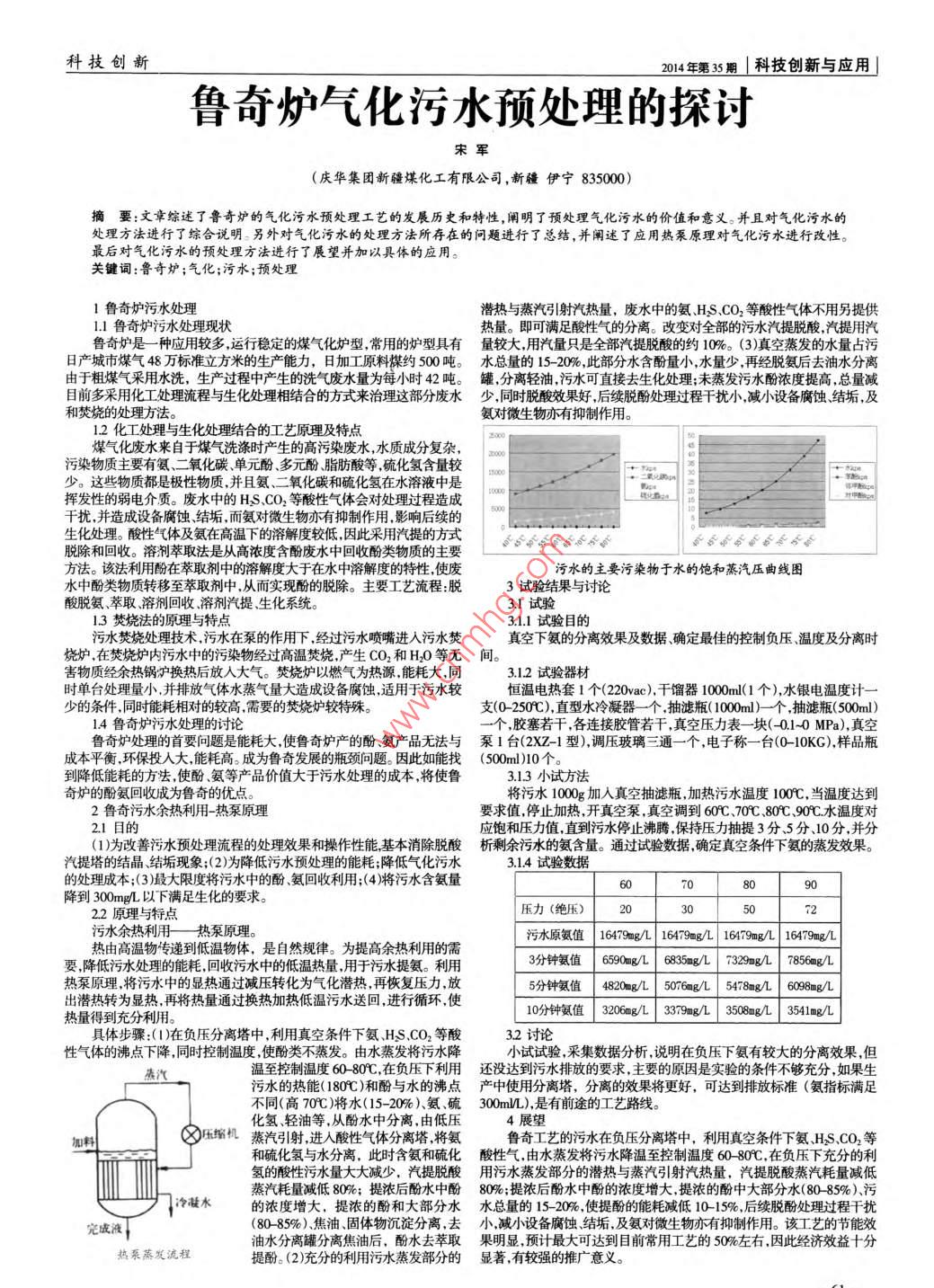 科技創(chuàng)新2014年第35期I科技創(chuàng)新與應用J魯奇爐氣化污水預處理的探討宋軍(慶華集團新疆煤化工有限公司,新疆伊寧835000)摘要:文章綜述了 魯奇爐的氣化污水預處理工藝的發(fā)展歷史和特性,闡明了預處理氣化污水的價值和意義。并且對氣化污水的處理方法進行了綜合說明。另外對氣化污水的處理方法所存在的問題進行了總結,并闡述了應用熱泵原理對氣化污水進行改性。最后對氣化污水的預處理方法進行了展望并加以具體的應用。關鍵詞:魯奇爐;氣化;污水;預處理1魯奇爐污水處理潛熱與蒸汽引射汽熱量,廢水中的氨HS.CO2等酸性氣體不用另提供1.1魯奇爐污水處理現狀熱量。即可滿足酸性氣的分離。改變對全部的污水汽提脫酸,汽提用汽魯奇爐是一種應用較多,運行穩(wěn)定的煤氣化爐型,常用的爐型具有量較大,用汽量只是全部汽提脫酸的約10%。(3)真空蒸發(fā)的水量占污日產城市煤氣48萬標準立方米的生產能力,日加工原料煤約500噸。水總量的 15- 20%,此部分水含酚量小,水量少,再經脫氨后去油水分離由于粗煤氣采用水洗,生產過程中產生的洗氣廢水量為每小時42噸。罐 ,分離輕油,污水可直接去生化處理;未蒸發(fā)污水酚濃度提高,總量減目前多采用化工處理流程與生化處理相結合的方式來治理這部分廢水少 ,同時脫酸效果好,后續(xù)脫酚處理過程干擾小,減小設備腐蝕結垢,及和焚燒的處理方法。氨對微生物亦有抑制作用。1.2化工處理與生化處理結合的工藝原理及特點煤氣化廢水來自于煤氣洗滌時產生的高污染廢水,水質成分復雜,00污染物質主要有氨、二氧化碳.單元酚、多元酚脂肪酸等.硫化氫含量較000少。這些物質都是極性物質,并且氨、一氧化碳和硫化氫在水溶液中是中揮發(fā)性的弱電介質。廢水中的HS.CO2等酸性氣體會對處理過程造成干擾,并造成設備腐蝕、結垢,而氨對微生物亦有抑制作用,影響后續(xù)的生化處理。酸性氣體及氨在高溫下的溶解度較低,因此采用汽提的方式脫除和回收。溶劑萃取法是從高濃度含酚廢水中回收酚類物質的主要方法。該法利用酚在萃取劑中的溶解度大于在水中溶解度的特性,使廢污水的主要污染物于水的飽和蒸汽壓曲線圖水中酚類物質轉移至萃取劑中,從而實現酚的脫除。主要工藝流程:脫3試驗結果與討論酸脫氨、萃取溶劑回收、溶劑汽提、生化系統(tǒng)。3.1試驗.13焚燒法的原理與特點3.1.1試驗目的污水焚燒處理技術,污水在泵的作用下,經過污水噴嘴進人污水焚真空下氨的分離效果及數據確定最佳的控制負壓溫度及分離時燒爐,在焚燒爐內污水中的污染物經過高溫焚燒,產生CO,和H2O等無間害物質經余熱鍋爐換熱后放人大氣。焚燒爐以燃氣為熱源,能耗大,同3.1.2試驗器材時單臺處理量小,并排放氣體水蒸氣量大造成設備腐蝕,適用于污水較恒溫電熱套1個(220vac),干餾器1000ml(1個),水銀電溫度計一少的條件.同時能耗相對的較高,需要的焚燒爐較特殊。支(0- 250C),直型水冷凝器一個 ,抽濾瓶( 000ml)-個,抽濾瓶(500ml)1.4魯奇爐污水處理的討論一個,膠塞若干,各連接膠管若干,真空壓力表-塊( 0.1-0 MPa),真空魯奇爐處理的首要問題是能耗大,使魯奇爐產的酚、氨產品無法與泵 1臺(2XZ-1型),調壓玻璃三通一個,電子稱-臺(0-10KG),樣品瓶成本平衡,環(huán)保投人大,能耗高。成為魯奇發(fā)展的瓶頸問題。因此如能找(500ml)10 個。到降低能耗的方法使酚氨等產品價值大于污水處理的成本,將使魯3.1.3小試方法奇爐的酚氨回收成為魯奇的優(yōu)點。將污水1000g加入真空抽濾瓶,加熱污水溫度100C,當溫度達到2魯奇污水余熱利用熱泵原理要求值,停止加熱,開真空泵,真空調到60C、70C .80C .909C.水溫度對2.1目的應飽和壓力值,直到污水停止沸騰,保持壓力抽提3分.5分10分,并分(1)為改善污水預處理流程的處理效果和操作性能,基本消除脫酸析剩余污水的氨含量。 通過試驗數據確定真空條件下氨的蒸發(fā)效果。汽提塔的結晶、結垢現象;(2)為降低污水預處理的能耗;降低氣化污水3.1.4試驗數據的處理成本;(3)最大限度將污水中的酚、氨回收利用;(4)將污水含氨量08090降到300mg/L以F滿足生化的要求。22原理與特點壓力(絕壓)502污水余熱利用一熱泵原理。污水原氨值16479mg/L| 16479@g/L | 16479mg/L 16479mg/L熱由高溫物傳遞到低溫物體,是自然規(guī)律。為提高余熱利用的需要,降低污水處理的能耗,回收污水中的低溫熱量,用于污水提氨。利用3分鐘氨值6590mg/L 6835mg/L 7329mg/L| 7856mg/L熱泵原理,將污水中的顯熱通過減壓轉化為氣化潛熱,再恢復壓力,放5分鐘氨值4820mg/L 5076mg/L| 5478mg/L 6098mg/L出潛熱轉為顯熱,再將熱量通過換熱加熱低溫污水送回,進行循環(huán),使10分鐘氨值3206mg/L 3379mg/L 3508mg/L 3541mg/L熱量得到充分利用。具體步驟:( 1)在負壓分離塔中,利用真空條件下氨、HS.CO2等酸3.2討論性氣體的沸點下降,同時控制溫度,使酚類不蒸發(fā)。由水蒸發(fā)將污水降小試試驗,采集數據分析,說明在負壓下氨有較大的分離效果,但溫至控制溫度60 -80C,在負壓下利用還沒達到污水排放的要求, 主要的原因是實驗的條件不夠充分,如果生污水的熱能( 1809C)和酚與水的沸點產中使用分離塔, 分離的效果將更好,可達到排放標準(氨指標滿足不同(高70C)將水(15-20%)、氨、硫300m/L),是有前途的工藝路線?;瘹漭p油等,從酚水中分離,由低壓4展望加料礫縮機蒸汽引射,進入酸性氣體分離塔