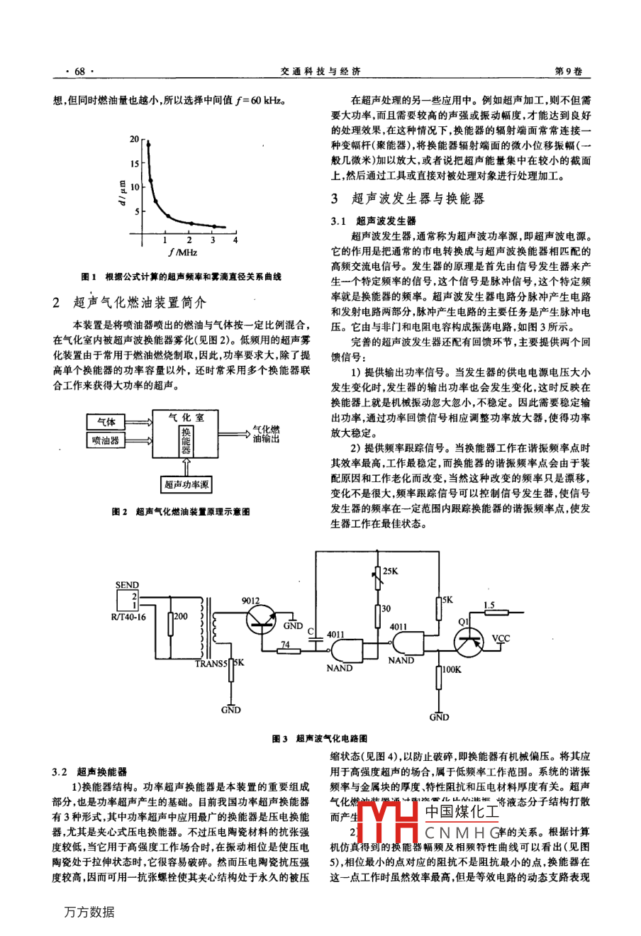 Technology Economy in Areas of Communications刪技與經(jīng)酒超聲高效氣化燃油的研究秦進(jìn)平1,喬爽2,盛程潛2(1.黑龍江工程學(xué)院教務(wù)處,黑龍江哈爾濱150050;2.黑龍江工程學(xué)院電子工程系,黑龍江哈爾濱150050)摘要:目前,人們對(duì)城市空氣質(zhì)量以及地球石油資源危機(jī)等問題日益重視。利用浸于液體中的超聲換能器產(chǎn)生震動(dòng)的原理,將燃油破碎成極其微小的油滴,使其氣化,提高燃油的利用效率,大大減少環(huán)境污染程度,因此具有極廣泛的市場(chǎng)前景和應(yīng)用價(jià)值。針對(duì)超聲波氣化原理、超聲氣化燃油裝置、超聲換能器及超聲波發(fā)生器與換能器的匹配問題進(jìn)行了討論。關(guān)鍵詞:姬聲換能器;氣化燃油;匹配;燃油裝置中圖分類號(hào):U464.136文獻(xiàn)標(biāo)識(shí)碼:A文章編號(hào):1008-5696(2007)04-0067-0Research on effective supersonic gasified fuelQIN Jin-ping, QIAo Shuang, SHENG Cheng-qian(1. Educational Administration Office, Heilongjiang Institute of Technology, Harbin 150050, China: 2. Dept. of Electronic Engineer.ing, Heilongjiang Institute of Technology, Harbin 150050, China)Abstract: Nowadays, people are attaching importance to the air quality of city energy sources crisis and so onThe paper applies the principle that the ultrasonic transducer can produce vibration in liquid. The technologybreaks fuel into extremely small oil drips and causes its gasification, which enhances the fuel efficiency.Thetechnology simultaneously greatly reduces the environmental pollution. Therefore it has the extremely wide-spread market prospect and the application value. This article describes the ultrasonic wave gasification princile, the supersonic gasified fuel equipment, the ultrasonic transducer, the ultrasonic generator. The transducermatch question has carried on discussionKey words: ultrasonic transducer; gasified fuel; match; fuel device近年來,隨著人們生活水平的日益提高,越來越多的轎車進(jìn)入尋常百姓家庭,同時(shí)對(duì)汽車燃油的需求量也在同步急1超聲氣化原理增長(zhǎng)。傳統(tǒng)的汽油汽車發(fā)動(dòng)機(jī)中,汽油是經(jīng)過化油器后和空早在1927年汗·伍德及智梅斯就曾指出,當(dāng)一束強(qiáng)超聲氣混合而進(jìn)入氣缸的,化油器是安裝在發(fā)動(dòng)機(jī)進(jìn)氣通路上的波自浸于液體中的換能器朝向液面發(fā)出后,液面上將出現(xiàn)一種裝置它的作用是把汽油和空氣自動(dòng)地按一定比例混合層薄霧。薄霧的濃淡與超聲波的強(qiáng)度有關(guān),而霧滴的大小則及進(jìn)行霧化但由于汽油和空氣的混合比例無法準(zhǔn)確使燃油與超聲波的頻率及液體的表面張力有關(guān)。在超聲作用下,液不能充分燃燒,從而造成燃料消耗多排放超標(biāo),即不經(jīng)濟(jì),又體在氣相中分散并在液體表面形成細(xì)霧飛逸的過程稱超聲不利于環(huán)保。隨著汽車技術(shù)的發(fā)展燃油噴射裝置正在逐步霧化或氣化。其空化作用是超聲成霧的主要原因取代傳統(tǒng)化油器式供油系統(tǒng)。但是這種燃油噴射系統(tǒng)對(duì)燃料現(xiàn)巳證明霧滴直徑稍小于表面波的半波長(zhǎng),這使得人的利用率和空燃比的調(diào)配也存在一定的缺陷。而超聲技術(shù)是們傾向于認(rèn)為霧滴是表面波在波峰處的噴出物。超聲霧化以超聲能量使物體或物性某些狀態(tài)變化的應(yīng)用技術(shù)。它對(duì)提所釆用的頻率一般從40k至幾兆赫不等,這取決于所要高產(chǎn)品質(zhì)量、降低生產(chǎn)成本防治環(huán)境污染提高生產(chǎn)效率具求的霧滴的大小,一般霧滴的尺度為120-30gm。霧滴平均有特殊的潛在能力廣泛應(yīng)用于機(jī)械、電子、環(huán)保、化工能源等直徑的大小與超聲波頻率成函數(shù)關(guān)系,頻率高則霧細(xì),其數(shù)許多重要領(lǐng)域。超聲波技術(shù)又是以物理機(jī)械振動(dòng)、電子、材學(xué)表達(dá)式為料等學(xué)科為基礎(chǔ)的高新技術(shù)之一。所以超聲氣化燃油具有很d=(rr)3/(4pf2)3(1)好的霧化效果和極高的效率利用超聲氣化可使燃油充分分式中:d為超聲波霧化霧滴的平均直徑,m;π為圓周率解成微小粒子使汽油充分燃燒既節(jié)省了燃料又可延長(zhǎng)發(fā)動(dòng)3.14機(jī)使用壽命減小有害氣體排放。液體于V中國(guó)煤化工,為霧化汽迪CNMHG×103gm2代入式收稿日期:2007-03-04(1)經(jīng)過超聲振動(dòng)頻率計(jì)算多組數(shù)據(jù),畫在坐標(biāo)系內(nèi)如圖1基金項(xiàng)目:黑龍江省教育廳科研項(xiàng)目(10551260)所示。其中d=22m時(shí),f=55kHz;d=16pm時(shí),∫=85作者簡(jiǎn)介:秦近平(1963~),男,教授,研究方向:計(jì)算機(jī)控制技術(shù)k。雖然頻率越高,霧化后的油滴直徑越小,霧化效果越理交通科技與經(jīng)濟(jì)第9卷想,但同時(shí)燃油量也越小,所以選擇中間值f=60kHb在超聲處理的另一些應(yīng)用中。例如超聲加工,則不但需要大功率,而且需要較高的聲強(qiáng)或振動(dòng)幅度,才能達(dá)到良好的處理效果,在這種情況下,換能器的輻射端面常常連接一種變幅桿(聚能器),將換能器輻射端面的微小位移振幅(般幾微米)加以放大,或者說把超聲能量集中在較小的截面上,然后通過工具或直接對(duì)被處理對(duì)象進(jìn)行處理加工。3超聲波發(fā)生器與換能器3.1超聲波發(fā)生器超聲波發(fā)生器,通常稱為超聲波功率源,即超聲波電源mHZ它的作用是把通常的市電轉(zhuǎn)換成與