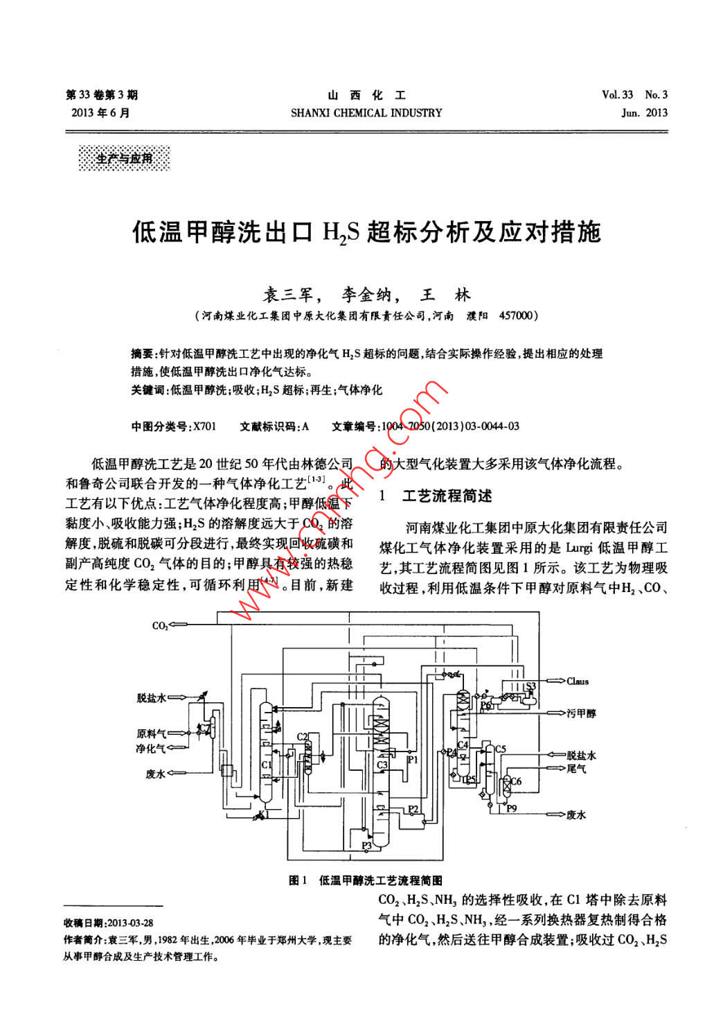 第33卷第3期山西化工Vol 33 No. 32013年6月SHANXI CHEMICAL INDUSTRYJun.2013低溫甲醇洗出口H2S超標(biāo)分析及應(yīng)對措施袁三軍,李金納,王林(河南煤業(yè)化工集團(tuán)中原大化集團(tuán)有限責(zé)任公司,河南濮陽457000)摘要:針對低溫甲醇洗工藝中出現(xiàn)的凈化氣H2S超標(biāo)的問題,結(jié)合實(shí)際操作經(jīng)驗(yàn),提出相應(yīng)的處理措施,使低溫甲醇洗出口凈化氣達(dá)標(biāo)。關(guān)鍵詞:低溫甲醇洗;吸收;H2S超標(biāo);再生;氣體凈化中圖分類號:X701文獻(xiàn)標(biāo)識碼:A文章編號:1004-7050(2013)03-0044-03低溫甲醇洗工藝是20世紀(jì)50年代由林德公司的大型氣化裝置大多采用該氣體凈化流程。和魯奇公司聯(lián)合開發(fā)的一種氣體凈化工藝13。此工藝有以下優(yōu)點(diǎn):工藝氣體凈化程度高;甲醇低溫下1工藝流程簡述黏度小、吸收能力強(qiáng);H2S的溶解度遠(yuǎn)大于CO2的溶河南煤業(yè)化工集團(tuán)中原大化集團(tuán)有限責(zé)任公司解度,脫硫和脫碳可分段進(jìn)行,最終實(shí)現(xiàn)回收硫磺和煤化工氣體凈化裝置釆用的是Lg低溫甲醇工副產(chǎn)高純度CO2氣體的目的;甲醇具有較強(qiáng)的熱穩(wěn)藝,其工藝流程簡圖見圖1所示。該工藝為物理吸定性和化學(xué)穩(wěn)定性,可循環(huán)利用。目前新建收過程,利用低溫條件下甲醇對原料氣中H2、CocLaus脫鹽水污甲醇原料氣凈化氣脫鹽水廢水尾氣水圖1低溫甲醇洗工藝流程簡圖CO2、H2S、NH3的選擇性吸收,在Cl塔中除去原料收稿日期:20130328氣中CO2、H2SNH3,經(jīng)一系列換熱器復(fù)熱制得合格作者簡介袁三軍,男,1982年出生,200年畢業(yè)于鄭州大學(xué)現(xiàn)主要的凈化氣然后送往甲醇合成裝置;吸收過CO2、H2S從事甲醇合成及生產(chǎn)技術(shù)管理工作。2013年6月袁三軍,等:低溫甲醇洗出口H2S超標(biāo)分析及應(yīng)對措施45的甲醇溶液則在C2中閃蒸,其中的CO、H2回收后含量高時(shí),NH3會在熱再生甲醇中形成(NH4)2S。經(jīng)循環(huán)氣壓縮機(jī)K1送往原料氣入口;在C3塔中,當(dāng)熱再生甲醇送到吸收塔C頂部時(shí),(NH4)2S分甲醇經(jīng)閃蒸回收溶液中CO2,送往界區(qū)外,甲醇經(jīng)解再次釋放出H2S,導(dǎo)致H2S進(jìn)入合成氣。因此,C3和C4再生后送往Cl塔中作為原料氣的吸收劑在操作過程中,應(yīng)盡量增加C4熱負(fù)荷。由于原設(shè)循環(huán)利用。計(jì)再生塔回流泵P6的設(shè)計(jì)流量偏小,所以,對裝置2裝置中存在的問題進(jìn)行了技改,將P6泵更換為大流量泵,以便回流液泵不過載,從而增加熱再生塔的負(fù)荷,保證熱再生甲低溫甲醇洗裝置負(fù)荷在80%時(shí)裝置運(yùn)行正醇再生徹底。常,各項(xiàng)工藝指標(biāo)均達(dá)到設(shè)計(jì)指標(biāo);當(dāng)負(fù)荷提至3.4提高甲醇純度100%時(shí),裝置中頻繁出現(xiàn)出口凈化氣中H2S超標(biāo)低溫甲醇洗中甲醇純度是影響甲醇吸收的重要的問題。原設(shè)計(jì)出口凈化氣中H13S體積分?jǐn)?shù)為1×因素之一。由于前系統(tǒng)采用殼牌煤氣化裝置煤粉10,實(shí)際運(yùn)行高負(fù)荷時(shí),H2S體積分?jǐn)?shù)最高達(dá)到顆粒細(xì)小,所以,很容易被帶至低溫甲醇洗裝置中,26×10,嚴(yán)重影響了后續(xù)合成單元催化劑的運(yùn)行在甲醇溶液中形成懸浮物,造成甲醇濁度升高,嚴(yán)重時(shí)間。因此需要采取一定的措施對該裝置的運(yùn)行影響甲醇的吸收能力。另外,變換系統(tǒng)中催化劑粉工藝進(jìn)行改進(jìn),以實(shí)現(xiàn)在高負(fù)荷下低溫甲醇洗出口末帶至低溫甲醇中也會影響甲醇吸收的效果。當(dāng)系凈化氣中H2S達(dá)標(biāo)。統(tǒng)中水含量升高時(shí),低溫甲醇大部分為酸性環(huán)境,管3采取的措施道和設(shè)備腐蝕嚴(yán)重,生成的硫化鐵等雜質(zhì)存在于低溫甲醇洗溶液中,導(dǎo)致甲醇溶液濁度升高,表觀上為3.1降低吸收甲醇溫度甲醇溶液顏色發(fā)黑。表1是甲醇溶液的質(zhì)量對H2S理論研究表明,吸收甲醇溫度低,有利于甲醇對酸性氣體的吸收;溫度越低,甲醇的吸收能力越強(qiáng)。吸收的影響。表1甲醇溶液的質(zhì)量對H2S吸收的影響低溫甲醇洗有4個(gè)冷量來源:外界冰機(jī)制冷、循環(huán)水帶來的冷量、CO2閃蒸制冷、氮?dú)馄徇^程中產(chǎn)生的甲醇溶液濁度1.252.405.507.208.75V(H2S)×100.080.100.120.130.18冷量。為了降低系統(tǒng)溫度,可采取以下措施:1)提為了降低甲醇濁度,我們利用大修機(jī)會對低溫高制冷冰機(jī)的負(fù)荷;2)增加汽提氮?dú)饬?充分利用汽提過程中產(chǎn)生的冷量;3)加大對系統(tǒng)中循環(huán)水換甲醇洗設(shè)備進(jìn)行了檢查。檢査發(fā)現(xiàn),低溫甲醇洗再熱器的清理提高循環(huán)水換熱效率;4)降低精洗甲生塔和熱再生塔內(nèi)存在大量污垢塔盤被一層黑色醇循環(huán)量減小低溫甲醇洗裝置中冷區(qū)和熱區(qū)中換煤焦油狀物質(zhì)覆蓋,經(jīng)化驗(yàn)分析為煤粉及鐵的硫化熱器換熱冷量損失;5)在保證出口CO2含量合格的物。另外,從低溫甲醇洗各個(gè)換熱器中也清理出了情況下,增加主洗甲醇循環(huán)量,加大閃蒸,獲得冷量。大量的類似物質(zhì)。為了從根本上解決甲醇中雜質(zhì)對工藝改進(jìn)后裝置中吸收甲醇的溫度比設(shè)計(jì)值低吸收的影響對裝置中甲醇進(jìn)行了置換并在冷區(qū)5℃,對吸收效果的提高起到了明顯的作用。C3出