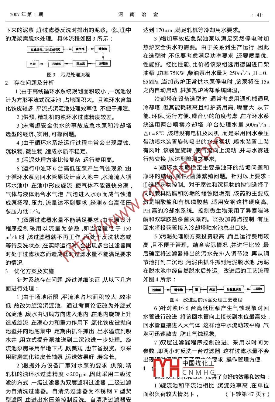2007年2月河南冶金eb. 2007第15卷第1期HENAN METALLURGYVol.15 No. 1安鋼高速線材循環(huán)水系統(tǒng)優(yōu)化措施,劉志方張寧呂國(guó)田盧寧(安陽(yáng)鋼鐵集團(tuán)有限責(zé)任公司)摘要對(duì)安鋼高速線材循環(huán)水系統(tǒng)存在的問(wèn)題進(jìn)行了分析結(jié)合實(shí)際情況,本著經(jīng)濟(jì)實(shí)用的原則提出了優(yōu)化措施工程投運(yùn)后各項(xiàng)指標(biāo)均達(dá)到要求取得了良好的經(jīng)濟(jì)效益和社會(huì)效益。關(guān)鍵詞循環(huán)水沉淀池過(guò)濾器冷卻THE EXCELLENT MEASURE OF CIRCULATION WATER SYSTEM INANGANG HIGH SPEED WIRE .Liu Zhifang Zhang Ning Lv Guotian Lu Ning( Anyang lron & Steel Group Co. ,Ltd )ABSTRACT Carried on to Anyang steel high - speed system existent problem of the line material circulation water analysis ,combine an actual circumstance based on an economic practical principle put forward excellent optimized measures the engineer-ing hurl carries behind various index meet all the requirements pbtaining good economic performance and social performance.KEY WORDS circulation water sedimentation pool filter cooling0前言]- [養(yǎng)準(zhǔn)到脫水坑] C就造封覆地]安鋼高速線材生產(chǎn)線是具有國(guó)際先進(jìn)水平的軋一-0-Em-[熱路)-C ]鋼生產(chǎn)線,設(shè)計(jì)年產(chǎn)40萬(wàn)噸卷材,關(guān)鍵設(shè)備精軋機(jī)禮機(jī)、軋福用水]一世壞供水菜]- {+水的- [冷卻為]一[灶健器]組是引進(jìn)美國(guó)摩根公司的連續(xù)無(wú)扭軋制軋機(jī)和技圖1濁環(huán)水系 統(tǒng)工藝流程圖術(shù),設(shè)計(jì)速度達(dá)120m/s。與之配套的水處理工程分大顆粒二沉池主要除油及沉淀。一、 二沉淀池均采.為凈循環(huán)水系統(tǒng)和濁循環(huán)水系統(tǒng)凈循環(huán)水系統(tǒng)設(shè)用平流池。計(jì)能力為1280m'/h,補(bǔ)充水為西區(qū)凈化水站供應(yīng)的2 )過(guò)濾器。采用雙層濾料過(guò)濾器選用GSL-地表水和軟水其中地表水占三分之二軟水占三分3. 5雙層高速過(guò)濾器5臺(tái)每臺(tái)最大處理量720m'/h。之一,補(bǔ)充水量為46m'/h濁循環(huán)水系統(tǒng)設(shè)計(jì)能力1.2 凈循環(huán)水系統(tǒng)為2550m'/h濁循環(huán)水系統(tǒng)的補(bǔ)充水量為100m3/該系統(tǒng)為常規(guī)設(shè)計(jì)的敞開式循環(huán)水系統(tǒng)采用h。由于該系統(tǒng)可利用面積較小且進(jìn)口高速線材設(shè)余壓回水的方式冷卻水經(jīng)各設(shè)備換熱器后余壓上備對(duì)循環(huán)用水系統(tǒng)水質(zhì)要求較高,因此需根據(jù)實(shí)際到冷卻塔中,經(jīng)冷卻后回到循環(huán)水池中循環(huán)使用。情況,合理優(yōu)化工藝改進(jìn)措施達(dá)到高效低價(jià)最大系統(tǒng)工藝流程如圖2所示:限度地滿足生產(chǎn)需求。優(yōu)化前的高速線材循環(huán)水系統(tǒng)事故座急油泵1. 1濁環(huán)水系統(tǒng)[卷水菜加熱爐}-[冷卻塔]根據(jù)用戶對(duì)水質(zhì)的要求較高及濁環(huán)水主要含氧[著水菜-[覆壓、精滑電機(jī)沖卻系快]-[冷卻罐化鐵皮及油的水質(zhì)特點(diǎn)采用三級(jí)處理,即設(shè)備用水直接經(jīng)氧化鐵皮溝進(jìn)入-沉淀池經(jīng)過(guò)- -、二沉淀池圖2凈循環(huán)水系 統(tǒng)工藝流程圖的沉淀處理再通過(guò)過(guò)濾器的進(jìn)一步過(guò)濾 最終達(dá)到. 1.3中國(guó)煤化工設(shè)備及工藝的用水指標(biāo)要求經(jīng)冷卻塔降溫后回用。YHCNM H G系統(tǒng)中的一個(gè)主要問(wèn)系統(tǒng)工藝流程如圖1所示:題污泥來(lái)源主要有:①-沉池初沉淀下來(lái)氧化鐵1 )-、二沉淀池。一沉池主 要去除氧化鐵皮較皮其量約為氧化鐵皮量80% ~ 90%②二次沉淀聯(lián)系欠廁憝聲工程師河南.安陽(yáng)( 45004 )安陽(yáng)鋼鐵集團(tuán)有限責(zé)任公司策劃部;收稿日期2006- -1-72007年第1期河南冶1.下來(lái)的泥漿③過(guò)濾器反洗時(shí)排出的泥漿。②③中達(dá)到170μm滿足軋機(jī)等冷卻用水要求。的泥漿需脫水處理。具體流程如圖3所示:3)增加事故應(yīng)急柴油泵以滿足突然停電時(shí)加熱爐安全供水的需要。由于關(guān)系到生產(chǎn)運(yùn)行,因此在選型時(shí)不僅要考慮滿足功率要求還要質(zhì)量?jī)?yōu)、[外運(yùn)]一[壓她機(jī)門一[聚加壓}一[濃墻地性能好。經(jīng)比性能、比價(jià)格該泵組選用德國(guó)進(jìn)口柴圖3 污泥處理流程油泵功率75KW柴油泵出水量為250m/h H=0.2存在問(wèn)題及分析65MPa ,當(dāng)加熱爐正常供水泵停電時(shí),該泵將在15s1 )由于高線循環(huán)水系統(tǒng)規(guī)劃面積較小,一沉池設(shè)之內(nèi)自動(dòng)啟動(dòng)供加熱爐冷卻系統(tǒng)降溫。計(jì)為方形平流式沉淀池占地面積大。且濁環(huán)水含氧冷卻塔在設(shè)備選型時(shí)通??紤]用通機(jī)械通風(fēng)化鐵皮較多平流式沉淀池處理效率低不便于抓渣。冷卻塔但其能耗較高且維護(hù)費(fèi)用高、噪音大,從節(jié)2 )供預(yù)、精軋機(jī)的濁環(huán)水過(guò)濾精度較差。能、環(huán)保、運(yùn)行方便、噪音小的角度考慮在凈環(huán)水系3)未考慮安全供水的事故應(yīng)急水泵和冷卻塔統(tǒng)選用兩臺(tái)噴霧冷卻塔,單臺(tái)處理水量500m3/h ,選型的經(jīng)濟(jì)、實(shí)用、可靠問(wèn)題?!鱰=8C ,該塔沒(méi)有電機(jī)及風(fēng)機(jī)而是采用回水余壓4)由于循環(huán)水系統(tǒng)運(yùn)行過(guò)程中常會(huì