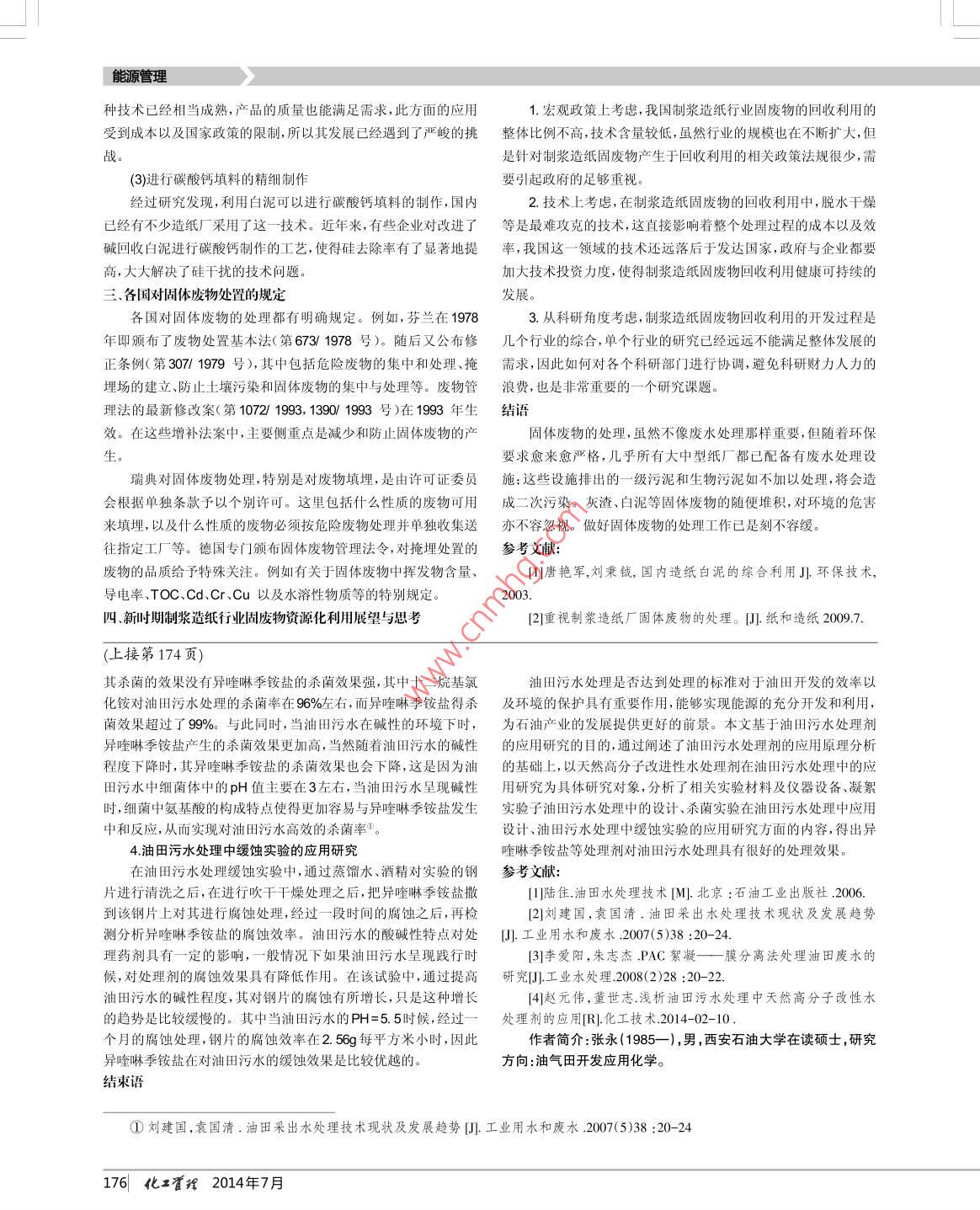 能源管理油田污水處理劑應(yīng)用方法研究張永(西安石油大學(xué)化學(xué)化工學(xué)院710065)(延長油田股份有限公司靖邊采油廠718500)摘要:隨著油田開發(fā)的程度逐漸加大,為經(jīng)濟(jì)提供了有力的天然高分子改進(jìn)性水處理劑作為分析對象,以天然高分子F691資源保障但是與此同時,由于油田采油污水的產(chǎn)生對水資源造成為原料,通過相關(guān)的化學(xué)反應(yīng)從而制取得到陽離子型油田污水處了嚴(yán)重的污染。在處理由于污水的過程中個,采用先進(jìn)的油田污理劑——異喹啉季銨鹽,在此基礎(chǔ)上,對異喹啉季銨鹽進(jìn)行油田水處理劑可以高效、環(huán)保地對油田污水進(jìn)行處理,本文就是基于污水處理應(yīng)用方法的硏究分析。該視角的基礎(chǔ)上,主要介紹了油田污水處理劑中具有代表性的天1相關(guān)實(shí)驗材料及儀器設(shè)備然高分子改性水處理劑在其中的應(yīng)用方法,希望為油田污水處理在對制取得到陽離子型油田污水處理劑——異喹啉季銨鹽劑在油田污水處理中的研究提供相關(guān)參考信息。的過程中,要用的主要化學(xué)試劑主要有陽離子型聚丙烯酰胺,該關(guān)鍵詞:油田污水;處理劑;天然高分子改進(jìn)性水處理劑種陽離子型聚丙烯酰胺需要滿足其平均相對分子質(zhì)量達(dá)到300萬,并且其陽離子型聚丙烯酰胺的制取濃度是0.3%左右,還需要油田污水處理劑應(yīng)用概述制取異喹啉季銨鹽,該異喹啉季銨鹽的濃度在0.5%左右,乙二胺對石油進(jìn)行開采的過程中,通常使用注水開發(fā)的方式。但是陰離子緩沖劑以及十二烷基氯化銨等化學(xué)試劑。在該試驗中主在運(yùn)用注水開發(fā)的過程中,經(jīng)常要面臨兩大難題:其一是注水開要的設(shè)備儀器主要包括PHS29A酸度計,用于溶液攪拌的攪拌發(fā)水源的解決難題;其二就是怎樣解決處理注入水與開采完后排機(jī)、光電式濁度儀,細(xì)菌標(biāo)準(zhǔn)測試瓶以及標(biāo)準(zhǔn)腐蝕掛片鋼出水的排放問題。采油污水經(jīng)過處理后再用于油田的注入水時2凝絮實(shí)驗在油田污水處理中的應(yīng)用分析如果該油田污水沒有達(dá)到油田回注水的標(biāo)準(zhǔn)時候,就會導(dǎo)致堵塞首先,把油田污水處理劑——異喹啉季銨鹽加入到油田污水地層出油通道,降低注水效率以及使用的開采量。采用傳統(tǒng)的處理樣本中,以每分鐘250轉(zhuǎn)的轉(zhuǎn)速對該油田污水處理樣本進(jìn)行油田污水處理方法,無論是物理水處理技術(shù)還是生物法來進(jìn)行污一分半鐘的攪拌,實(shí)現(xiàn)把油田污水中異喹啉季銨鹽藥劑充分的分水處理,這些處理方式所需要的成本較高,時間比較長,其油田水散,然后,再以每一分鐘70轉(zhuǎn)的轉(zhuǎn)速對該油田污水處理樣本進(jìn)行處理工藝流程一般可以表示為“隔油---過濾'或者隔油---浮10分半鐘的攪拌,在此基礎(chǔ)上,把該油田污水處理樣本進(jìn)行靜置選---過濾,其主要把油田污水中的油和懸浮物去除。在采用處分層,最終得到上層的清液,把剩下的油田污水中的成分進(jìn)行濁理劑對油田污水進(jìn)行出的過程中,利用化學(xué)試劑添加水處理劑的度的檢測。方式,把油田污水中的乳化油以及其他的膠體等溶解性去除掉,從給該實(shí)驗中可以發(fā)現(xiàn),異喹啉季銨鹽對于油田污水的效果通常采用混凝沉淀、化學(xué)氧化、離子交換的具體手段,利用絮凝與相同條件下陽離子型聚丙烯酰胺處理效果相比更具有高效劑、氧化劑以及殺菌劑等水處理劑進(jìn)行處理。其污水處理過程可性。因為在每升石油污水中添加陽離子型聚丙烯酰胺為5mg的以分為三段式油田污水處理和二段式油田污水處理流程。其中時候,石油污水處理后的之后濁度是8度,與此同時相同條件下三段式污水處理流程可以表示為:異喹啉季銨鹽對于油田污水處理后的濁度只是3度。如果在每混凝劑升油田污水中加入過量的陽離子型聚丙烯酰胺,就會導(dǎo)致絮凝惡油田污水一一次障迪三次混碳沉淀除油一過濾→注水站化現(xiàn)象的出現(xiàn),而且這種絮凝惡化現(xiàn)象比在油田污水中加入過量圖1三段污水處理工藝流程的異喹啉季銨鹽更加嚴(yán)重。所以從異喹啉季銨鹽這兩個方面的段油田污水處理化過程可以表示為優(yōu)勢考慮,在對油田污水處理過程中進(jìn)行絮凝凈化來說,使用異足凝劑喹啉季銨鹽更加高效和環(huán)保3殺菌實(shí)驗在油田污水處理中應(yīng)用分析油田污水混凝沉淀除油過濾}→注水站在研究美國關(guān)于石油工程協(xié)會絕跡稀釋法的基礎(chǔ)上,對油田圖2二段污水處理工藝流程利用油田污水中具有比較高的礦化指數(shù),其中氯離子含有量污水處理中的細(xì)菌指數(shù)含量進(jìn)行檢測,把已經(jīng)稀釋好的油田污水比較大的特點(diǎn),有針對性地把凝絮劑加入油田污水中,通過吸附測試瓶置于恒溫箱中進(jìn)行培炎和觀察,在此過程中保持恒溫箱的電中和作用,壓縮雙電層以及吸附架橋的作用,把油田污水中的溫度在30攝氏度,經(jīng)過半個月的培養(yǎng)以后,再對該培養(yǎng)液進(jìn)行SRB數(shù)值的測定。在對油田污水進(jìn)行處理劑的應(yīng)用過程中,采用乳化油等雜物去除。二、天然高分子改進(jìn)性水處理劑在油田污水處理中的應(yīng)用研究的殺菌劑通常是一種叫做十