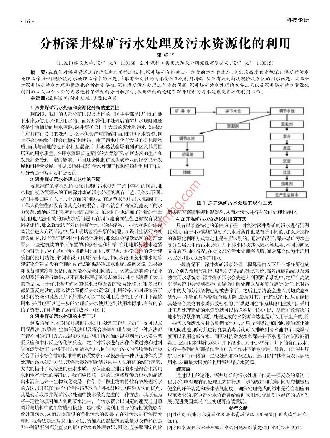 科技論壇分析深井煤礦污水處理及污水資源化的利用(1、沈陽建筑大學,遼寧沈陽1101682、中煤科工集團沈陽設計研究院有限公司,遼寧沈陽110015)摘要:在我們對煤炭資源進行開采和利用的過程中,深井煤礦會排放岀一定量的污水和廢水,我們應高度的重視深井煤礦的污水處理工作,針對現(xiàn)階段污水處理工作中的問題,采取有針對性的污水資源化的利用措施,從而有效的解決現(xiàn)階段礦區(qū)的用水問題。文章針對深井煤礦污水處理和資源化分析的重要性、深井煤礦污水處理工藝中的問題、深井煤礦污水處理的主要匚藝以及深井煤礦污水資源化利用的方式四個方面的內容進行了詳細的分析和探討,從而詳細的論述了深井煤礦的污水處理及資源化利用工作。關鍵詞:深井煤礦;污水處理;資源化利用1深井煤礦污水處理和資源化分析的重要性現(xiàn)階段,我國的大部分礦區(qū)以及周圍的居民主要都是以當地的地礦井水井下水倉調節(jié)水池下水作為使用水和飲用水的,而經過凈化和處理后的礦井水現(xiàn)階段還多是作為輔助的用水資源,深井煤礦會排出大量的廢水和污水,如果沒混凝劑有對其進行妥善的處理,那么不但會嚴重的破壞當地的地下水資源,同時還會影響整個社會的穩(wěn)定和結。由于污水中含有大量的礦化度物□再節(jié)水池質,當其與當地的地下水相互混合后,其必然就會影響到礦區(qū)及其周圍居民的用水質量。在用水資源普遍緊張的大背景下,礦區(qū)煤炭的生產和發(fā)展都會受到一定的影響,并且還會限制礦區(qū)煤炭產業(yè)的經濟循環(huán)發(fā)展和可持續(xù)發(fā)展??梢?對深井煤礦污水處理工作和資源化利用工作進行分析是非常重要和必要的2深井煤礦污水處理工藝中的問題R要想準確的掌握現(xiàn)階段深井煤礦污水處理工藝中存在的問題,那么我們就必須深入的了解深井煤礦污水處理的現(xiàn)有工藝,具體如下圖主要歸納了以下六個方面的問題:a.在調節(jié)水池中加入混凝劑■生產生活水工作人員往往都沒有將其充分的混合,那么就會升高沉淀池表面的水圖1深井煤礦污水處理的現(xiàn)有工藝力負荷,濾池的工作效率也會隨之降低。雖然同時也添加了適量的消毒例去配置高錳酸鉀和混凝劑,從而對污水進行有效的處理和凈化劑,但也無法有效的解決水質問題;h在調節(jié)池前面往往也都沒有設置4深井煤礦污水資源化利用的方式網格柵欄,那么就無法有效的攔截污水中的漂浮物,些大顆粒的漂浮只有以某些特定的條件為前提,才能對深井煤礦的污水進行資源物就會進入到調節(jié)池中,易出現(xiàn)堵塞提升泵的問題。在設計生活污水處化利用,由于不同煤礦的污水其水質條件也是有所不同的,那么所選擇理設施時沒有保證濾網材料的整體質量,那么就會降低濾網的處理效的資源化利用方式肯定也是有所區(qū)別的。通常情況下,深井煤礦污水主果;c.一些建筑物的平面布置的不夠合理和科學,在用地形勢越來越緊要分為居民生活污水、深井井下排水以及其他廢水等幾類,不同的礦區(qū)張的背景下,為了盡可能的降低用地面積,就應更加科學合理的設計建又有著不同的情況,在對這部分污水處理完成后,通常都會作為生活用筑物的使用功能,舉例來說,可以將清水池、中間水池和廢水排水吃等水農業(yè)用水以及生產用水建筑物合建;d沒有合理的配置煤礦循環(huán)冷卻水系統(tǒng),舉例來說,如果冷一般情況下,深井煤礦污水處理工程都是由以下幾個部分所組成卻設備和被冷卻設備的配置是不完全相同的,那么就會影響整個循環(huán)的,分別為預調節(jié)系統(tǒng)、煤泥處理系統(tǒng)、砂濾系統(tǒng)、高效沉淀系統(tǒng)以及超冷卻系統(tǒng)的運行效果,既不能取得理想的冷卻效果,同時也浪費了大量濾飲用水系統(tǒng)等,深井煤礦污水會先進入到預調節(jié)系統(tǒng)中,之后在高效的能量;e由于深井煤礦礦區(qū)的倛水設施設置的較為分散,有很多設施沉淀系統(tǒng)中會受到攪拌、絮凝微電解處理以及泥渣分離等操作,此時污都是重復建設的,那么就會降低礦井水資源的利用效率,同時還浪費了水中的大部分污染物已經被去除了,之后上層清液會進入到均質濾料很多的資金和設備井下外排水可以二次利用為防塵用水和井下灌漿濾池中,生物的懸浮物就會被去除,最后對其進行超濾凈化,從而保證用水,并且也可以進一步的處理礦井水使其達到飲用水標準,有效的節(jié)其是符合最終的水質排放標準的,而煤泥則會作為其他用途使用。采用約了資源,并且降低了運行的成本。(圖1)此工藝處理完成的水資源就可以輸送給周圍的居民,從而有效解決當3深井煤礦污水處理的主要工藝地水資源緊張的問題。處理完成的水資源當然也是可以用于生產的,將通常情況下,在對深井煤礦污水進行處理工作時,我們主要可以采一些污水和廢水先排放到調節(jié)池中,之后分別經過沉砂池、接觸氧化池用混凝法、雙膜法生物氧化法以及混合法等處理方法,每一種方法都和無閥濾池,再對其進行臭氧消毒后就可以排放到凊水池中了,洗煤時有著不同的使用方式:a混凝法就是利用所添加的混凝劑與污水發(fā)生絮就可以采用這部分水。而再對洗澡廢水和深井井下水進行次氯酸鈉消凝反應和中和反應等化學反應,之后對污水進行多種介質過濾和過斜毒后,還