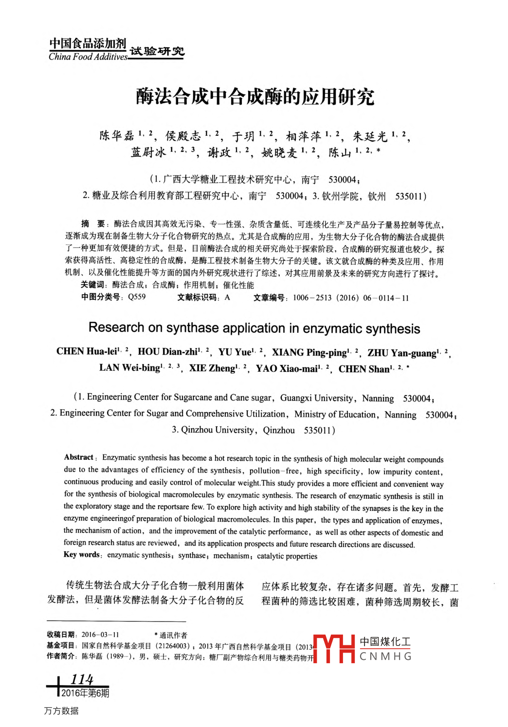 中國食品添加劑試驗研究China Food Additives-酶法合成中合成酶的應(yīng)用研究陳華磊1.2,侯殿志12,于玥1.2,相萍萍1.2,朱延光1.2,藍尉冰1.2.3,謝政1.2,姚曉麥12,陳山1.2.*(1.廣西大學(xué)糖業(yè)工程技術(shù)研究中心,南寧530004;2.糖業(yè)及綜合利用教育部工程研究中心,南寧530004; 3. 欽州學(xué)院,欽州535011)摘要:酶法合成因其高效無污染、專- 性強、雜質(zhì)含量低、可連續(xù)化生產(chǎn)及產(chǎn)品分子量易控制等優(yōu)點,逐漸成為現(xiàn)在制備生物大分子化合物研究的熱點。尤其是合成酶的應(yīng)用,為生物大分子化合物的酶法合成提供了一種更加有效便捷的方式。但是,目前酶法合成的相關(guān)研究尚處于探索階段,合成酶的研究報道也較少。探索獲得高活性、高穩(wěn)定性的合成酶,是酶工程技術(shù)制備生物大分子的關(guān)鍵。該文就合成酶的種類及應(yīng)用、作用機制、以及催化性能提升等方面的國內(nèi)外研究現(xiàn)狀進行了綜述,對其應(yīng)用前景及未來的研究方向進行了探討。關(guān)鍵詞:酶法合成;合成酶;作用機制;催化性能中圖分類號: Q559文獻標識碼: A文章編號: 1006- 2513 (2016) 06- 0114-11Research on synthase application in enzymatic synthesisCHEN Hua1ei.”, HOU Dian-zhi!, YU Yue'.2, XIANG Ping ping' 7, ZHU Yan-guang'2,LAN Wei-bing' 2.3, XIE Zheng': 2, YAO Xiao-mai1.2, CHEN Shan!: 2.●(1. Engineering Center for Sugarcane and Cane sugar, Guangxi University, Nanning 530004;2. Engineering Center for Sugar and Comprehensive Utilzation, Ministry of Education, Nanning 500004;3. Qinzhou University, Qinzhou 535011)Abstract: Enzymatic synthesis has become a hot research topic in the synthesis of high molecular weight compoundsdue to the advantages of eficiency of the synthesis, pollution- free, high specificity, low impurity content,continuous producing and easily control of molecular weight.This study provides a more eficient and convenient wayfor the synthesis of biological macromolecules by enzymatic synthesis. The research of enzymatic synthesis is still inthe exploratory stage and the reportsare few. To explore high activity and high stability of the synapses is the key in theenzyme engineeringof preparation of biological macromolecules. In this paper, the types and aplicaion of enzymes,the mechanism of action, and the improvement of the catalytic performance, as well as other aspects of domestic andforeign research status are reviewed, and its application prospects and future research directions are discussed.Key words: enzymatic synthesis; synthase; mechanism; catalytic properties傳統(tǒng)生物法合成大分子化合物一-般 利用菌體應(yīng)體系比較復(fù)雜,存在諸多問題。首先,發(fā)酵工發(fā)酵法,但是菌體發(fā)酵法制備大分子化合物的反程菌種的篩選比較困難,菌種篩選周期較長,菌收稿日期: 2016-03-11*通訊作者中國煤化工基金項目:國家自然科學(xué)基金項目(21264003) ; 2013 年廣西自然科學(xué)基金項目(2013作者簡介:陳華磊(1989 -), 男,碩士,研究方向:糖廠副產(chǎn)物綜合利用與糖類藥物開MYHCNMH GL 114“2016年第6期中國食品添加劑:試驗研究China Food Additives-活性。右旋糖酐蔗糖酶與蔗糖共價鍵聯(lián)結(jié)在一其中,以蔗糖為底物,在無其他受體情況起,并將蔗糖分解放出果糖,形成D- -glucosy1-下, 首先催化蔗糖分解生成與酶連接的D-葡萄Enzyme [45。在酶催化的情況下,反應(yīng)可向四個糖基和果糖,然后將D-葡萄糖基轉(zhuǎn)移到右旋方向進行1461: (1)聚合產(chǎn)生右旋糖酐; (2)在糖酐殘基的C3/C6位置或水分子上,合成右旋H2O的參與下,分解生成葡萄糖; (3)在外界受糖酐糖鏈或水解蔗糖,催化合成機制如圖2-1體的參與下生成低聚糖; (4) 逆向反應(yīng)。所示(471。o的rx③②①rx ⑤Lxexo①x°D③-②-0的圖2-1右旋糖酐蔗糖酶催化合 成右旋糖酐的機制[47]1Fig.2 1 Mechanism for dextran biosynthesis by dextransucrase.(X,和Xz代表酶活性位點的親和團: O代表葡萄糖; <代表果糖; 0- -<代表蔗糖;0-0表示兩個由a- 1. 6糖苷鍵鏈接的葡萄糖基團.)右旋糖酐酶蔗糖酶除能合成右旋糖酐外,當(dāng)被移至-條右旋糖酐鏈中得到以右旋糖酐鏈作為有可識別外源受體(如麥芽糖)存在時,右旋糖分支部分的右旋糖酐(511 ; (3) D-葡萄糖基部分酐蔗糖酶可以將D-葡萄糖基轉(zhuǎn)移到外源受體上被轉(zhuǎn)移至水中,蔗糖水解1521; (4) 右旋糖酐鏈合成各種糖基化產(chǎn)物,如功能性低聚糖等(48。受移至水中,或者與受體(D-葡萄糖、D-果糖、體反應(yīng)主要有以下四個方面: (1) D-葡萄糖基蔗糖、麥芽糖)結(jié)合,從活性位點處釋放右旋糖部分被移至受體單糖或低聚糖中149. s0|; (2) D-酐,聚合反應(yīng)終止(50, 52。葡萄糖基部分被移至右旋糖酐鏈中形成葡萄糖基2.2交替糖蔗糖酶的作用機制支鏈,或是D-葡萄糖基部分和右旋糖酐鏈一起2n times●f圖2- -2交 替糖蔗糖酶合成交替糖的作用機制(5]1Fig.2- 2 Reaction mechanism of alternan synthesis catalyzed hvalternaneurrace.中國煤化工(●-d;蔗糖,●:葡萄糖,<:果糖TYHCNMH G118I 2016年第6期.試驗研究中國食品添加劑.China FoodAdditives交替糖蔗糖酶的作用機制與右旋糖酐蔗糖酶淀粉蔗糖酶的催化反應(yīng)過程是將供體質(zhì)子注的作用機制較為相似153。交替蔗糖酶先斷開蔗糖人到糖苷鍵中,對部分葡萄糖的異頭碳進行親核的糖苷鍵,將葡萄糖殘基轉(zhuǎn)移給受體分子,生成攻擊形,成共價連接的底物-酶中間產(chǎn)物,中間產(chǎn)低聚糖或多糖,釋放果糖(54。酶活中心可以與葡.物可以和水分子發(fā)