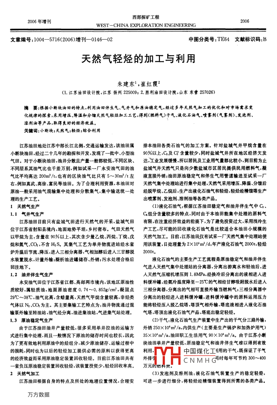 西部探礦工程2006年增刊WEST-CHINA EXPLORATION ENGINEERING文章編號(hào):1004-5716(2006)增刊0146-02中圖分類(lèi)號(hào):TE64文獻(xiàn)標(biāo)識(shí)碼:B天然氣輕烴的加工與利用朱建東,崔紅霞2l.江蘇油田設(shè)計(jì)院,江蘇揚(yáng)州225009;2.勝利油田設(shè)計(jì)院,山東東營(yíng)257026)摘要:根據(jù)小斷塊油田的特點(diǎn),利用油田伴生氣、氣井氣和原油穩(wěn)定氣,經(jīng)過(guò)多年天然氣加工的優(yōu)化和對(duì)市場(chǎng)需求變化規(guī)律的探索,采用增壓、降溫和分餾天然氣輕烴加工工藝,得到(燃料氣)干氣、液化石油氣、噴霧劑(氣霧劑)發(fā)泡劑、溶劑油等產(chǎn)品,取得良好的經(jīng)濟(jì)效益關(guān)鍵詞:小斷塊;天然氣;輕烴;綜合利用江蘇油田地處江蘇中部長(zhǎng)江北側(cè),交通運(yùn)輸發(fā)達(dá)該油田屬排本油田各類(lèi)石油氣的加工方案。針對(duì)鹽城氣井甲烷含量在小斷塊油田,經(jīng)過(guò)二十幾年的勘探和開(kāi)發(fā)發(fā)現(xiàn)了一批中、小型油90%以上,C及Q含量較少,同時(shí)鹽城氣井所在地區(qū)經(jīng)濟(jì)欠發(fā)氣田。對(duì)于小斷塊油田,油井分散且產(chǎn)量一般都較低不同區(qū)塊、達(dá)工業(yè)發(fā)展緩慢所以居民及工業(yè)用氣量都比較小到目前為止不同層系其油氣比也千差萬(wàn)別,例如試采一廠(chǎng)永安油氣田的油鹽城氣井天然氣只是向少數(shù)鹽城市區(qū)居民提供民用燃料氣凝氣比平均高達(dá)200m3/t,也有的區(qū)塊油氣比只有5~30m3/t左液直接外銷(xiāo);油田原油穩(wěn)定氣和伴生氣用管道輸送至試采一廠(chǎng)右例如真武高徐富民等油田。為了合理利用資源本油田對(duì)天然氣集中處理站進(jìn)行集中處理天然氣采用增壓降溫、分餾后原油一般采用油氣混輸集中處理和分散集氣,集中輸送統(tǒng)一處經(jīng)脫甲烷、乙烷后,生產(chǎn)出液化石油氣和輕烴輕烴經(jīng)精餾塔生產(chǎn)理的生產(chǎn)工藝出噴霧劑、發(fā)泡劑、溶劑油等各類(lèi)產(chǎn)品。1天然氣生產(chǎn)(1)液化石油氣:根據(jù)江蘇油田穩(wěn)定氣和油井伴生氣中C31.1氣井氣生產(chǎn)C4組分含量較多的特點(diǎn),同時(shí)由于本油田能集中處理的原料氣江蘇油田目前只有鹽城氣田進(jìn)行天然氣的開(kāi)采,鹽城氣田有限在注重經(jīng)濟(jì)效益的前提下,為了避免投資過(guò)大,采用淺冷生位于江蘇省射陽(yáng)縣境內(nèi),地面地勢(shì)平坦,鄉(xiāng)村密布。氣田天然氣產(chǎn)工藝,盡可能的回收液化石油氣是比較適合本油田小規(guī)模的以甲烷為主,含量在90%以上,其次含少量乙烷丙烷、丁烷戊天然氣加工。目前,江蘇油田僅有試采一廠(chǎng)天然氣集中處理站使烷和氮?dú)?、CO2,不含H2S。其集氣工藝為單井物流進(jìn)站經(jīng)水套用該裝置,日處理量為2×10m3/d,年產(chǎn)液化石油氣2000,輕烴爐升溫后節(jié)流降壓進(jìn)人三相分離器氣相加醇后進(jìn)入三甘醇脫2000水裝置脫水,計(jì)量外輸;凝析油進(jìn)罐儲(chǔ)存、外銷(xiāo);污水處理合格后液化石油氣的主要生產(chǎn)工藝流程是原油穩(wěn)定氣和油井伴生回注地下。氣進(jìn)入天然氣集中處理站的分離器,分離出游離水和輕油后,進(jìn)1.2油井伴生氣生產(chǎn)入天然氣壓縮機(jī)增壓到1.8MPa,經(jīng)換冷后分離出的液相進(jìn)入進(jìn)永安油氣田位于江蘇省江都、高郵兩市境內(nèi)該地區(qū)原油性料緩沖罐,經(jīng)氨冷溫度降至-25℃的氣相經(jīng)甘醇吸附脫水后進(jìn)入質(zhì)較好屬輕質(zhì)油,地面原油密度0.74~0.852g/cm3,凝固點(diǎn)三相分離器,分離出的氣相可直接外輸當(dāng)燃料氣;三相分離器中29℃~38℃,油氣比高含蠟量高天然氣甲烷含量較高,非烴類(lèi)分離出的輕烴進(jìn)入進(jìn)料緩沖罐進(jìn)料緩沖罐中的原料運(yùn)用壓力氣體以№2、OO為主。其主要集輸工藝特點(diǎn)為:油井物流通過(guò)混能將輕烴壓人脫乙烷塔塔頂氣相外輸,塔底液相進(jìn)入液化石油輸泵外輸至轉(zhuǎn)油站油氣經(jīng)分離油進(jìn)集油站氣進(jìn)集氣站處理。氣塔塔頂出液化石油氣產(chǎn)品,塔底出穩(wěn)定輕烴1.3原油穩(wěn)定氣生產(chǎn)(2)干氣液化石油氣生產(chǎn)裝置中生產(chǎn)出的干氣分三路外輸由于江蘇油田油井產(chǎn)量較低,很多采用單井拉油的運(yùn)輸方外銷(xiāo)250×10′m3/a,內(nèi)供生產(chǎn)(主要是生產(chǎn)鍋爐和加熱爐用氣)式進(jìn)行集中處理,而且一般情況下原油的儲(chǔ)存時(shí)間也較長(zhǎng),因此35×104m3/a,油田職工生活用氣90×10m3/a。由于江蘇小斷為了更有效地利用原油中的烴組分,減少原油儲(chǔ)存、運(yùn)輸過(guò)程中塊油田單井產(chǎn)量較低,原油穩(wěn)定氣和油井伴生氣難以得到有效的損耗,同時(shí)也為以后的輕烴加工提供必需的原料以獲得更高利用中國(guó)煤化工圳用的干氣,既保證了干氣的經(jīng)濟(jì)效益而采用原油穩(wěn)定裝置回收輕烴。目前江蘇油田共有外排CNMHG時(shí)每年可節(jié)約30~400一套負(fù)壓原油穩(wěn)定裝置回收輕烴該裝置投資少輕烴回收率高。萬(wàn)元的燃科賈。2天然氣加工(3)發(fā)泡劑及溶劑油:液化石油氣裝置生產(chǎn)的穩(wěn)定輕烴,江蘇油田根據(jù)自身的特點(diǎn)及所處的地理位置情況,合理安可進(jìn)一步進(jìn)行細(xì)分,將輕烴經(jīng)精餾裝置得到所需的各類(lèi)產(ch