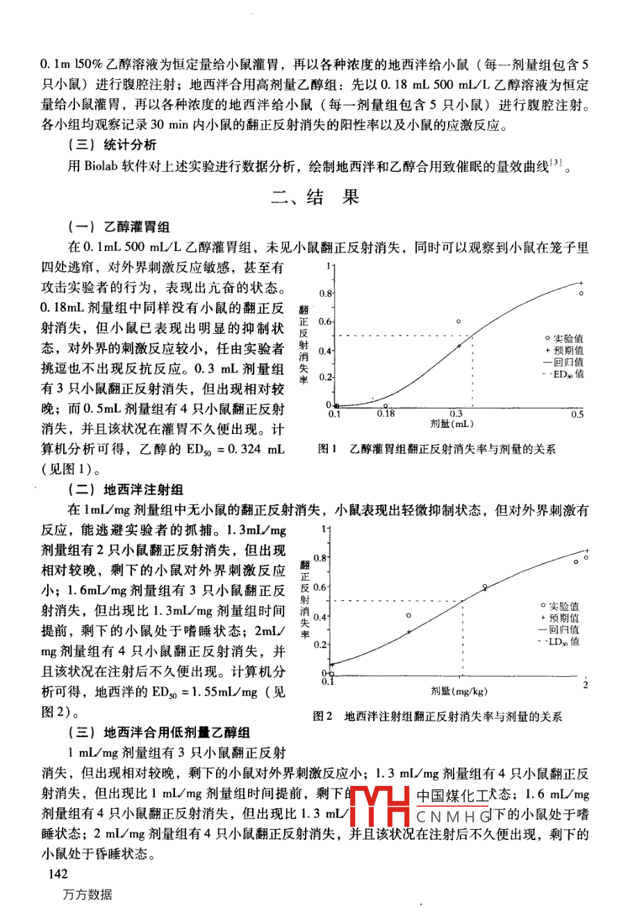 中山大學(xué)學(xué)報論叢,2007年第27卷第3期SUN YATSEN UNIVERSITY FORUM. Vol 27 No. 3 2007心心心,和、心乙醇合用地西泮的量效關(guān)系張思敏,梁國彥',莊澤鍇’,吳曉瑜,王鈺虹曾潔雯',邱燦華,李曉君2,雷俊霞3中山大學(xué)中山醫(yī)學(xué)院1.2004級本科生,2.實(shí)驗(yàn)教學(xué)中心,3.病理生理學(xué)教研室,廣東廣州510080)摘要:[目的]探討地西泮和乙醇合用引起中樞抑制導(dǎo)致中毒的兩者量的關(guān)系。[方法]制做乙醇灌胃組、地西泮注射組、地西泮合用低劑量乙醇組以及地西泮合用高劑量乙醇組小鼠動物模型,觀察記錄30min內(nèi)小鼠的翻正反射消失的陽性率及小鼠的應(yīng)激反應(yīng)。[結(jié)果]量效曲線隨著乙醇濃度增加而向左向上偏移。[結(jié)論]地西泮合用乙醇時,兩者顯示出協(xié)同效應(yīng)關(guān)鍵詞:地西泮;乙醇;翻正反射;中樞抑制中圖分類號:P9文獻(xiàn)標(biāo)識碼:A文章編號:10071792(2007)03014103現(xiàn)在社會競爭日益激烈,從而使得很多人感到壓力越來越大,失眠已成為現(xiàn)代社會中是一種較為常見的疾病,它嚴(yán)重地威脅著我們的健康和生活,使很多人處于亞健康狀態(tài).據(jù)研究,地西泮(俗稱安定)作為苯二氮草受體的激動劑有氯通道的閾閥功能,GABA受體激活導(dǎo)致氯通道開放,引起突觸后神經(jīng)元的超極化,抑制神經(jīng)元的放電,從而降低神經(jīng)元興奮性,減少下步去極化興奮性遞質(zhì)的釋放,具有很好的催眠作用而不良發(fā)應(yīng)又比較小,且單用地西泮作為催眠藥即使是超過正常量數(shù)倍一般都不會導(dǎo)致使用者死亡,這也是作為受到睡眠困擾的人群首選藥物的原因l。但是地西泮與其它中樞抑制藥如乙醇合用時,中樞抑制作用增強(qiáng),加重嗜睡、昏睡、呼吸抑制、昏迷、嚴(yán)重者可致死。鑒于很多人都喝酒,而且在飲酒后有服用安眠藥的需要2,本實(shí)驗(yàn)就是探討地西泮和乙醇合用引起中樞抑制導(dǎo)致中毒的兩者量的關(guān)系。、材料與方法(一)材料實(shí)驗(yàn)動物:小鼠80只,體質(zhì)量30g左右,雌雄不限,來自本大學(xué)動物實(shí)驗(yàn)中心。藥物500mL/L乙醇溶液1瓶1L,地西泮注射液1盒(10mL×10支)。(二)方法把80只小鼠隨機(jī)分成4組,每組20只小鼠。乙醇灌胃組:以4種劑量(0.5、0.30.18、0.lmL)的500mL/L乙醇溶液,分別給小鼠(每一劑量組包含5只小鼠)進(jìn)行灌胃;地西泮注射組:配制4種濃度(2、1.6、1.3、1.0mL/mg)的地西泮溶液,分別按0.2mL/10g給小鼠(每一劑量組包含5只小鼠)進(jìn)行腹腔注射;地西泮合用低劑量乙醇組:先以中國煤化工收稿日期:2007-01-l1基金項(xiàng)目:中山大學(xué)2004級本科探索實(shí)驗(yàn)基金項(xiàng)目CNMHG作者簡介:張思敏(1986-),廣東惠州人,E-mlil:sImin-chang@163.com;雷俊霞,指導(dǎo)老師,通訊作者。0.1m150%乙醇溶液為恒定量給小鼠灌胃,再以各種濃度的地西泮給小鼠(每一劑量組包含5只小鼠)進(jìn)行腹腔注射;地西泮合用高劑量乙醇組:先以0.18mL500mL/L乙醇溶液為恒定量給小鼠灌胃,再以各種濃度的地西泮給小鼠(每一劑量組包含5只小鼠)進(jìn)行腹腔注射。各小組均觀察記錄30min內(nèi)小鼠的翻正反射消失的陽性率以及小鼠的應(yīng)激反應(yīng)。(三)統(tǒng)計分析用 Biolab軟件對上述實(shí)驗(yàn)進(jìn)行數(shù)據(jù)分析,繪制地西泮和乙醇合用致催眠的量效曲線3。、結(jié)果(一)乙醇灌胃組在0.1mL500mL/L乙醇灌胃組,未見小鼠翻正反射消失,同時可以觀察到小鼠在籠子里四處逃竄,對外界刺激反應(yīng)敏感,甚至有攻擊實(shí)驗(yàn)者的行為,表現(xiàn)出亢奮的狀態(tài)。0018mL劑量組中同樣沒有小鼠的翻正反◆06射消失,但小鼠已表現(xiàn)出明顯的抑制狀態(tài),對外界的刺激反應(yīng)較小,任由N”實(shí)驗(yàn)值+預(yù)期值挑逗也不出現(xiàn)反抗反應(yīng)。0.3mL劑量組失回歸值率02ED值有3只小鼠翻正反射消失,但出現(xiàn)相對較晚;而0.5mL劑量組有4只小鼠翻正反射18消失,并且該狀況在灌胃不久便出現(xiàn)。計劑量(mL)算機(jī)分析可得,乙醇的ED=0.324mL圖1乙醇灌胃組翻正反射消失率與劑量的關(guān)系(見圖1)。(二)地西泮注射組在1m/mg劑量組中無小鼠的翻正反射消失,小鼠表現(xiàn)出輕微抑制狀態(tài),但對外界刺激有反應(yīng),能逃避實(shí)驗(yàn)者的抓捕。1.3mL/mng劑量組有2只小鼠翻正反射消失,但出現(xiàn)相對較晚,剩下的小鼠對外界刺激反應(yīng)小;1.6mL/mg劑量組有3只小鼠翻正反反06射消失,但出現(xiàn)比13mLmg劑量組時間消o4°實(shí)驗(yàn)值+預(yù)期值提前,剩下的小鼠處于嗜睡狀態(tài);2ml回歸值mg劑量組有4只小鼠翻正反射消失,并LDv值且該狀況在注射后不久便出現(xiàn)。計算機(jī)分析可得,地西泮的ED=1.55mL/mg(見劑量(ng/kg)圖2)。圖2地西泮注射組翻正反射消失率與劑量的關(guān)系(三)地西泮合用低劑量乙醇組1mL/mg劑量組有3只小鼠翻正反射消失,但出現(xiàn)相對較晚,剩下的小鼠對外界刺激反應(yīng)小;1.3mL/mg劑量組有4只小鼠翻正反射消失,但出現(xiàn)比1mlmg劑量組時間提前,剩下qV凵中國煤化工犬態(tài);.6mL/mg劑量組有4只小鼠翻正反射消失,但出現(xiàn)比1.3mLCNMHG下的小鼠處于嗜睡狀態(tài);2mL/mg劑量組有4只小鼠翻正反射消失,并且該狀況在注射后不久便出現(xiàn),剩下的小鼠處于昏睡狀態(tài)。142(四)地西泮合用高劑量乙醇組1mL/mg劑量組有5只小鼠翻正反射
