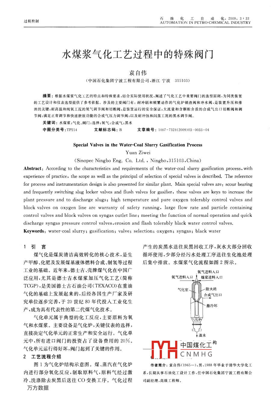 動化,2009,3:33過程控制AUTOMATION IN PETRO- CHEMICAL INDUSTRY水煤漿氣化工藝過程中的特殊閥門袁自偉(中國石化集團寧波工程有限公司,浙江寧波315103)摘要:根據(jù)水煤漿氣化工藝的特點和特殊要求,結(jié)合實際使用狀況,闡述了氣化工藝中重要閥門的選型原則,為同類裝置的工藝設(shè)計和儀表選型提供了參考依據(jù)。涉及的主要閥門有:耐沖刷和頻繁動作的氣化爐鎖渣閥和沖水閥,是裝置升壓和排渣的關(guān)鍵;耐高溫和純氧工況的氧氣調(diào)節(jié)閥和切斷閥,是裝置運行的安全保證;大流量和含顆粒介質(zhì)的合成氣出口切斷閥和調(diào)閥;滿足正常調(diào)節(jié)和快速泄放功能的合成氣壓力調(diào)節(jié)閥;以及耐沖蝕和閃蒸工況的黑水調(diào)節(jié)閥關(guān)鍵詞:水煤漿;氣化、閥門;選擇;氧氣;合成氣;黑水中圖分類號:TP214文獻標志碼:B文章編號:1007-7324(2009)03-0033-0Special Valves in the Water-Coal Slurry Gasification ProcessYuan Ziwei(Sinopec Ningbo Eng. Co. Ltd, Ningbo, 315103, China)Abstract: According to the characteristics and requirements of the water-coal slurry gasification process, withexperience of practice, the scope as well as the principal of selection of special valves is described. The referencefor process and instrumentation design is also presented for similar plant. Main special valves are: scour beand frequently switching slug locker valves and flush valves for gasifier, these valves are keys to increase theplant pressure and to discharge slugs; high temperature and pure oxygen tolerably control valves andblock valves on oxygen line are warranty of safety running, large flow rate and particle containingcontrol valves and block valves on syngas outlet line; meeting the function of normal operation and quickdischarge syngas pressure control valves, erosion and flash tolerably black water control valvesKeywords: water-coal slurry; gasification; valve; selection; oxygen; syngas; black water1引言產(chǎn)生的炭黑水送往炭黑回收工序,灰水大部分回收煤氣化是煤炭清潔高效轉(zhuǎn)化的核心技術(shù),是生循環(huán)使用,少部分經(jīng)污水處理工序送往生化池處理產(chǎn)甲醇、化肥及發(fā)展煤基液體燃料合成、制氫等過程后集中排放。水煤漿氣化流程如圖2所示工業(yè)的基礎(chǔ)。近年來,德士古、殼牌煤氣化在中國廣氧氣進料入口泛應(yīng)用,尤其是德士古水煤漿加壓氣化工藝(簡稱氧氣進料入口!煤漿進料入口TCGP),是美國德士古石油公司( TEXACO)在重油氣化室耐火磚氣化的基礎(chǔ)上發(fā)展起來的,后經(jīng)各國生產(chǎn)廠家及研合成氣出口究單位逐步完善,于20世紀80年代投入工業(yè)化生產(chǎn),成為具有代表性的第二代煤氣化技術(shù)。激冷環(huán)氣化單元屬于典型的化工反應(yīng),主要原料為氧氣和水煤漿。主要設(shè)備是氣化爐,關(guān)鍵儀表的選擇,直接決定氣化單元的正常生產(chǎn)和安全運行。氣化單渣水元中,所有進口閥門的投資占了設(shè)備費用的20%氣化單元運行得好壞,閥門起到了關(guān)鍵的作用中國煤化工構(gòu)2工藝流程介紹THCNMHG圖1為氣化爐結(jié)構(gòu)示意圖。煤、蒸汽在氣化爐作者簡介:袁自偉(1965-),男,1988年畢業(yè)于清華大學(xué)化工內(nèi)進行部分氧化反應(yīng),制取原料氣,原料氣經(jīng)過激系,長期從事石油化工設(shè)計工作,任中國石化集團寧波工程有限公冷、洗滌除去炭黑后送往CO變換工序。氣化過程司副經(jīng)理,高級工程師石油化工自動化2009年渣水體積的1%,粒度1~2cm的渣體占渣水體積氧氣系統(tǒng)的5%。粒度1cm的渣體占渣水體積的10%,粒某漿制備氣化合成氣洗滌脫硫脫炭度0.5~0.9cm的渣體占渣水體積的20%,粒度小于0.5cm的渣體占渣水體積的64%,最大極限粒查斗除渣黑水循環(huán)系統(tǒng)度50mm圖2水煤漿氣化流程3.1.3鎖渣閥和沖水閥技術(shù)要求鎖渣閥和沖水閥為雙向旋轉(zhuǎn)全截面開關(guān)球閥,3特殊閥門氣化單元的主要閥門有:氣化爐鎖渣閥和榘軸球一體,球芯與球桿一體化結(jié)構(gòu)。氣化爐渣收集在充水的鎖渣罐中,通過順序控水閥,氧氣閥門,水煤漿切斷閥,黑水/灰水閥,氣化制定期隔離和排空,控制閥按一定的頻率全開和全爐燒嘴冷卻水切斷閥,鎖渣閥和沖洗水閥,氣化爐高壓氧氣管線切斷閥,合成氣切斷閥等,下面對這關(guān),過程具有化學(xué),機械等強腐蝕和磨蝕。些閥門逐一進行說明鎖渣罐入口閥常開,出口閥和沖洗水入口閥常3.1氣化爐鎖渣閥和沖水閥閉,鎖渣罐入口和出口閥的取向是垂直方向,沖水閥為水平取向氣化爐鎖渣閥和沖水閥布置如圖3所示閥門應(yīng)提供能順利排渣的設(shè)計,最小10°次循來自氣化爐環(huán)操作。閥門要求正向和反向雙向密封,在下游壓力為大氣壓下的最大差壓。在排渣程序中,上鎖渣黑水循環(huán)閥應(yīng)能耐受閥后壓力變化的沖擊。黑水閥門為高溫鎖渣閥結(jié)構(gòu),閥體和內(nèi)件體的金屬和保護涂層應(yīng)考慮在沖擊、腐蝕和磨蝕下有最好的黑水可用性。對鑄造、鍛造和加工的閥體,在操作狀態(tài)下,碳鋼閥體和閥蓋的整個金屬層留有一定的腐蝕鎖黑水沖洗裕度。鎖渣閥球體為耐高溫和熱沖擊設(shè)計,高壓球基采用不銹鋼316L。球體表面堆焊 NICKELBORON(>1mm),或高溫等離子噴涂硬化處理去黑水處理工段表面處理層應(yīng)附著牢固,使用過程中不能脫落。球圖3鎖渣閥和沖水閥布置體通道亦為高溫鎖渣結(jié)構(gòu),閥體流道堆焊不銹鋼層。閥球唇口