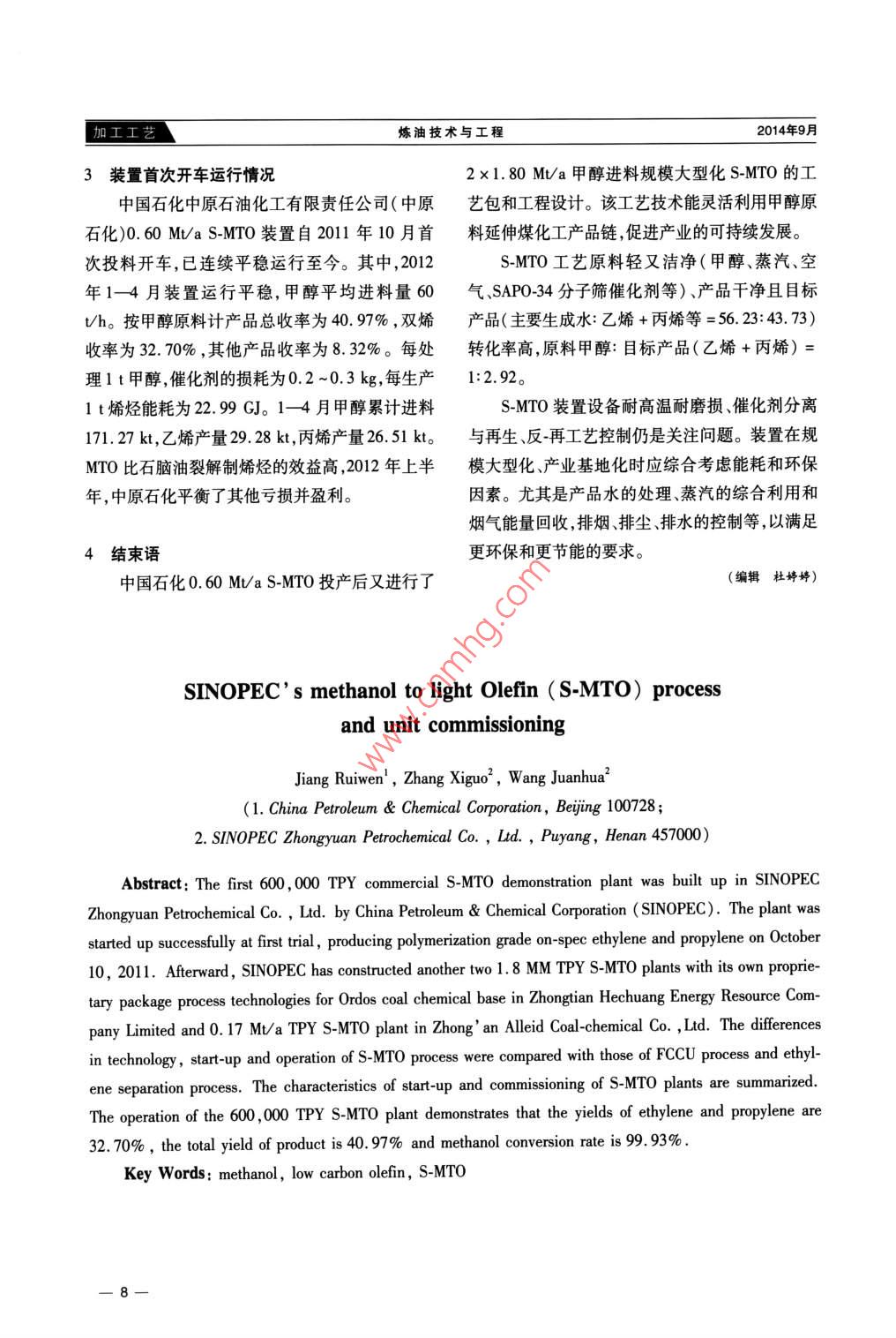 加工工藝煉油技術(shù)與工程PETROLEUM REFINERY ENGINEERING2014年第44卷第9期中國石化甲醇制低碳烯烴(S-MT0)工藝與開車特點姜瑞文' ,張西國”,王娟華2(1.中國石油化工集團公司,北京市100728;2.中國石化中原石油化工有限責任公司,河南省濮陽市457000)摘要:中國石油化工集團公司(中國石化)在中原石油化工有限責任公司新建首套0.6 Mu/a甲醇進料規(guī)模制低碳烯烴(S-MTO)工業(yè)示范裝置,于2011年10月10日產(chǎn)出合格聚合級乙烯和丙烯,實現(xiàn)了安全、環(huán)保、- -次投料開車成功之后,中國石化相繼在鄂爾多斯中天合創(chuàng)能源有限公司煤化工基地用自主知識產(chǎn)權(quán)的全套專利技術(shù)建設(shè)2套1. 80MiVa甲醇進料S-MTO裝置,在安徽淮南中安聯(lián)合煤化工有限責任公司建設(shè)1套0. 17 MVa S-MTO裝置。通過對比S-MTO與流化催化裂化和乙烯深冷分離工藝在技術(shù)、開車運營方面的異同,總結(jié)了S-MTO裝置的工藝與開車特點。0.6MVa甲醇進料S-MTO裝置運行結(jié)果表明,對甲醇原料計雙烯收率32.70% ,產(chǎn)品總收率為40.97% ,甲醇轉(zhuǎn)化率為99.93%。關(guān)鍵詞:甲醇低碳烯烴 S-MTO煤制烯烴( CTO)是現(xiàn)代煤化工中先用煤制甲S-MTO裝置反-再系統(tǒng)(甲醇轉(zhuǎn)化部分)與醇.再由甲醇制烯烴(MTO)的新工藝。MTO是FCC反-再系統(tǒng)相似,運用了煉油FCC技術(shù)里反應-CTO工藝中間的關(guān)鍵環(huán)節(jié),是連接C,化工與基再生動力學原理;反應和再生部分配置了完善的流礎(chǔ)有機原料的橋梁?;?、氣固(液固)分離設(shè)備和儀表控制系統(tǒng)等。該系統(tǒng)較好地解決了催化劑在兩器和管路中的循1 S-MTO工藝特點環(huán),循環(huán)過程所形成的流型以及所帶來的設(shè)備磨損中國石油化工集團公司(中國石化)S-MTO問題,還有流動中的脫氣、充氣、松動和輸送的問裝置擁有煉油和化工工藝的核心技術(shù),如與FCC題。同時增加了反應產(chǎn)品氣的急冷系統(tǒng)、急冷塔底相近的反應-再生工藝、前脫乙烷深冷分離工藝及渣漿過濾和廢水處理等環(huán)保設(shè)施。采用高選擇性SAP0-34分子篩催化劑技術(shù)等。和穩(wěn)定性的SAPO-34分子篩催化劑。MTO與FCC1.1 S-MTO 反-再系統(tǒng)反再系統(tǒng)工藝技術(shù)過程對比見圖1。[流化催化裂化FCC ]甲醇制低碳烯烴一-MTO ]待生催化劑[煙氣產(chǎn)品待生催化劑]反應(油氣)進料 連續(xù)供氧循環(huán)再生分反應(氣相)進料連續(xù) 供氧循環(huán)再生分積炭生成消耗熱量離 積炭生成產(chǎn)生熱量積炭生成產(chǎn)生熱量離積炭 生成產(chǎn)生熱量↑D個原料]再生催化劑空氣]原料[空氣]圖1 MTO 與FCC反再系統(tǒng)工藝技術(shù)過程對比Fig.1 Technologies compoarison of reaction-regeneration systems of MTO and FCC1.2 S-MTO 產(chǎn)品分離系統(tǒng)S-MTO裝置產(chǎn)品分離系統(tǒng)(輕烯烴回收部收稿日期:2014 -05 - 16;修改稿收到日期:2014 -07 -20。分)是前脫乙烷深冷分離工藝技術(shù)流程。主要用作者簡介:姜瑞文,畢業(yè)于山東工業(yè)大學化工設(shè)備與機械專精餾原理逐一-分離獲得純度符合要求的乙烯、丙業(yè),從事煉油、化I、煤化工裝置的生產(chǎn)、建設(shè)與技術(shù)服務(wù)、設(shè)烯產(chǎn)品和- -些副產(chǎn)品,同時設(shè)置了加氫、干燥、萃備管理、研發(fā)與制造工作。聯(lián)系電話: 010 - 59968366,E-mail :jiangrw@ sinopec. com。- 6-加工工藝煉油技術(shù)與工程.2014年9月3裝置 首次開車運行情況2x1.80Mt/a甲醇進料規(guī)模大型化S-MTO的工中國石化中原石油化工有限責任公司(中原藝包和工程設(shè)計。該工藝技術(shù)能靈活利用甲醇原石化)0.60 M/a S-MTO裝置自2011年10月首料延伸煤化工產(chǎn)品鏈 ,促進產(chǎn)業(yè)的可持續(xù)發(fā)展。次投料開車,已連續(xù)平穩(wěn)運行至今。其中,2012S-MTO工藝原料輕又潔凈(甲醇、蒸汽、空年1- 4月裝置運行平穩(wěn),甲醇平均進料量60氣 SAP0-34分子篩催化劑等)、產(chǎn)品干凈且目標Vh。按甲醇原料計產(chǎn)品總收率為40. 97% ,雙烯產(chǎn)品(主要生成水:乙烯+丙烯等= 56.23:43.73)收率為32. 70% ,其他產(chǎn)品收率為8. 32%。每處轉(zhuǎn)化率高,原料甲醇:目標產(chǎn)品(乙烯+丙烯) =理1 t甲醇,催化劑的損耗為0.2 ~0.3 kg, 每生產(chǎn)1:2. 92。1t烯烴能耗為22.99GJ。1-4月甲醇累計進料S-MTO裝置設(shè)備耐高溫耐磨損、催化劑分離171. 27 kt,乙烯產(chǎn)量29. 28 kt,丙烯產(chǎn)量26.51 kt。與再生、反-再工藝控制仍是關(guān)注問題。裝置在規(guī)MTO比石腦油裂解制烯烴的效益高,2012年上半模大型化產(chǎn)業(yè)基地化時應綜合考慮能耗和環(huán)保年,中原石化平衡了其他虧損并盈利。因素。尤其是產(chǎn)品水的處理、蒸汽的綜合利用和煙氣能量回收,排煙排塵、排水的控制等,以滿足4結(jié)束語更環(huán)保和更節(jié)能的要求。中國石化0.60 Mt/a S-MTO投產(chǎn)后又進行了(編輯杜婷婷)SINOPEC' s methanol to light Olefin ( S-MTO) processand unit commissioningJiang Ruiwen' , Zhang Xiguo2 , Wang Juanhua'(1. China Petroleum & Chemical Corporation, Beijing 100728;2. SINOPEC Zhongyuan Petrochemical Co. , Ltd. ,Puyang, Henan 457000)Abstract: The first 600 , 000 TPY commercial S-MTO demonstration plant was built uψ in SINOPECZhongyuan Ptrochemical Co. , Ltd. by China Petroleum & Chemical Corporation (SINOPEC). The plant wasstarted up scssfully at first trial , producing polymerization grade on-spec ethylene and prpplene on 