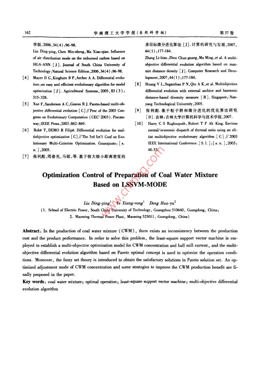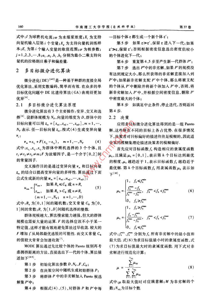 華南理工大學學報(自然科學版)第37卷第2期Journal of South China University of TechnologyVol 37 No. 209年2月Natural Science Editionebruary 2009文章縮號:1000565X(2009)02.0158-05基于 LSSVM-MODE的水煤漿生產(chǎn)優(yōu)化控制劉定平葉向榮鄧華裕2(1華南理工大學電力學院,廣東廣州510640;2茂名熱電廠,廣東茂名525011)摘要:水煤漿(CWM)制造過程中,生產(chǎn)成本的降低和水煤漿性能的提高之間存在著矛盾.文中利用最小二乘支持向量機( LSSVM)對球磨機電流和水煤漿濃度進行多目標建模,并采用基于 Pareto最優(yōu)概念的多目標微分進化(MODE)算法對運行工況進行尋優(yōu),然后裉據(jù)模糊集理論在 Pareto解集中求得滿意解,獲得了水煤漿濃度的優(yōu)化調(diào)整方式和提高水煤漿生產(chǎn)效益的策略關鍵詞:水煤漿;優(yōu)化運行;最小二乘支持向量機;多目標微分進化算法中圖分類號:TK323文獻標識碼:A水煤漿是一種煤基流體燃料.它是由約加0%的理模型來描述基于支持向量機的模型屬于黑箱模煤粉、30%的水和少量化學添加劑組成的混合體.型,其模型輸人輸出之間的非線性函數(shù)關系由支持目前國內(nèi)外對水煤漿性能研究比較多,且主要向量機實現(xiàn)因此適合用支持向量機來建立制漿優(yōu)研究分散劑、煤種改性和磁化等因素對水煤漿性能化模型影響.在水煤漿制造過程中,存在著降低制漿成本1.1最小二乘支持向量機和提高水煤漿性能兩者之間的矛盾,實踐中往往通設訓練樣本集為D={(x,y)|i=1,2,…,l},過試驗來摸索解決方法由于現(xiàn)場試驗耗時耗力且其中:x∈R,y,∈R;x為輸入數(shù)據(jù);y為輸出數(shù)據(jù)存在滯后性和偏差使運行經(jīng)常偏離優(yōu)化工況.在權w空間(原始空間)中的優(yōu)化問題可以描述為因此,需建立制漿成本和水煤漿性能優(yōu)化模型,用于1minJ(w,e)=ww+y∑e指導水煤漿生產(chǎn)文中根據(jù)水煤漿生產(chǎn)工藝將制漿成本和水煤漿結束條件為性能優(yōu)化問題轉化為降低電耗成本和提高水煤漿濃y,=w(x)+b+e,, i=1, 2, ". I度的多目標優(yōu)化問題提出基于最小二乘支持向量機相應的拉格朗H函數(shù)為(LsM)的球磨機電耗和水煤漿濃度多目標優(yōu)化模L=J-∑a1|wq(x)+b+e-y型;并利用多目標微分進化算法(MODE)實現(xiàn)給煤求解的優(yōu)化問題轉化為求解線性方程:量、分散劑量等運行參數(shù)的尋優(yōu);再利用模糊集理論1進行決策選出滿意解,用于指導制漿優(yōu)化運行(1)1:1多目標優(yōu)化 LSSVM模型式中:y=(y1,…,y);1.=(1,…,1);a=(a1水煤漿制造過程是一個復雜的物理過程,它是a1);Q4=p(x)p(x1)=K(x,x1),為1,矩陣一個多輸入多輸出系統(tǒng).影響球磨機電耗和水煤漿最小二乘支持向量機函數(shù)估計為濃度的參數(shù)很多,而且這些參數(shù)之間具有強耦合、非y(x)=∑aK(x,x)+(2)線性等特征對于這些復雜的過程,難以用簡單的機收稿日期:2007-10-29作者簡介:劉定平(1965-)男,副教授博士生,主要從事燃燒優(yōu)化與控制研究Eml;liudingping(@I26.com第2期劉定平等:基于 L SSVM-MODE的水煤漿生產(chǎn)優(yōu)化控制159式中:a1,b可由式(1)求解出1.3LssⅤM訓練結果及分析核函數(shù)有不同的形式,如:多項式核、多層感知制漿優(yōu)化模型的輸入和輸出層分別有8個輸入高斯(MP)核、徑向量(RBF)核等.在研究中取節(jié)點和2個輸出節(jié)點選取65組樣本數(shù)據(jù),其中60RBF核函數(shù)如下組作為訓練樣本,5組作為驗證樣本,以驗證模型的K(x, x,)=exp[ -(lx-x, /20]正確性對數(shù)據(jù)進行歸一處理到[0,1]1,正規(guī)化參最小二乘支持向量機的函數(shù)估計精度和收斂速數(shù)和徑向基核參數(shù)分別為λ=55,=18.支持向量度受正規(guī)化參數(shù)和徑向基核參數(shù)a的影響2.機訓練結果表明訓練樣本和驗證樣本均勻分布在基1.2制漿優(yōu)化模型的建立準線附近模型的估計值很好地逼近于非線性系統(tǒng)文中以某水煤漿廠40υh水煤漿生產(chǎn)線為對象輸出的實際值,由此建立了制漿優(yōu)化支持向量機模開展研究原煤由破碎機輸送到球磨機進行研磨,再型.其驗證樣本計算值與實際值比較如表1所示由二臺輸漿泵AB送往儲漿罐分散劑為茂名分散表1最小二乘支持向量機模型驗證樣本計算值與實際值劑煤種質(zhì)量比為m山東媒:m神華煤=2:1.的比較在制漿時,球磨機內(nèi)部磨介鋼球匹配可認為基 Table 1 Comparison of calculated and experimental validating本不變磨機電流在電耗成本中起著主要影響由于data in lssvm model磨機電壓恒定為6kⅤ,可以用磨機電流反映磨機電球磨機電流水煤漿濃度耗水煤漿濃度直接影響到水煤漿的燃燒性能,可將正實測預測相對實測預測相對其作為衡量水煤漿性能的主要參數(shù)因此制漿優(yōu)化值/A值/A誤差/%值/%值/%誤差/%模型目標值取磨機電流和水煤漿濃度l122.33121.820.4262.9363.240.49給煤量和給水流量的變化會導致球磨機電耗發(fā)122.63119.782.3162.3063.451.81生變化,從而使水煤漿濃度相應發(fā)生變化分散劑流122.63121.410.9963.9863.670.489364.171.94量對水煤漿濃度等性能也起著一定的影響;而水煤123.02123.410.32121.58121.790.1764.I63.500.97漿濃度又和球磨機電耗有著某種聯(lián)系,即分散劑流量對球磨機電耗起著間接影響破碎機電流反映破模型的泛化能力收斂速度和最優(yōu)性如下碎機出口煤量,所以與球磨機負荷相關,從而也與水(1)泛化能力訓練集樣本平均相對誤差為煤漿濃度相關輸漿泵頻率、電流與水煤漿產(ch