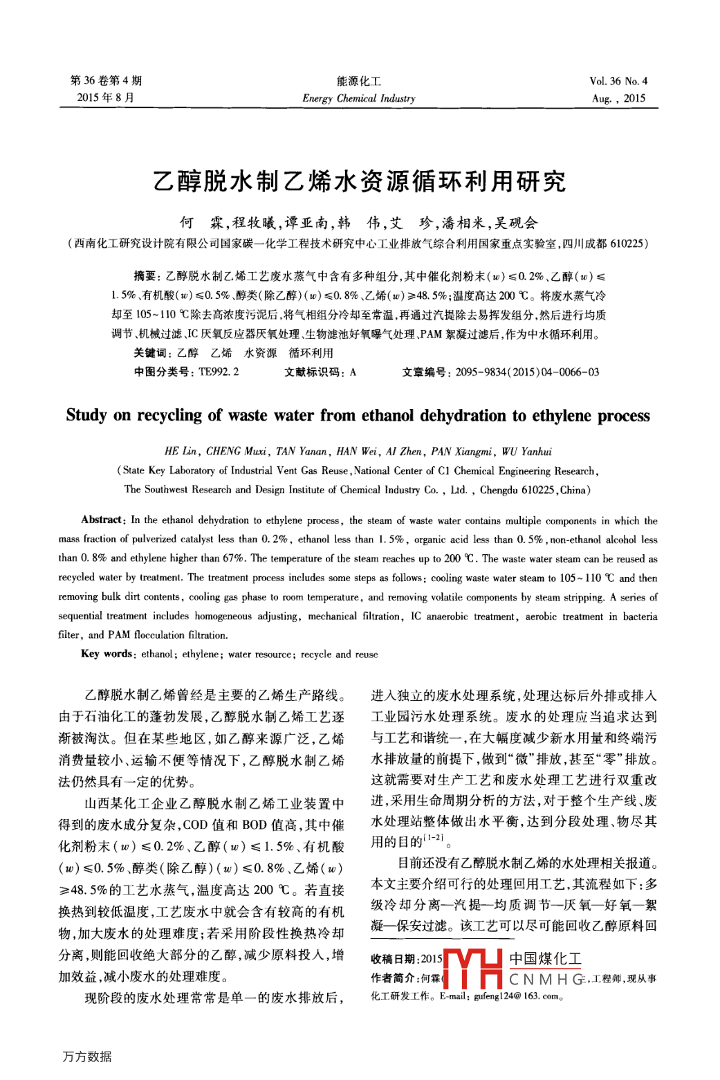 乙醇脫水制乙烯水資源循環(huán)利用研究