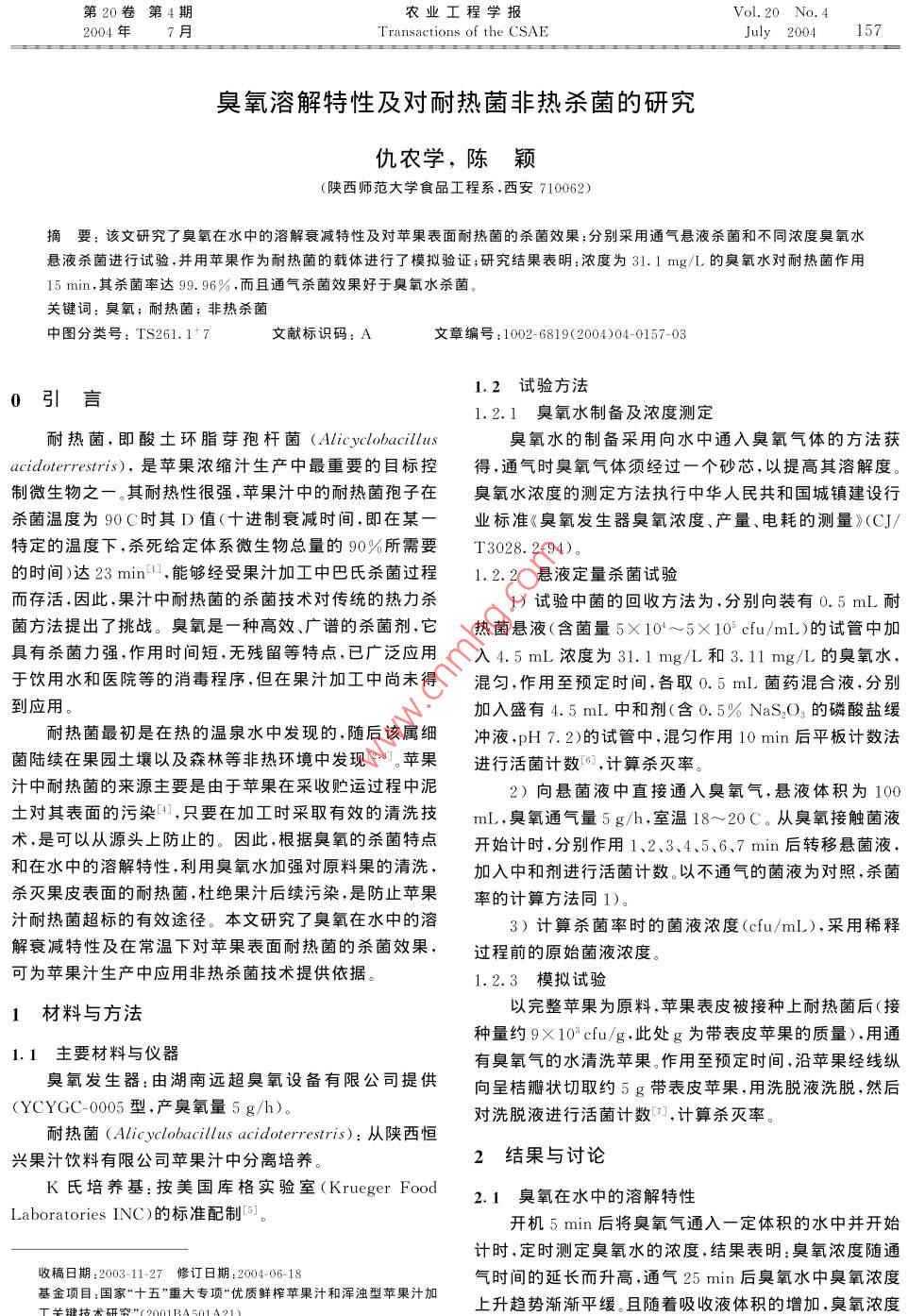 臭氧溶解特性及對耐熱菌非熱殺菌的研究