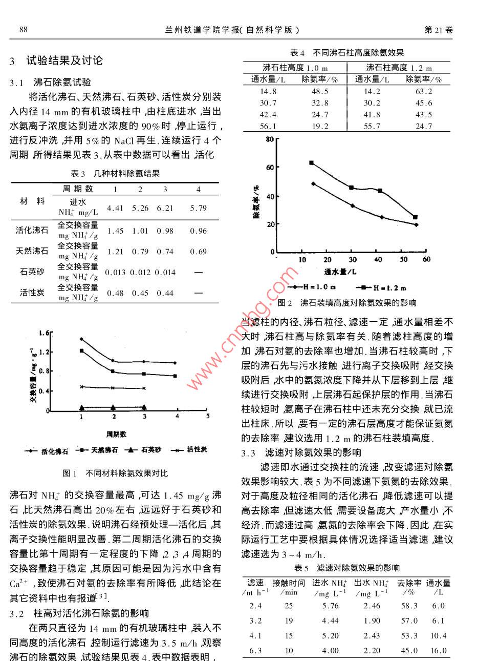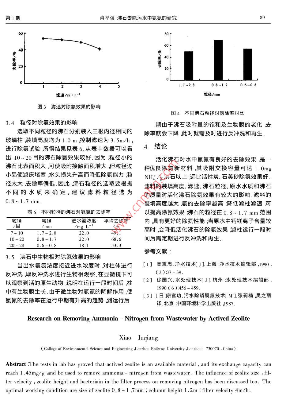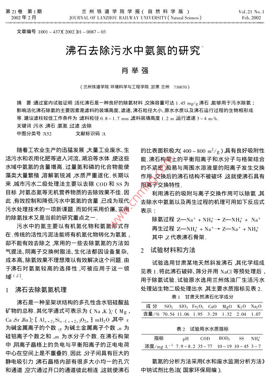 第21卷第1期蘭州鐵道學(xué)院學(xué)報(bào)(自然科學(xué)版)Vol.21 No.12002年2月JOURNAL OF LANZHOU RAILWAY UNIVERSITY ( Natural Sciences )Feb.2002文章編號(hào):1001 - 4373( 2002 )01- 0087- 03沸石去除污水中氨氮的研究'肖舉強(qiáng)(蘭州鐵道學(xué)院環(huán)境科學(xué)與工程學(xué)院,甘肅蘭州730070)摘要通過室內(nèi)試驗(yàn)證明活化沸石是一 種良好的除氨材料交換容量可達(dá)1.45 mg/g沸石能夠用于污水除氨;影響活化沸石除氨的主要因素是濾料的裝填高度、濾速沸石粒徑大小、原水水質(zhì)以及沸石運(yùn)行過程的生物相形成等.建議濾柱較佳工作條件為濾料粒徑0.8~ 1.7 mm濾料裝填高度1.2 m運(yùn)行濾速3~4 m/h.關(guān)鍵詞污水沸石氨氮過濾,去除中圖分類號(hào):X52文獻(xiàn)標(biāo)識(shí)碼:A隨著工農(nóng)業(yè)生產(chǎn)的迅猛發(fā)展大量工業(yè)廢水、生的比表面積極大( 400 ~ 800 m2/g)具有良好吸附性活污水和農(nóng)用化肥等進(jìn)入河流、湖泊等水體,使這些能.沸石構(gòu)架上的平衡陽(yáng)離子和水分子與格架結(jié)合水域中氨氮的含量增高.過量氮和磷的化合物能使的不緊密極易與周圍水溶液里的陽(yáng)離子發(fā)生交換藻類大量繁殖溶解氧銳減,水質(zhì)嚴(yán)重退化.長(zhǎng)期以作用交換后的沸石結(jié)構(gòu)不被破壞這就使沸石具有來城市污水二級(jí)處理法主要以去除COD和ss為陽(yáng)離子交換特性.目標(biāo)對(duì)氨態(tài)氮等無(wú)機(jī)營(yíng)養(yǎng)物質(zhì)的去除效果不佳.因利用沸石的吸附與離子交換作用可以除氨其此,有效控制和降低污水中氨氮的含量,已成為現(xiàn)代去除水中氨氮以及再生過程的機(jī)理可用如下反應(yīng)式污水處理技術(shù)的一項(xiàng)新課題.而如何采用價(jià)廉、實(shí)用表示:的除氨技術(shù)又是當(dāng)前的研究重點(diǎn)之-.除氨過程Z- -Na+ +NHt→Z- -NH2 + Na+污水中的氮主要以有機(jī)氮化物和氨氮形式存再生過程Z- -NH2 +Na+→Z- -Na+ + NHt在.傳統(tǒng)的活性污泥法能將有機(jī)氮化物轉(zhuǎn)化為氨氮,其中z代表沸石骨架.卻不能有效去除之,常用的一些去除氨氮的方法如氣提法、陰離子交換樹脂法、生化法都因設(shè)備復(fù)雜、2試驗(yàn)材料和方法成本高、除氨效果不理想難以有效解決這個(gè)問題.由試驗(yàn)選用甘肅某地天然斜發(fā)沸石其化學(xué)組成于沸石對(duì)氨氮較高的選擇性,可被應(yīng)用于這一領(lǐng)見表1.將此沸石破碎、篩分并用NaCl等預(yù)處理后,域12].用于除氨試驗(yàn).試驗(yàn)原水選用蘭州煉油廠生活污水1沸石 去除氨氮機(jī)理處理站生物二級(jí)處理出水其主要水質(zhì)指標(biāo)見表2.表1甘肅天然沸石化學(xué)成分沸石是一種呈架狀結(jié)構(gòu)的多孔性含水鋁硅酸鹽成分Si02 AlO3 Fe2O3 CaO MgO K2O Na20礦物的總稱其化學(xué)通式可表示為(NaK):(Mg,含量105.4511.061953.291.32.041.07Ca Sr Ba);[ Alx+2,Sin-(x+2,)O2n] mH2O其中x為堿金屬離子的個(gè)數(shù)oy 為堿土金屬離子個(gè)數(shù)n為表2試驗(yàn)用水水質(zhì)指標(biāo)硅鋁離子個(gè)數(shù)之和,m為水分子個(gè)數(shù).在沸石構(gòu)架指標(biāo)pHCODBODsss NH中陰離子晶格上的負(fù)電與平衡陽(yáng)離子的正電電荷濃度/mg L-1 7.9-8.2 35~77 10~19 10-45 3~7中心在空間上是不重疊的.因此分子間具有巨大的靜電吸引力沸石晶格內(nèi)部有很多大小均一的孔穴氨氮的分析方法采用《水和廢水監(jiān)測(cè)分析方法》和通道空穴通過開口的通道彼此相連這就使沸石中鈉試劑比色法(國(guó)家環(huán)保局編).88蘭州鐵道學(xué)院學(xué)報(bào)(自然科學(xué)版)第21卷表4不同沸石柱高度除氨效果3試驗(yàn)結(jié)果及討論沸石柱高度1.0 m沸石柱高度1.2 m3.1沸石除氨試驗(yàn)通水量/L除氨率/%14. 848.514.263.2將活化沸石、天然沸石、石英砂、活性炭分別裝30.732.830.245.6入內(nèi)徑14 mm的有機(jī)玻璃柱中,由柱底進(jìn)水,當(dāng)出42.424.741.843.5 !水氨離子濃度達(dá)到進(jìn)水濃度的90%時(shí),停止運(yùn)行,56.119.255.7進(jìn)行反沖洗,并用5%的NaCl再生.連續(xù)運(yùn)行4個(gè)80周期所得結(jié)果見表3.從表中數(shù)據(jù)可以看出活化表3幾種材料除 氨結(jié)果周期數(shù)2440材料進(jìn)水4.41 5.26 6.215.79NHt mg/L全交換容量1.45 1.01 0.98 0.96mg NH4 /g天然沸石1.21 0.79 0.740.69mg NHt /g10203050 60石英砂0.013 0.012 0.014一通水量/兒mg NH:/g活性炭0.48 0.45 0.44→H=1.0m告Hut.2mmg NHt/g _圖2沸石裝填高度對(duì)除氨效果的影響當(dāng)濾柱的內(nèi)徑、沸石粒徑、濾速一定通水量相差不1.6.大時(shí)沸石柱高與除氨率有關(guān).隨著濾柱高度的增加沸石對(duì)氨的去除率也增加.當(dāng)沸石柱較高時(shí),下層的沸石先與污水接觸進(jìn)行離子交換吸附經(jīng)交換吸附后水中的氨氮濃度下降并從下層移到上層繼續(xù)進(jìn)行交換吸附,上層沸石起保護(hù)層的作用.當(dāng)沸石柱較短時(shí)氨離子在沸石柱中還未充分交換就已流出柱床.所以要有一定的沸石層高度才能保證氨氮周期敷的去除率建議選用1.2 m的沸石柱裝填高度.+活化拂石七天然拂石士石英砂←括性炭3.3濾速對(duì)除氨效果的影響濾速即水通過交換柱的流速,改變?yōu)V速對(duì)除氨圖1不同材料除 氨效果對(duì)比效果影響較大.表5為不同濾速下氨氮的去除效果.沸石對(duì)NH2的交換容量最高,可達(dá)1.45 mg/g沸對(duì)于高度及粒徑相