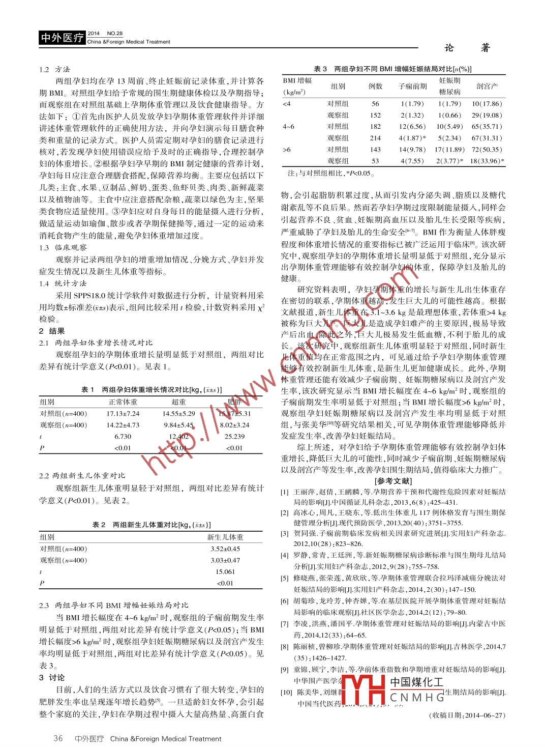 1中外醫(yī)療China&Foreign Medical Treatme論著孕期體重管理對孕婦體重及圍生期結局的影響分析田秀琴中國南車集團南京浦鎮(zhèn)車輛廠醫(yī)院婦產科,江蘇南京210031[摘要]目的研究分析孕期體重管理對孕婦體重及圍生期結局的影響。方法選取2009年10月-2013年10月在該院進行建冊、產檢并住院分娩的單胎、身體健康且無嚴重并發(fā)癥的800例孕產婦作為研究對象,將所有孕婦在知情同意情況下分為對照組和觀察組各400例,對照組孕婦給予常規(guī)的圍生期健康檢查和孕期指導,而觀察組孕婦在對照組基礎上給予孕期體重管理以及飲食健康指導。觀察兩組孕婦孕期的體重增加情況、新生兒體重情況、不同BMI增幅孕婦的分娩方式以及孕期并發(fā)癥發(fā)生情況。結果觀察組孕婦的孕期體重增長量明顯低于對照組,兩組對比差異有統(tǒng)計學意義(P<0.05);觀察組新生兒體重明顯輕于對照組,兩組對比差異有統(tǒng)計學意義(P<0.05);當BM增長幅度在4-6kgm2時,觀察組的子癇前期發(fā)生率明顯低于對照組,兩組對比差異有統(tǒng)計學意義(P<0.05);當BMI增長幅度>6kgm2時,觀察組孕婦妊娠期糖尿病以及剖宮產發(fā)生率均明顯低于對照組,兩組對比差異有統(tǒng)計學意義(P<0.05)。結論對孕婦給予孕期體重管理能夠有效控制孕婦體重增長,降低巨大兒的可能性,減少子癇前期、妊娠期糖尿病以及剖宮產等發(fā)生率,同時改善孕婦圍生期結局,值得臨床大力推廣[關鍵詞]孕期體重管理;孕婦;圍生期結局[中圖分類號]R715[文獻標識碼]A[文章編號]1674-0742(2014)10(a)-0035-02Analysis of the Effect of Gestational Weight Management on MaternalWeight and Perinatal OutcomeTIAN XiuginDepartment of Obstetrics and Gynecology, Chinese CSR Nanjing Puzhen Vehicle Plant Hospital, Nanjing, Jiangsu Provin210031. China[Abstract] Objective To study and analyze the effect of gestational weight management on maternal weight and perinatal outcomeMethods 800 healthy, uniparous pregnant women underwent registration, antenatal care and delivery without severe complicationsin our hospital from October 2009 to October 2013 were selected as the subjects and divided into the control group and the obser-ation group with 400 cases in each in the context of informed consent. The control group were given the conventional perinatalphysical examination and guidance, and the observation group were given the gestational weight management and healthy dietguide based on the conventional perinatal physical examination and guidance. The weight gain during pregnancy, neonatal weight,the delivery mode of the pregnant women with different BMI growth and the incidence of complwere compared between the two groups of pregnant women. Results The amount of weight gain during pregnancy of the pregnawomen in the observation group was significantly lower than that in the control group, the difference between the two groups wasstatistically significant (P<0. 05); the neonatal weight in the observation group was significantly lighter than that in the controlgroup, the difference between the two groups was statistically significant(P<0.05); when the BMI growth was in the range of 4-6 kg/m2, the incidence of preeclampsia in the observation group was significantly lower than that in the control group, the difference be-tween the two groups was statistically significant (P<0.05); when the bMi growth rate was greater than 6 kg/m2, the incidence ofgestational diabetes mellitus and cesarean section in the observation group was significantly lower than that in the control group,the difference between the two groups was statistically significant (P<0.05). Conclusion For pregnant women, gestational weightmanagement can effectively control the weight increase of them, reduce the possibility of macrosomia, decrease the incidence ofpreeclampsia, gestational diabetes mellitus and cesarean section as well as improve the perinatal outcome, therefore it is worthy ofI Key words] Gestational weight management; Pregnant women: Perinatal outcome隨著社會經濟的發(fā)展和人們生活水平的提高,人們的思想如下也有人很大轉變,大多數(shù)人認為孕期攝入的營養(yǎng)應越多越好。1資料與方法孕期攝入大量高熱量、高脂肪食物,營養(yǎng)不均衡,運動少等使孕1.1一般資料婦體內脂肪聚集,同時使攝人熱量以及消耗失去平衡,孕婦孕期選取在該院進行建冊、產檢并住院分娩的單胎、身體健康且體重明顯增加,從而導致巨大兒以及剖宮產發(fā)生率大幅度增長P3。無嚴重并發(fā)癥的800例孕產婦作為研究對象,將所有孕婦在知目前,孕婦的孕期保健引起了產科高度重視,孕期的體重控制不情同意情況下分為對照組和觀察組各40例。對照組孕婦年齡僅能夠大大降低巨大兒以及剖宮產發(fā)生率,還能保障新生兒的為21-35歲,平均年齡為(285±31)歲,建冊時BMI為17,35健康。該次研究選取200年10月—2013年10月間在該院住2947kgm,平均BM為(25327)kgmn;觀察組孕婦為20院、分娩的孕婦800例進行研究,旨在進一步探討孕期體重管37歲,平均年齡為(293±3.3)歲,建冊時BMI為1714-2943k理對孕婦體重和圍生期結局的影響,取得了顯著的效果。報道均BMI為(21H控回LMB標準:正常體重BMI為184-2中國煤化工9kg/m2,肥胖作者簡介田秀琴(1967.1-),女,江蘇揚州人,本科,副主任醫(yī)師,研究BMI為>28.0kg/hCNMHG為單胎妊娠,無妊方向:婦產科娠合并癥。排除標準:有剖宮產指征的初產婦。Chna& Foreign Medical Treatment中外醫(yī)中外醫(yī)療aM,wrmm論著2方法表3兩組孕婦不同BM增幅妊娠結局對比v(兩組孕婦均在孕13周前、終止妊娠前記錄體重,并計算各BMI增幅組別例數(shù)子癇前期宮產