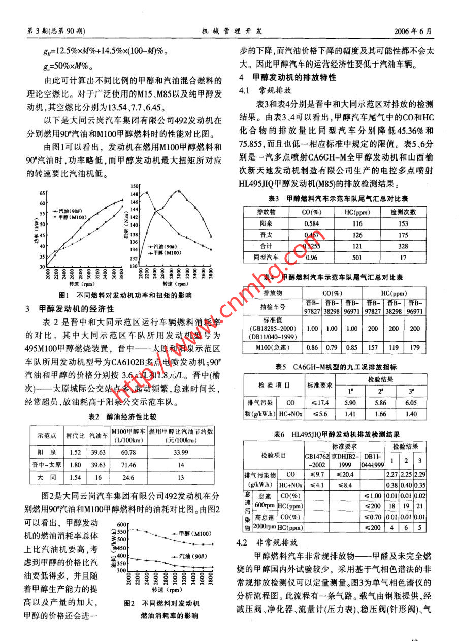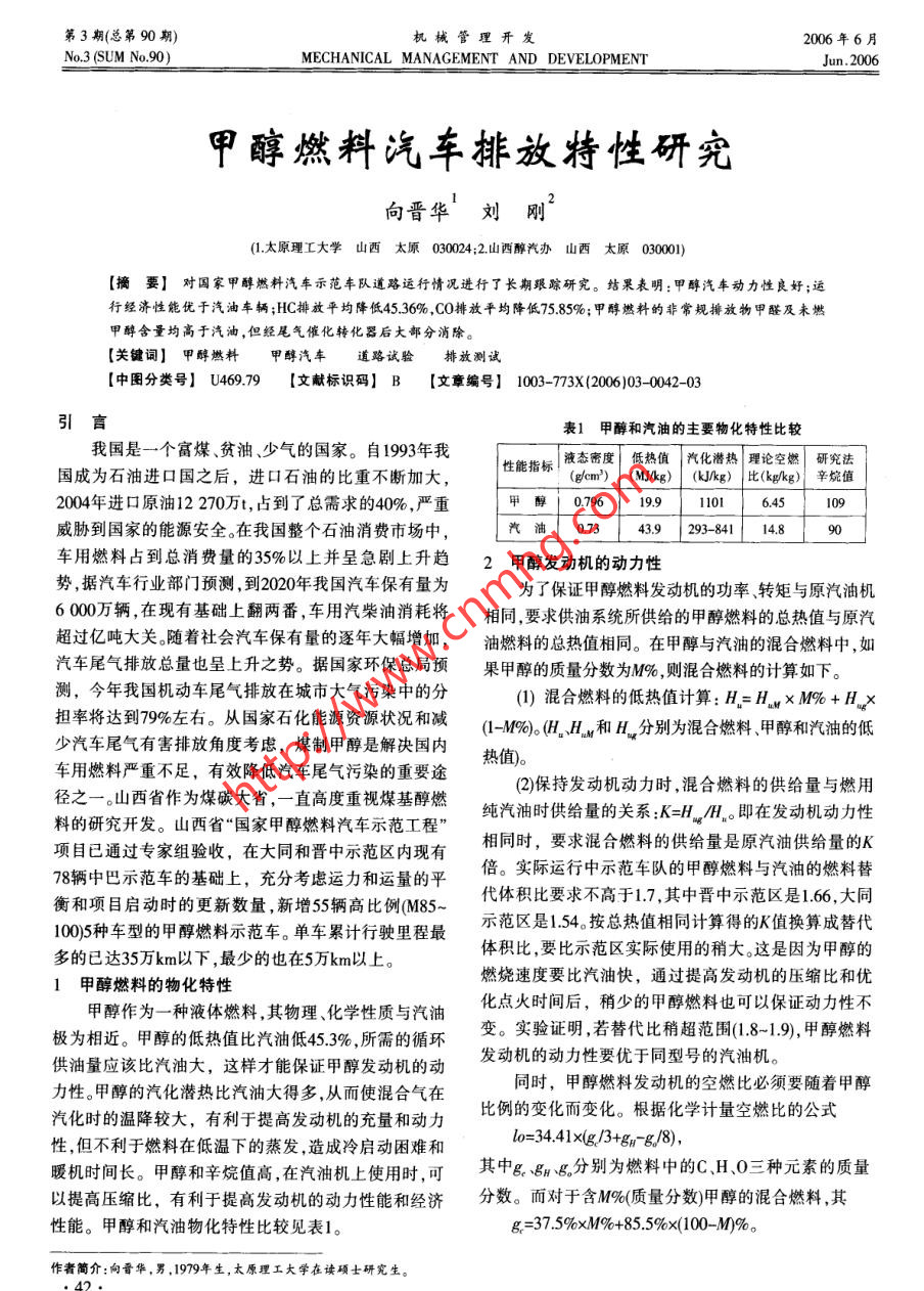 第3期(總第90期) .機械管理開發(fā)2006年6月No.3 (SUM No.90)MECHANICAL MANAGEMENT AND DEVELOPMENTJun.2006甲醇燃料汽車排放特性研究向晉華’劉剛(.太原理工大學(xué)山西太原030024:2山西醇汽辦 西太原000摘要]對國家甲醇燃料汽車示范豐隊逍路運行情況進行了長期跟蹤研究。結(jié)果表明:甲醇汽車動力性良好;追行經(jīng)濟性能優(yōu)于汽油車輛;HC排放平均降低45.6%,C0排放平均降低75.85%;甲醇燃料的非常規(guī)捶放物甲醛及未燃甲醇含量均高于汽油,但經(jīng)尾氣催化轉(zhuǎn)化器后大部分消除。(關(guān)鍵詞]甲醇燃料甲醇汽車道路試驗排放測試[中圈分類號] U469.79[文獻標(biāo)識碼] B .[文章編號] 103-773X(2006)03-0042-03引言表1甲醇和汽油 的主要物化特性比較我國是一個富煤、貧油、少氣的國家。自1993年我|性能指標(biāo)液態(tài)密度 低熱值汽化潛熱理論空燃 研究法國成為石油進口國之后,進口石油的比重不斷加大,(g/em)| (MJAkg)| (Jkg) 比(kgkg) 辛燒值2004年進口原油12 270萬t,占到了總需求的40%,嚴重0.79619.911016.45109威脅到國家的能源安全。在我國整個石油消費市場中,汽油0.7343.9| 293-84114.89車用燃料占到總消費量的35%以上并呈急劇上升趨2甲醇 發(fā)動機的動力性勢,據(jù)汽車行業(yè)部門預(yù)測,到2020年我國汽車保有量為為了保證甲醇燃料發(fā)動機的功率、轉(zhuǎn)矩與原汽油機6000萬輛,在現(xiàn)有基礎(chǔ)上翻兩番,車用汽柴油消耗將相同,要求供油系統(tǒng)所供給的甲醇燃料的總熱值與原汽超過億噸大關(guān)。隨著社會汽車保有量的逐年大幅增加,油燃料的總熱值相同。在甲醇與汽油的混合燃料中,如汽車尾氣排放總量也呈.上升之勢。據(jù)國家環(huán)保總局預(yù)果甲醇的質(zhì)量分數(shù)為M% ,則混合燃料的計算如下。測,今年我國機動車尾氣排放在城市大氣污染中的分(1)混合燃料的低熱值計算: H.=HuxM%+H_x擔(dān)率將達到79%左右。從國家石化能源資源狀況和減(-M%)(H. H。和H_分別為混合燃料、甲醇和汽油的低少汽車尾氣有害排放角度考慮,煤制甲醇是解決國內(nèi)熱值)。車用燃料嚴重不足,有效降低汽車尾氣污染的重要途(2)保持發(fā)動機動力時,混合燃料的供給量與燃用徑之一。山西省作為煤碳大省,一直高度重視煤基醇燃純汽油時供給量的關(guān)系:K=H_ ,AH。 即在發(fā)動機動力性料的研究開發(fā)。山西省“國家甲醇燃料汽車示范工程"相同時,要求混合燃料的供給量是原汽油供給量的K項目已通過專家組驗收,在大同和晉中示范區(qū)內(nèi)現(xiàn)有倍。實際運行中示范車隊的甲醇燃料與汽油的燃料替78輛中巴示范車的基礎(chǔ)上,充分考慮運力和運量的平代體積比要求不高于1.7,其中晉中示范區(qū)是1.66,大同衡和項目啟動時的更新數(shù)量,新增55輛高比例(M85~示范區(qū)是1.54。按總熱值相同計算得的K值換算成替代100)5種車型的甲醇燃料示范車。單車累計行駛里程最體積比,,要比示范區(qū)實際使用的稍大。這是因為甲醇的多的已達35萬km以下,最少的也在5萬km以上。燃燒速度要比汽油快,通過提高發(fā)動機的壓縮比和優(yōu)甲醇燃料的物化特性甲醇作為- -種液體燃料,其物理、化學(xué)性質(zhì)與汽油化點火時間后,稍少的甲醇燃料也可以保證動力性不極為相近。甲醇的低熱值比汽油低45.3%,所需的循環(huán)變。實驗證明,若替代比稍超范圍(1.8-1.9),甲醇燃料供油量應(yīng)該比汽油大,這樣才能保證甲醇發(fā)動機的動發(fā)動機的動力性要優(yōu)于同型號的汽油機。同時,甲醇燃料發(fā)動機的空燃比必須要隨著甲醇力性。甲醇的汽化潛熱比汽油大得多,從而使混合氣在比例的變化而變化。根據(jù)化學(xué)計量空燃比的公式汽化時的溫降較大,有利于提高發(fā)動機的充量和動力lo=34.41x