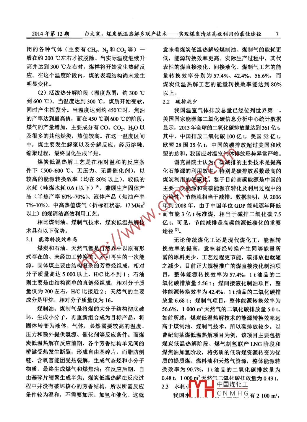 煤炭加工與綜合利用COAL PROCESSING & COMPREHENSIVE UTLIZATIONNo.12,2014煤炭低溫?zé)峤舛嗦?lián)產(chǎn)技術(shù)實現(xiàn)煤炭清潔高效利用的最佳途徑白太寬(北京龍成慧能科技有限公司,北京100026),摘要;對煤制油,煤制氣和煤炭低溫?zé)峤饧夹g(shù)進行技術(shù)經(jīng)濟比較,論證煤炭低溫?zé)峤饧?術(shù)是實現(xiàn)煤炭清潔高效利用的最佳途徑,分析了以煤炭低溫?zé)峤鉃辇堫^的多聯(lián)產(chǎn)技術(shù)的優(yōu)勢和前景。關(guān)鍵詞:煤;低溫干餾;聯(lián)產(chǎn)法;技術(shù)經(jīng)濟比較中圖分類號: F426文獻標(biāo)識碼: A文章編號: 1005-8397 (2014) 120006.051煤炭利用必須走清潔高效利用之 路綜上所述,清潔高效利用煤炭,是在煤炭仍長期以來,作為我國主體能源的煤炭,利用將長期是我國主體能源的現(xiàn)實背景下,在因煤炭方式單一粗放, 大多直接燃燒,引發(fā)一系列嚴(yán)重利用粗放造成嚴(yán)重環(huán)境污染和低階煤中油氣資源的生態(tài)和環(huán)境污染問題。統(tǒng)計數(shù)據(jù)顯示,2012年,浪費的嚴(yán)峻形勢下,保障能源供應(yīng)安全和推動能我國煤炭使用對環(huán)境PM2.5年均濃度的貢獻估算源結(jié)構(gòu)調(diào)整的迫切需要和現(xiàn)實選擇。值為56%。其中,約六成的PM2.5是由煤炭直2煤炭低溫?zé)峤饧夹g(shù)是煤炭清潔高效利用的最接燃燒產(chǎn)生的,約四成的PM2.5是伴隨煤炭使用佳途徑的重點行業(yè)排放的。其中,因煤消費產(chǎn)生的-次PM2.5、二氧化硫和氮氧化物排放量分別占中國煤炭清潔高效利用技術(shù)主要包括煤制油(煤污染物排放總量的62%、93%和70%".隨著煤的直接液化和間接液化技術(shù))、煤制氣和煤炭低炭消費量增長,我國二氧化碳等溫室氣體的排放溫?zé)峤饧夹g(shù)。量也顯著增加。據(jù)國際能源機構(gòu)統(tǒng)計,因消費煤煤直接液化是指將煤粉碎到-定粒度后,與炭排放的二氧化碳在能源活動中占比長期維持在供氫溶劑及催化劑等在一定溫度和壓力條件下,80%左右,2011 年達到83%,是中國能源活動:二直接作用,使煤加氫裂解形成小分子化合物的過氧化碳排放乃至溫室氣體排放的主體2。程。煤間接液化是將煤首先氣化成CO和H,通我國煤炭儲量豐富,其中57%都是低階煤。過水氣變換反應(yīng)轉(zhuǎn)化為一定H/C比的合成氣,再低階煤具有煤化程度低,化學(xué)結(jié)構(gòu)中側(cè)鏈較多,通過費托合成轉(zhuǎn)化為烴類化合物的工藝。煤制氣氫、氧含量較高,揮發(fā)分高等特點,含油率高達是以煤為原料,采用氣化、凈化和甲烷化技術(shù)制10%以上,特別是新疆哈密淖毛湖地區(qū)的低階煤取合成天然氣的工藝。含油率可達18%。當(dāng)前,低階煤大多未經(jīng)分質(zhì)利煤炭低溫?zé)峤馐敲涸诟艚^空氣或惰性氣氛的用便直接燃燒,造成其中所含高附加值的油氣資條件下持續(xù)加熱至一-定溫度后, 獲得半焦、煤焦源白白浪費,煤炭利用效率低下。油和煤氣的工藝”。低溫?zé)峤夤に囍饕▋蓚€階段: .收稿日期: 2014-11-18(1)干燥吃奶階邱湖底范里:室溫到約作者簡介:白太寬(1976- ), 男,河南西峽人,北京龍成300"C)。在中國煤化工,三某中含有的水慧能科技有限公司副總經(jīng)理,化工工程師。分就被蒸發(fā)HCNMHG兒小。u懷冶1內(nèi)處懷處吸附或者封2014年第12期白太寬:煤炭低溫?zé)峤舛嗦?lián)產(chǎn)技術(shù)-實現(xiàn)煤炭清潔高效利用的最佳途徑閉的各種氣體(主要有CH、N2 和CO2等)一意味著煤炭低溫?zé)峤廨^煤制油、煤制氣的能耗更般在約200 C左右才被脫除。當(dāng)實際溫度繼續(xù)升低,能源轉(zhuǎn)換效率更高。實際生產(chǎn)過程中,其代高并達到300 C左右時,煤樣將開始發(fā)生熱解反表性的煤直接液化、間接液化、煤制氣工藝的能應(yīng)。在這個溫度階段內(nèi),煤的表觀結(jié)構(gòu)尚未發(fā)生量轉(zhuǎn)換效率分別為57.4%、42.4%、 56.6%, 而明顯變化。煤炭低溫?zé)峤夤に嚨哪芰哭D(zhuǎn)換效率能達到80%(2)活潑熱分解階段(溫度范圍:約300 C以上。到600 C)。當(dāng)溫度達到300 C,煤質(zhì)開始變軟,2.2碳排放 少同時產(chǎn)生揮發(fā)分。當(dāng)溫度達到約450C時,焦油我國溫室氣體排放總量已經(jīng)位列世界第一。的產(chǎn)率達到最高值,而在450 C到600 C的階段,美國國家能源部二氧化碳信息分析中心統(tǒng)計數(shù)據(jù)煤氣的產(chǎn)量增加,主要成分有CO、CO2、H2O以顯示,2013 年全球的二氧化碳排放量達到361億t,及很多的其他烴類,熱值較高。在這一溫度區(qū)間其中,中國排放二氧化碳100億t,美國52億t,中,煤主要發(fā)生解聚以及分解反應(yīng),經(jīng)歷熔融、歐盟28國35億t,中國的碳排放超過美國和歐縮聚過程,最終固化生成半焦。盟的總和。我國應(yīng)對溫室氣體排放形勢異常嚴(yán)峻。煤炭低溫?zé)峤夤に囀窃谙鄬睾偷姆磻?yīng)條謝克昌院士認(rèn)為:碳減排的主要技術(shù)是提高件下(500-600 C、無壓力、無需催化劑),以化石能源的利用效率,特別是碳排放系數(shù)最高的較高的能源轉(zhuǎn)換效率(均在80%以上)、較低的煤炭利用的低碳化。鑒于目前高碳能源是中國的水耗(噸煤水耗0.6t以下) 4),兼顧生產(chǎn)固體產(chǎn)主要-次能源和高碳能源在轉(zhuǎn)化及利用過程中的品(半焦產(chǎn)率60%~70%)、液體產(chǎn)品(焦油產(chǎn)率污染性,節(jié)能就相當(dāng)于減排。數(shù)據(jù)表明,從20067%~10%)、