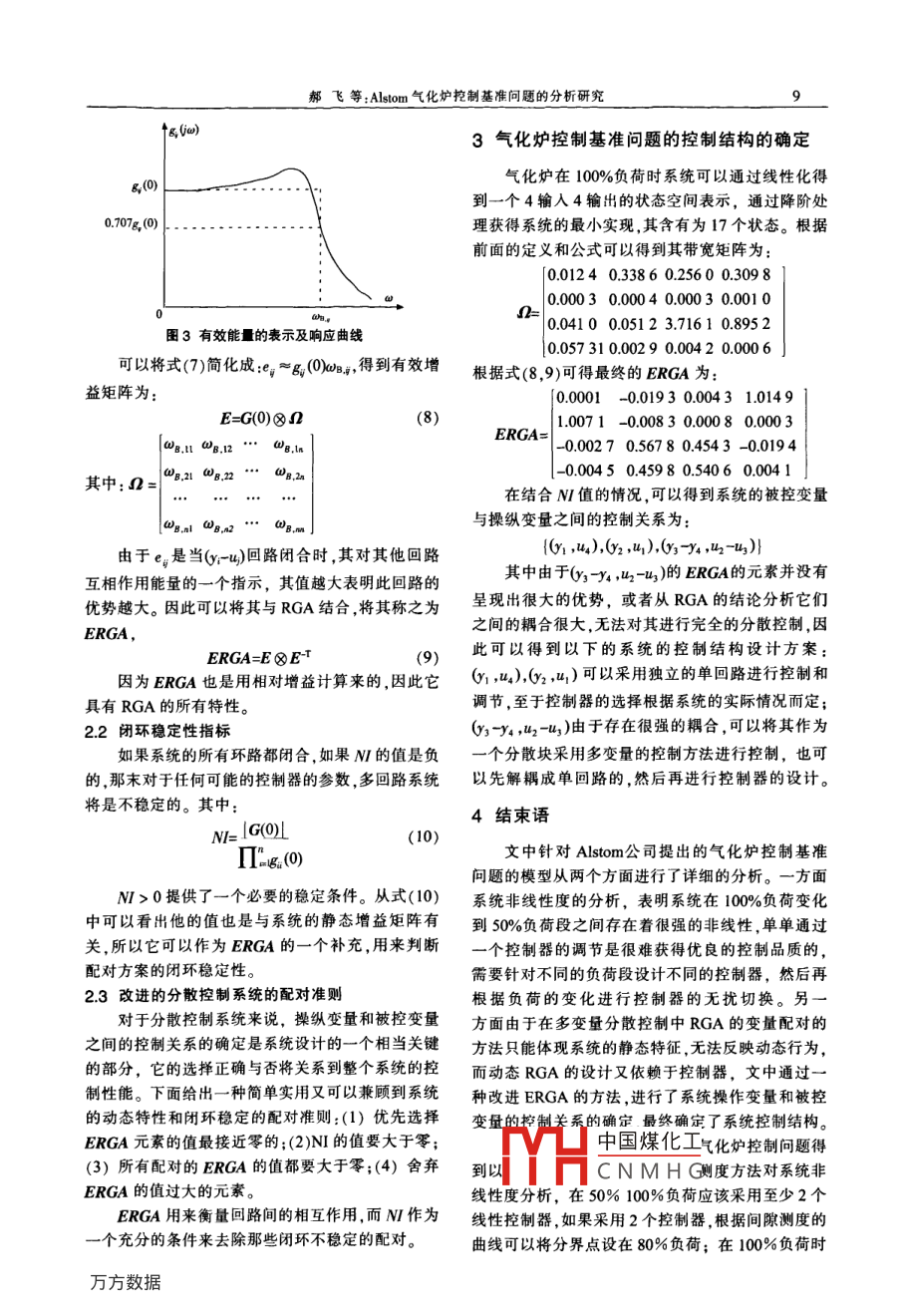 江蘇電機(jī)工程2010年11月Jiangsu Electrical Engineering第29卷第6期Alstom氣化爐控制基準(zhǔn)問(wèn)題的分析研究郝飛',劉吉臻2,譚文2(1.南瑞繼保電氣有限公司,江蘇南京210006;2.華北電力大學(xué),北京102206)摘要:氣化爐控制基準(zhǔn)問(wèn)題是對(duì)一類多變量 強(qiáng)耦合.非線性的系統(tǒng)模型進(jìn)行控制的問(wèn)題。針對(duì)這一模型首先采用間隙測(cè)度的方法對(duì)其進(jìn)行了的非線性度的分析,并進(jìn)行了線性化處理;結(jié)合RGA在分散控制中確定操縱變量和被控變量之間的配對(duì)關(guān)系的方法,引入了一種改進(jìn)的、實(shí)用的回路變量配對(duì)的準(zhǔn)則,考慮了系統(tǒng)的動(dòng)態(tài)行為。最后根據(jù)分析結(jié)果,給出了系統(tǒng)的控制結(jié)構(gòu)的設(shè)計(jì)方案。關(guān)鍵詞:廠級(jí)控制;非線性度;間隙測(cè)度;分散控制;相對(duì)增益陣列中圈分類號(hào):TP273;TK323文獻(xiàn)標(biāo)志碼:A文章編號(hào):1009-0665(2010)06 0007 -04Alstom公司提出氣化爐控制基準(zhǔn)問(wèn)題的模型分析。用于系統(tǒng)非線性分析的方法有很多,近年來(lái)非是一個(gè)復(fù)雜的過(guò)程控制模型,是一個(gè)具有非線性和線性的量化問(wèn)題受到了人們的重視,也出現(xiàn)了幾種.強(qiáng)耦合的多變量系統(tǒng),具有5個(gè)控制輸人量和4個(gè)方法:穩(wěn)態(tài)圖方法、泛函無(wú)限級(jí)數(shù)方法、協(xié)方差矩陣輸出。控制輸人量包括進(jìn)口空氣流量War進(jìn)口蒸汽方法、統(tǒng)計(jì)方法以及基于算子范數(shù)的量化方法。本文流量W、、煤粉流量Wan吸附劑流量W。和排出煤中采用的是一種間隙測(cè)度的方法對(duì)系統(tǒng)的非線性度焦量Wa,輸出量為料床質(zhì)量M.、燃料氣的熱值進(jìn)行分析[s),從而確定系統(tǒng)是否適合采用線性的控Cm溫度T_和壓力Pg。另外下游燃?xì)馔钙竭M(jìn)氣閥制策略,以及控制器的選擇。在氣化爐模型中分別給門(mén)的調(diào)解,會(huì)對(duì)氣化爐的壓力產(chǎn)生擾動(dòng),帶來(lái)擾動(dòng)出了氣化爐在100%負(fù)荷.50%負(fù)荷.0%負(fù)荷的系統(tǒng)輸人量P:"。在Alstom氣化爐控制的基準(zhǔn)問(wèn)題中,模型,對(duì)其進(jìn)行線性化后可以得到用狀態(tài)空間表示所采用的氣化爐是87 MW空氣鼓風(fēng)氣化循環(huán)具有25個(gè)狀態(tài)6輸入4輸出的系統(tǒng),本文將主要對(duì)(ABGC)整體示范電廠的一-部分,采用噴動(dòng)流化床系統(tǒng)在100%和50%的2個(gè)負(fù)荷之間進(jìn)行系統(tǒng)的非氣化概念設(shè)計(jì)。煤粉和吸附劑(石灰)由增壓空氣和線性的分析。蒸汽運(yùn)送,噴人氣化爐里,空氣和蒸汽對(duì)固體進(jìn)行氣化爐系統(tǒng)CTPm 燃?xì)廨啓C(jī)進(jìn)口燃?xì)饬骰瑫r(shí)與煤中的碳和揮發(fā)份發(fā)生化學(xué)反應(yīng),產(chǎn)生低熱值燃?xì)?約4.5 MJ/kg,相當(dāng)于天然氣熱值的V好12%) ,經(jīng)凈化后進(jìn)入燃?xì)廨啓C(jī),余下的灰分,石灰和未完全反應(yīng)的碳從氣化爐的底部或頂部排出。氣上化護(hù)為了能夠獲得更好的控制性能指標(biāo),需要對(duì)系Wa.w&W-M= 本統(tǒng)模型進(jìn)行設(shè)計(jì)前的深人分析,了解系統(tǒng)的非線性W.度,明確變量之間的控制關(guān)系(24),為具體控制器的設(shè)計(jì)打下基礎(chǔ)。本文主要從2個(gè)方面展開(kāi),一方面通過(guò)引人間圍1氣化爐原理圖隙測(cè)度的方法對(duì)系統(tǒng)的非線性度進(jìn)行分析,另一方1.1.1間隙測(cè)度與非線性度面采用了一種改進(jìn)的變量配對(duì)的方法,從靜態(tài)特性設(shè)P為pxm的有理傳遞函數(shù)矩陣。令P具有以和動(dòng)態(tài)特性兩個(gè)角度對(duì)系統(tǒng)變量的控制關(guān)系進(jìn)行下正規(guī)化右互質(zhì)因式分解:分析,確定系統(tǒng)的控制結(jié)構(gòu)。P=NxM',且M:M+N:N=1(1)1氣化爐控制基準(zhǔn)問(wèn)題的非線性分析式中:():,即M(s) :=M(-s)F。P的圖(graph)為Hardy.空間H的子空間.1.1基于間隙測(cè)度方法的模型非線性分析中國(guó)煤化工Alstom提供的氣化爐模型是一個(gè)非線性的模(2)型,具有4個(gè)輸出量,5個(gè)輸人量和1個(gè)千擾量(見(jiàn)HCNMHG圖1),因此首先需要對(duì)這個(gè)系統(tǒng)模型進(jìn)行非線性的2個(gè)線性系統(tǒng)P和P2的間隙(gap)定義為6.7]:8(P,P):=l| Ian-IanlI (3)收稿日期:2010-04-23;修回日期:2010-05-26.8江蘇電機(jī)工程其中I為正交投影。間隙可以認(rèn)為是2個(gè)線X=diag(8.58x10 ,5.21x10 , 1.55x10 , 164.64)性系統(tǒng)的“距離”的度量,它不僅適用于穩(wěn)定的系標(biāo)量化后的系統(tǒng)靜態(tài)增益為:G (0)=X G(0)統(tǒng),同時(shí)也適用于不穩(wěn)定的系統(tǒng)。介于計(jì)算上的考慮,本文定義了如下基于間隙測(cè)度的非線性度為:由于篇幅在文中只給出了100%負(fù)荷下標(biāo)量化后的系統(tǒng)的靜態(tài)增益。Vj;=inf 8dN,L)=inf sup&(L,mL)(4( 0.0385. -0.0427 0.0444 -0.0474式中: L,N為N在任意操作點(diǎn)r.上的線性化模型, L .oo(0)=-0.1115 -0.0297 0.0770 -0.0142為所有可行線性模型。實(shí)際計(jì)算中,通常將L固定0.0327 0.8630 0.0477 0.501 9為N在某-操作點(diǎn)上的線性化模型,因此式(4)反l 0.0088 0.1284 -0.1101 -0.2834」映了非線性系統(tǒng)與某一線性化模型的距離。下面分2一種實(shí)用回路配對(duì)準(zhǔn)則的研究及其應(yīng)用析一下氣化爐系統(tǒn