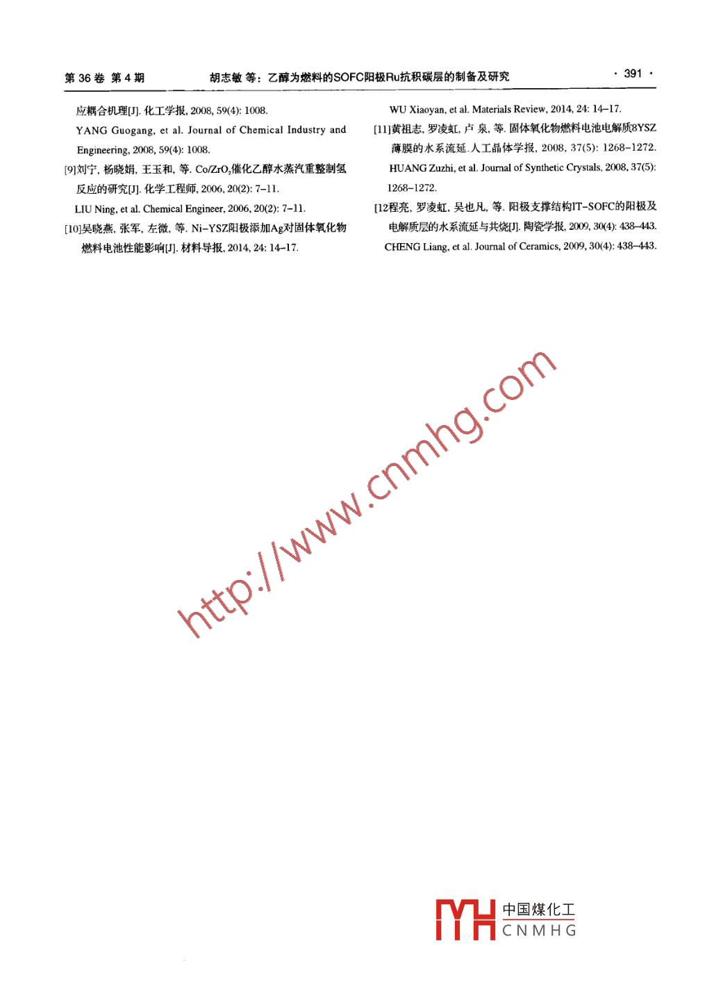 第36卷第4期2015年8月Journal of ceramicsAug.2015DOI:10.13957 cnki, tcxo2015.04.01l乙醇為燃料的SOFC陽(yáng)極Ru抗積碳層的制備及研究胡志敏,羅凌虹,孫良良,吳也凡,石繼軍,程亮,余輝(景德鎮(zhèn)陶瓷學(xué)院,江西景德鎮(zhèn)333001擴(kuò)要:采用浸漬法,在陽(yáng)極支撐型固體氧化物燃料電池N/YSZ陽(yáng)極上制備納米R(shí)u層。并研究不同Ru浸漬量對(duì)單電池的電性能的影響。實(shí)驗(yàn)結(jié)果表明:采用化學(xué)浸漬法能成功制備顯微結(jié)構(gòu)良好的Ru催化層,納米級(jí)珍珠狀的Ru顆粒均勻的分散于N-YSz陽(yáng)極材料表面。以乙醇蒸汽( nHO/CH CH OH=3:1)為燃料,800℃的測(cè)試溫度下,浸漬了08wt%Ru的Ru-N-YSZYZAg單電池獲得最大功率密度可達(dá)304mWem,即Ru層的添加可以提高單電池的電性能。通過(guò)10h的運(yùn)行,顯示添加了Ru層的電池的電性能及抗積碳性能獲得明顯提高。關(guān)鍵詞:固體氧化物燃料電池;NO-YSZ;陽(yáng)極;Ru中圖分類號(hào):TQ174.75文獻(xiàn)標(biāo)志碼:A文章編號(hào):10002278(2015)04-0386-06Preparation and Research on Anode of Anti-Carbon Deposition for SOFCUsing ethanol as fuelHU Zhimin, LUO Linghong, SUN Liangliang, WU Yefan, SHI Jijun, CHEN Liang, YU Hui(Jingdezhen Ceramic Institute, Jingdezhen 333001, Jiangxi, China)Abstract: A nano Ru catalytic layer on the Ni-YSZ anode-supported solid oxide fuel cell was obtained by impregnation method. Theinfluences of different Ru content on the electrical properties of a single cell were studied by SEM, EDS and the electrochemical workstation.The research result revealed that a functional nano Ru catalytic layer was gotten on Ni-YSZ anode by impregnation method. The pear-likenano Ru particles were uniformly dispersed on the surface of Ni-YSZ anode materials. With 0.8 wt. Ru impregnated in ethanol(nH,O/CH, CH,OH-3: 1)fuel at 800C, the electrical performance of Ru-Ni-YSZ YSZ Ag single cell was 304mW /cm. The 10 hours'running testshowed the electro catalytic activity and anti-carbon deposition of the cell obviously improvedKey words: SOFC; NiO-YSZ; Anode; Ru0引言的增高而呈線性遞增。如果將電導(dǎo)率和熱膨脹性綜合考慮,40-60%的N,既可保持陽(yáng)極的電子電固體氧化物燃料電池(SOFC)是新發(fā)展起來(lái)的導(dǎo)率,又可降低與其它組元件熱膨脹系數(shù)的失配類燃料電池,它除了具備傳統(tǒng)燃料電池的高效率叩。在N-YSz陽(yáng)極結(jié)構(gòu)中,YSZ起骨架的作用,率、低污染等優(yōu)點(diǎn)之外,還具有其本身獨(dú)有的特N顆粒均勻地分布于YSZ構(gòu)建的網(wǎng)絡(luò)結(jié)構(gòu)中,這種點(diǎn),比如燃料適應(yīng)性廣、能量轉(zhuǎn)化率高等"。在結(jié)構(gòu)大大增加了三相界面區(qū)域,從而提高了電池的能源問(wèn)題日趨緊張的今天,SOFC的研究受到世界性能"。然而鎳基陽(yáng)極有一個(gè)致命的缺點(diǎn),即表面各國(guó)的高度重視。陽(yáng)極是SOFC的核心材料之容易發(fā)生積碳現(xiàn)象,以乙醇、CH等其他碳?xì)浠详?yáng)極材料的優(yōu)劣性會(huì)直接影響到SOFC的整體性物為燃料氣時(shí),在高溫下Ni會(huì)催化斷裂燃料氣中碳能2。氫化合物的C-H鍵,使電池陽(yáng)極產(chǎn)生積碳,這將使目前,在SOFC中應(yīng)用最為廣泛的是Ni-YSZ得電池在運(yùn)行過(guò)程中催化活性大大降低甚至停止運(yùn)陽(yáng)極。研究表明,Ni-YSZ的熱膨脹系數(shù)隨N含量行。因此,在研究提高陽(yáng)極催化活性的同時(shí),其抗收稿日期:2015-03-25。修訂日期:201504-29。Received date中國(guó)煤化工e:053基金項(xiàng)日:國(guó)家自然科學(xué)基金資助(項(xiàng)目號(hào)51302119,51262010,Correspondent546201);江西省主要學(xué)科學(xué)術(shù)和技術(shù)帶頭人培養(yǎng)計(jì)劃E-mail: 70518HCNMHG項(xiàng)目(2O13BCB2》0;江西省高等學(xué)??萍悸涞赜?jì)劃巧目(KIDl3072)通信聯(lián)系人:羅凌虹(1966-),女,博士,教授第36卷第4期胡志敏等:乙醇為燃料的SOFC陽(yáng)極Ru抗積碳層的制備及研究387積碳性的優(yōu)化也是我們面對(duì)的一大難題。目前,圖2為Ru-N-YSZ陽(yáng)極表面XRD圖。由圖可為了解決陽(yáng)極的積碳問(wèn)題,主要有兩種策略:第一知,樣品呈現(xiàn)出較好的晶態(tài),樣品的衍射峰和種是燃料氣重整,第二種是優(yōu)化電池陽(yáng)極。已 JCPDS標(biāo)準(zhǔn)卡片中的N、YSZ以及Ru峰位相符合,有研究表明,在N-YSZ電池陽(yáng)極負(fù)載金屬元素或陽(yáng)極表面除了N和YSZ之外,存在明顯的Ru,并且者金屬氧化物能改善陽(yáng)極環(huán)境,可在以碳?xì)浠衔锍酥鉄o(wú)其他明顯雜峰。其中Ni和YSZ的衍射峰為燃料時(shí)獲得較好電性能及抗積碳能力。劉寧等的2θ值分別為4°、51以及30°、34°、50°、60°,采用浸漬法制備Co/ZrO2催化劑,乙醇的轉(zhuǎn)化率提N對(duì)應(yīng)的峰分別(1)和(100);YSZ對(duì)應(yīng)的峰分別高,陽(yáng)極表面的積碳現(xiàn)象也有所減輕。吳曉燕等(10),(200),(220),(31)浸漬而產(chǎn)生的金屬Ru在單電池N-YSZ陽(yáng)極以化學(xué)鍍銀法,發(fā)現(xiàn)電池的的衍射峰的26值為38°、42.5°、68°,對(duì)應(yīng)的這電化學(xué)性能和抗積碳能力有較大提高。本文嘗試些峰分別是(100),(10),(101)衍射晶面。采用浸漬法,以RuCl溶液為添加劑,在陽(yáng)極支撐22電池SEM分析型固體氧化物燃料電池Ni-YSZ陽(yáng)極上制備納米R(shí)u半電池的斷面及表面測(cè)試SEM如下圖所示。層。并研究其對(duì)單電池的電性能和抗積碳的影響。圖3(a、b)為N-YSZ‖YSZ半電池陽(yáng)極