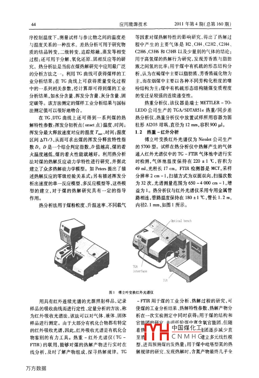 2011年第4期(總第160期)應用能源技術煤熱解研究的分析方法辛宏(黑龍江省能源研究所,黑龍江節(jié)能技術服務中心,黑龍江哈爾濱15000摘要:為了讓更多的科研工作者了解煤熱解試驗儀器及其分析方法,對熱重一差熱、紅外、氣相色譜、質譜等儀器分析方法的特征性能進行了綜述,重點描述了其在原煤、半焦、焦油熱解氣體等分析研究中的應用,同時簡要介紹了一些先進的聯(lián)合分析法在煤熱解研究中的應用。另外還對熱重分析儀(瑞士 METTLER-TOLEDO公司生產TGA/SDTA851e熱重/同步差熱分析儀)、傅立葉變換紅外光譜儀(Nclt公司生產的5700型)、氣相色譜儀(5975MSD)、質譜儀(6890GC)進行了介紹。關鍵詞:煤;熱解;應用中圖分類號:TK31文獻標志碼B文章編號:1009-3230(2011)04-0043-04Coal Pyrolysis Research Methods of AnalysisXIN HongEnergy Research Institute of Heilongjiang Province, Energy Conservation Service Centerof Heilongjiang Province, Harbin 150001, China)Abstract: In order to make more scientific research staff understand the coal pyrolysis experimentalapparatus, Depended on the apparatus of the 238 lab and his own experiment and data analysisexperience,combined the development of coal pyrolysis, the author introduced the analysis method ofTG-DTA, FTIR, GC, and MS, especially described the application in the analysis research field ofcoal, tar and pyrolysisgas, at sane time he gave some introduction of the advavced combined analysis incoal pyrolysis research work. this article also of thermogravimetric analyzerTG(TGA/ SDTA85le ofMETTLER-TOLEDO Company), FTIR (Nicolet5700), MS(5975MSD), GC(6890GC)Key words: Coal; Pyrolysis; Application0前言熱解研究中,獲得了較好的效果。將對可用于煤煤既是我國主要的一次能源,又是主要的污熱解研究中的主要現(xiàn)代分析儀器:熱重-差熱染源利用技術相對落后。我們必須尋求新的綜(TG-DTA)紅外光譜(FTIR)、氣相色譜(GC)、合、高效、潔凈的煤轉化途徑,在保障能源安全供質譜(MS)等及其聯(lián)用儀的特性以及它們在煤熱應的同時解決環(huán)境污染問題。而潔凈煤技術就解中的主要應用進行綜合評述,并介紹了幾種現(xiàn)是實現(xiàn)這一目的的主要技術,其中煤炭轉化技術代儀器。是其主要內容之一。煤的熱解又是煤炭氣化、液1熱分析特性及其應用化焦化以及燃燒等各種轉化技術的基礎,其研究11熱重-差熱分析成果對煤轉化技術具有直接的指導作用。隨著技熱分析是在程序控制溫度下,測量物質的物術的不斷進步和儀器性能的不斷提高,越來越多理性y百的鹽甘中應用最廣泛的分析儀器測試范圍被拓展并廣泛地應用于煤的的是中國煤某某化工。熱重法主要用CNMHG的規(guī)律,從熱收稿日期:201-02-15修訂日期:2011-02-27重曲線上找出相應于質量變化的各溫度點,可用作者簡介:辛宏(1983-),女,主要從事熱L測試等工作。于推斷物質的組成和相態(tài)變化。差熱分析是在程應用能源技術2011年第4期(總第160期)序控制溫度下,測量試樣與參比物之間的溫度差等因素對煤熱解特性的影響研究,得出了熱解過與溫度關系的一種技術。差熱分析可用于研究物程中產生的主要氣體是H2、CH4、C2H2、C2H4質的結晶轉變,二級轉變,追蹤熔融,蒸發(fā)等相變C2H6、3H6和C3H8以及少量別的氣體的結論;過程;還可用于分解、氧化還原、固相反應等的研用于高氫煤的熱解行為研究,發(fā)現(xiàn)芳香族與脂肪究。熱分析法是當前在煤熱解研究中應用最廣泛族之間氫的比率;用于煤中有機硫的形態(tài)結構分的分析方法之一。利用TG曲線可獲得煤樣的工析,認為在褐煤中主要以脂肪族、芳香族硫化物為業(yè)分析結果;在TG曲線上可獲得質量變化過程主,而在煙煤中主要以各種不同芳構化程度的噻中的一系列相關參數(shù),經計算即可得到煤的工業(yè)吩結構為主;煤中有機硫形態(tài)結構隨煤變質程度分析結果,如水分含量、揮發(fā)分含量、灰分含量、固的變遷呈較強的連續(xù)遞變性定碳等。該方法測定的煤樣工業(yè)分析結果與國標熱重分析儀,該儀器是瑞士 METTLER-T0法測定值可以很好地吻合。EDO公司生產的 TGA/SDTA851e熱重/同步差在TG、DTG曲線上還可得到一系列煤的熱熱分析儀,熱重分析儀中放置試樣所用容器為圓解特性參數(shù):揮發(fā)分初析點( onset點)溫度、時間;柱形Al203坩堝,直徑為12mm,容積900μl。揮發(fā)分最大釋放速度對應的溫度T、時間;溫度1.2熱重-紅外分析區(qū)間△m/3,從而可求出煤的揮發(fā)分釋放特性指傅立葉變換紅外光譜儀為 Nicolet公司生產數(shù)D。D是一個綜合判定指數(shù),D值越高煤的著的5700型。試樣在熱分析儀中熱解產生的氣體火溫度越低,煤的著火性能就越好。利用熱分析通入紅外光譜儀中的TC-FTR氣體池中進行實法對煤的熱解反應動力學特性進行研究并據(jù)此時檢測氣體池溫度保持在220±1℃,容積為建立了眾多熱解動力學模型。如 Peters提出了描49ml,光程長17cm。FTR檢測器是MCT,采樣述熱解反應的零級經驗關系式;另有描述揮發(fā)分分辨率2cm-1,掃描方式為雙面雙向掃描次數(shù)析出速度的單一反應模型、多反應模型等這些模為32次光譜測量范圍為650~4000cm-1,增型的建立,對于煤的熱解研究具有一定的指導益為1。熱分析儀與紅外光譜儀采用專用金屬管作用路相連,管路溫度保持在180±1℃,管長1.2m,熱分析法用于煤粉粒度、升溫速率、不同載氣內徑21mm,如圖1所示。Optical bench圖1傅立葉變換紅外光譜儀用具有紅外連續(xù)光譜的光源照
