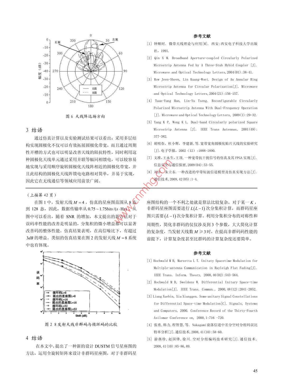 209年第10期,第42卷通信技術(shù)Vo1.42,No.10,2009第214期Communications TechnologyNo 214, Totally多發(fā)射天線的差分酉空時(shí)調(diào)制信號(hào)星座圖程智慧,張勇°,逄大鵬°,雷向勇°(①北京1481信箱,北京102442;②中化國(guó)際招標(biāo)有限責(zé)任公司,北京100045)【摘要】在無(wú)法獲得信道狀態(tài)信息的瑞利衰落信道里,分集積是高信噪比場(chǎng)景下酉空時(shí)信號(hào)具有良妤性能的首要指標(biāo)采用全旋轉(zhuǎn)矩陣的方法獲得了極大分集積非群空時(shí)碼,仿真結(jié)果表明,在髙信噪比下,該非群空時(shí)碼性能優(yōu)于傳統(tǒng)的酉空時(shí)循環(huán)碼【關(guān)鍵詞】多發(fā)射天線;非群空時(shí)碼;差分酉空時(shí)【中圖分類號(hào)】TN91【文獻(xiàn)標(biāo)識(shí)碼】A【文章編號(hào)】1002-0802(209)10-0041-02Signal Constellation of Differential Unitary Space-timeCoding by Multi-Transmitting AntennaCHENG Zhi-hui, ZHANG Yong, PANG Da-peng, LEI Xiang-yong(OP. 0. Box1481, Beijing 102442, China: (sInochem International Tendering Co., Ltd. Beijing 100045, China)(Abstract] In Rayleigh fading channels, in which CSI (channel state information)is unavailable, diversityproduct is the key index for showing if the unitary space-time signals have good properties in high SNr. Theechnique of full -rotation-matrix is used to acquire the non-group space-time coding with maximum diversity product,and the simulation results indicate that the non-group space-time coding proposed in this paper is of betterperformance than the traditional unitary cyclic space-time coding in high SNR.(Key words] multi-transmitting antenna; non-group STC differential unitary STC引言1信道模型和 DUSTM在快衰落瑞麗信道下,雖然多發(fā)射多接收天線系統(tǒng)1.1信道模型MIMO的通信容量可超越單天線系統(tǒng),但是信道狀態(tài)信息假設(shè)通信系統(tǒng)接收天線數(shù)為M,接收天線數(shù)為N,信CSI的獲得比較困難,而且,隨著接發(fā)天線數(shù)的增加,訓(xùn)練道為平坦瑞利衰落信道,Sm表示發(fā)射天線m=1,2,…,M在序列的長(zhǎng)度也隨之變長(zhǎng),導(dǎo)致MIMO的性能顯著下降。因此,基于準(zhǔn)靜態(tài)衰落信道下無(wú)CSI的差分酉空時(shí)調(diào)制 DUSTM應(yīng)1=12…T時(shí)間片的發(fā)射信號(hào),且滿足E∑∑1=7運(yùn)而生4:在每個(gè)發(fā)射時(shí)間塊T內(nèi),發(fā)身信號(hào)矩陣是前接收天線n=1,2,…,N在時(shí)間片t=1,2,…,T的接收信個(gè)發(fā)射矩陣和目前酉數(shù)據(jù)矩陣的矢量積,在高信噪比下,極號(hào)x”表示如下大分集積是信號(hào)星座圖擁有良好性能的首要指標(biāo)本文采用全旋轉(zhuǎn)矩陣的方法提出了一種全新的獲得x=√∑hnDUSTM星座圖的方法,當(dāng)發(fā)射天線增加時(shí),此方法簡(jiǎn)化為n,為均值為0、方差為0:的復(fù)高斯信道衰落系數(shù),o3個(gè)參數(shù),結(jié)構(gòu)更為簡(jiǎn)單,性能更為優(yōu)越值為0、方差為0.5加性白復(fù)高斯噪聲;p為每接收天收稿日期:209-08-12。線平均信噪比,公式(1)可以寫成矩陣形式作者簡(jiǎn)介:程智慧(1971-),男,工程師,主要從事差分酉空時(shí)研究張勇(1979-),男,工程師,主要從事空時(shí)碼調(diào)制研究;逄大鵬(1979-),男,工程師,主要從事電子信號(hào)碼元研X為T×N的接收信號(hào)矩陣,S為T×M的發(fā)射信號(hào)矩究;雷向勇(1978-),男,工程師,主要從事信息對(duì)抗陣,H為MxN的信道衰落矩陣,且服從獨(dú)立標(biāo)準(zhǔn)正態(tài)分布,W為獨(dú)立表針正態(tài)分布噪聲矩陣。1.2差分酉空時(shí)調(diào)制假設(shè)z,z2…,,…∈{0,1…,L}為整數(shù),發(fā)射數(shù)據(jù)序列的重新定義 DUSTM星座圖,下標(biāo)為x1,z2…,…。每一個(gè)z,相對(duì)應(yīng)于星座集91=01…,乙-1中的某一個(gè)星座圖矩陣。發(fā)射端發(fā)射的符[RF,(k月,=01-…,L,給定星座圖的尺寸L,通過(guò)最大號(hào)流S1,S2…,S。=lM,由如下的基本差分編碼公式調(diào)制化分集積s可以窮舉搜索得到“頻率系數(shù)”集S=S-1,t=1,2,…N。K={k,k2…kw;k}。當(dāng)k2=0,則與文獻(xiàn)2中的對(duì)角循在接收端,解調(diào)獲得譯碼流x,X,X2,…,X,為環(huán)結(jié)構(gòu)完全相同M×N矩陣,根據(jù)公式(2),則有以上的星座圖具有非群碼結(jié)構(gòu),為了找到合適的星座x1=√pSH+W1,X,=√pSH+W將式(3帶入式(4),可以得到X=中x1+H一中W圖,需要計(jì)算L[L(L-1)/2]次sm。從全旋轉(zhuǎn)矩陣的性質(zhì),可以發(fā)現(xiàn)sn的結(jié)構(gòu)是對(duì)稱且具有周期性當(dāng)噪聲矩陣乘以一個(gè)酉陣后可以保持統(tǒng)計(jì)意義上的不變,等式(4)變化為'-5N-5L-A o實(shí)際上,如果星座長(zhǎng)度L為偶數(shù),可以按照如下運(yùn)算法X=中X搜索最大分集積:這里,W為MxN加性獨(dú)立標(biāo)準(zhǔn)正態(tài)分布的矩陣。差分酉空時(shí)調(diào)制最大似然估計(jì)解調(diào)如下e。嗎= dingle/And,en+y:,+M23e3,4k12+M-22, -arg, mRF(1k,0)1這里,k1和k12嚴(yán)格限制為偶數(shù),k2為一偶數(shù)區(qū)間[0,L/4]這里川表示F范數(shù)成對(duì)誤碼率P的 Chenot上界為12)這樣僅僅只涉及到3個(gè)參數(shù),計(jì)算的復(fù)雜度為O[(L2P=1≤(/2)∏1+(1+p31(1+2)(的一本文提出的分集積和循環(huán)碼的分集積比較如表1表1提出的非群碼星座圖與循環(huán)碼分集積的比較這里,σn(中-9)為(中-中)的第m個(gè)奇異值。星座圖的設(shè)循環(huán)非群碼循環(huán)非群碼計(jì)規(guī)則就是最大化分集積s群碼星座圖群碼星座圖40.
