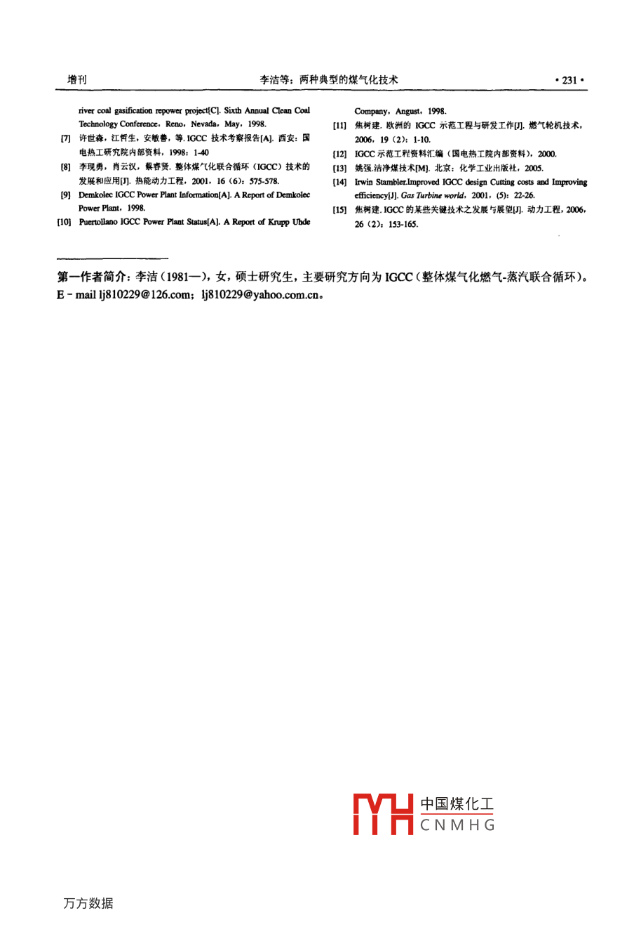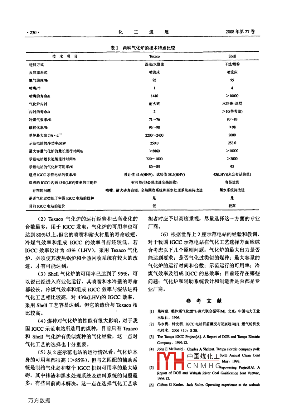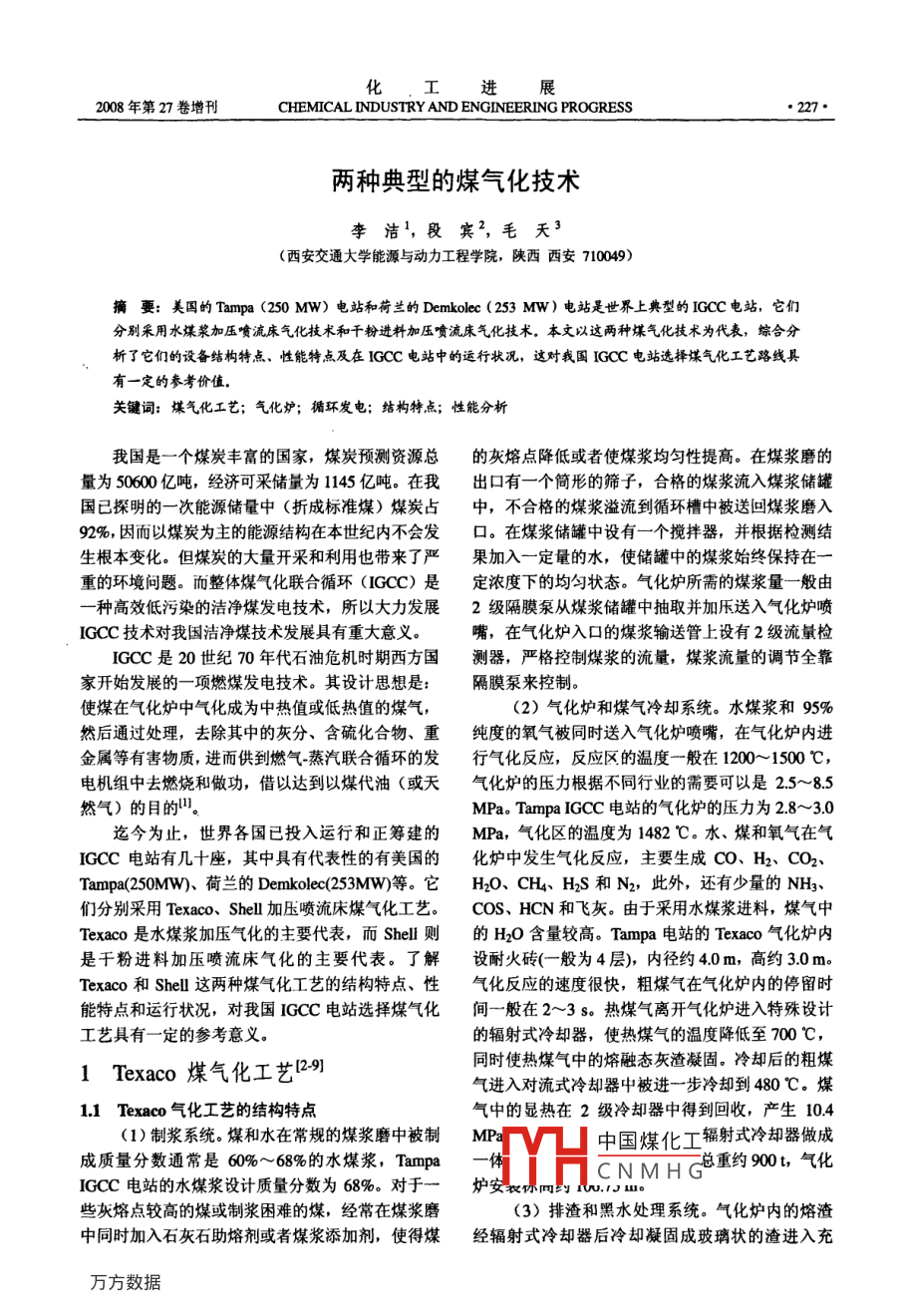 展2008年第27卷增刊CHEMICAL INDUSTRY AND ENGINEERING PROGRESS●227●兩種典型的煤氣化技術(shù)李潔',段賓”,毛天3(西安交通大學(xué)能源與動力工程學(xué)院,陜西西安710049)摘妻:美國的Tampa (250 MW)電站和荷蘭的Demkolee (253 MW)電站是世界上典型的IGCC電站,它們分別采用水煤漿加壓噴涴床氣化技術(shù)和干粉進(jìn)料加壓噴流床氣化技術(shù)。本文以這兩種煤氣化技術(shù)為代表,綜合分析了它們的設(shè)備結(jié)構(gòu)特點、性能特點及在IGCC電站中的運行狀況,這對我國IGCC電站選擇煤氣化工藝路線具有一定的參考價值。關(guān)鍵詞:煤氣化工藝; 氣化爐; 循環(huán)發(fā)電; 結(jié)構(gòu)特點;性能分析我國是一個煤炭豐富的國家,煤炭預(yù)測資源總的灰熔點降低或者使煤漿均勻性提高。在煤漿磨的量為50600億噸,經(jīng)濟(jì)可采儲量為1145億噸。在我出 口有-一個簡形的篩子,合格的煤漿流入煤漿儲罐國已探明的一次能源儲量中(折成標(biāo)準(zhǔn)煤)煤炭占中,不合格的煤漿溢流到循環(huán)槽中被送回煤漿磨入92%,因而以煤炭為主的能源結(jié)構(gòu)在本世紀(jì)內(nèi)不會發(fā)口。在煤漿儲罐中設(shè)有一一個攪拌器,并根據(jù)檢測結(jié)生根本變化。但煤炭的大量開采和利用也帶來了嚴(yán)果加入-定量的水,使儲罐中的煤漿始終保持在一重的環(huán)境問題。而整體煤氣化聯(lián)合循環(huán)(IGCC) 是定濃度下的均勻狀態(tài)。氣化爐所需的煤漿量-般由一種高效低污染的潔凈煤發(fā)電技術(shù),所以大力發(fā)展2級隔膜泵從煤漿儲罐中抽取并加壓送入氣化爐噴IGCC技術(shù)對我國潔凈煤技術(shù)發(fā)展具有重大意義。嘴,在氣化爐入口的煤漿輸送管上設(shè)有2級流量檢IGCC是20世紀(jì)70年代石油危機(jī)時期西方國測器,嚴(yán)格控制煤漿的流量,煤漿流量的調(diào)節(jié)全靠家開始發(fā)展的一項燃煤發(fā)電技術(shù)。其設(shè)計思想是:隔膜泵來控制。使煤在氣化爐中氣化成為中熱值或低熱值的煤氣,(2)氣化爐和煤氣冷卻系統(tǒng)。水煤漿和95%然后通過處理,去除其中的灰分、含硫化合物、重純度的氧 氣被同時送入氣化爐噴嘴,在氣化爐內(nèi)進(jìn)金屬等有害物質(zhì),進(jìn)而供到燃?xì)?蒸汽聯(lián)合循環(huán)的發(fā)行氣化反應(yīng), 反應(yīng)區(qū)的溫度一般在1200~ 1500 C,電機(jī)組中去燃燒和做功,借以達(dá)到以煤代油(或天氣化爐的壓力根據(jù)不同行業(yè)的需要可以是 2.5~8.5然氣)的目的"。MPa. Tampa IGCC電站的氣化爐的壓力為2.8~3.0迄今為止,世界各國已投入運行和正籌建的MPa,氣化區(qū)的溫度為1482 C.水、煤和氧氣在氣IGCC電站有幾十座,其中具有代表性的有美國的化爐中發(fā)生氣化反應(yīng),主要生成CO、H2、CO2、Tampa(250MW)、荷蘭的Demkolec(253MW)等。它H2O、CH4、H2S和N2,此外,還有少量的NH3、們分別采用Texaco、Shell 加壓噴流床煤氣化工藝。cos. HCN和飛灰。由于采用水煤漿進(jìn)料,煤氣中Texaco是水煤漿加壓氣化的主要代表,而Shell 則的H2O含量較高。Tampa 電站的Texaco氣化爐內(nèi)是干粉進(jìn)料加壓噴流床氣化的主要代表。了解設(shè)耐火磚(一般為4層),內(nèi)徑約4.0m,高約3.0 m。Texaco和Shell這兩種煤氣化工藝的結(jié)構(gòu)特點、性氣化反應(yīng)的速度很快,粗煤氣在氣化爐內(nèi)的停留時能特點和運行狀況,對我國IGCC電站選擇煤氣化間一般在2~3 s。熱煤氣離開氣化爐進(jìn)入特殊設(shè)計工藝具有- -定的參考意義。的輻射式冷卻器,使熱煤氣的溫度降低至700 C,同時使熱煤氣中的熔融態(tài)灰渣凝固。冷卻后的粗煤1 Texaco 煤氣化工藝12-91氣進(jìn)入對流式冷卻器中被進(jìn)一步冷卻到 480°C.煤1.1 Texaco 氣化工藝的結(jié)構(gòu)特點氣中的顯熱在2級冷卻器中得到回收,產(chǎn)生10.4(1)制漿系統(tǒng)。煤和水在常規(guī)的煤漿磨中被制MPa中國煤化工輻射式冷卻器做成成質(zhì)量分?jǐn)?shù)通常是60%~ 68%的水煤漿,TampaYHCNMHG總重約900,氣化IGCC電站的水煤漿設(shè)計質(zhì)量分?jǐn)?shù)為68%。對于一爐安衣你同約1w.1J 10些灰熔點較高的煤或制漿困難的煤,經(jīng)常在煤漿磨(3)排渣和黑水處理系統(tǒng)。氣化爐內(nèi)的熔渣中同時加入石灰石助熔劑或者煤漿添加劑,使得煤經(jīng)輻射式冷卻器后冷卻凝固成玻璃狀的渣進(jìn)入充●228●化工進(jìn)展2008年第27卷滿水的鎖斗系統(tǒng),鎖斗上下部各有2級閥門控制渣容量商業(yè)運行的臺數(shù)和經(jīng)驗更豐富。進(jìn)入和排出。從壓力鎖斗排出的渣落入粗渣糟中,.3 Tampa IGCC電站中Texaco氣化爐曾出現(xiàn)過粗渣被分離出來,進(jìn)一步處理或直接銷售。細(xì)渣和的主要問題及解決辦法水一起被抽入一-個細(xì)灰沉降槽中進(jìn)行重力沉降或(1)排渣鎖斗堵塞。通過調(diào)整運行工況及改動過濾,使水和細(xì)渣分離。從洗滌器出來含灰的水也部分管道基本得到解決。進(jìn)入沉渣槽中,使含碳的飛灰與水分離,從沉渣糟(2)輻射廢熱鍋爐和對流廢熱鍋爐的泄漏問中溢流出來的水一般含非常少量的細(xì)灰,它被再循題。主要原因可能是由于高溫腐蝕,改進(jìn)的方法是:環(huán)至水洗滌器入口作為洗滌器用水,多余的水送回采取保護(hù)措施,改善氣化爐的運行狀況。對流廢熱煤漿制備系統(tǒng)。從沉渣槽底部流出的細(xì)灰進(jìn)入-個鍋爐也 曾出現(xiàn)管壁泄漏和積灰堵塞