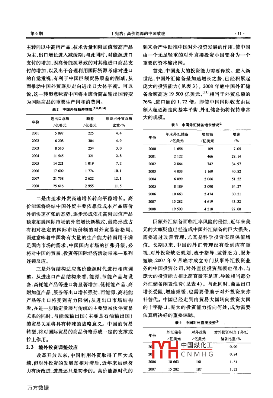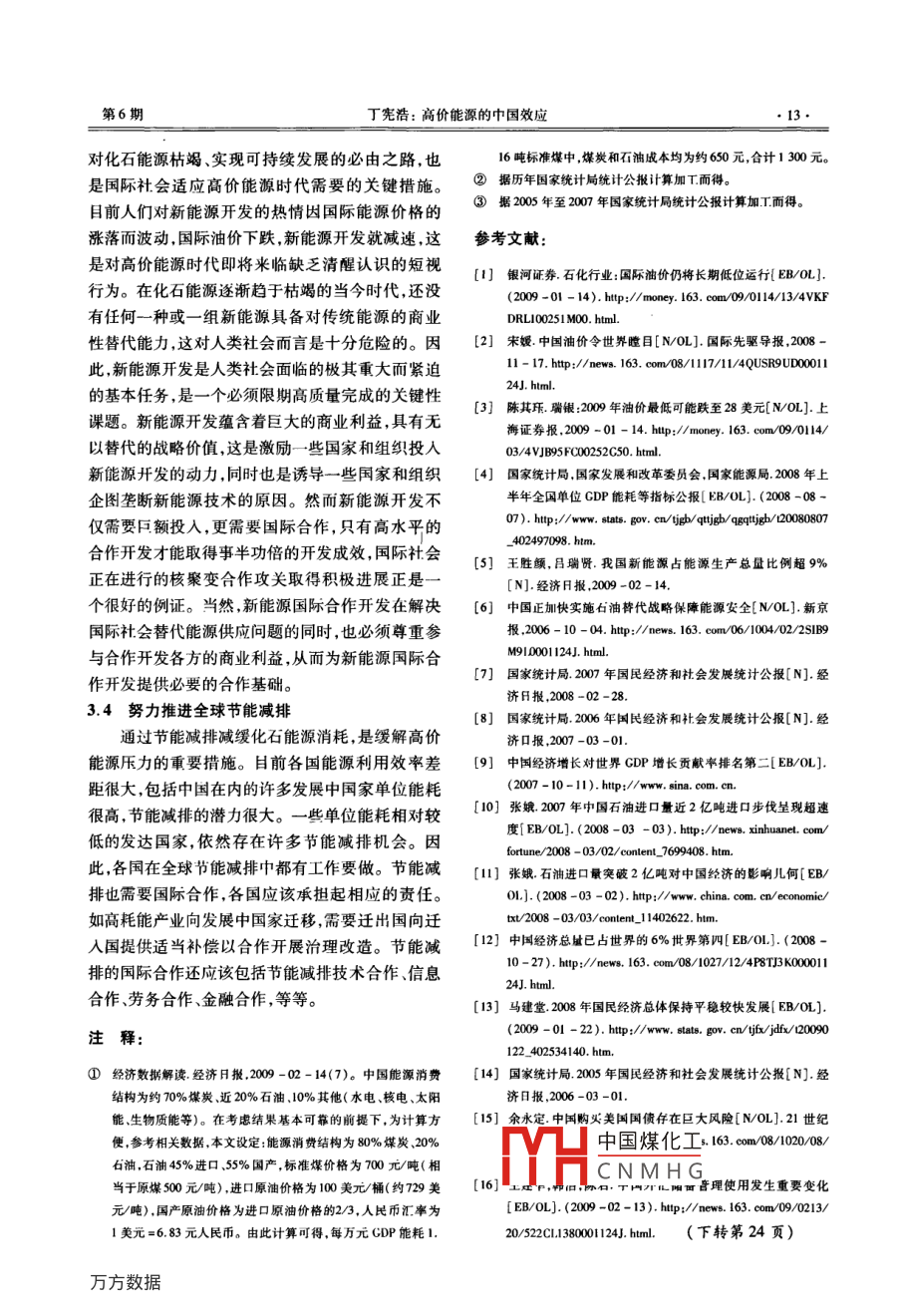 第29卷第6期天津商業(yè)大學(xué)學(xué)報Vol 29 No 62009年11月Journal of Tianjin University of CommerceNov.2009高價能源的中國效應(yīng)丁憲浩(蘇州科技學(xué)院公共管理學(xué)院,蘇州215009)【摘要】人類即將進入高價能源時代。高價能源對中國經(jīng)濟社會運行發(fā)展的影響,至少表現(xiàn)為成本推上、增長減速、產(chǎn)業(yè)重構(gòu)、節(jié)能減排、加速耗竭、福利攤薄等六大效應(yīng),對中國經(jīng)濟影響的溢出效應(yīng)主要有增長動力減退效應(yīng)、對外貿(mào)易轉(zhuǎn)型效應(yīng)、境外投資調(diào)整效應(yīng)。為放大積極效應(yīng),抑制消極效應(yīng),迎接高價能源時代的挑戰(zhàn),除了中國加大改革調(diào)整力度以外,國際社會還應(yīng)積極開展能源合作,大力開發(fā)新能源,努力推進全球性節(jié)能減排。【關(guān)鍵詞】高價能源;中國效應(yīng);內(nèi)部效應(yīng);溢出效應(yīng);國際合作【中圖分類號】F148文獻標(biāo)識碼】A【文章編號】1674-2362(2009)06-0008-06隨著全球金融危機的發(fā)展,國際油價漸漸收斂幾方面效應(yīng)。起咆哮多時的猙獰面孔。然而2008年油價的過山1.1成本推上效應(yīng)車行情,已明白無誤地警示人們廉價能源時代的行高價能源會明顯地全面推高中國生產(chǎn)經(jīng)營活將終結(jié)、高價能源時代的日益逼近。動成本。按國家統(tǒng)計局、國家發(fā)展和改革委員會作為國際能源價格標(biāo)桿的國際原油價格1970國家能源局公布的全國單位GDP能耗指標(biāo)公報數(shù)年僅為每桶18美元,在幾次石油危機沖擊下油價據(jù),2008年中國每萬元GDP的綜合能耗為1.16噸巨幅震蕩、不斷攀升。從2002年開始由每桶25美標(biāo)準(zhǔn)煤,4能耗成本大致相當(dāng)于CDP的13%以元起,以毎年差不多10美元的漲幅逐年遞增,2008能源價格上漲3~5倍估算,如果能耗不能顯著降年7月11日創(chuàng)出每桶147.27美元的歷史高價攀低,能源消費結(jié)構(gòu)基本不變,能耗成本也就會相應(yīng)上全年平均每桶100美元的高位,1-36年中上漲增加為相當(dāng)于GDP的40%~65%。即使單位能耗了3倍。雖因經(jīng)濟危機、炒作泡沫減退等影響,油有所下降(下降難度相當(dāng)大),能源消費結(jié)構(gòu)有所價回落到每桶40美元左右,但由于化石能源日近調(diào)整,新能源的使用有所增加,能耗成本的降低也枯竭新能源開發(fā)步履蹣跚,油價重拾強勁升勢應(yīng)相當(dāng)有限。能源漲價對物價上漲具有很強的放大在意料之中??梢灶A(yù)期,在今后5~10年中,能源效應(yīng),動力、運輸冶煉等上游行業(yè)或環(huán)節(jié)的成本上價格上漲3~5倍并不困難,出現(xiàn)更大幅度的上漲升,會在向下游行業(yè)和生產(chǎn)環(huán)節(jié)傳遞過程中節(jié)節(jié)放也是極有可能的。大,導(dǎo)致全社會的通貨膨脹,中國將告別廉價商品高價能源不僅將對中國產(chǎn)生全面深刻而劇烈時代。的影響,還會有力助推中國在國際經(jīng)濟活動中的角1.2增長減速效應(yīng)色轉(zhuǎn)換,從而對國際經(jīng)濟運行產(chǎn)生深刻影響中國經(jīng)濟高速增長的奇跡是建立在低成本勞1內(nèi)部效應(yīng)動力、廉價能源供給等基礎(chǔ)之上的,高價能源必然會阻滯中國經(jīng)濟的發(fā)展。一是積累能力的減弱導(dǎo)作為全球第二大能源消費國,高價能源首先會致生中國煤化工的生產(chǎn)成本的顯對中國經(jīng)濟社會發(fā)展產(chǎn)生全方位影響至少有以下著上應(yīng)下降,企業(yè)和CNMHG收稿日期:200-06-18作者簡介;丁憲浩(1955一),男,江蘇海門人,教授,主要從事生態(tài)經(jīng)濟與生態(tài)文明、勞動經(jīng)濟與倫理、區(qū)域經(jīng)濟研究第6期丁憲浩:高價能源的中國效應(yīng)社會的積累能力因此大打折扣,擴大再生產(chǎn)的投資迅速發(fā)展,在不長的時間內(nèi)形成規(guī)??捎^的新興活動不得不壓縮減少,而相當(dāng)一部分落后生產(chǎn)能力產(chǎn)業(yè)。和生產(chǎn)單位的被淘汰,則會進一步拉低經(jīng)濟增長速1.4節(jié)能減排效應(yīng)度。二是消費成本的提升抑制了消費需求增長。高價能源必然引起全社會對能源問題的高度不僅耗能消費品(如汽車、家電)的消費因高價能重視,有利于形成節(jié)能減耗的社會氛圍,取得良好源而導(dǎo)致使用成本顯著上升,其他消費品也因成本的節(jié)能效果。首先,政府將進一步加大節(jié)能減排推上升使得消費者購置成本明顯增加,而且物價普遍進力度。中國政府對節(jié)能減排相當(dāng)重視,確定了上漲還會形成悲觀的消費預(yù)期,由此減弱消費需求“十一五”節(jié)能減排目標(biāo),推出了許多配套措施,頒增勢,導(dǎo)致消費對經(jīng)濟增長的拉動乏力。三是經(jīng)濟布了國家《節(jié)能法》。隨著高價能源時代的來臨,波動加劇消耗了增長成果。高價能源及能源價格節(jié)能減排的意義更為凸顯,節(jié)能減排T作將成為決的高位波動,如近年國際油價的巨幅震蕩,容易與定經(jīng)濟社會發(fā)展質(zhì)量和效果的關(guān)鍵性、基礎(chǔ)性工經(jīng)濟運行波動相互推動,形成惡性循環(huán),不僅影響作,被提到更為重要的戰(zhàn)略地位,政府會采取更多、經(jīng)濟的平穩(wěn)增長,還可能給發(fā)展中的中國經(jīng)濟造成更強有力更有效的推進措施,促進經(jīng)濟社會發(fā)展損失。的“低碳化”。其次,生