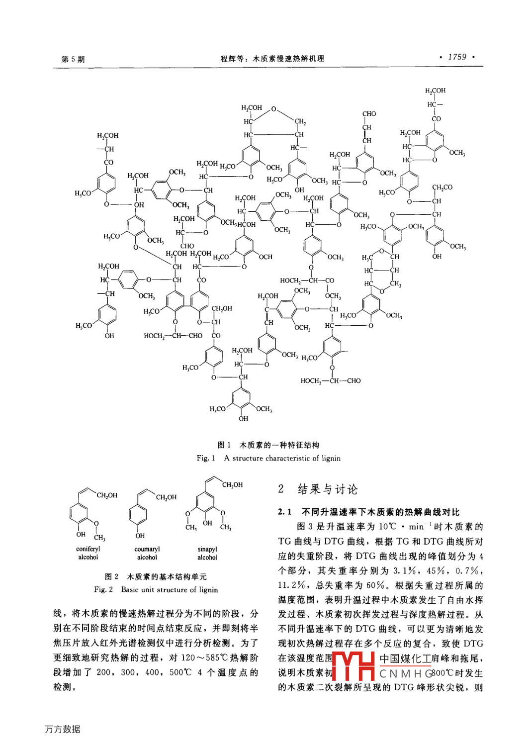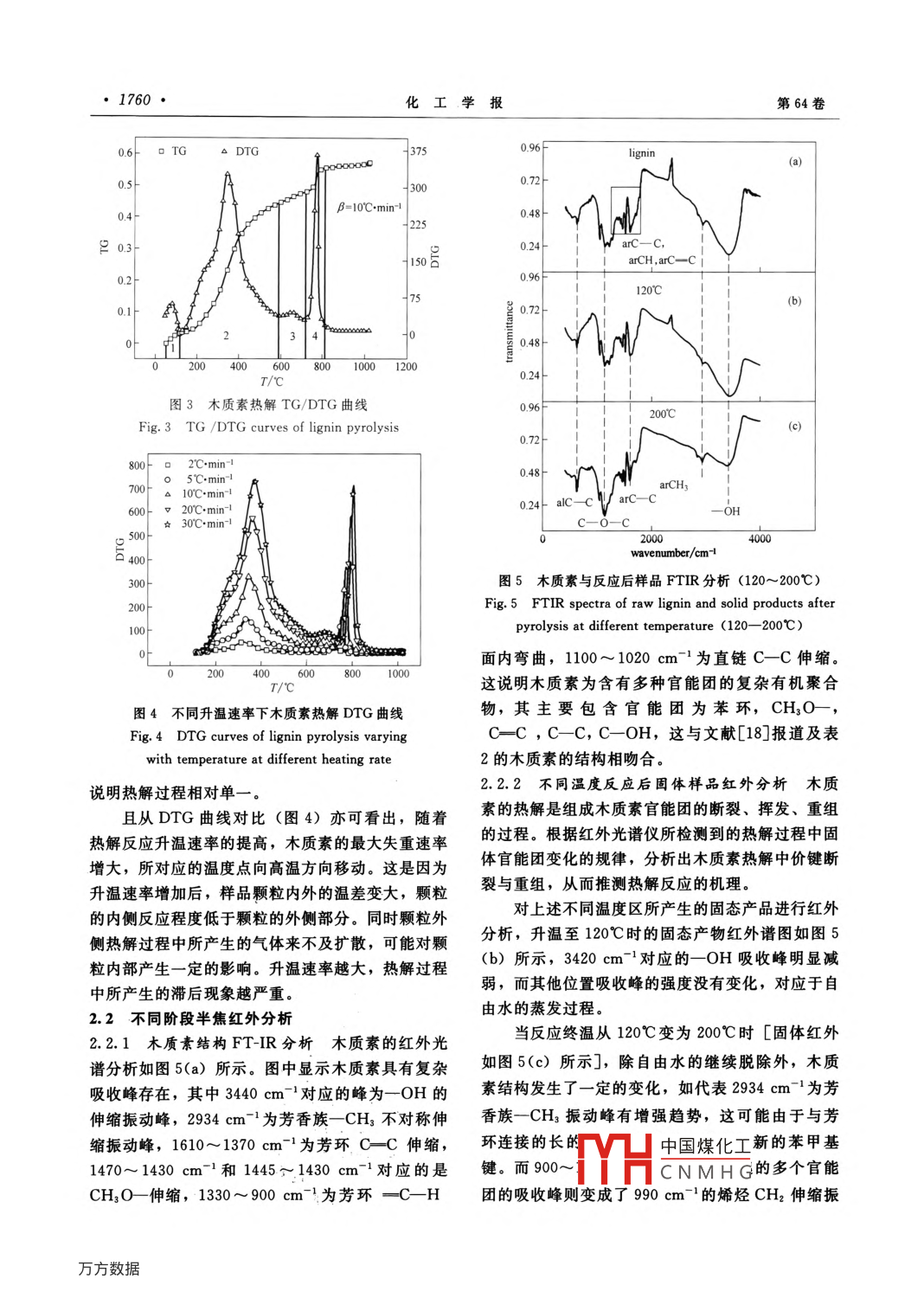 第64卷第5期化工學報Vol 64 No 52013年5月CIESC JournalMay 2013還c8研究論文木質(zhì)素慢速熱解機理程輝1·2,余劍,姚梅琴3,許光文1(中國科學院過程工程研究所,多相復雜系統(tǒng)國家重點實驗室,北京100190;中海油氣電集團國際貿(mào)易有限公司,北京100027;3中國科學院研究生院,北京100039)摘要:利用熱重考察了不同升溫速率下木質(zhì)素的熱解特性,結合紅外光譜對木質(zhì)素熱解的不同階段生成的半焦的表征結果,分析了木質(zhì)素在慢速升溫條件下的熱裂解機理,表明:木質(zhì)素的熱解是一個舊鍵斷裂揮發(fā)、新鍵重組的過程。熱解過程隨著反應時間的推移依次分為水分揮發(fā)、支鏈斷裂重組或揮發(fā)和芳環(huán)縮聚成碳3個階段。釆用 Flynn-Wall-Ozawa方法,根據(jù)不同升溫速率下測得的失重速率變化求算后兩個階段的活化能,結果分別為64kJ·mol1和132kJ·mol-1,進一步證明了木質(zhì)素熱解的分段特征,并表明芳環(huán)縮聚成碳所需活化能遠大于與苯環(huán)相連的支鏈斷裂所需的能量關鍵詞:熱重分析;木質(zhì)素;熱解機理;紅外分析DoI:10.3969/ 3. issn.0438-1157.2013.05035中圖分類號:TQ351.1文獻標志碼:A文章編號:0438-1157(2013)05-1757-09Mechanism analysis of lignin slow pyrolysisCHENG Hui, YU Jian, YAO Meiqin, XU Guangwen'('Institute of Process Engineering, China Academy of Science, Beijing 100190, China?CNOOC Gas Power Group International Trade Company, Beijing 100027,China' Graduate University of Chinese Academy of Sciences, Beijing 100039, China)Abstract: The characteristics of lignin pyrolysis was investigated by tg at different heating ratecombined with FtiR characterization of the chars from different stages of slow pyrolysis of lignin toanalyze lignin pyrolysis mechanism at slow heating rate. The results show that pyrolysis of lignin is aprocess involving breakage of old chemical branched chains and recombination of new branchedchains. With time extending i. e temperature rising, there are thiree successive sprocess of lignpyrolysis: dewatering, breakage-recombination-volatilization of branched chainsolymerization oaromatic rings and formation of carbon. Based on the weight loss rate at different heating rates, accordingto the Flynn-Wall-Ozawa equation, the calculation of kinetic parameters resultedtivation energi64 kJ. mol and 132 kJ. mol for the latter two pyrolysis stages, respectively This indicates furtherthat the pyrolysis of lignin carried out in different stages and the breakage of the branded chains was easierthan the polymerization of aromatic rings.Key words: thermo gravimetric analysis; lignin pyrolysis; mechanism; FTIR analysis2012-08-24收到初稿,2012-10-31收到修改稿。Received date: 2012-08-24聯(lián)系人:余到,許光文。第一作者:程輝(1984-),男,碩g author: Dr. YU Jian, yujiang home. ipe ac cn;士研究生Prof XU中國煤化工基金項目:國家自然科學基金項目(21106156,21006110)FoundationCNMHG Natural ScienceFoundation of China (21106156, 21006110)1758·化工學報第64卷引言本實驗利用熱重和紅外光譜儀,對木質(zhì)素的熱解行為和熱解機理進行了研究。在熱重考察熱解失隨著石油等化石能源的日益緊缺以及對環(huán)境造重過程中木質(zhì)素的質(zhì)量變化規(guī)律的基礎上,結合不成的污染,作為對新型潔凈能源的生物質(zhì)的利用,同熱解階段半焦的紅外譜圖分析得出殘余半焦中有特別是熱解、氣化、發(fā)酵等過程越來越受到人們的機官能團的變化規(guī)律,推測熱解過程中鍵斷裂機關注13。其中熱解是生物質(zhì)利用的重要組成部分,理。同時根據(jù)不同階段失重變化率,利用FW研究熱解反應的機理對提高熱解效果意義重大。由O1方法求算不同熱解階段的活化能,從而佐證木于生物質(zhì)組成復雜,其熱解過程中所發(fā)生的諸多物質(zhì)素熱解鍵斷裂的難易程度與復雜性理及化學反應,使得研究熱解反應機理的難度增加。許多學者采用“黑箱法”將研究重點放在生1實驗物質(zhì)熱解過程的原料和產(chǎn)物的物理化學性質(zhì)變化,1.1實驗樣品借此推斷熱解反應機理6。也有研究者對生物質(zhì)實驗所用原料是上海梯希愛化成公司購買的高內(nèi)所含的某一成分的熱解反應進行研究,再將不同純度脫堿木質(zhì)素。為了消除內(nèi)擴散的影響,粒徑選組分的熱解過程進行比較綜合,借此來推斷生物質(zhì)為<75gm。樣品的元素分析、工業(yè)分析以及基本熱解過程的機理78結構分析見表1。生物質(zhì)主要由纖維素、半纖維素、木質(zhì)素等組表1木質(zhì)素工業(yè)分析和元素分析結果成,它的熱解是這三種物質(zhì)熱解的綜合。纖維素是Table 1 Proximate and ultimate analyses of ligni生物質(zhì)的主要組成部分,由于其組成單一,故已有大量文獻對其熱解過程進行了報道1。而木質(zhì)素/%(mass)Ultimate analysis/%(mass)Material的含量相對較低,但其熱解過程較為復雜,且可能Va Ad FCd Cd Hd Nd Oa+Sd與其他組分發(fā)生反應12,因此木質(zhì)素的熱解在生lignin80.89.210.046.994.310.3339.15物質(zhì)熱解過程中占有重要作用,對其熱解過程反應機理與動力學的研究顯得十分必要。木質(zhì)素是一種含多個官能團的復雜有機物,圖木質(zhì)素的熱解過程有快速熱解與慢速熱解???為一種木質(zhì)素的特征結構。圖中可分解出木速熱解是在固定的熱解反應溫度下,瞬間打入反應質(zhì)素的主體結構單元,如圖2所示,由3種不同性物料,并在極短的停留時間內(nèi)進行快速反應。而慢質(zhì)的苯丙烷單體聚合而成,即松柏基醇型、香豆醇速反應是時間