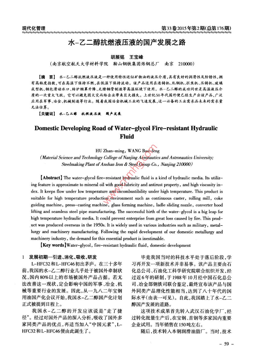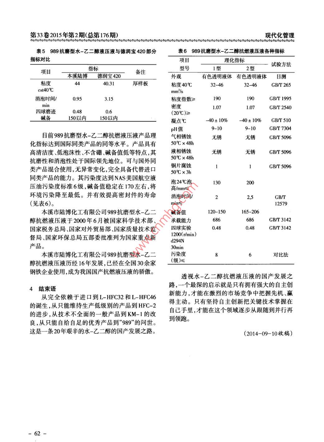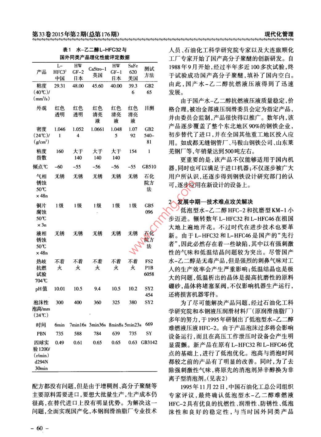現代化管理第33卷2015年第2期(總第176期)水-乙二醇抗燃液壓液的國產發(fā)展之路胡展銘王寶峰(南京航空航天大學材料學院鞍山鋼鐵集團煉鋼總廠南京210000【摘要】水-乙二醇抗燃液壓液是一種使用特性近似礦物油的液壓介質,具有良好的潤滑性及防銹性,擁有高粘度指教,可在高溫下保持不燃,在低溫下保持流動。該產品適用在逹鑄杋、軋鋼機、攔焦杌、壓鑄機、玻璃成型機、鋼包滑動水口、轉爐煙罩升降、無縫鋼管制造等高溫環(huán)境下使用。水一乙二醇的成功問世是高溫液壓介質的一次重大飛躍。它可以避免因火災而給企業(yè)帶來巨大損失。上世紀50年代國外便已經生產出該產品,廣泛應用在軍事、冶金、機械制造等行業(yè)。隨著我國冶金機楲工業(yè)的飛速發(fā)展,這一必備的工業(yè)需求品未來的需求量無法估算?!娟P鍵詞】水-乙二醇抗燃漩壓液圓產發(fā)畏Domestic Developing Road of Water-glycol Fire-resistant HydraulicFluidHU Zhan-ming, WANG Bao-feng(Material Science and Technology College of Nanjing Aeronautics and Astronautics University;Steelmaking Plant of Anshan Iron Steel Group Co., Nanjing 210000)[Abstract] The water-glycol fire-resistant hydraulic fluid is a kind of hydraulic media. Its utilizing feature is approximate to mineral oil with good lubricity and antirust property, and high viscosity index. It keeps flow under low temperature and incombustibility under high temperature This product issuitable for high temperature production environment such as continuous caster, rolling mill, cokeguiding machine, press-casting machine, glass forming machine, ladle sliding nozzle, converter hoodlifting and seamless steel pipe manufacturing. The successful birth of the water-glycol is a big leap forhigh temperature hydraulic media. It could prevent enterprise from great loss caused by fire. This product was produced overseas in the 1950s. It is widely used in various industries such as military, metallurgy and machinery manufacturing. Following the rapid development of our domestic metallurgy andmachinery industry, the demand for this essential product is inestimable.I Key words Water-glycol, fire-resistant hydraulic fluid, domestic development1發(fā)展初期一引進、消化、吸收、研發(fā)畢竟我國當時的科技水平處于落后階段,學LHFC32和LHFC46初出茅廬。在三十多年習再開發(fā)一項新技術并非易事。該產品主要由石前,我國的水-乙二醇行業(yè)幾乎處于被國外牽制狀化總公司、石油化工科學研究院聯合組織開發(fā),經況,國內80%以上的市場被國外產品占據。若無過近6年的研制,于1988年10月經中國石化總公法改善這一現狀,定會影響中國的軍事、冶金、機司、冶金部鋼鐵司聯合鑒定,最終宣布該產品與國械等重要行業(yè)的發(fā)展。因此,從一九八二年寶鋼外同類產品理化性能相當,達到了八十年代的國用油國產化會議開始,我國水-乙二醇國產化計劃際水平(由表一可見)。自此,我國踏上了水-乙二正式被提到日程上。醇國產發(fā)展的道路。我國水-乙二醇的開發(fā)應該說是“走了捷這項技術成果首先轉入武漢石油化學廠,經徑”。經過對國外產品的深入分析,吸收了國外多過轉化批量生產后,在寶鋼、首鋼等多家國內重要家同類產品的優(yōu)點,再適當加入“中國元素”,L-企業(yè)試用。當年銷售在150噸左右。HFC32和L-HFC46便由此誕生了。隨后,技術轉入本鋼潤滑油脂廠。當時,技術59第302015年第2期(總第176期)的的的的現代化管理表1水-乙二醇LHFC32與人員、石油化工科學研究院專家以及大連旅順化國外同類產品理化性能評定數據工廠專家開始了國產高分子聚醚的創(chuàng)新研發(fā)。自產品HFC3GF2 CaStro-/ HW SaFe測試1988年9月開始,經過半年多近100多次試驗,終中國日本英國日本美國方法于試驗成功國產高分子聚醚,填補了國內空白。粘度2931480045.604000393GB2由此,國產水-乙二醇抗燃液壓液得到了迅速(40℃發(fā)展。由于國產水-乙二醇抗燃液壓液質量穩(wěn)定,價外觀紅色紅色紅色紅色紅色目測格合理,被冶金部液壓潤滑委員會定為指定產品,透明透明清亮清亮清亮液液液并由委員會監(jiān)制,產品很快得以推廣。數年內,該密度10461.0521.06611.048107GB2產品逐步覆蓋了整個東北地區(qū)90%的鋼鐵企業(yè),(24℃)/1初步替代了進口,并在全國其他重工地區(qū)投入應(g/m2)用。如成都無縫鋼管廠、馬鞍山鋼鐵公司、山東菜粘度160大于大于大于1541蕪鋼廠等,年銷量達到500噸左右。指數更重要的是,該產品不僅能夠適用于國內機傾點℃-55GB510器,同時也可以滿足于進口機器;不僅逐步被廣大氣相無銹無銹無銹無銹無銹石化用戶所認識,還逐步得到鋼鐵設計研究部門的認銹蝕院方可,逐步應用在新設計的設備上。50℃銅片1級1級1級1級1級GB52發(fā)展中期一技術難點攻關解決腐蝕96低泡型水-乙二醇HFC-2和抗磨型KM-1小50℃步邁進。輾轉數年L-HFC32和L-HFC46在祖國大地上遍地開花。不過時代在進步技術也要革液相無銹無銹無銹無銹無銹石化銹蝕院方新。由于LHFC32和L-HFC46是國產的“先行50℃者”,因此必然存在著一些缺陷,其中以有強刺激性的氣味和低溫結晶問題較為突出。盡管國產熱岐不著不著不著不著不著FS2水-乙二醇是無毒產品,但是強烈的刺鼻氣味對工抗燃火火火火火人的生產效率會產生嚴重影響;低溫結晶也是極試驗704℃大的問題,低溫析出的晶體是提高抗磨性的原料pH值100110.59410.510.2SY2硼砂,晶體將堵塞泵閥,不僅影響機器生產運行,454還將損害機器零