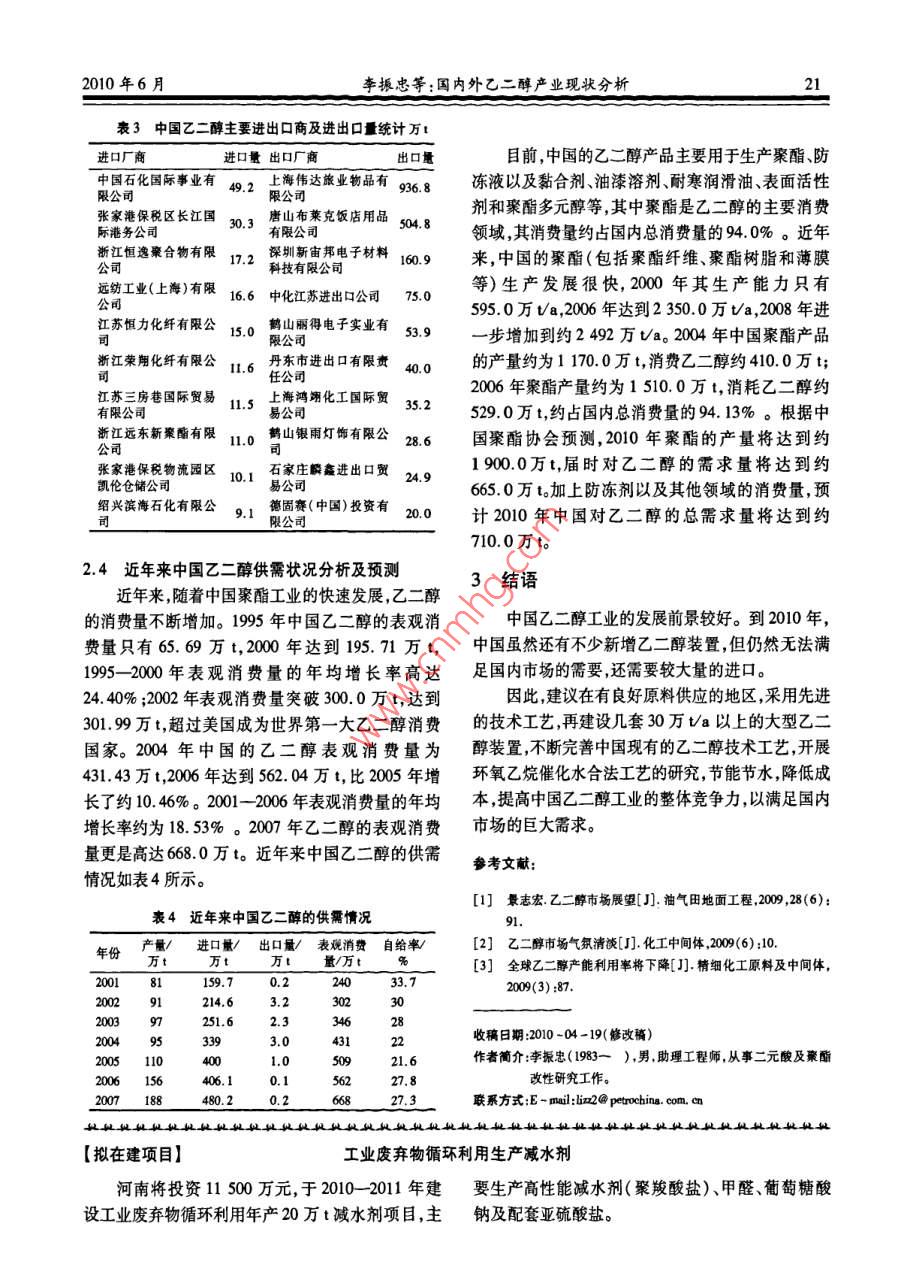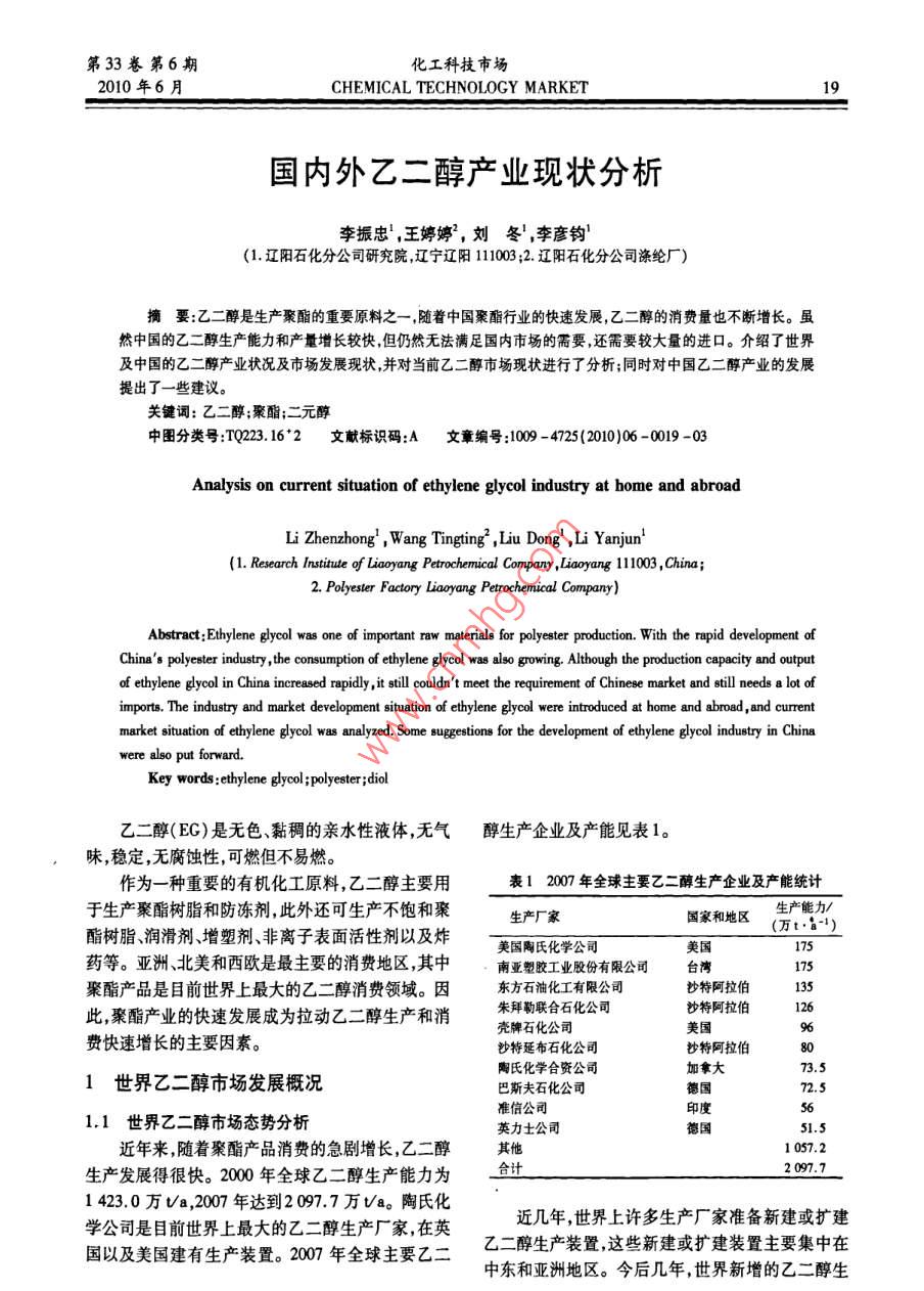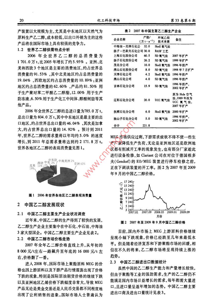 第33卷第6期化工科技市場2010年6月CHEMICAL TECHNOLOGY MARKET國內(nèi)外乙二醇產(chǎn)業(yè)現(xiàn)狀分析李振忠,王婷婷,劉冬1,李彥釣(1.遼陽石化分公司研究院,遼寧遼陽1110032.遼陽石化分公司滌綸廠)摘要:乙二醇是生產(chǎn)聚酯的重要原料之一,隨著中國聚酯行業(yè)的快速發(fā)展,乙二醇的消費量也不斷增長。雖然中國的乙二醇生產(chǎn)能力和產(chǎn)量增長較快但仍然無法滿足國內(nèi)市場的需要,還需要較大量的進(jìn)口。介紹了世界及中國的乙二醇產(chǎn)業(yè)狀況及市場發(fā)展現(xiàn)狀并對當(dāng)前乙二醇市場現(xiàn)狀進(jìn)行了分析;同時對中國乙二醇產(chǎn)業(yè)的發(fā)展提出了一些建議。關(guān)鍵詞:乙二醇;聚酯;二元醇中圖分類號:TQ223.162文獻(xiàn)標(biāo)識碼:A文章編號:1009-4725(2010)06-0019-03Analysis on current situation of ethylene glycol industry at home and abroadLi Zhenzhong, Wang Tingting,, Liu Dong, Li Yanjun(1. Research Institute of Liaoyang Petrochemical Company, Liaoyang 111003, China;2. Polyester Factory Liaoyang Petrochemical Company)Abstract: Ethylene glycol was one of important raw materials for polyester production. With the rapid development ofChina s polyester industry, the consumption of ethylene glycol was also growing. Although the production capacity and outputof ethylene glycol in China increased rapidly, it still couldn t meet the requirement of Chinese market and still needs a lot ofimports. The industry and market development situation of ethylene glycol were introduced at home and abroad, and currentmarket situation of ethylene glycol was analyzed. Some suggestions for the development of ethylene glycol industry in Chinawere alsoKey words: ethylene glycol; polyester; diol乙二醇(EG)是無色、黏稠的親水性液體,無氣醇生產(chǎn)企業(yè)及產(chǎn)能見表1。味,穩(wěn)定,無腐蝕性,可燃但不易燃。作為一種重要的有機(jī)化工原料,乙二醇主要用表12007年全球主要乙二醇生產(chǎn)企業(yè)及產(chǎn)能統(tǒng)計于生產(chǎn)聚酯樹脂和防凍劑,此外還可生產(chǎn)不飽和聚生產(chǎn)廠家國家和地區(qū)生產(chǎn)能力酯樹脂、潤滑劑、增塑劑、非離子表面活性劑以及炸(萬tb1)藥等。亞洲、北美和西歐是最主要的消費地區(qū),其中南亞塑膠工業(yè)股份有限公司臺灣聚酯產(chǎn)品是目前世界上最大的乙二醇消費領(lǐng)域。因東方石油化工有限公司沙特阿拉伯此,聚酯產(chǎn)業(yè)的快速發(fā)展成為拉動乙二醇生產(chǎn)和消朱拜勒聯(lián)合石化公司沙特阿拉伯美國費快速增長的主要因素。沙特延布石化公司沙特阿拉伯80陶氏化學(xué)合資公司加拿大1世界乙二醇市場發(fā)展概況巴斯夫石化公司德國準(zhǔn)信公司印度1.1世界乙二醇市場態(tài)勢分析英力士公司近年來,隨著聚酯產(chǎn)品消費的急劇增長,乙二醇其他0572生產(chǎn)發(fā)展得很快。2000年全球乙二醇生產(chǎn)能力為2097.71423.0萬va,2007年達(dá)到20977萬va。陶氏化學(xué)公司是目前世界上最大的乙二醇生產(chǎn)廠家,在英近幾年,世界上許多生產(chǎn)廠家準(zhǔn)備新建或擴(kuò)建國以及美國建有生產(chǎn)裝置。200年全球主要乙二乙二醇生產(chǎn)裝置這些新建或擴(kuò)建裝置主要集中在中東和亞洲地區(qū)。今后幾年,世界新增的乙二醇生化工科技市場第33卷第6期產(chǎn)裝置以大規(guī)模為主,尤其是中東地區(qū)以天然氣為表22007年中國主要乙二醇生產(chǎn)企業(yè)原料生產(chǎn)乙二醇成本較低,以出口外銷為主的這些企業(yè)名稱產(chǎn)品將在國際市場上具有較強的競爭力。(萬t·a1)技術(shù)來源備注中海油-殼牌石化公32.0Shel氧氣法1.2世界乙二醇供需特點分析揚子-巴斯夫石化公司30.0BASF工藝2006年全世界乙二醇的總消費量為上海石化股份公司60.5SD氧氣法200年擴(kuò)產(chǎn)17010萬t,比2005年增長了約595%。亞洲、北揚子石化股份公司262D氧氣法199年擴(kuò)產(chǎn)美和西歐3個地區(qū)是主要的消費地區(qū),約占世界總燕山石化股份公司80SD氧氣法1998年7月擴(kuò)產(chǎn)消費量的91.53%,其中北美地區(qū)約占總消費量的天津石化公司42Shel氧氣法1996年投產(chǎn)19.04%,西歐地區(qū)約占總消費量的10.89%;亞洲燕山石化公司4.0SD氧氣法年投產(chǎn)地區(qū)約占總消費量的62.60%,產(chǎn)品約81.50%用吉林石化分公司159SD氧氣法于生產(chǎn)聚對苯二甲酸乙二醇酯,12.00%用于生產(chǎn)防凍液,6.50%用于生產(chǎn)化工中間體、醇酸樹脂等其遼陽石化分公司20.0Ucc氧氣法氣法他產(chǎn)品。007年擴(kuò)產(chǎn)2006年全世界乙二醇的總進(jìn)口量為785.0萬t,撫順石化分公司6.0h氧氣法200年擴(kuò)產(chǎn)總出口量為804.0萬t,其中中東地區(qū)是最主要的出獨山子石化分公司50SD氧氣法口地區(qū),約占世界總出口量的4604%,其次是加拿年擴(kuò)產(chǎn)合計大,約占世界總出口量的14.92%。預(yù)計到2011年世界乙二醇的需求量將以年均約50%的速度MEG市場供應(yīng)過剩,下游需求疲軟不得不使一些生增長到2011年總需求量將達(dá)到約2171.8萬t。產(chǎn)廠家降低生產(chǎn)負(fù)荷無論是亞洲地區(qū)還是歐洲地世界各地區(qū)乙二醇的表觀消費量見圖1。區(qū)都有削減開工率的現(xiàn)象發(fā)生,也有部分廠家趁此進(jìn)行設(shè)備檢修,如 Clariant公司在對位于德國根多中南美洲2%亞洲63%夫( Gendorf)的EO/MEG裝置進(jìn)行停車檢修之前,正在下調(diào)該裝置的開工率。圖2為2007年至2009年9月的