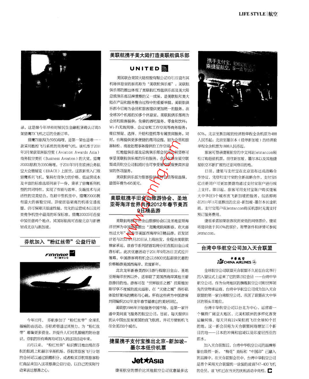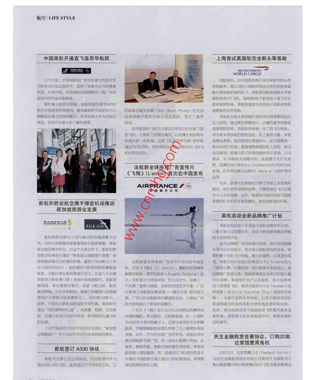 航空| LIFE STYLF中國南航開通直飛溫哥華航班上海首試英國航空全新頭等客艙WORLD CARGO幾個(gè)月前,中國南航由廣州至加拿大的首次直英航宣布,其中國旅客現(xiàn)可享用革新性的頭等飛航班成功抵達(dá)溫哥華,受到了加拿大官方的隆里客艙服務(wù),該公司的上海航班現(xiàn)由全球首批配備最歡迎。從那時(shí)起,中國南航每周將提供三班廣州至新頭等客艙的客機(jī)執(zhí)飛。英航采用配備最新頭等客溫華的往返直航服務(wù)艙的波音77飛機(jī),每周提供6個(gè)航班由上海飛往倫據(jù)加拿大旅游局預(yù)測,該航線每年將為44000敦希思羅機(jī)場。英航將陸續(xù)為其其他長途航班客機(jī)多位中國游客帶來便利。越來越多的中國游客可以后新航總裁吳俊( Goh Choon Phong)先生訪裝配新的頭等客艙略到加拿大的獨(dú)特魅力,享受加拿大非凡的質(zhì)行問法國圖盧弦的空客公司總部時(shí),簽訂了最終英航的全新頭等客艙打造計(jì)劃總投資額高達(dá)10本驗(yàn),加深對加拿大的了解和喜愛協(xié)議。億人民幣,通過樣合典雅設(shè)計(jì)、含蓄的豪華風(fēng)格及團(tuán)此次租質(zhì)的飛機(jī)為空客203年至2015年新下線其深厚的傳統(tǒng),為旅客帶來獨(dú)一無二的飛行體驗(yàn)。的飛機(jī),主要執(zhí)飛亞洲區(qū)域內(nèi),以及澳大利亞和中其全新頭等客艙的特色包括:機(jī)上提供點(diǎn)餐、多款東地區(qū)的一些航線。這批飛機(jī)采用羅爾斯一羅伊斯美酒及香檳。座位的肩位增寬60%,還可調(diào)整成達(dá)700發(fā)動機(jī),屆時(shí)將加入已有19架A330-300飛張長66英尺的床。配備儲物抽屜的私人衣柜。獨(dú)立機(jī)的現(xiàn)役機(jī)隊(duì)電動窗簾。配備15英寸屏幕的視聽娛樂系統(tǒng)。USB插頭、RCA插座及消噪耳機(jī)。全面整合式燈光系法航新全球電視廣告宣傳片統(tǒng)。出著名設(shè)計(jì)師 Anya Hindmarch設(shè)計(jì)的時(shí)尚化《飛翔》( L'envol)首次在中國發(fā)布按,內(nèi)為國名品牌amC的理用品AIRFRANCE/i%另外,旅客可在嶄新的15英寸屏幕上享受視聽話田空公可娛樂。座位更附設(shè)同伴椅,方便旅客在飛行過程中與人共享佳肴。此外,旅客均可按時(shí)間及氣氛隨新航和勝安航空攜手樟宜機(jī)場推動意調(diào)節(jié)燈光系統(tǒng)及電動窗簾,享受更舒適的環(huán)境新加坡旅游業(yè)發(fā)展英航啟動全新品牌推廣計(jì)劃都烈地SILKAIR英航宣布岸動十年來最大型的品牌宣傳計(jì)劃以配合該公司為期五年、旨在令顧客服務(wù)精益求精新航和勝安航空公司與樟官機(jī)場集團(tuán)撰手合的大型投資計(jì)劃。作,共同為游客提供更多超值假日旅游套餐,體驗(yàn)此次品牌抽廣活動將通過電視,報(bào)刊及網(wǎng)絡(luò)媒新加坡的精華所在。在這個(gè)全球合作下,新航和勝介等平臺全面展開,借此展示英航獨(dú)有的風(fēng)采,即安航空的乘客可通過“新加坡過境隨意行套餐“享累積數(shù)十年的飛行經(jīng)驗(yàn)、貼心的服務(wù),以及英倫風(fēng)受到極具吸引力的酒店價(jià)格,最低可至60新元(約法航新版全球電視廣告宣傳片首次在中國發(fā)范。英航為其歷史悠長的理念oFy. To Serve加u入合人民幣320元),包括酒店與機(jī)場間的免費(fèi)接送布。名為《飛期》(L’ envol),舞圖由法國著名了新的元素,以重申其一切以旅客為本的決心。除服務(wù)、無限次乘坐新航測意行巴士,以及八個(gè)主要編舞安奇林·曹羅佐凱奇( Angelin Preljocaj)設(shè)品牌推廣活動之外,英航更承諾在未來五年投入逾旅游景點(diǎn)的免費(fèi)門票(圣淘沙體閑度假村,國家胡計(jì),法航通過與法國靈智廣告公司合作,詮釋了一50億英鎊,銳意提升其產(chǎn)品及服務(wù)。有關(guān)投資將姬花園,新加坡游河觀光,裕廊飛離公園,新加個(gè)充滿了激情與情感,全新的法國藝術(shù)肖像。廣告用于購置新飛機(jī)、提供全新的 World Traveller(經(jīng)坡動物園,牛車水原貌館,幅康寧的碉堡以及濱海片體現(xiàn)了法航的品牌承諾—睛空萬里創(chuàng)寫意天濟(jì)客艙)及 World Traveller Plus(高級經(jīng)濟(jì)客灣高爾夫球練習(xí)場免費(fèi)練習(xí)),原價(jià)值13新元,地。廣告已在法航航線所覆蓋的北京、上海及廣州艙)、全新打造的頭等客艙,以及大幅度改進(jìn)倫此外,只需出示新航或勝安航空登機(jī)牌,乘客即可的當(dāng)?shù)仉娨暸_于黃金時(shí)段出蓋特威克機(jī)場和英航全球各地的貴賓室設(shè)施。通過“登機(jī)牌特別禮遇”,在就餐、購物,生活體廣告片《飛翔》是在瓦爾扎扎特附近的摩洛哥此外,部分投資將用于改進(jìn)航班飛機(jī)餐飲服務(wù)及驗(yàn),交通以及其它活動中享受一系列特別禮遇與折沙漠拍攝的,形式簡潔,無特殊效果。在一個(gè)面積新科技,使旅客無論在地面或空中,都能倍感割扣優(yōu)患。為430平方英尺的鏡子上,反射出真實(shí)的天空和舞適和便利。上述價(jià)格適用于202年3月28日前預(yù)訂“新加坡圉者。伴隨著舞蹈的是莫扎特第二十三鋼琴協(xié)奏曲過境隨意行”并于202年3月3日結(jié)束旅程的乘客。柔板。此外,作為對電視廣告的補(bǔ)充,法還同步民生金融租賃簽署協(xié)議,訂購20架推出兩版新平面廣告。其一是由七張圖片組成,從達(dá)索獵鷹商務(wù)機(jī)新航簽訂A330協(xié)議務(wù)、睡眠質(zhì)量、客艙空間和餐