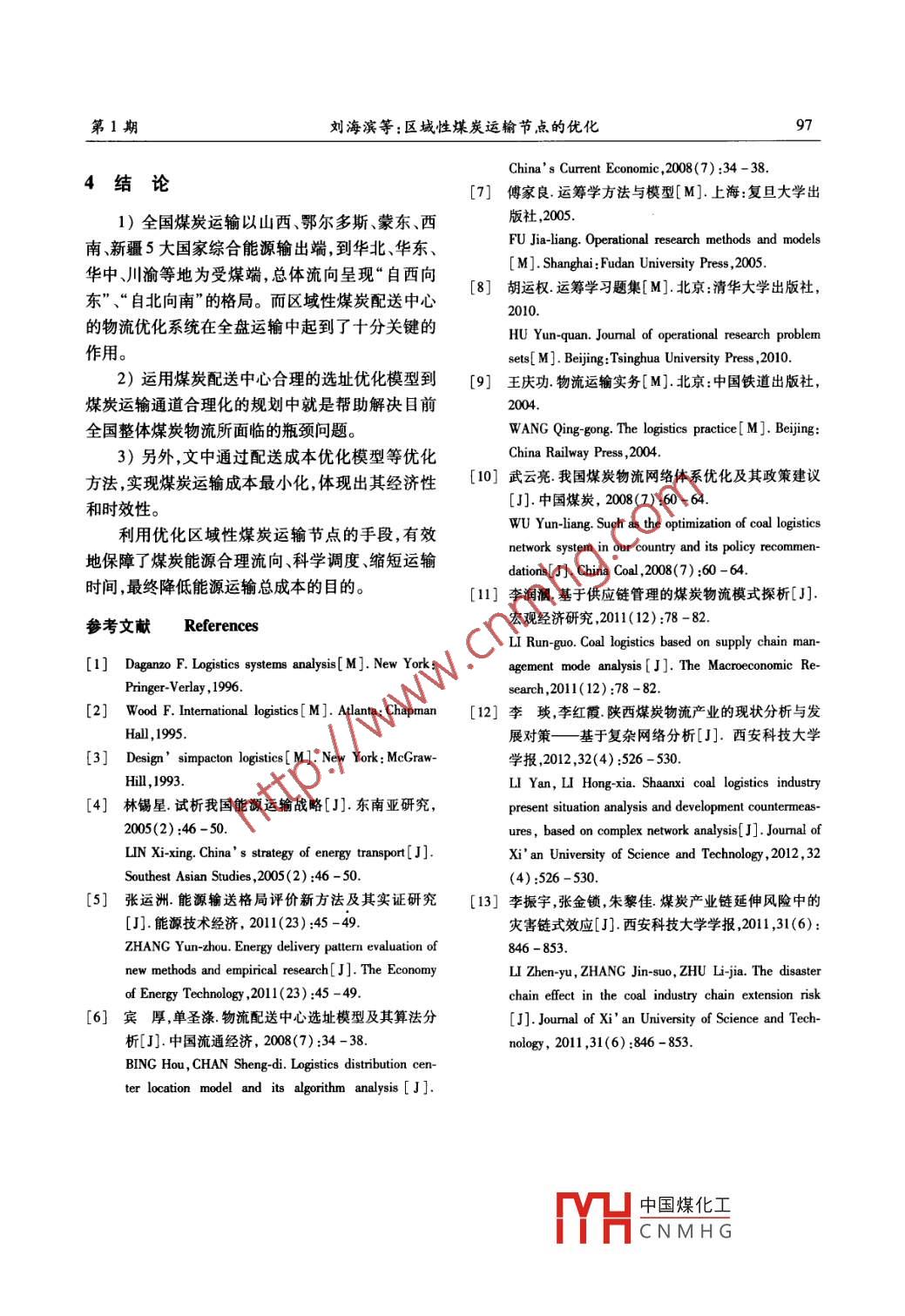 第34卷第1期西安科技大學(xué)學(xué)報(bào)Vol.34 No.2014年01月JOURNAL OF XI' AN UNIVERSITY 0F SCIENCE AND TECHNOLOGYJan. 2014文章編號(hào): 1672 -9315(2014)01 -0092 -06區(qū)域性煤炭運(yùn)輸節(jié)點(diǎn)的優(yōu)化劉海濱,吳必善,梅傲(中國(guó)礦業(yè)大學(xué)管理學(xué)院,北京100083)摘要:針對(duì)當(dāng)前我國(guó)煤炭行業(yè)物流諸多現(xiàn)實(shí)問題,尤其是煤炭運(yùn)輸通道規(guī)劃合理化問題,通過對(duì)煤炭物流客戶的需求量、運(yùn)輸距離及多式聯(lián)運(yùn)等信息的分析,并在對(duì)煤炭配送中心選址的重要性.合理性及其煤炭調(diào)運(yùn)成本的影響因素的研究之后,文中運(yùn)用煤炭配送中心合理的選址優(yōu)化模型與配送成本優(yōu)化模型等優(yōu)化方法,實(shí)現(xiàn)煤炭運(yùn)輸成本最小化,以達(dá)到優(yōu)化區(qū)域性煤炭運(yùn)輸節(jié)點(diǎn)的目的。煤炭配送中心合理的選址優(yōu)化模型與配送成本優(yōu)化模型的科學(xué)性和有效性也經(jīng)過實(shí)驗(yàn)證明其應(yīng)用的實(shí)際價(jià)值,為我國(guó)煤炭運(yùn)輸通道合理化的建設(shè)提供理論和技術(shù)支持,也有為我國(guó)煤炭運(yùn)輸通道的未來發(fā)展提供了指導(dǎo)性的意義。關(guān)鍵詞:合理化運(yùn)輸;配送中心;選址模型;成本核算中圖分類號(hào):F 532. 5;U116.2文獻(xiàn)標(biāo)志碼: A .Optimization of regional coal transportation nodesLIU Hai-bin, WU Bi-shan , MEI Ao(School of Management ,China University of Mining and Technology ,Bejirng 10083 , China)Abstract: The current coal logistics in China is facing many realstic problems, especially in planningrationalization problem of the coal transport coridor. Analysis of the customer demand,transport dis-tance and multimodal information of coal logistics industry , and considering the importance of coal distri-bution center location for rational distribution and reasonable cost , the paper puts forward the optimiza-tion model of coal transported center location and the cost optimization model,which achieve the rationaltransportation by the lowest cost and achieve the purpose of optimization of regional coal transportationnode. The models in selecting distribution centers and its distribution cost are proved its application val-ue in the validity by the experiments. It provides theoretical and technical support of rational coal trans-port corridor construction , and provides guidance significance for the future development of China' s coaltransportation channel.Key words : rational transportation ; distribution centers; location model; cost calculate化、時(shí)段性等因素的影響,全國(guó)煤炭健康發(fā)展面臨0引言諸多問題。中國(guó)煤炭運(yùn)輸?shù)母窬痔攸c(diǎn)主要“北煤近年來全國(guó)煤炭市場(chǎng)雖在各級(jí)政府重視情形南運(yùn)” 、“西煤東運(yùn)" ,也是支撐國(guó)民經(jīng)濟(jì)發(fā)展的生下仍處在不穩(wěn)定狀態(tài)。受到氣候變化、區(qū)域差異命通道。盡管運(yùn)輸通道休玄不斷發(fā)展和完善,但中國(guó)煤化工fYHCNMHG收稿日期:2013 -09 -10.基金項(xiàng)目:教育部博土點(diǎn)基金資助項(xiàng)自(2010020110002)通訊作者:劉海濱( 1968 -) ,男,北京人,教授,E-mail: wubishan1024@ sina. com.)4西安科技大學(xué)學(xué)招2014年煤炭生產(chǎn)基地至煤炭配送中心G的運(yùn)費(fèi)率分別為y葉Dieanye)C(i=1,2,.",n )?;谝陨细髟O(shè)計(jì)因素考慮,建立煤配中心選址的數(shù)學(xué)模型如下d,x。= 2 C,WX./ 2 C;W,。B(x)yo = 2CW,y/E C,W.煤配中心初始坐標(biāo)G (X,Y)的確定,是本設(shè)圖3 配送中心選址坐標(biāo)示意圖計(jì)選址的第一步。Fig. 3 Distribution center location coordinates第二步,在第-步的基礎(chǔ)上,可以計(jì)算出重心中討論的重點(diǎn)之- -。我國(guó)煤炭運(yùn)輸通道種類-般到產(chǎn)煤基地的直線距離D.;同時(shí)計(jì)算出貨運(yùn)的總有公路、水路、鐵路運(yùn)輸3種方式,以鐵路為主,以成本TC,以此作為接下來計(jì)算的比較對(duì)象。公路為主要補(bǔ)充,以下水港口為輔助。但是過去Du= (x0-x)+(o-y)",采用某單一運(yùn)輸方式,受到運(yùn)輸距離長(zhǎng)、空車返回、運(yùn)輸周期長(zhǎng)、風(fēng)險(xiǎn)大等因素影響,全國(guó)煤炭運(yùn)TC, =二C,WD.輸成本居高不下,因此需要合理建立多元化煤炭第三步,為了找到最優(yōu)煤配中心地理位置,可配送中心。將煤炭生產(chǎn)基地、第三方物流節(jié)點(diǎn)(火以不斷改善G (X0,Y)的坐標(biāo),以便確認(rèn)運(yùn)輸費(fèi)用車站或港口)作為區(qū)域性煤炭配送中心,某種程度率的合計(jì)值為最小的地點(diǎn)。所以,繼續(xù)計(jì)算改善后上可以綜合使用多式聯(lián)合運(yùn)輸?shù)奈锪髻Y源為煤炭G,(X',Y",)的坐標(biāo):能源的高效、安全使用做出貢獻(xiàn)。在全國(guó)煤炭合理運(yùn)輸大環(huán)境下,區(qū)域性煤炭配送中心的合理建X'。=( 2 C,WX.D,)/( )C:W:/D),司設(shè)更好地為需求客戶提供及時(shí)、低成本的服務(wù),也使得全國(guó)煤炭市場(chǎng)從微觀到宏觀管理上,顧及到Y(jié)'。= (2 C,WY/D,)/( E C;W/D,).臺(tái)各方利益的最優(yōu)化“”。例如,作為我國(guó)煤炭能源第四步,類似第二步計(jì)算出Dz;和TC2 ,并且比區(qū)域性中轉(zhuǎn)配送中心-秦皇島港口。其所處的較成本TC與成本TC2的大小而確定最優(yōu)煤配中能源運(yùn)輸樞紐的戰(zhàn)略地位,反映了煤配中心該具.心的地理位置。備的經(jīng)濟(jì)價(jià)值:充當