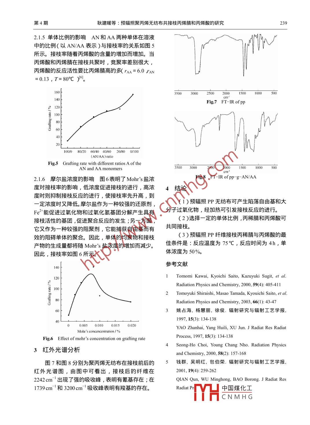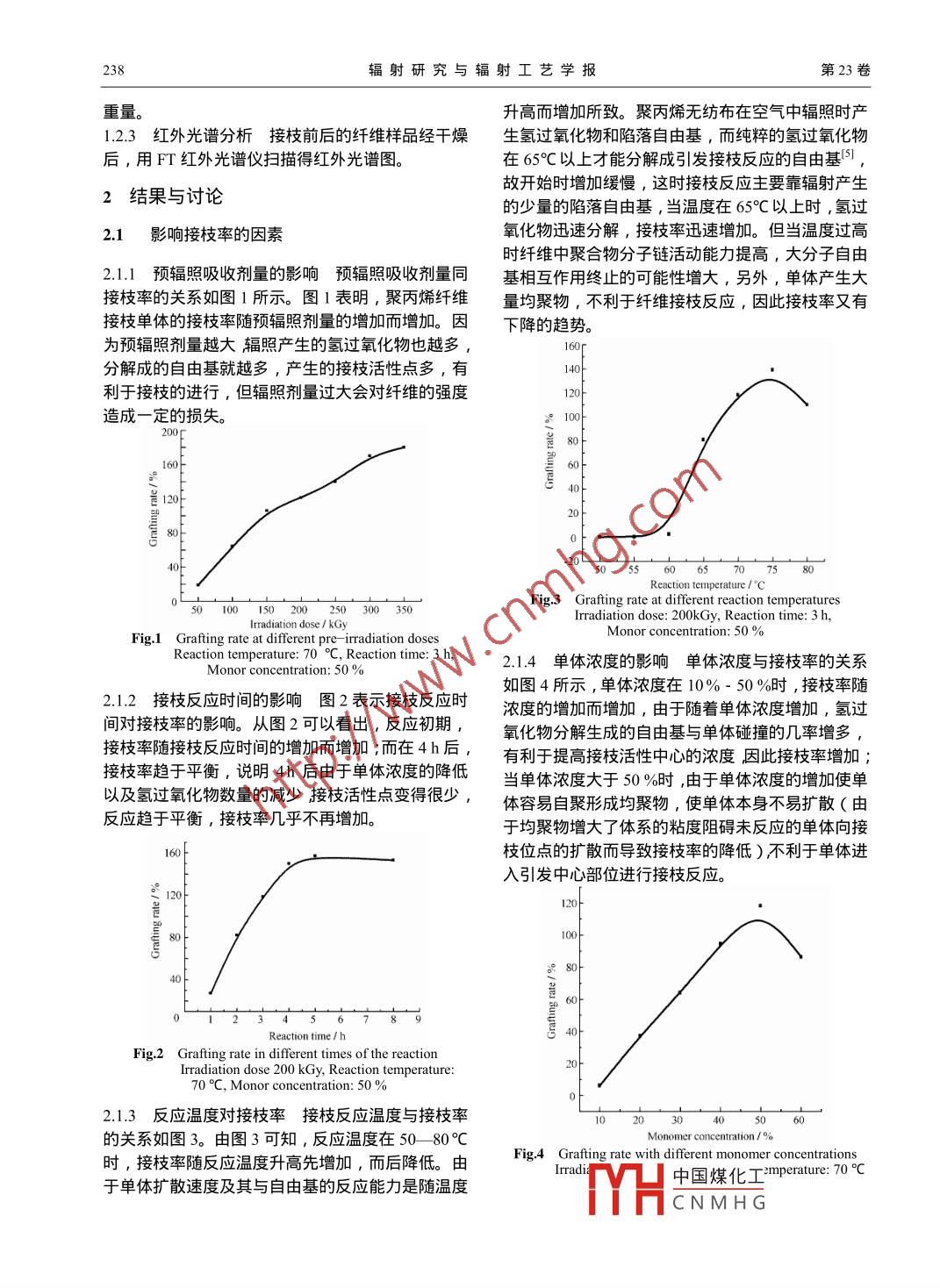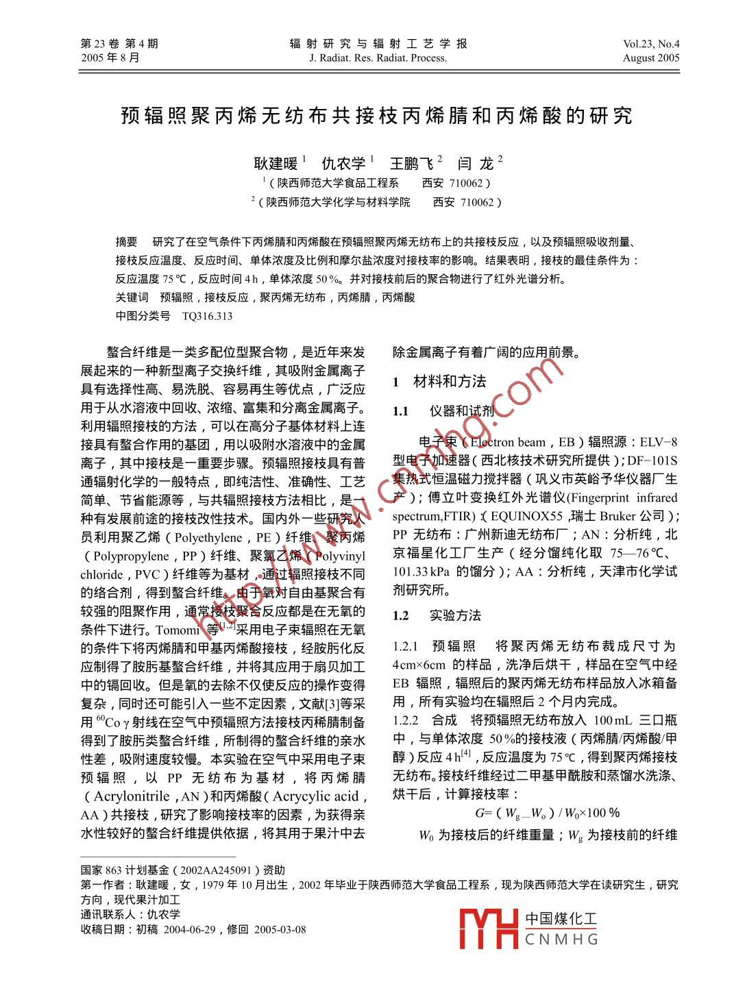 第23卷第4期輻射研究與輻射工藝學報Vol 23. No 42005年8月J Radiat. Res Radiat. ProcessAugust 2005預輻照聚丙烯無紡布共接枝丙烯腈和丙悕酸的研究耿建暖仇農(nóng)學1王鵬飛2閆龍2陜西師范大學食品工程系西安710062)2(陜西師范大學化學與材料學院西安710062)摘要研究了在空氣條件下丙烯腈和丙烯酸在預輻照聚丙烯無紡布上的共接枝反應,以及預輻照吸收劑量接枝反應溫度、反應時間、單體濃度及比例和摩爾鹽濃度對接枝率的影響。結(jié)果表明,接枝的最佳條件為反應溫度75℃,反應時間4h,單體濃度50%‰。并對接枝前后的聚合物進行了紅外光譜分析關鍵詞預輻照,接枝反應,聚丙烯無紡布,丙烯腈,丙烯酸中圖分類號TQ316313螯合纖維是一類多配位型聚合物,是近年來發(fā)除金屬離子有著廣闊的應用前景。展起來的一種新型離子交換纖維,其吸附金屬離子具有選擇性高、易洗脫、容易再生等優(yōu)點,廣泛應1材料和方法用于從水溶液中回收、濃縮、富集和分離金屬離子。11儀器和試劑利用輻照接枝的方法,可以在高分子基體材料上連接具有螯合作用的基團,用以吸附水溶液中的金屬電子束( Electron beam,EB)輻照源:ELV-8離子,其中接枝是一重要步張。預輻照接枝具有普型電子加速器(西北核技術研究所提供);DF-101S通輻射化學的一般特點,即純潔性、準確性、工藝集熱式恒溫磁力攪拌器(鞏義市英峪予華儀器廠生簡單、節(jié)省能源等,與共輻照接枝方法相比,是一產(chǎn));傅立葉變換紅外光譜儀( Fingerprint infrared種有發(fā)展前途的接枝改性技術。國內(nèi)外一些研究人 spectrum,FTR) C EQUiNOX:5瑞士 Bruker公司)員利用聚乙烯( Polyethylene,PE)纖維、聚丙烯P無紡布:廣州新迪無紡布廠;AN:分析純,北( Polypropylene,PP)纖維、聚氯乙烯( Polyvinyl京福星化工廠生產(chǎn)(經(jīng)分餾純化取75-76℃Cchloride,PVC)纖維等為基材,通過輻照接枝不同10133kPa的餾分);AA:分析純,天津市化學試的絡合劑,得到螯合纖維。由于氧對自由基聚合有劑研究所較強的陽聚作用,通常接枝聚合反應都是在無氧的1.2實驗方法條件下進行。 Tomomi等2采用電子束輻照在無氧的條件下將丙烯腈和甲基丙烯酸接枝,經(jīng)胺肟化反12.1預輻照將聚丙烯無紡布裁成尺寸為應制得了胺肟基螯合纖維,并將其應用于扇貝加工4cm×6cm的樣品,洗凈后烘干,樣品在空氣中經(jīng)中的鎘回收。但是氧的去除不僅使反應的操作變得EB輻照,輻照后的聚丙烯無紡布樣品放入冰箱備復雜,同時還可能引入一些不定因素,文獻3等采用,所有實驗均在輻照后2個月內(nèi)完成用Coγ射線在空氣中預輻照方法接枝丙稀腈制備12.2合成將預輻照無紡布放入100mL三口瓶得到了胺肟類螯合纖維,所制得的螯合纖維的親水中,與單體濃度50%的接枝液(丙烯腈炳烯酸/甲性差,吸附速度較慢。本實驗在空氣中采用電子束醇)反應4h,反應溫度為75℃,得到聚丙烯接枝預輻照,以PP無紡布為基材,將丙烯腈無紡布。接枝纖維經(jīng)過二甲基甲酰胺和蒸餾水洗滌、( Acrylonitrile,AN)和丙烯酸( Acrycylic acid,烘干后,計算接枝率AA)共接枝,研究了影響接枝率的因素,為獲得親G=(WW)/Wo×100%水性較好的螯合纖維提供依據(jù),將其用于果汁中去Wo為接枝后的纖維重量;W為接枝前的纖維家863計劃基金(2002AA245091)資助第一作者:耿建暖,女,1979年10月岀生,200年畢業(yè)于陜西師范大學食品工程系,現(xiàn)為陜西師范大學在讀研究生,研究方向,現(xiàn)代果汁加工通訊聯(lián)系人:仇農(nóng)學H中國煤化工收稿日期:初稿2004-06-29,修回2005-03-08CNMHG238輻射研究與輻射工藝學報第23卷重量升高而增加所致。聚丙烯無紡布在空氣中輻照時產(chǎn)1.2.3紅外光譜分析接枝前后的纖維樣品經(jīng)干燥生氫過氧化物和陷落自由基,而純粹的氫過氧化物后,用FT紅外光譜儀掃描得紅外光譜圖在65C以上才能分解成引發(fā)接枝反應的自由基2結(jié)果與討論故開始時增加緩慢,這時接枝反應主要靠輻射產(chǎn)生的少量的陷落自由基,當溫度在65°C以上時,氫過21影響接枝率的因素氧化物迅速分解,接枝率迅速增加。但當溫度過高時纖維中聚合物分子鏈活動能力提高,大分子自由2.1.1預輻照吸收劑量的影響預輻照吸收劑量同基相互作用終止的可能性增大,另外,單體產(chǎn)生大接枝技率的關系如圖1所示。圖1表明,聚丙烯纖維量均聚物,不利于纖維接枝反應,因此接枝率又有接枝單體的接枝率隨預輻照劑量的增加而增加。因下降的趨勢。為預輻照劑量越大輻照產(chǎn)生的氫過氧化物也越多分解成的自由基就越多,產(chǎn)生的接枝活性點多,有利于接枝的進行,但輻照劑量過大會對纖維的強度造成一定的損失。160120Reaction temperature /C50200250300350Fig 3 Grafting rate at different reaction temperaturesIrradiation dose: 200k Gy, Reaction time: 3 hFig 1 Grafting rate at different pre-irradiation dosesMonor concentration: 50Reaction temperature: 70C, Reaction time: 3 h2.1.4單體濃度的影響單體濃度與接枝率的關系如圖4所示,單體濃度在10%-50%時,接枝率隨2.1.2接枝反應時間的影響圖2表示接枝反應時濃度的增加而增加,由于隨著單體濃度增加,氫過間對接枝率的影響。從圖2可以看出,反應初期,氧化物分解生成的自由基與單體碰撞的幾率增多接枝率隨接枝反應時間的增加而增加;而在4h后有利于提高接枝活性中心的濃度因此接枝率增加接枝率趨于平衡,說明4h后由于單體濃度的降低當單體濃度大于50%時由于單體濃度