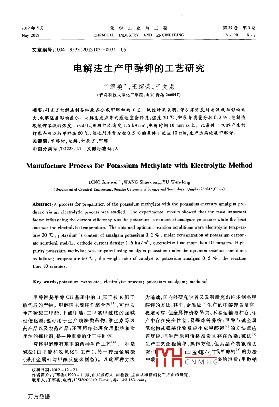 2012年5月工業(yè)與工第29卷第3期May 2012CHEMICAL INDUSTRY AND ENGINEERING文章編號:1004-9533(2012)03-0031-05電解法生產(chǎn)甲醇鉀的工藝研究丁軍委’,王紹榮,于文龍(青島科技大學(xué)化工學(xué)院,山東青島266042)摘要:研究了電解法制備鉀汞齊合成甲醇鉀的工藝。試驗(yàn)結(jié)果表明:鉀汞齊濃度對電流效率影響最大,電解溫度影響最小。電解生成汞齊的最適宜條件是:溫度20℃、鉀永齊質(zhì)量分?jǐn)?shù)0.2%、電解液碳酸鉀溶液的濃度1mol/L、陰極電流密度1.6kA/m2,電解時(shí)間10min以上。此條件下電解產(chǎn)生的鉀汞齊可以與甲醇在60℃、催化劑質(zhì)量分?jǐn)?shù)0.5%的條件下反應(yīng)10min,生產(chǎn)出高純度甲醇鉀。關(guān)鍵詞:甲醇鉀;電解;鉀汞齊;甲醇中圖分類號:TQ223.21文獻(xiàn)標(biāo)志碼:AManufacture Process for Potassium Methylate with Electrolytic MethodDING Jun-wei, WANG Shao-rong, YU Wen-longDepartment of Chemical Engineering, Qingdao University af Science and Technology, Qingdao 266042, China)Abstract: A process for preparation of the potassium methylate with the potassium-mercury amalgam pro-duced via an electrolytic process was studied. The experimental results showed that the most importantfactor influencing the current efficiency was the potassiums content of amalgam potassium while the leastone was the electrolytic temperature. The obtained optimum reaction conditions were electrolytic tempture 20 C, potassium's content of amalgam potassium 0. 2 % molar concentration of potassium carbon-ate solutionl mol/L, cathode current density 1.6 kA/m, electrolytic time more than 10 minutes. Highpurity potassium methylate was prepared using amalgam potassium under the optimum reaction conditionsas follows: temperature 60C, the weight ratio of catalyst to potassium amalgam 0.5 %, the reactionKey words: potassium methylate; electrolytic process; potassium amalgam; methanol甲醇鉀是甲醇OH基團(tuán)中的H原子被K原子為基礎(chǔ),國內(nèi)外研究學(xué)者又發(fā)明研究出許多制備甲取代后的產(chǎn)物。甲醇鉀主要用作縮合劑,可作為醇鉀的方法,其中,金屬法生產(chǎn)的甲醇鉀含量高、生產(chǎn)碳酸二甲酯、甲酸甲酯、二甲基甲酰胺的強(qiáng)堿穩(wěn)定可靠,但金屬鉀價(jià)格昂貴、不易運(yùn)輸與貯存,生性催化劑;也可用于生產(chǎn)磺胺類藥物、維生素等醫(yī)產(chǎn)中存在安全性差、易爆炸等弊病;甲醇與堿金屬藥產(chǎn)品以及農(nóng)藥產(chǎn)品;還可用作處理食用脂肪和食氫化物或氨基化物反應(yīng)生成甲醇鉀的方法反應(yīng)用油的催化劑,是一種重要的化工中間體。速度快,但生產(chǎn)原料價(jià)格昂貴且存在污染;堿法液體甲醇鉀有基本的兩種生產(chǎn)工藝21,一種是生產(chǎn)工藝流程簡單、操作方便,但其副產(chǎn)物很難去堿法(由甲醇和氫氧化鉀生產(chǎn)),另一種是金屬法除(采用金屬鉀與甲醇反應(yīng)來制備)。以此兩種方法中碳TH中國煤化工甲醇鉀的方法CNMHG多的浪費(fèi);甲醇鈉收稿日期:2012-12-21作者簡介:丁軍委(1970-),男,山東威海人,副教授,主要從事精細(xì)化工方面的研究。聯(lián)系人:丁軍委,電話:13589262819,E-mal:ds114@163.com化學(xué)工業(yè)與工程2012年5月與碳酸鉀反應(yīng)制備甲醇鉀的方法中甲醇鈉是不電極板為帶氧化銥涂層的金屬鈦板,尺寸為易獲得的原料;碳酸鉀與甲醇的反應(yīng)進(jìn)行不徹180mm×35mm×2mm,試驗(yàn)時(shí)水平放置,與底部底,產(chǎn)物分離閑難。水銀層距離為35mm,接線柱直徑為5mm,與電極相比之下,鉀汞齊和甲醇反應(yīng)制備甲醇鉀的板頂部中點(diǎn)相連接并垂直于電極板。方法保留了金屬法生產(chǎn)的明顯優(yōu)勢,又使其反應(yīng)不1.3分析方法會太劇烈。這一制備方法尚未投入工業(yè)化生產(chǎn)。1.3,1鉀汞齊中鉀的含量本研究從電解法制備鉀汞齊開始,通過討論各種電用水銀采樣器取電解生成的鉀汞齊試樣2~5g于解條件對電流效率的影響,研究了電解制備汞齊150mL燒杯中";鉀汞齊中加入005md/L的硫酸與鉀汞齊法聯(lián)合生產(chǎn)甲醇鉀的方法,采用廉價(jià)的碳標(biāo)準(zhǔn)液5-15mL,激烈震蕩至無氣泡產(chǎn)生為止。再酸鉀為原料,既降低了生產(chǎn)成本,又保證了產(chǎn)品純加入質(zhì)量分?jǐn)?shù)為0.1%甲基橙標(biāo)準(zhǔn)液2~3滴,用度和操作的安全性。0.05mol/L氫氧化鈉標(biāo)準(zhǔn)溶液滴定至橙紅色為終點(diǎn)。1試驗(yàn)部分1.3.2電流效率的計(jì)算根據(jù)電流效率的定義,總電流效率代表第r過1.1試驗(yàn)原理程在消耗總電量中的分?jǐn)?shù)。1.1.1電解法制備汞齊m=g,=2FE電解池底部流動的汞作為電解池的陰極,用在×100%帶有氧化銥涂層的金屬鈦?zhàn)鳛殡娊獬氐年枠O21△n(K")陽極溶液為碳酸鉀溶液。電解池通電后,在陰極△v(K)上,溶液中的鉀離子得到電子,溶于金屬汞中生成式中F為法拉利常數(shù),96500,Cmol;Q,為電解生鉀汞齊成汞齊的反應(yīng)所消耗的電量,C;Q為過程中消耗的K'+nlHg+e→K(Hg)、(鉀汞齊)(1)總電量,C;1為電解過程中的電流,A;為電解時(shí)間在陽極上,水失去電子生成氧氣s;7為電流效率,%;An(K)為電解過程中鉀離子1/2H2O-e→1/402↑+H(2)物質(zhì)的量變化值,ml;△(K')為電解過程中依照總反應(yīng)方程式為電解反應(yīng)式鉀離子的系數(shù)的變化值。2KCO3+220w,4(汞齊)+2H2CO+0+1.3.3總堿含量的測定用吸管吸取質(zhì)量為W的混合液樣品放入燒瓶(3)中將容量瓶定容至50m,再轉(zhuǎn)移至錐形瓶中161.1.2汞齊合成甲醇鉀加入3滴