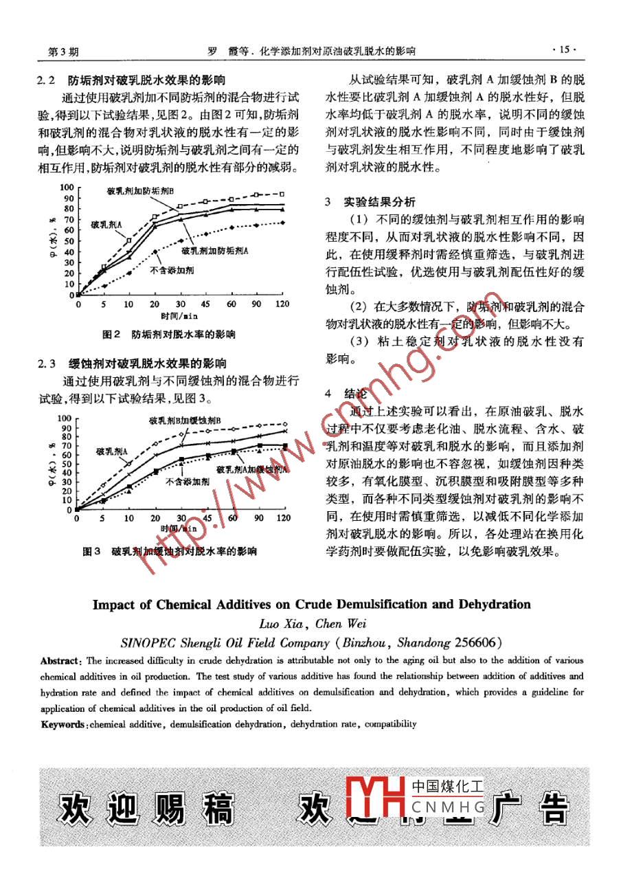 石油化工腐蝕,與防護(hù)研究Corrosion & Protection in Petrochemical Industry2009,26(3).14.工藝.j化學(xué)添加劑對(duì)原油破乳脫水的影響羅霞陳偉(中國(guó)石油化工股份有限公司勝利油田分公司,山東濱州256606)摘要:針對(duì)原油生產(chǎn)中出現(xiàn)脫水難的問(wèn)題,除通常考慮的老化油等影響因素外,對(duì)油田生產(chǎn)過(guò)程中使用的各種化學(xué)添加劑進(jìn)行試驗(yàn)研兗,得出油田化學(xué)添加劑與脫水率的關(guān)系,從而確定油田化學(xué)添加劑對(duì)破乳脫水的影響,對(duì)生產(chǎn)中化學(xué)添加劑的使用具有實(shí)際指導(dǎo)意義。關(guān)鍵詞:化學(xué)添加劑破乳脫水脫水率配伍性中圖分類號(hào):TE624.1文獻(xiàn)標(biāo)識(shí)碼:A文章編號(hào):1007 -015X(2009)03 -0014 -02近年來(lái),在原油生產(chǎn)過(guò)程中,經(jīng)常出現(xiàn)原油破水浴里,恒溫15min,再向量簡(jiǎn)里分別加人已配好乳脫水困難的問(wèn)題,在查找問(wèn)題的時(shí)候,通??紤]的添加劑(破乳劑A、破乳劑B、破乳劑A加粘土穩(wěn)的原因有老化油、脫水流程、含水、破乳劑和溫度定劑破乳劑B加粘土穩(wěn)定劑、破乳劑A加緩蝕劑等。但影響原油脫水的原因除上述因素外,在油田A、破乳劑A加緩蝕劑B、破乳劑A加防垢劑A和生產(chǎn)過(guò)程中使用的各種添加劑對(duì)破乳脫水也有影破乳劑A加防垢劑B),將量筒來(lái)回倒置10次,以響,特別是到了油田開(kāi)發(fā)后期,所用到的添加劑越使添加劑溶液與乳狀液進(jìn)-步混合,記錄每段時(shí)間來(lái)越多。由于在原油進(jìn)人處理站時(shí),已經(jīng)是含有這間隔內(nèi)出水?dāng)?shù)據(jù)。些添加劑的復(fù)雜的混合物,因此這些添加劑對(duì)原油脫水的影響不可忽視。針對(duì)這- -問(wèn)題,實(shí)驗(yàn)研究了2添加劑對(duì)脫水效果的影響幾種常用的化學(xué)添加劑對(duì)原油破乳脫水的影響。2.1粘土穩(wěn)定劑對(duì)破 乳脫水效果的影響通過(guò)使用不同破乳劑與粘土穩(wěn)定劑的混合物1實(shí)驗(yàn)方法進(jìn)行試驗(yàn),得到以下試驗(yàn)結(jié)果,見(jiàn)圖1。從試驗(yàn)情實(shí)驗(yàn)利用煤油及常用的兩種破乳劑、一種粘土況看,破乳劑與粘土穩(wěn)定劑的混合物對(duì)乳狀液的脫穩(wěn)定劑、兩種緩蝕劑和兩種防垢劑,通過(guò)表面張力水性有效果,但可以看出,混合物對(duì)乳狀液脫水性的測(cè)定及脫水效果進(jìn)行分析。的影響主要受破乳劑的支配,而粘土穩(wěn)定劑本身對(duì)1.1乳狀液的配置脫水性基本上沒(méi)有影響。取25 mL煤油,加入體積百分?jǐn)?shù)為0.3 %乳化劑,在400rpm的高速攪拌器下攪拌的同時(shí),用--100破乳刺加粘土穩(wěn)定劑支滴定管將25 mL的油田污水逐滴加入??刂扑迫閯〢破乳辦3加粘土穩(wěn)定劑的滴加速度,使得在2. 5 min內(nèi)滴完。1.2配伍性實(shí)驗(yàn)取各種添加劑進(jìn)行配伍實(shí)驗(yàn),通過(guò)配伍實(shí)驗(yàn)得不含添加劑到如下添加劑的組成:510.2030456090120(1)破乳劑A加粘土穩(wěn)定劑,破乳劑B加粘土?xí)r間/min穩(wěn)定劑;81 粘土穩(wěn)定劑對(duì)破乳脫水率的影響(2)破乳劑A加防垢劑A,破乳劑A加防垢劑B;中國(guó)煤化工(3)破乳劑A加緩蝕劑A,破乳劑A加緩蝕劑B。收稿MCHCNMHG009-03-06。1.3乳狀液穩(wěn)定性測(cè)量向具塞量簡(jiǎn)里倒入80 mL已配好的乳狀液,并作者簡(jiǎn)介:羅霞,2003年畢業(yè)于石油大學(xué),現(xiàn)在中國(guó)石油化工股份有限公司勝利油田分公司濱南采油廠工藝研究所,把具塞量筒分別標(biāo)上標(biāo)簽,把它們放入60 C恒溫主要從事油田污水處理方面的工作。第3期羅霞等. 化學(xué)添加劑對(duì)原油破乳脫水的影響●15.2.2防垢劑對(duì)破乳脫水效果的影響從試驗(yàn)結(jié)果可知,破乳劑A加緩蝕劑B的脫通過(guò)使用破乳劑加不同防垢劑的混合物進(jìn)行試水性要 比破乳劑A加緩蝕劑A的脫水性好,但脫驗(yàn),得到以下試驗(yàn)結(jié)果,見(jiàn)圖2。由圖2可知,防垢劑水率均低于破乳劑A的脫水率,說(shuō)明不同的緩蝕和破乳劑的混合物對(duì)乳狀液的脫水性有一定的影劑對(duì)乳狀液的脫水性影響不同,同時(shí)由于緩蝕劑響,但影響不大,說(shuō)明防垢劑與破乳劑之間有一定的與破乳劑發(fā)生相互作用,不同程度地影響了破乳相互作用,防垢劑對(duì)破乳劑的脫水性有部分的減弱。劑對(duì)乳狀液的脫水性。00「破乳劑加防垢劑B3實(shí)驗(yàn)結(jié) 果分析30 t(1) 不同的緩蝕劑與破乳劑相互作用的影響破乳劑As0 t程度不同,從而對(duì)乳狀液的脫水性影響不同,因破乳劑加防垢劑A此,在使用緩釋劑時(shí)需經(jīng)慎重篩選,與破乳劑進(jìn)不含黍加劑行配伍性試驗(yàn),優(yōu)選使用與破乳劑配伍性好的緩蝕劑。05102030456090120(2)在大多數(shù)情況下,防垢劑和破乳劑的混合時(shí)間/nin物對(duì)乳狀液的脫水性有一定的影響, 但影響不大。圖2防垢劑對(duì)脫水率 的影響(3) 粘土穩(wěn)定劑對(duì)乳狀液的脫水性沒(méi)有2.3緩 蝕劑對(duì)破乳脫水效果的影響影響。通過(guò)使用破乳劑與不同緩蝕劑的混合物進(jìn)行試驗(yàn),得到以下試驗(yàn)結(jié)果,見(jiàn)圖3。4結(jié)論.通過(guò)上述實(shí)驗(yàn)可以看出,在原油破乳、脫水100 r敬乳劑B加緩蝕劑B過(guò)程中不僅要考慮老化油、脫水流程、含水、破0t乳劑和溫度等對