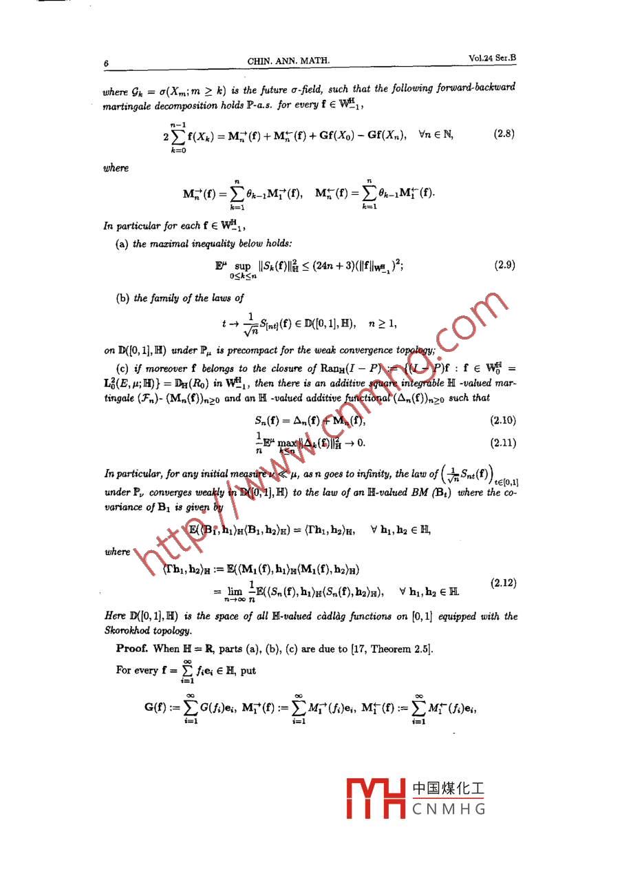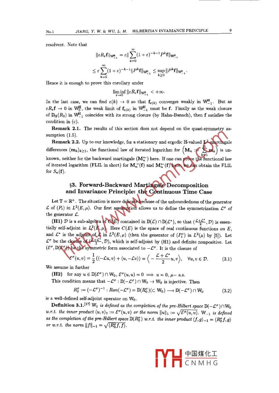 Chin. Ann. Math.24B:1(2003),1-16.HILBERTIAN INVARIANCE PRINCIPLEFOR EMPIRICAL PROCESS ASSOCIATEDWITH A MARKOV PROCESSJIANG YIWEN* WU LIMING**AbstractThe authors establish the Hilbertian invariance principle for the empirical process of aatationary Markov process, by extending the forward-backward martingale decomposition ofLyons Meyer- Zheng如the Hilbert space valued additive functionals associated with generalnon-reveraible Markov processes.Keywords Forward-backward martingale decomposition, Functional central limittbeorem or Donsker's invariance principle, Empirical process2000 MR Subject Clasification 60F17, 60F25, 60J55, 62G30Chinese Library Classfication O211.4, 0211.6Document Code AArticle ID 0252 9599(2003)01-0001-16g1. Introduction1.1. Motivation and Several Known ResultsLet (8,F,(F)ter, (Xx)tET, (0)teτ, (P. )x∈E) be a Markov process valued in a Polish spaceE, with transition probability semigroup (Pt)ter and with an invariant and ergodic probability measure μ on (E, B), which is unknown. Here T = N (discrete time) or R+ (continuoustime). For any initial measure U, set P():= JgPz()v(dx) and write E() := Ja()dPp.Let f : E→R be a fixed B-measurable function (our observable). A natural questionfrom the point of view of non-parametric statistics is to estimate the distribution functionF(u):= L[f(x) ≤叫= Pp(f(Xo) ≤u) by the observed (X). By an extension of theKolmogorov- Smirnov theorem, we have P-a.s.sup|F磚(u) - F(u)| -→0,as T goes to infinity, whereif 0葉33≈4.373. Further, B. Morel and C. Suquetl2l real-ized that the optimal condition for the weak L2[0, 1] convergence of 5n to a Gaussian randomelementis 2(善- Emax(Xo,Xx)) <∞. This motivates our main result below.1.2. A Main ResultWe are mainly interested in the FCLT of the empirical distribution 5() ( or 5r() ) insorme Hilbert space 88 in [9]. In this paper, we assume F(u) := u[f(x)≤叫] is continuous.Let In(u,u) :=四4ξn(u)En(以) and hu(工) = 1[f(=)S川], we have the fllwing invarianceprinciple:Theorem 1.1. Assume the strong sector condition (1.5) (ie, our Markov process (X)oeris quai-symmetric).號(hào)- Emax(F(f)(X), F(f)(X;)) is summable in the sense of Abel,ie., if(E(+()-(*-mma()()(F(x) or。*e“(號(hào)- max(F()(Xo),F(f)(X)) ) dt(acconding toT=N or R+) converges in R asε↓0, then we have(a) Ir(u,0) := F"Er(u)Er() weakly converges in L2(R, dF(u)dF()) to r(n,1) asT goesto infinity, andT as a kernel operatorT()w);= (r(u),)f1)dF(0) ,is of the trace class on L2(R, dF(u)dF());(b) for any initial measurer < u, the law of ξn on [2(R, dF) under P, converges weaklyto the Gaussian measure on [2(R, dF) with reproducing kernel given by T(u,v). .In order to prove Theorem 1.1, we shall extend the forward-backward martingale decomposition of Lyon8-Meyer Zhengl71) to the Hilbert space valued additive functionals,The second named authorln] generalized the forward-backward martingale decompositionof Lyon-Meyer-Zbeng's type ftom the symmetric case to the general stationary situationfor the partial sum S:(f) with f stisfying a finite enerey condition for realf.中國(guó)煤化工MYHCNMHG4CHIN. ANN. MATH.Vol.24 Ser.BThis paper is organized as fllows. The next two sections are devoted to extendingforward-backward martingale decomposition of Lyons Meyer Zheng's type in the discretetime and continuous time from the real valued case to the Hilbertian valued case. In section4 we discuss the quasi-symmetric case. We complete the proof of Theorem 1.1 in the lastsection.Throughout this paper, <, ) and I .1 denote respectively the inner product and norm inL2(E,u:; R), E() the expectation w.r.t P= Pp.功(E,x;R):= {g∈L2(E,x;R);(g,1> =0}.We say that (At)teris an additive functional, if for all s,t∈T,As+t(w) = A。(山) + As(0。w), Pu -a.8.(i.e., in the loose sense). A typical additive functional is (S(f)) given in (1.3).82.Forward-Backward Martingale Decompositionand Invariance Principle: the Discrete Time Case2.1. Some Preliminary Lemmas in the Real Valued CaseWe begin by recalling some results in [17].Let T= Nand write P= P. Let P* be the adjoint operator of P in L2(E, ;R) and .P°= PtF-, the synmetrization of P. Let Wo = LE(E,x;R)= {J∈L2(E,;R);(f)p = 0}equipped with norm |fIlo = I|l|l2(u). It is easy to see that Vu∈LE(E,u;R) := Wo,((I-P")u,u)=0→u=0.(2.1)Then (eee [17)I-P°:Wo→Wo is injective, its invere R :D(RE)(C Wo)→Wo isaself-adjoint operator with domain D(RE)= Ran(I - P").DeAnition 2.1. Let W1 be the completin of the pre-Hibert space (Wo = L好(E,;R),<)1) where the inner product is given by他,):= ((I- P)u,v).(2.2)We define (W_,I. HI-1) as the dual Hilbert space of (W,I . |I1) w.r.t. the canonical duarelation Wo = Wo.Lemma 2.1.1 WoC w, W_1 C Wo are both continuous and dense imbedding, and .forf∈e(E,;R),f∈W_s if (1.3) holds; and the minimal constant C in (1.3) equals toHf-1.By the ergodicity of P we can define the potential (or Poisson) operatorsRo=(I- P)-1: D(Ro)= Ran(I - P)(c W)→wo,R=(I-P*)-1 :D(R)= Ran(I- p*)(c Wo)→W.Lemma 2.2.17] D(Ro)UD(R)C W_1 andIfiI_IS√lPoflo,Vf e D(Ro), and If-1 ≤√1|fR1lo,Yf∈D(R);(2.3)IRif1l, Vf∈D(R), and Illfl_1,, Vf∈ D(RE).(2.4)2.2. Forward-Backward Martingale Decomposition for H-valued AdditiveFunctionalsLet H be a Beparabl Hibert space with iner product (,)m and norm | . lax; (e)ie1(I = [I,dim(EN)} nN denotes an othonormal basis for H The H valued function will be中國(guó)煤化工MYHCNMHGNo.1JIANG, y. W.& wu, L. M. HILBERTIAN INVARIANCE PRINCIPLEdenoted by the bold letters f, g, ... Let LK(E,μ;H):= {f∈L2(E,;H);IE"(f)=0}. Thedomain of operator Ro on L(E,r; H) is denoted by D:(Ro). We denote the norm and innerproduct in L2(E,p;H) by |. 1 and《, .》respectively. We defineDefinition 2.2. Letf∈LE(E,x;H) and f;:= (f,e:)u. We say thatf∈W1, iflve :=2.<+o.Lemma 2.3. Letf∈ LK(E,p;H). Thenf∈Wtl i講 there erists a constantC 2 0, suchthat《f,g)》S CV(Ag,g)i,Vg∈ Da(4) = L2(E,x;H)(2.5)(recaling that A=I- P) and(fw = inf{C≥0| (2.) holds for C}.(2.